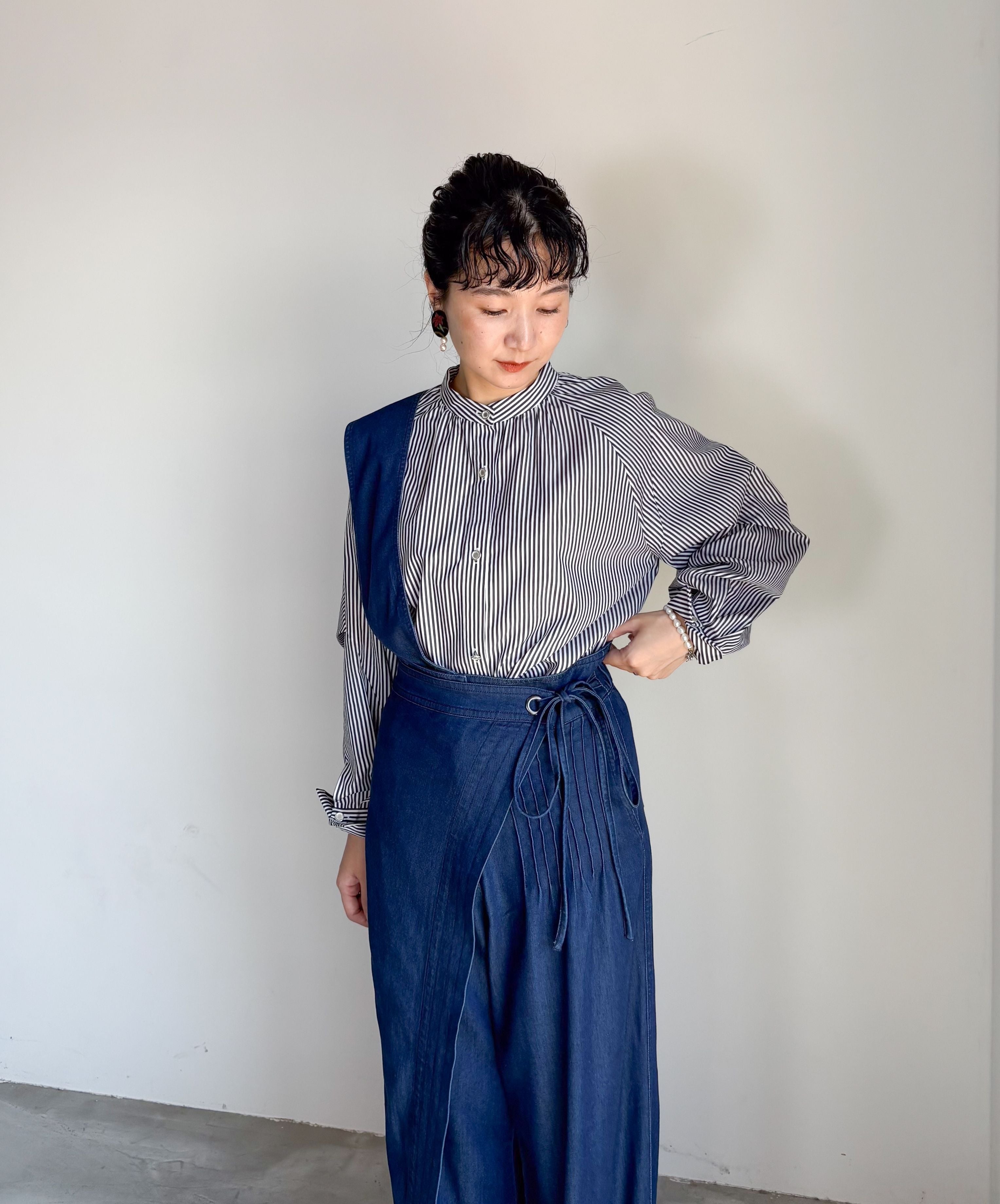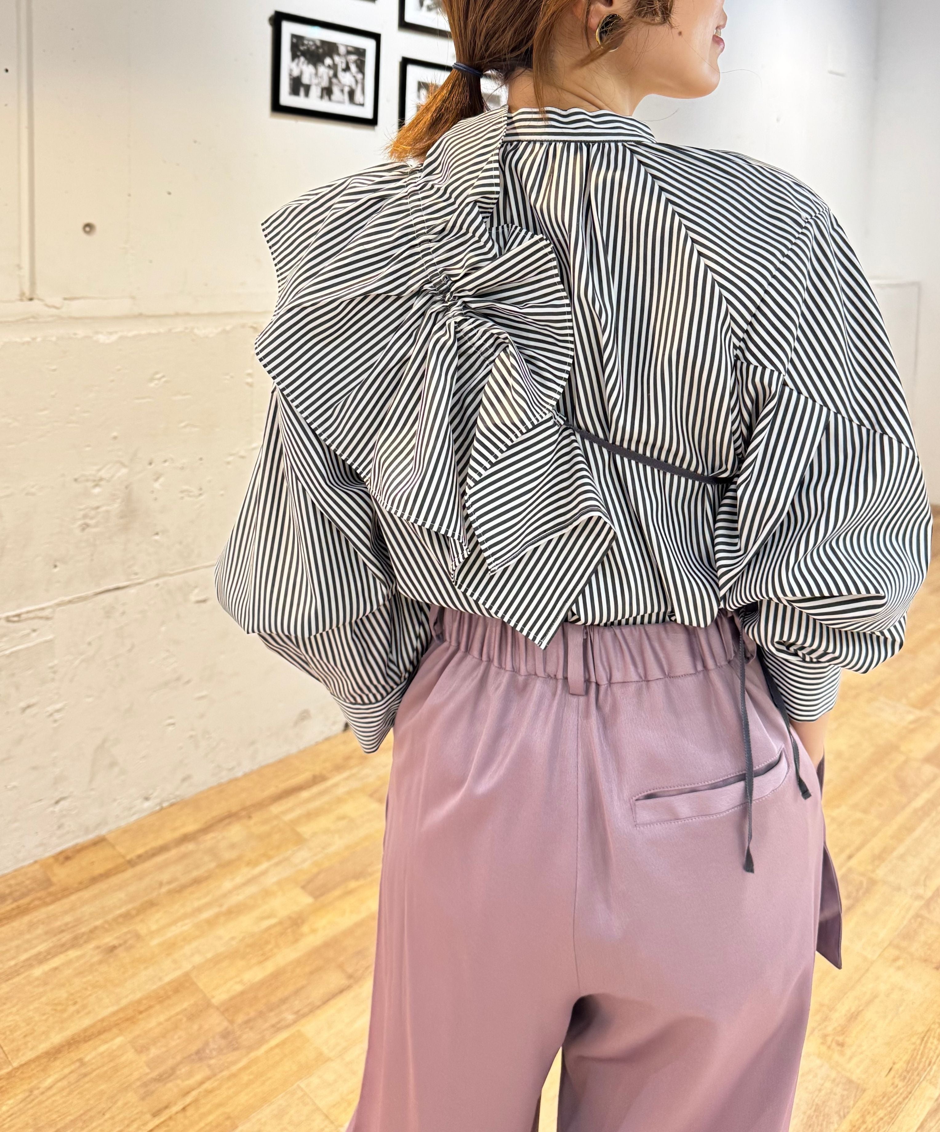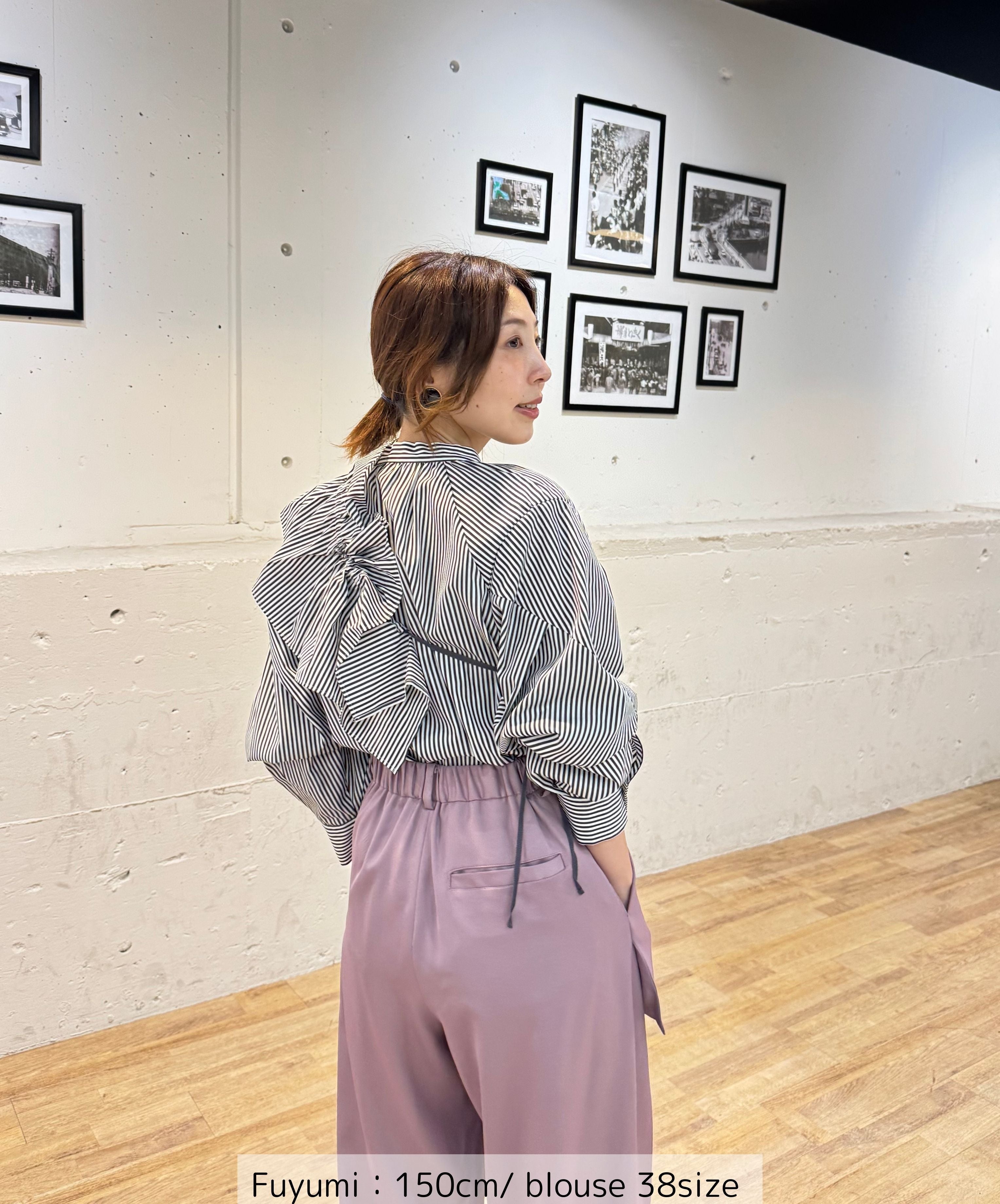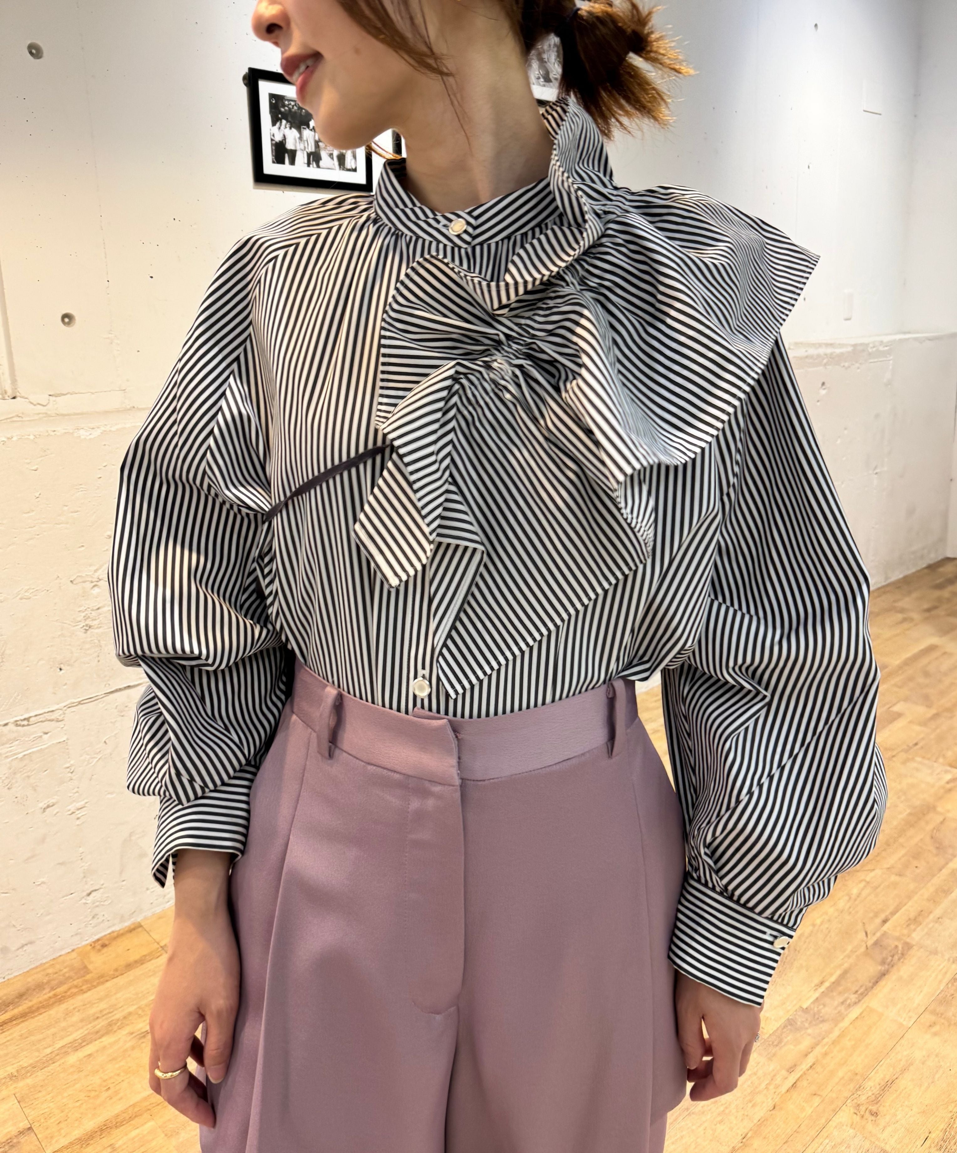 取り外し可能なフリル衿が華やかさを添えるシャツブラウス。フレンチシックなムードをまとう細ストライプ柄のシャツ生地を使用。適度なハリがあり、袖に入ったタックが引き立つデザインです。セットになった取り外し可能なフリル衿が華やかでアイコニックな印象に。ギャザーの寄せ方でフリルの分量は調節可能。肩からバストにかけて巻いたり、腰に巻いてペプラム風デザインにしたりとアレンジ自在。シャツ単体でもスタイリングに重宝し、カジュアルからきれいめまでこなせる万能さ。ホームケア可能で、晩夏初秋からヘビーユースできる一枚です。
