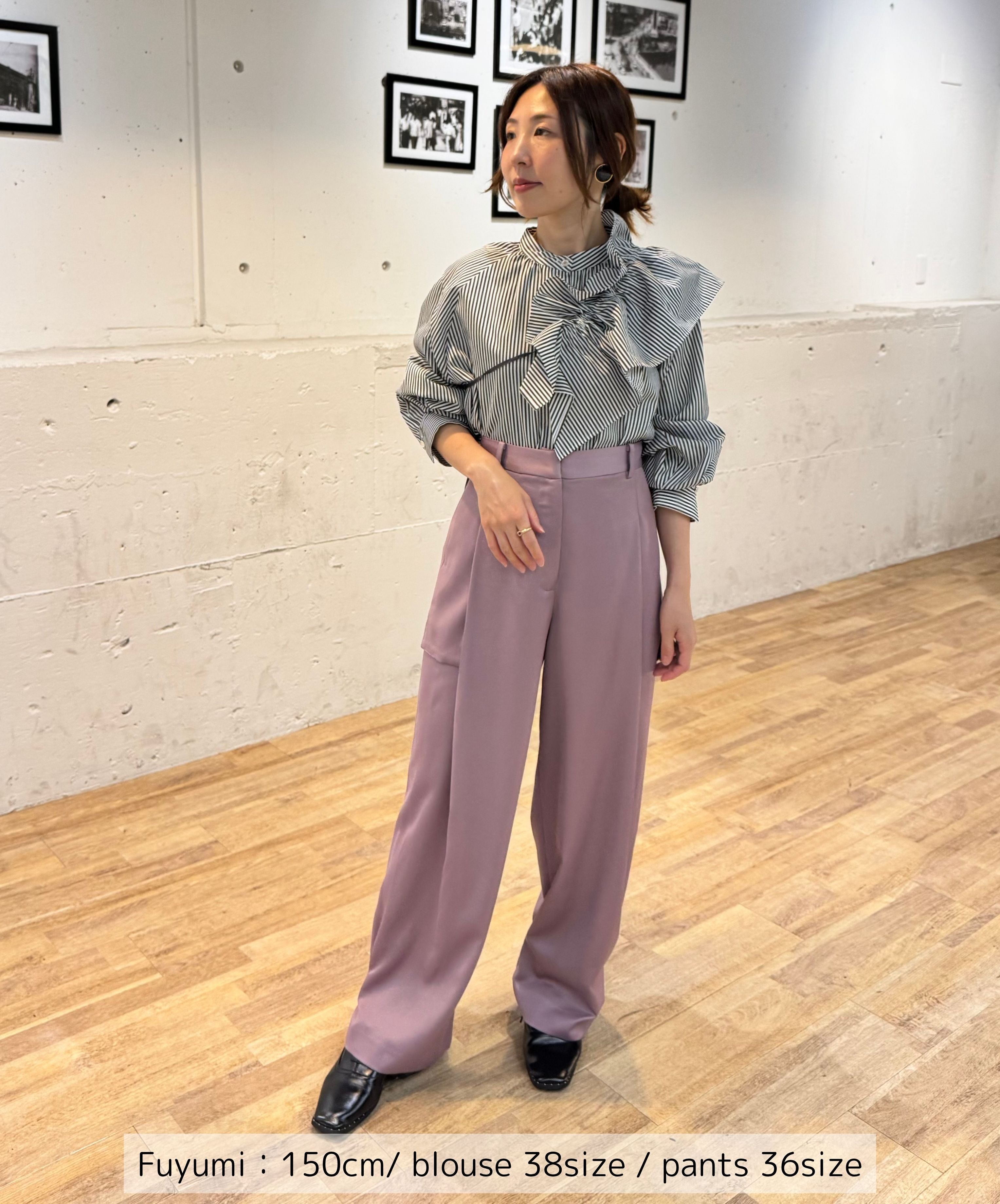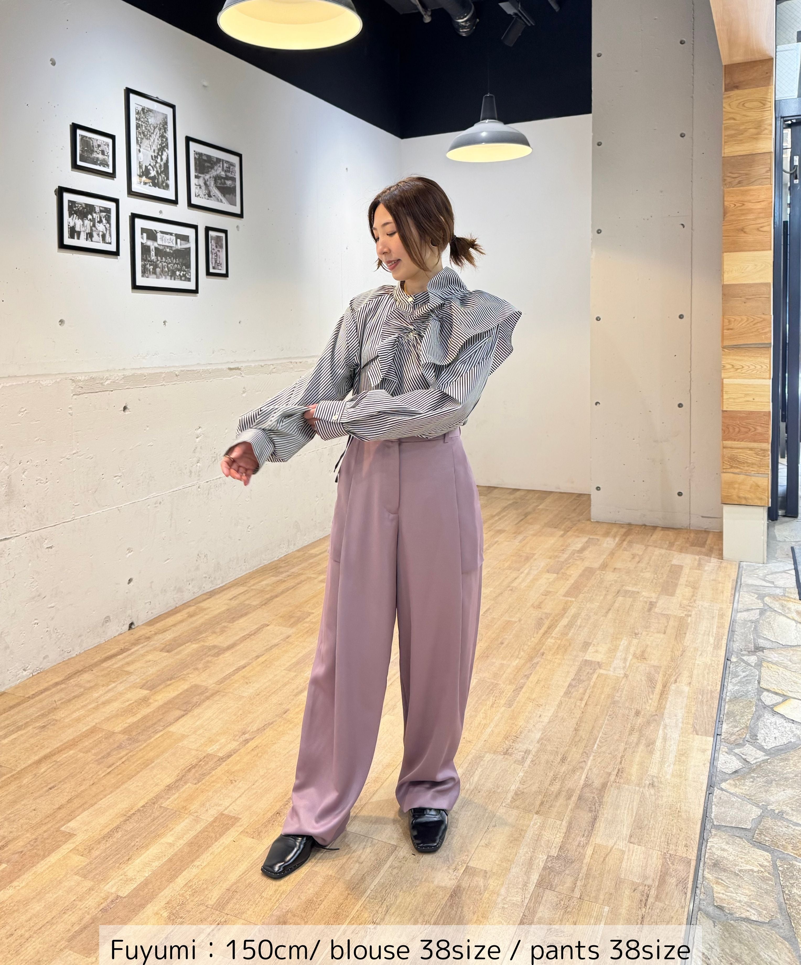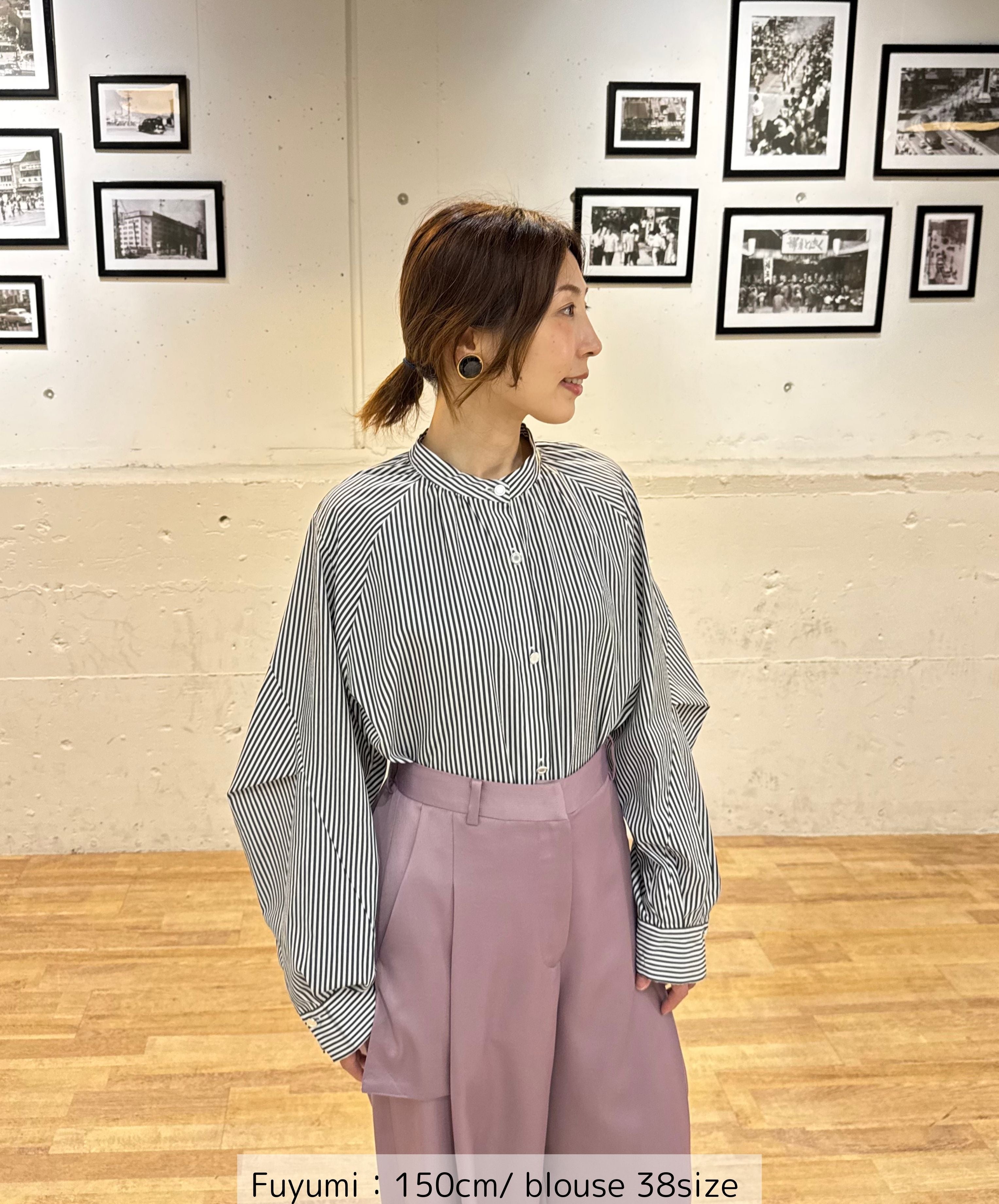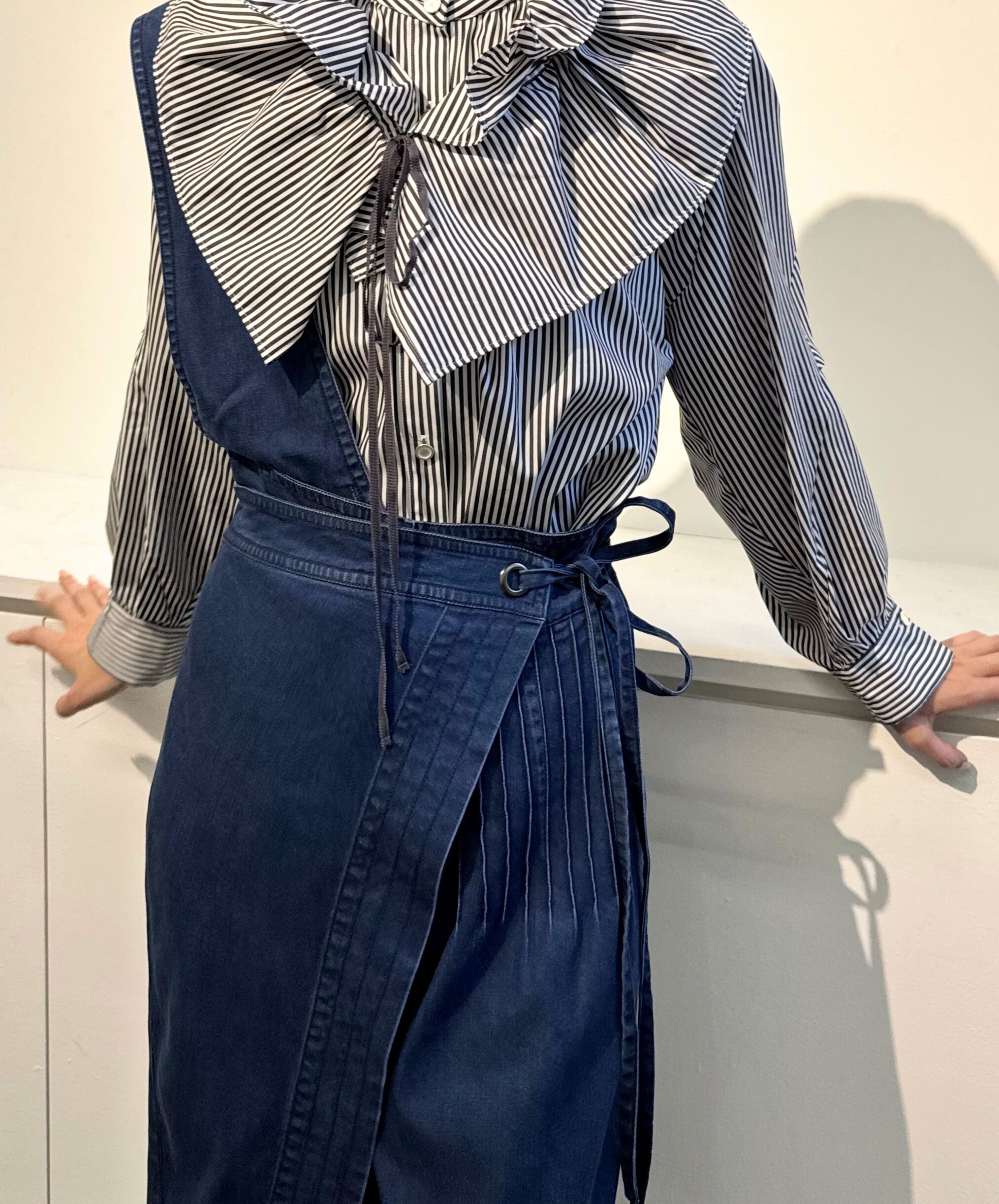 取り外し可能なフリル衿が華やかさを添えるシャツブラウス。フレンチシックなムードをまとう細ストライプ柄のシャツ生地を使用。適度なハリがあり、袖に入ったタックが引き立つデザインです。セットになった取り外し可能なフリル衿が華やかでアイコニックな印象に。ギャザーの寄せ方でフリルの分量は調節可能。肩からバストにかけて巻いたり、腰に巻いてペプラム風デザインにしたりとアレンジ自在。シャツ単体でもスタイリングに重宝し、カジュアルからきれいめまでこなせる万能さ。ホームケア可能で、晩夏初秋からヘビーユースできる一枚です。
