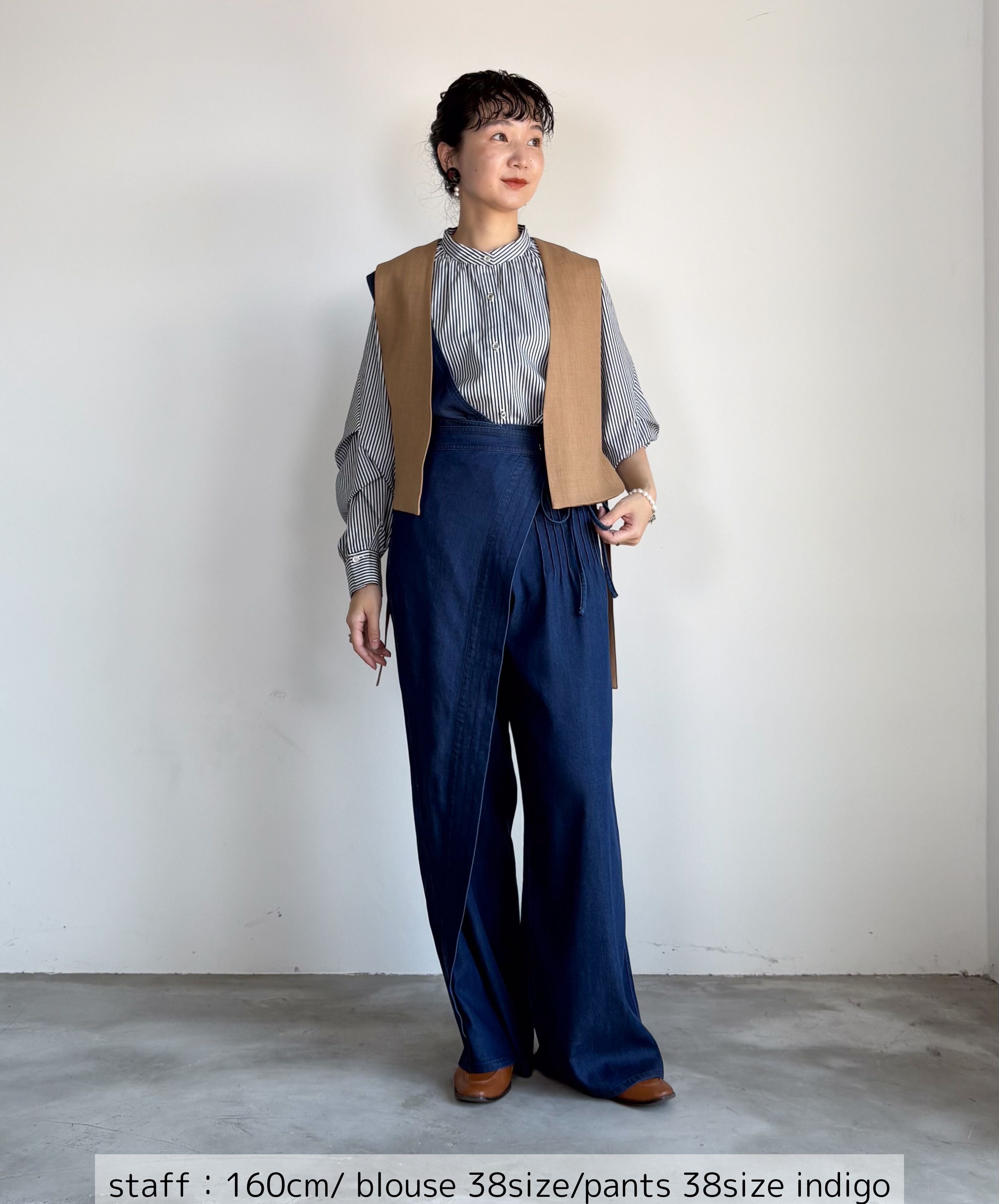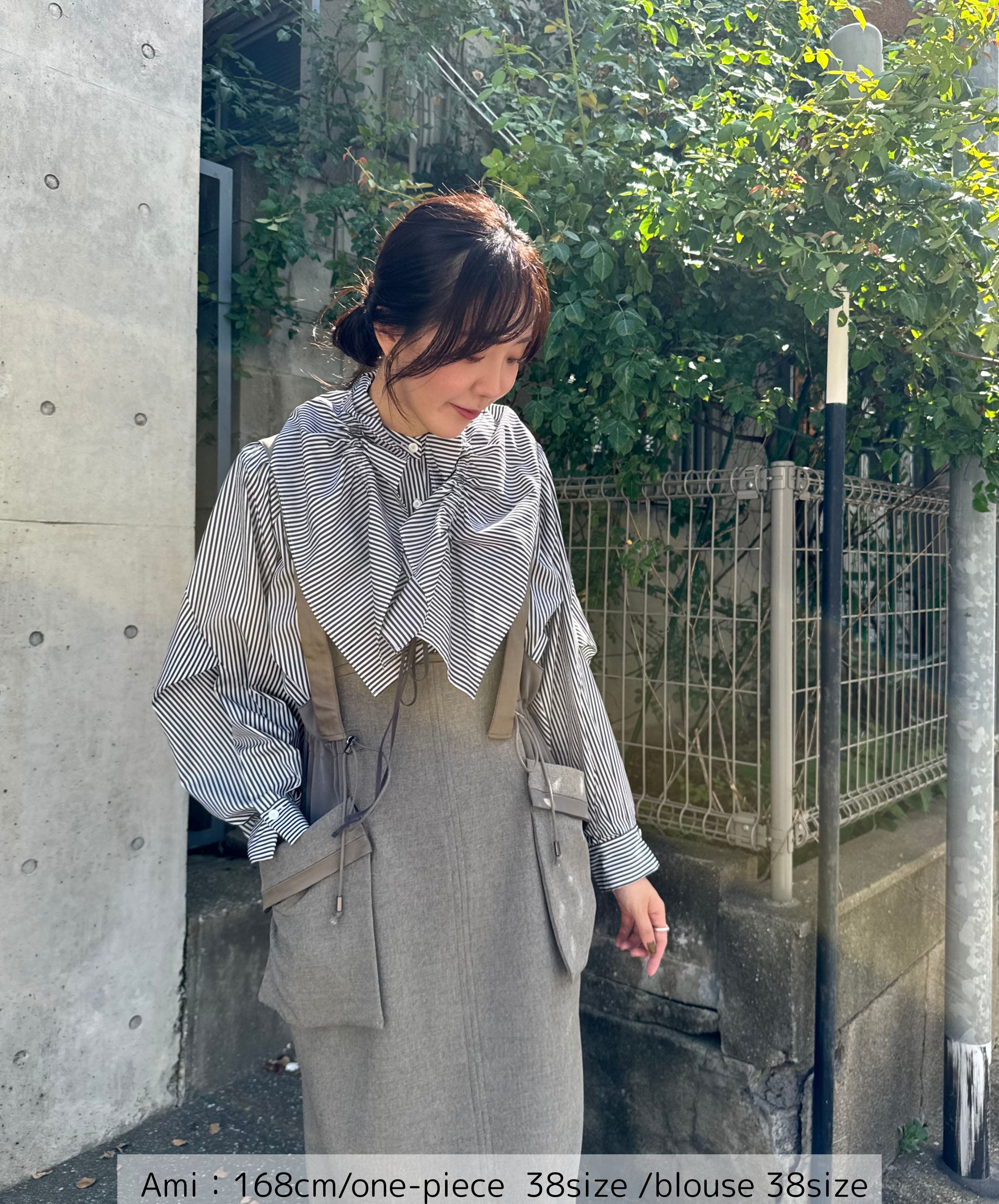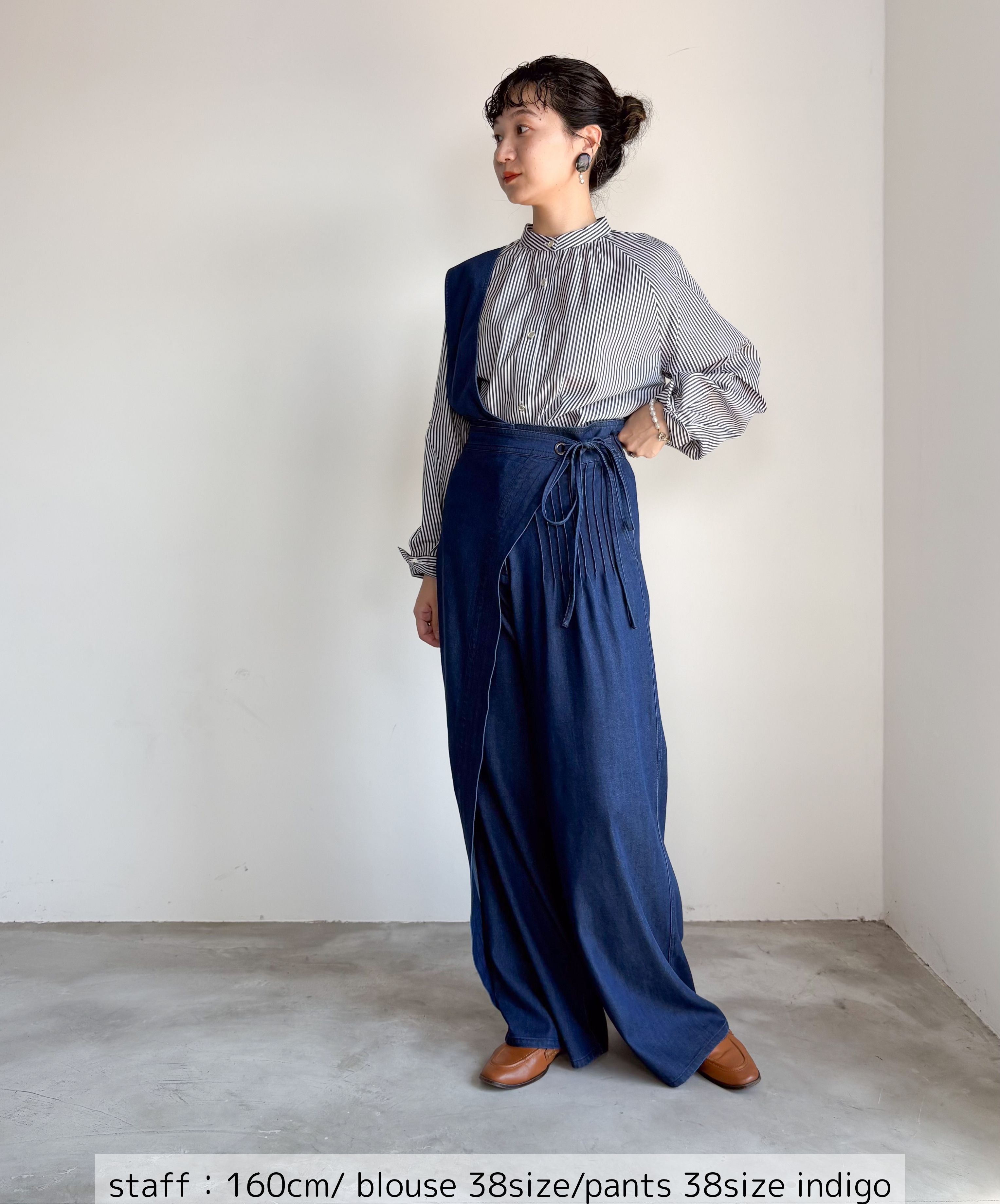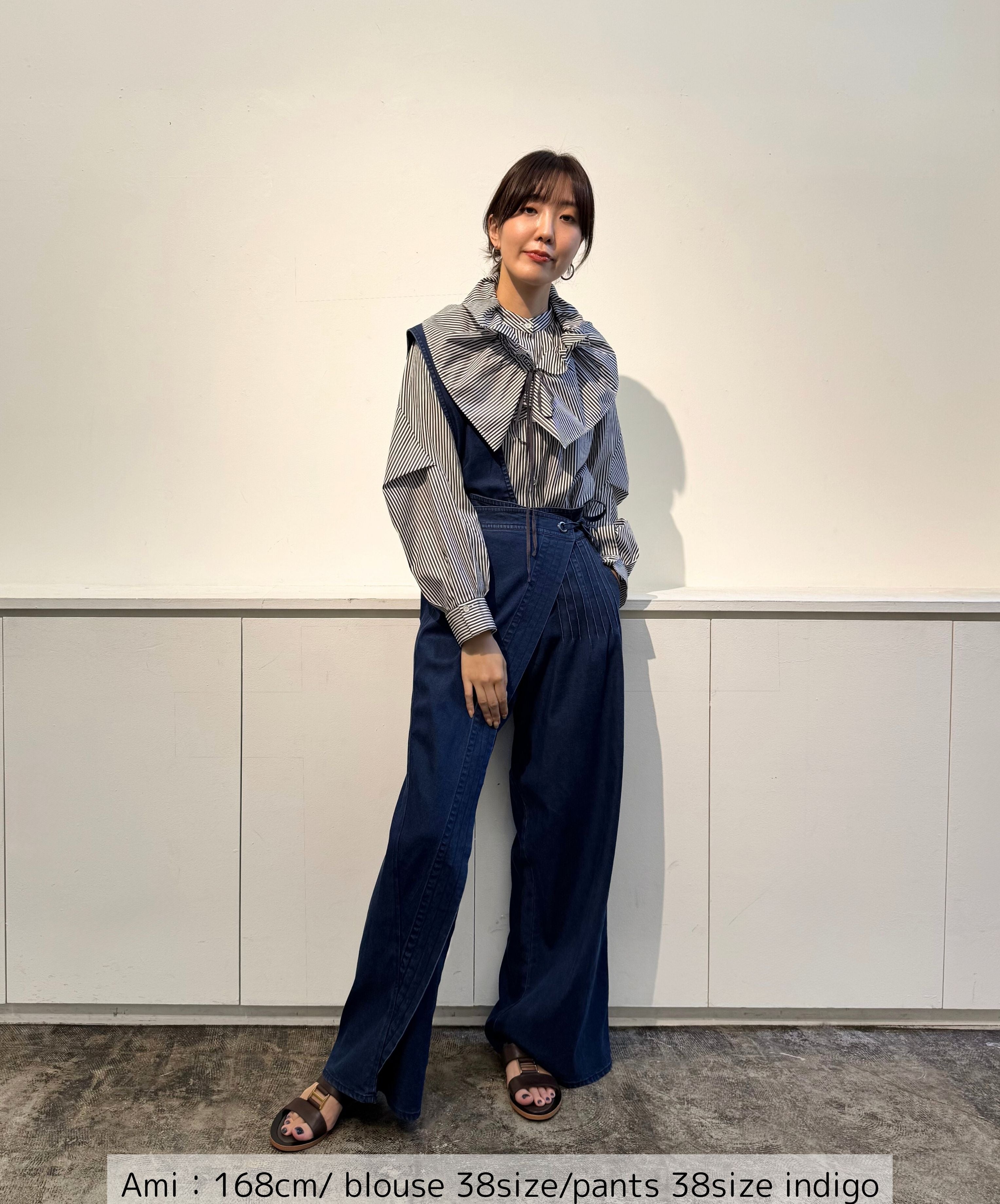 取り外し可能なフリル衿が華やかさを添えるシャツブラウス。フレンチシックなムードをまとう細ストライプ柄のシャツ生地を使用。適度なハリがあり、袖に入ったタックが引き立つデザインです。セットになった取り外し可能なフリル衿が華やかでアイコニックな印象に。ギャザーの寄せ方でフリルの分量は調節可能。肩からバストにかけて巻いたり、腰に巻いてペプラム風デザインにしたりとアレンジ自在。シャツ単体でもスタイリングに重宝し、カジュアルからきれいめまでこなせる万能さ。ホームケア可能で、晩夏初秋からヘビーユースできる一枚です。
