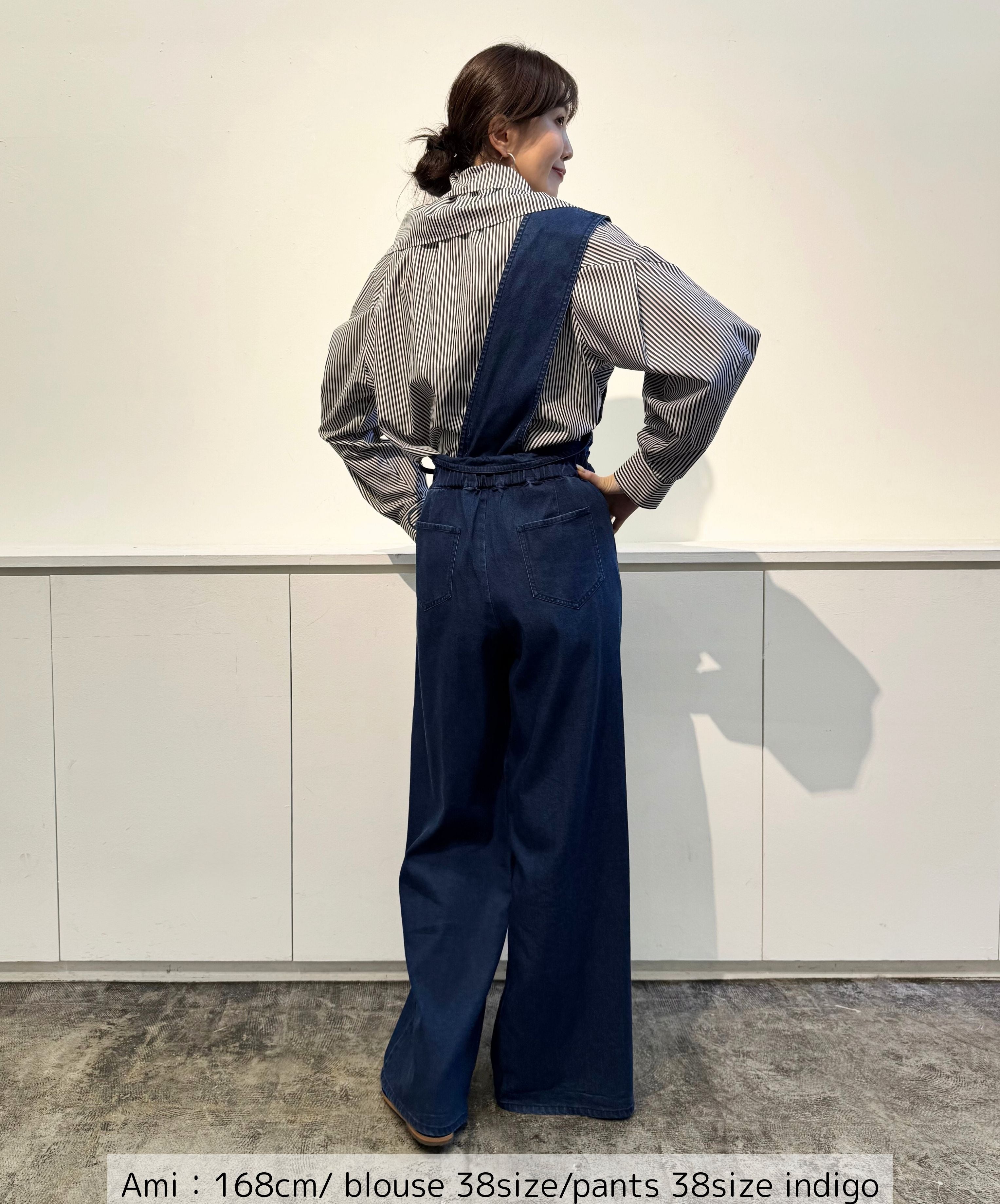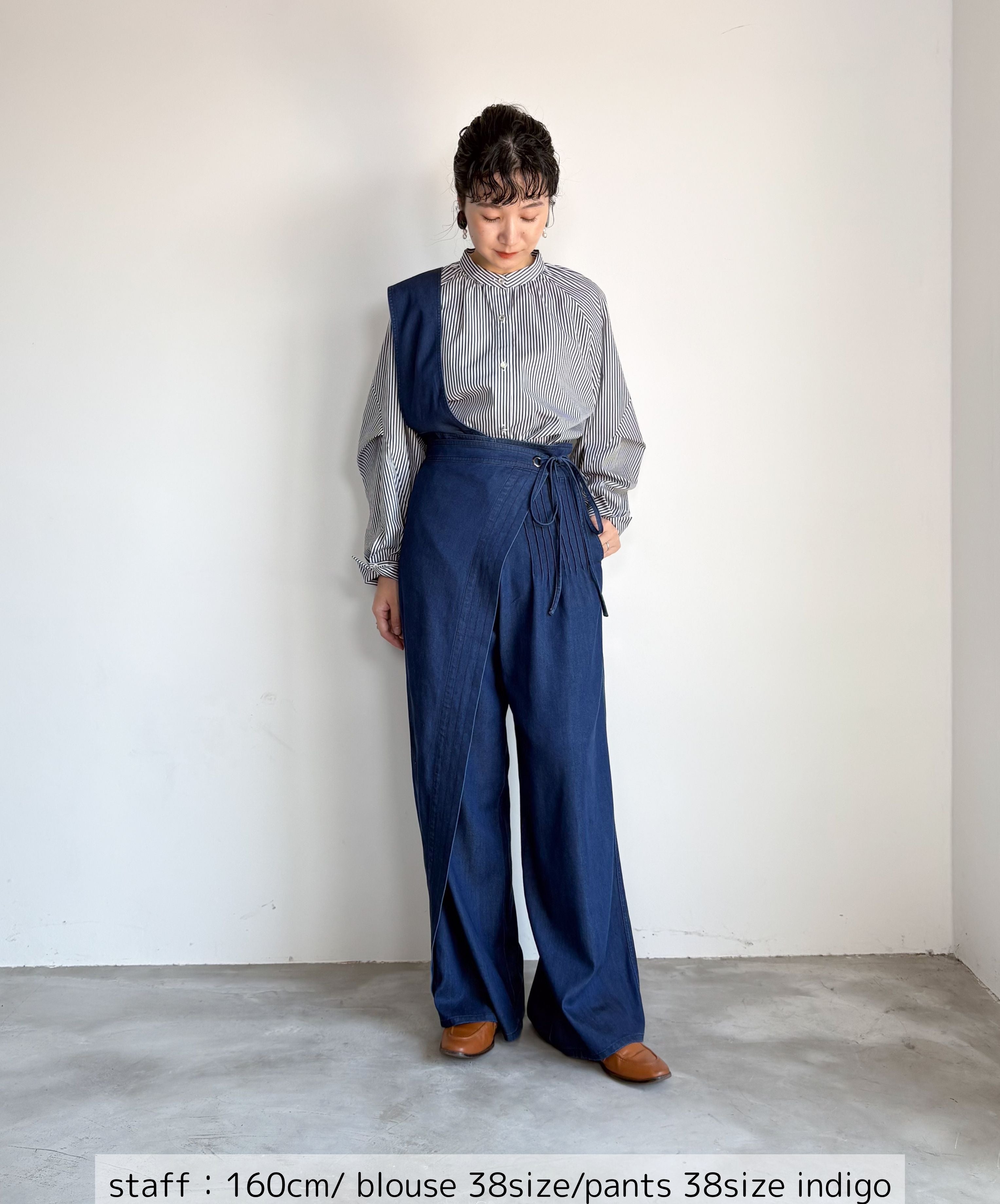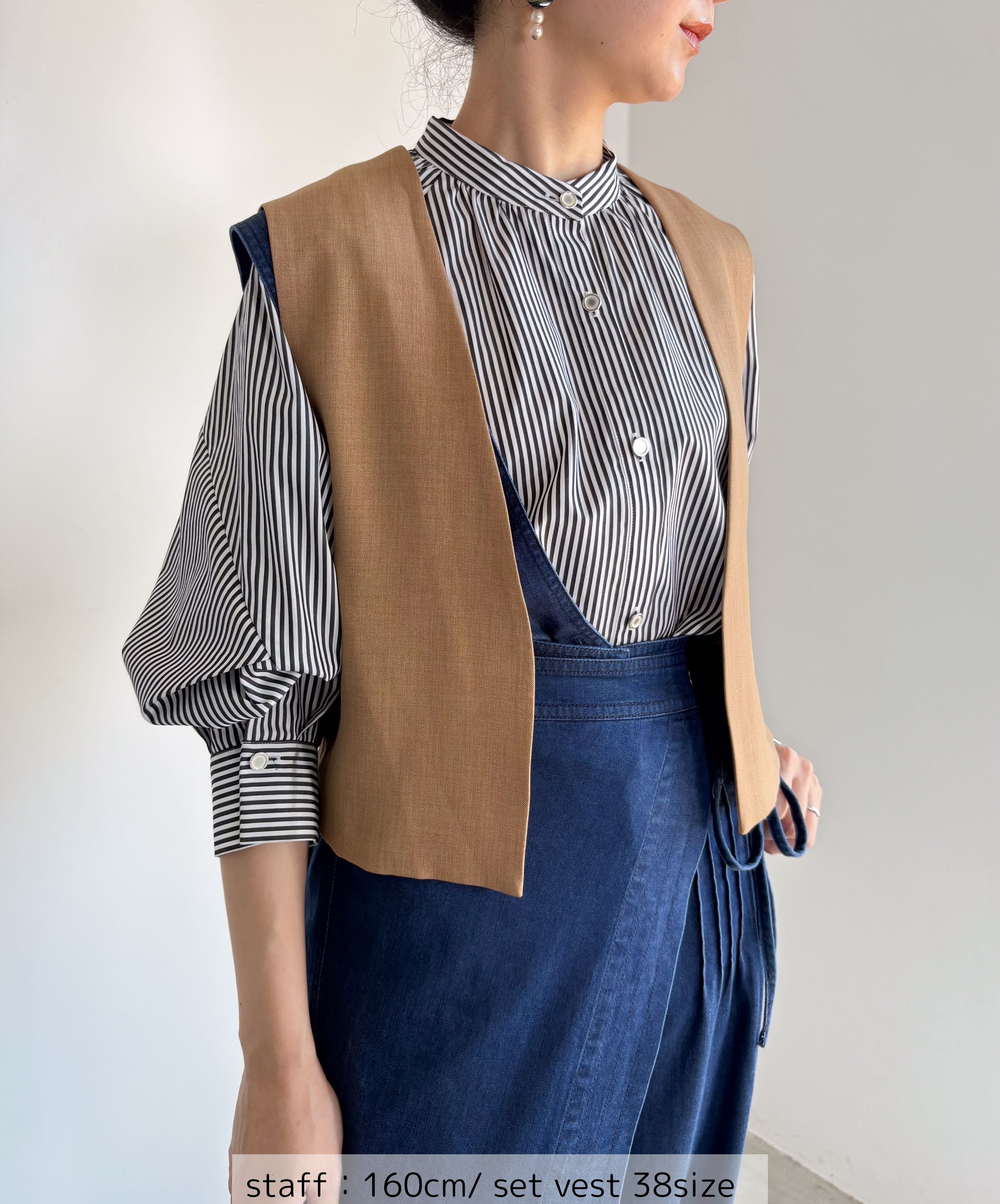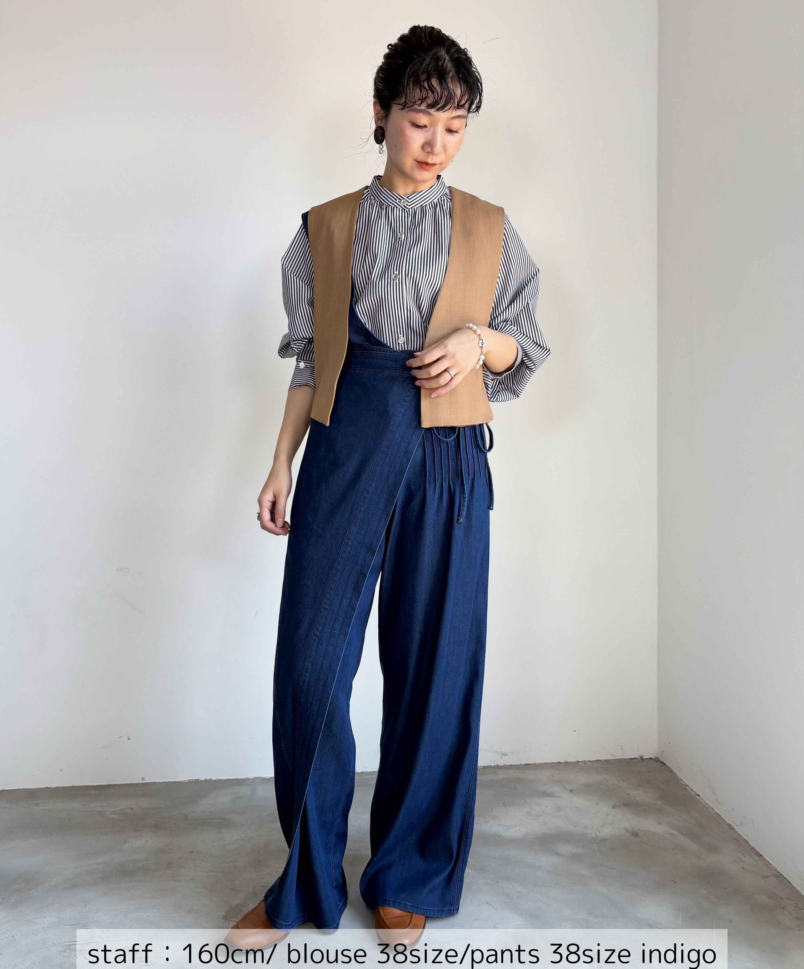 取り外し可能なフリル衿が華やかさを添えるシャツブラウス。フレンチシックなムードをまとう細ストライプ柄のシャツ生地を使用。適度なハリがあり、袖に入ったタックが引き立つデザインです。セットになった取り外し可能なフリル衿が華やかでアイコニックな印象に。ギャザーの寄せ方でフリルの分量は調節可能。肩からバストにかけて巻いたり、腰に巻いてペプラム風デザインにしたりとアレンジ自在。シャツ単体でもスタイリングに重宝し、カジュアルからきれいめまでこなせる万能さ。ホームケア可能で、晩夏初秋からヘビーユースできる一枚です。