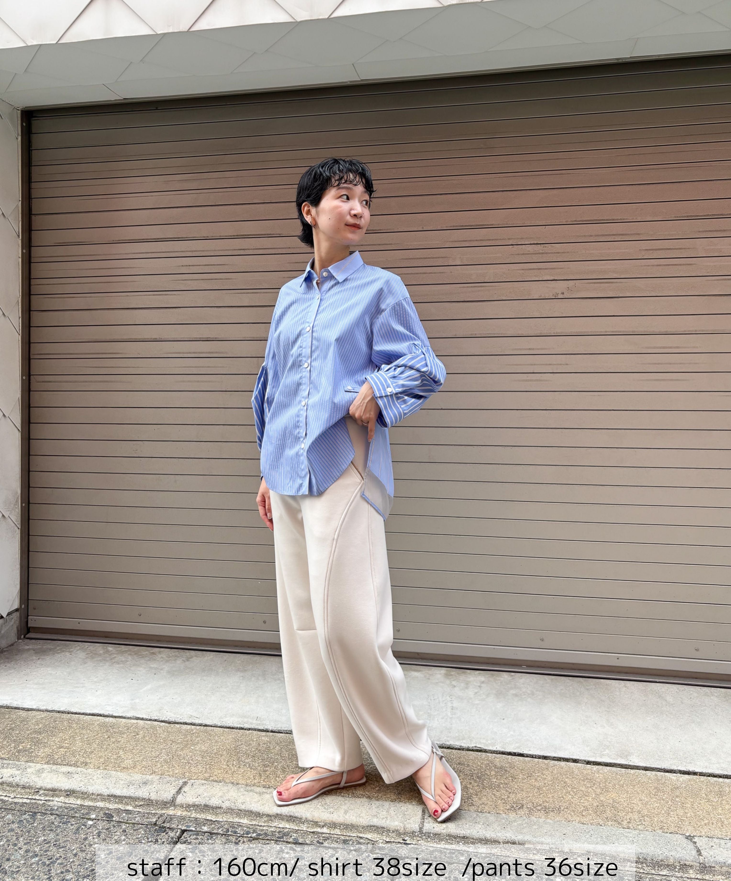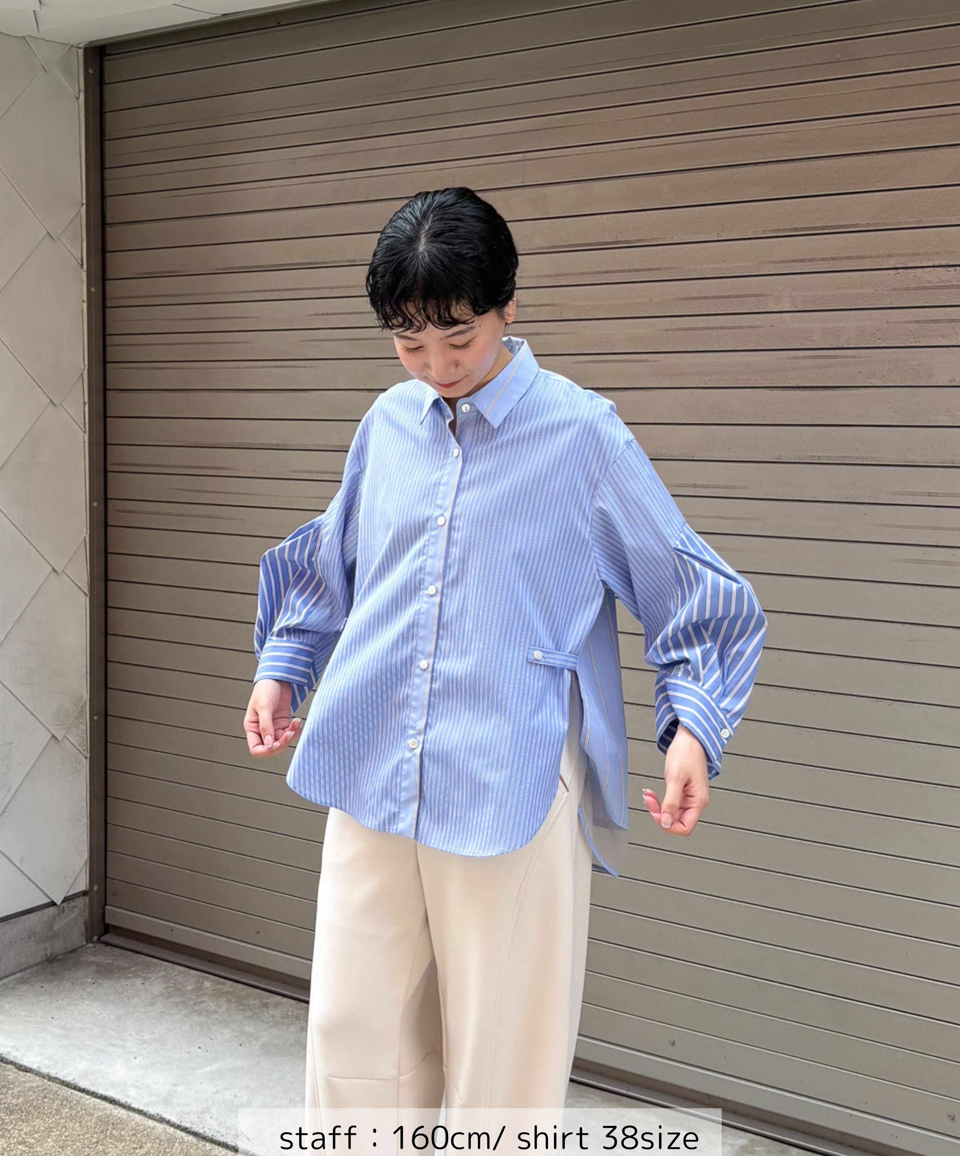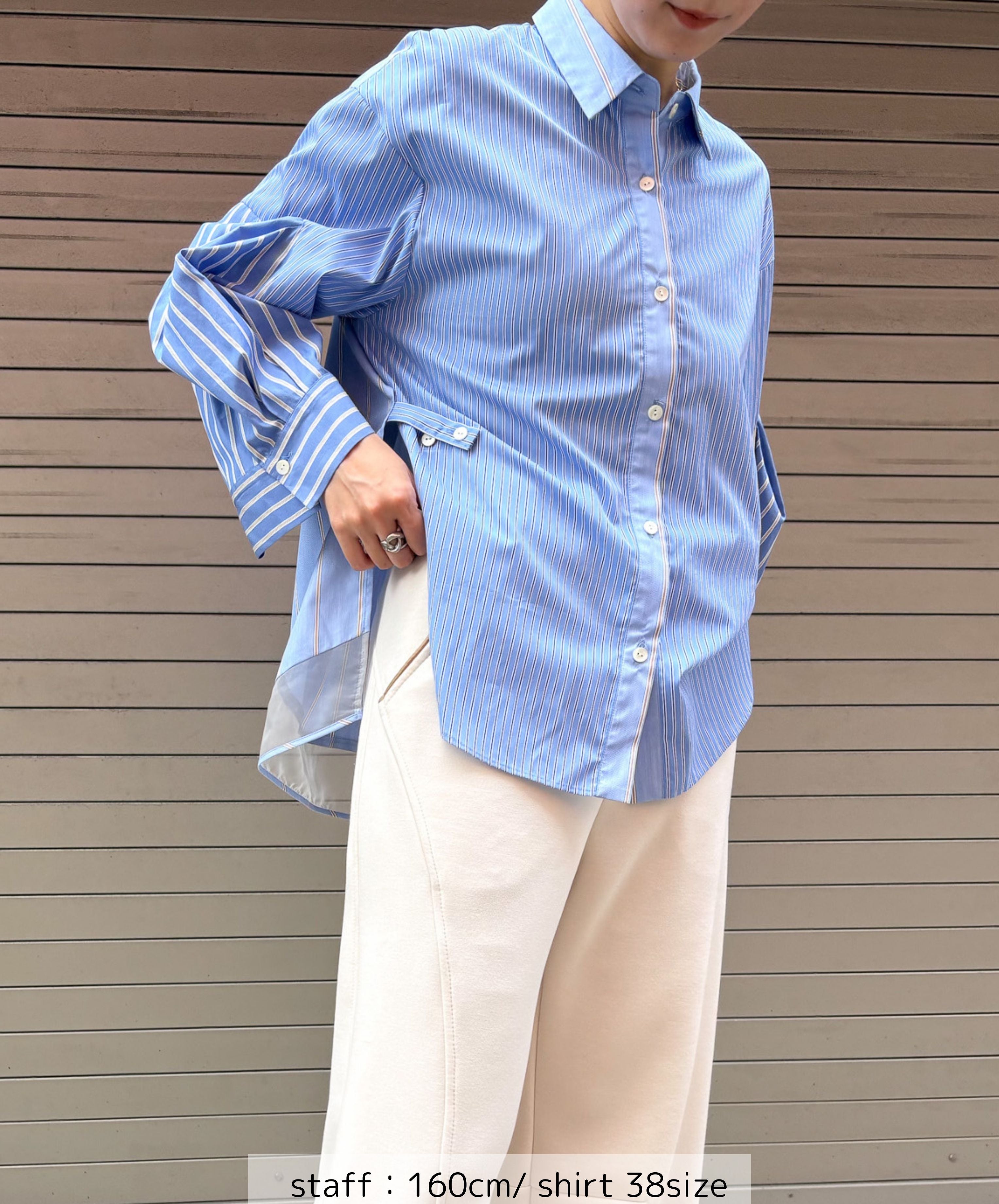 知的で洗練された印象。さりげない3種類のストライプでみせる大人デザインシャツ。衿、袖、身頃にそれぞれ異なるストライプ生地を使用し、シンプルながら個性の光るデザインに仕立てました。異なるピッチのストライプを組み合わせることで奥行きとリズム感が生まれ洗練された印象を与えます。袖には切替とタックでふんわりとした女性らしいシルエットに。やや短めの袖からのぞく手首は大きな袖口とのギャップで華奢見えし、手周りの柔らかな雰囲気を演出します。ウエスト部分には2段階のボタンがつき、ベルトでシェイプを調節可能。好みのシルエットで着こなすことができます。ON/OFF活躍する一枚です。