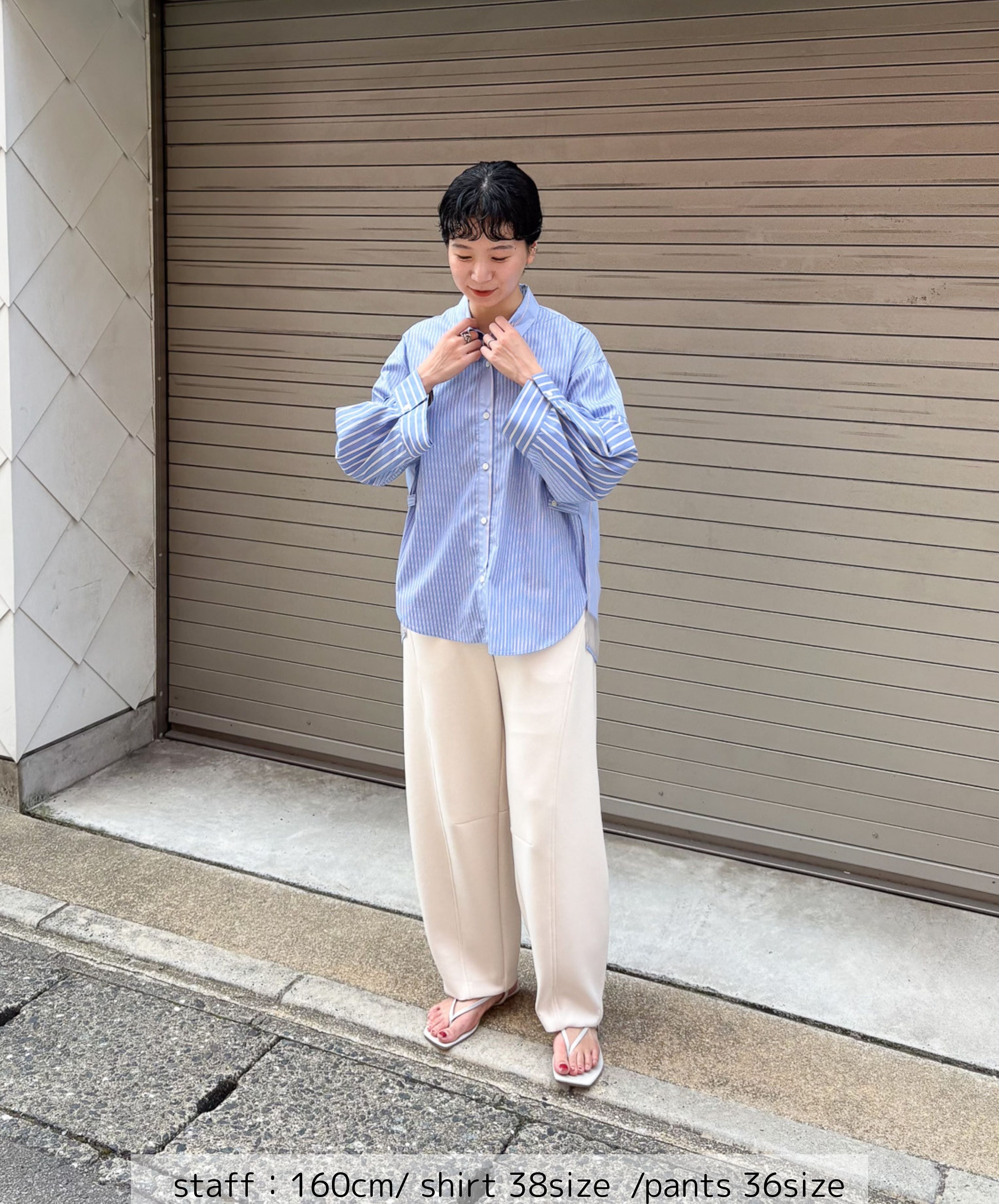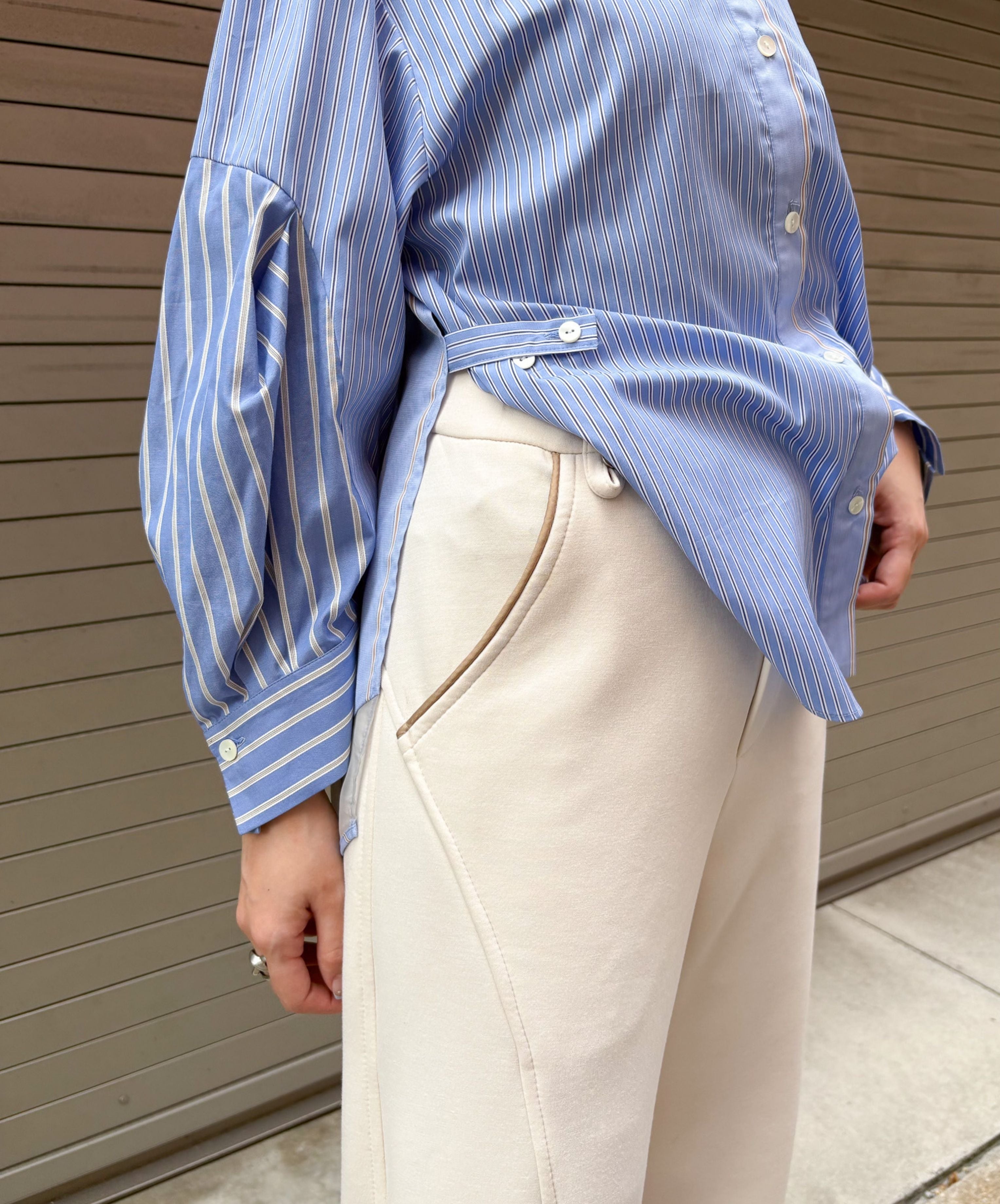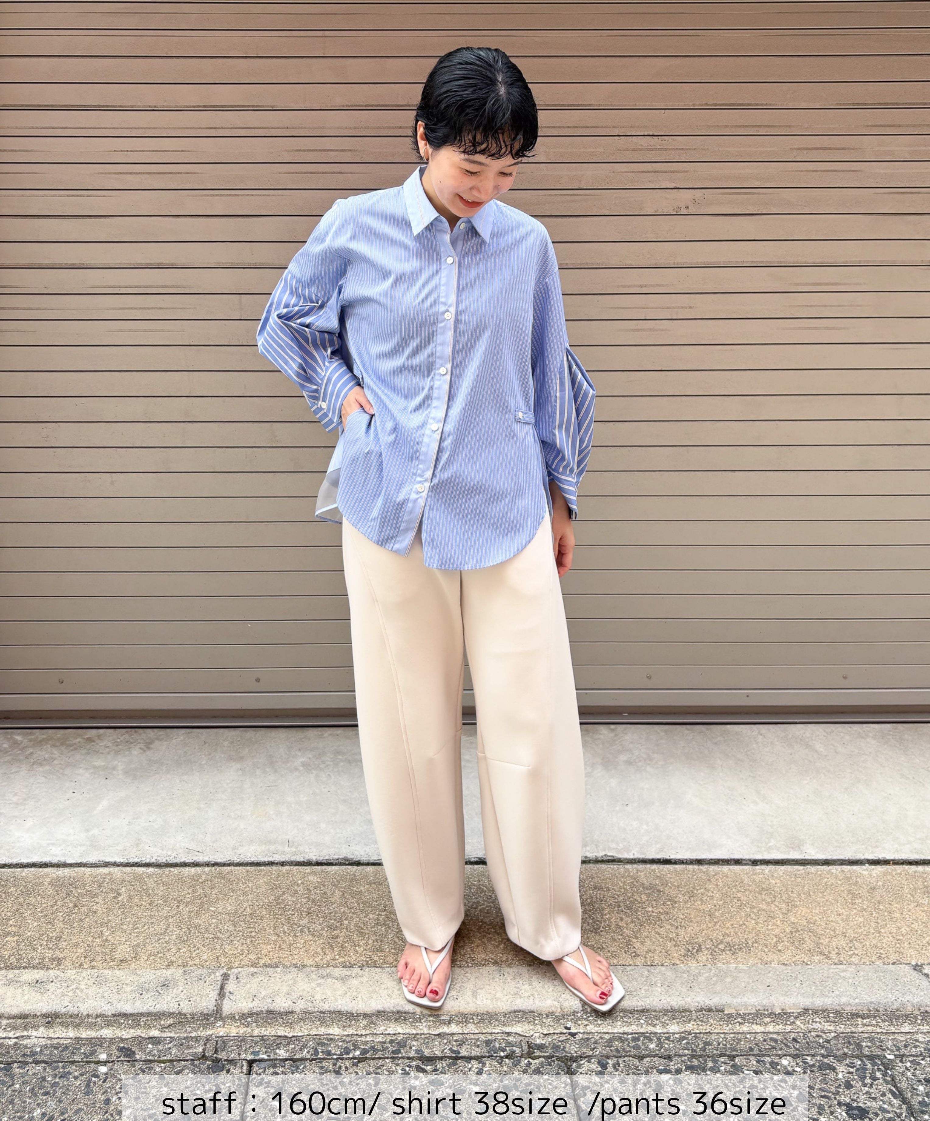 知的で洗練された印象。さりげない3種類のストライプでみせる大人デザインシャツ。衿、袖、身頃にそれぞれ異なるストライプ生地を使用し、シンプルながら個性の光るデザインに仕立てました。異なるピッチのストライプを組み合わせることで奥行きとリズム感が生まれ洗練された印象を与えます。袖には切替とタックでふんわりとした女性らしいシルエットに。やや短めの袖からのぞく手首は大きな袖口とのギャップで華奢見えし、手周りの柔らかな雰囲気を演出します。ウエスト部分には2段階のボタンがつき、ベルトでシェイプを調節可能。好みのシルエットで着こなすことができます。ON/OFF活躍する一枚です。