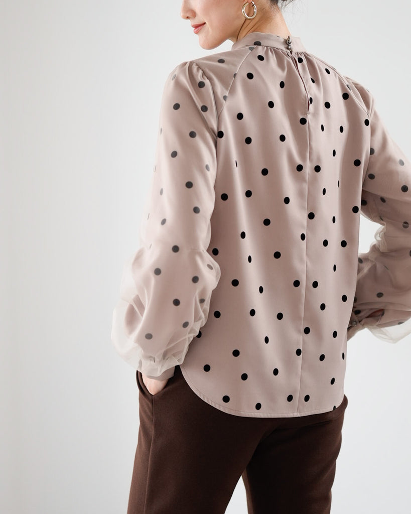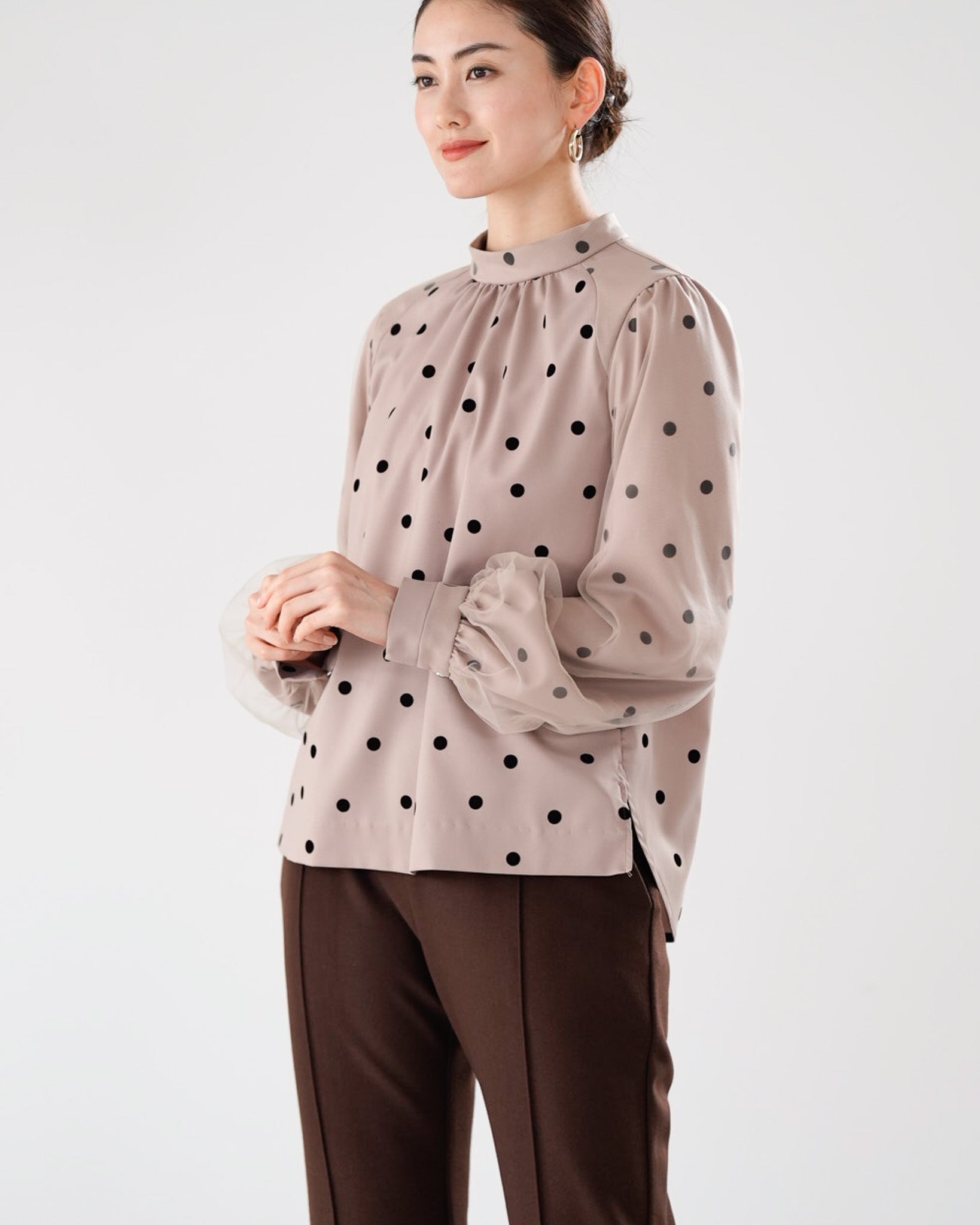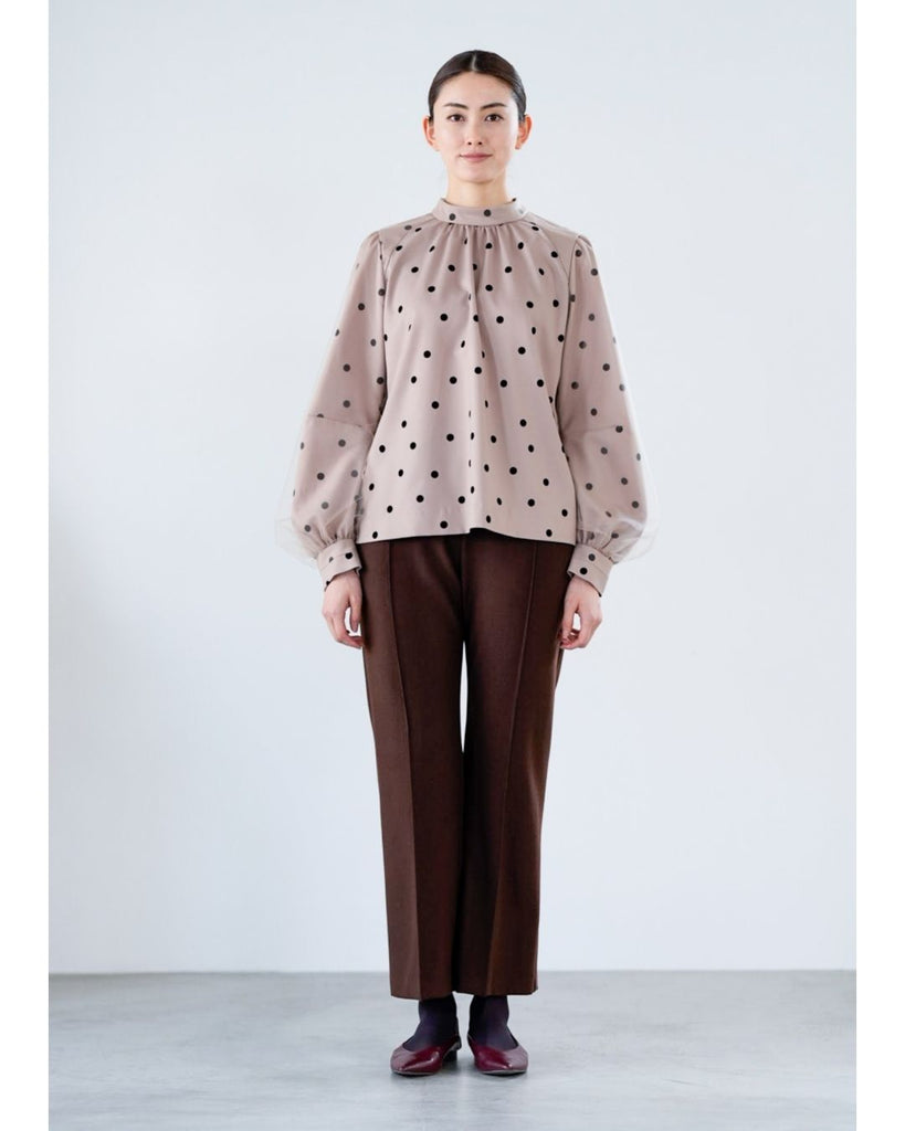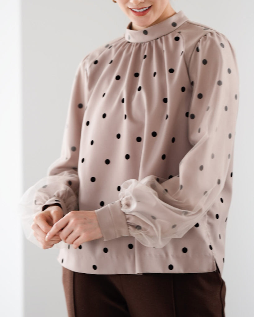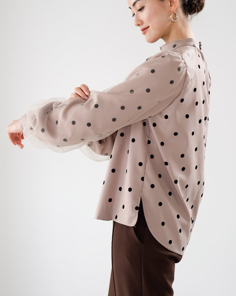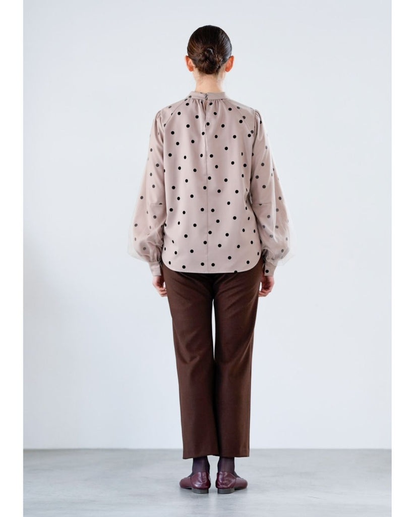 ワードローブに華やかさと上品さを添えるフロッキードットブラウス。ふんわりとぬくもりある立体感が魅力のフロッキードット生地を贅沢に使用し、クラシカルながらもモダンな印象の一枚に仕立てました。肩や袖、衿には繊細な透け感のチュールを重ね、ドット柄との異素材ミックスが表情に奥行きをもたらします。シンプルなボトムスを合わせるだけでワンランク上の着こなしが完成。オフィスシーンから食事会などフォーマルな場にもふさわしいいブラウスです。ミニマムなフォルムで、ベストやサロペット、ジャケットなどのインナーにもおすすめです。