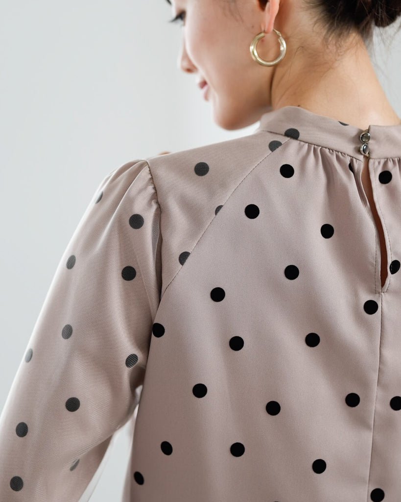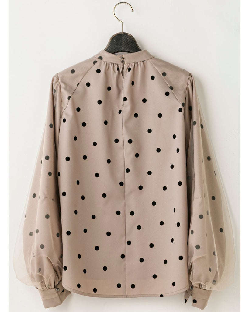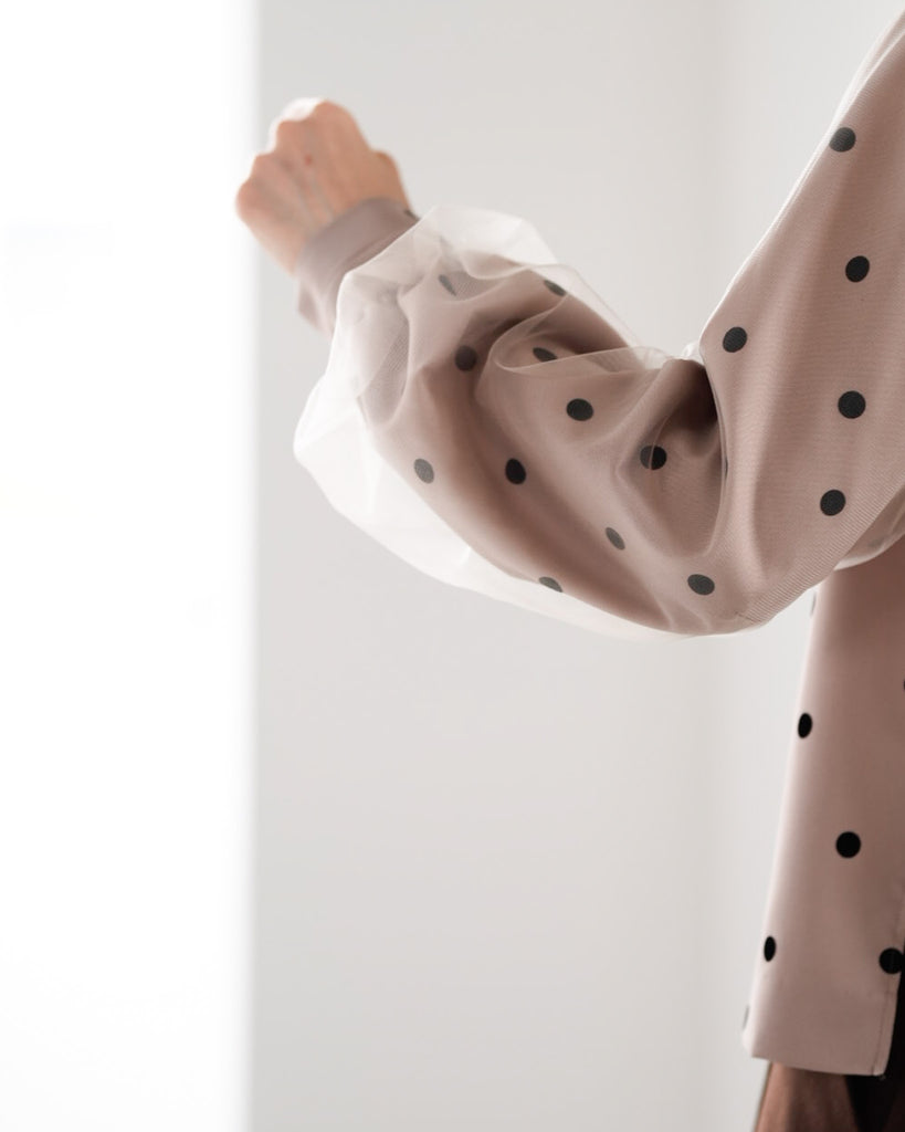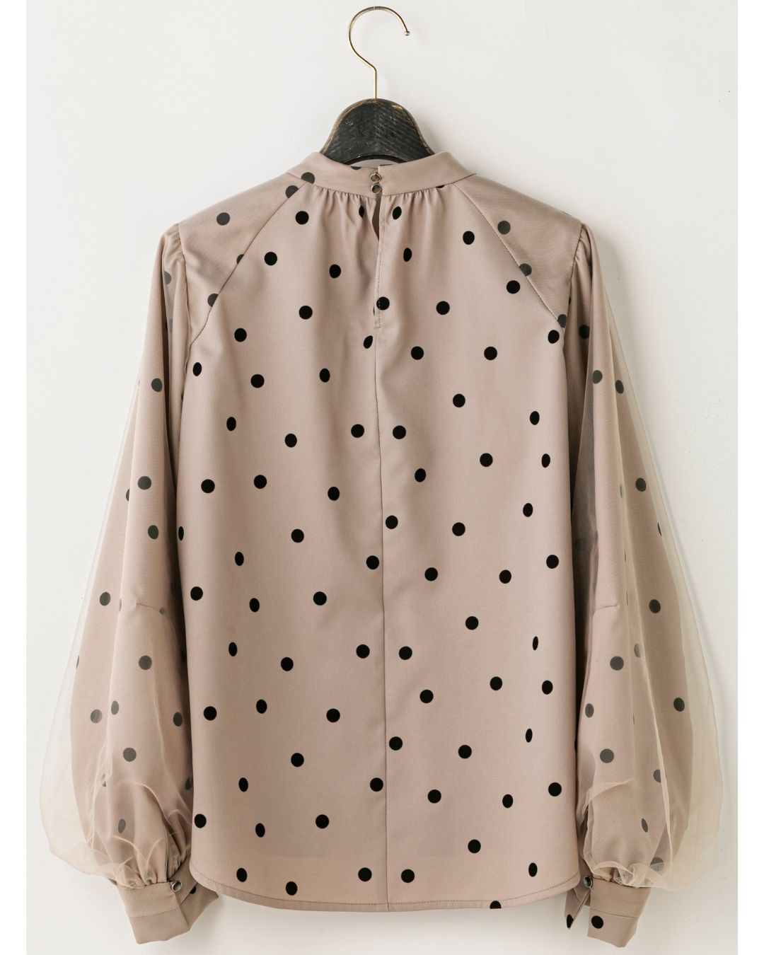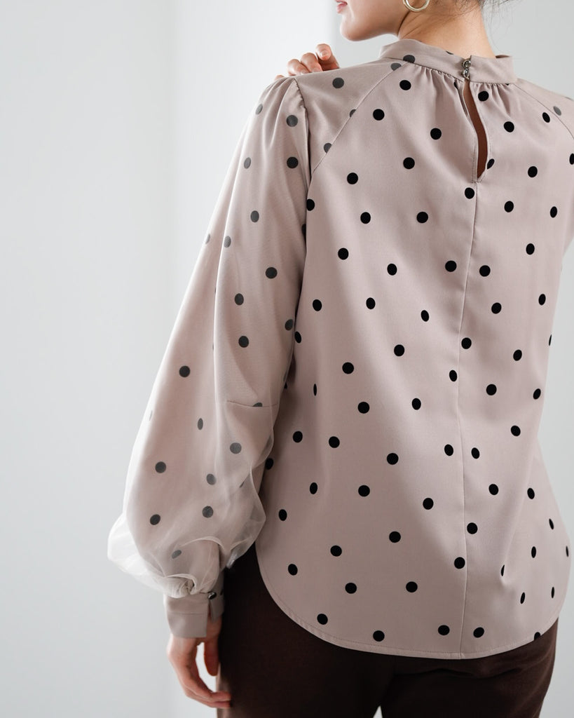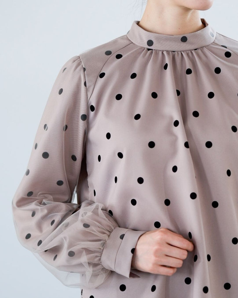 ワードローブに華やかさと上品さを添えるフロッキードットブラウス。ふんわりとぬくもりある立体感が魅力のフロッキードット生地を贅沢に使用し、クラシカルながらもモダンな印象の一枚に仕立てました。肩や袖、衿には繊細な透け感のチュールを重ね、ドット柄との異素材ミックスが表情に奥行きをもたらします。シンプルなボトムスを合わせるだけでワンランク上の着こなしが完成。オフィスシーンから食事会などフォーマルな場にもふさわしいいブラウスです。ミニマムなフォルムで、ベストやサロペット、ジャケットなどのインナーにもおすすめです。