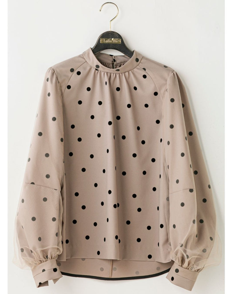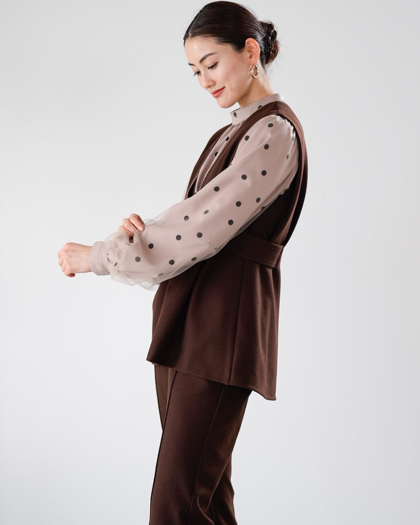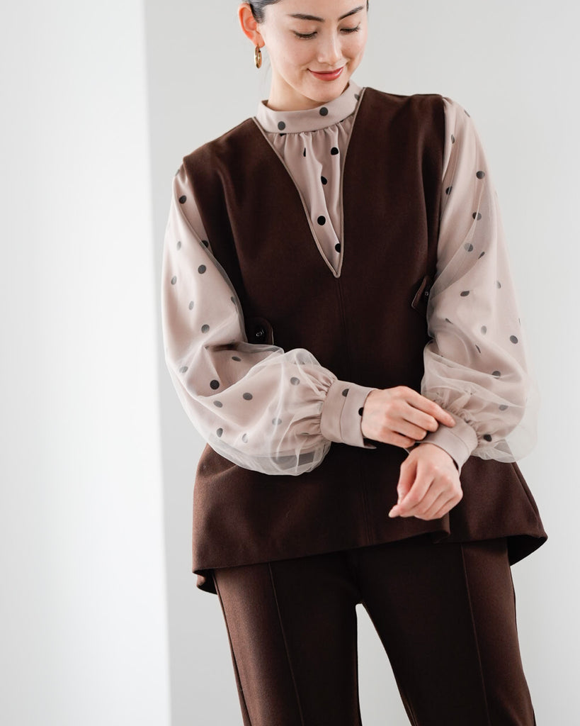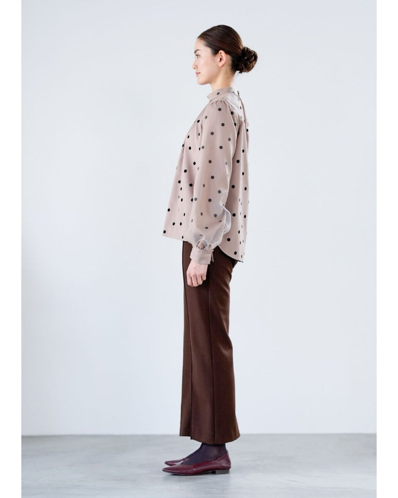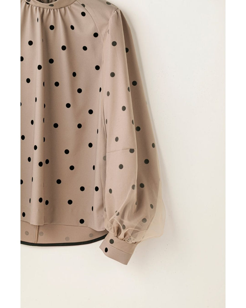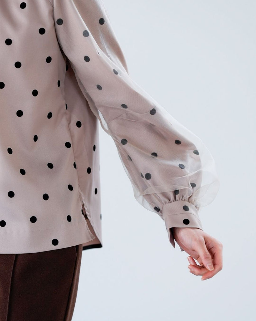 ワードローブに華やかさと上品さを添えるフロッキードットブラウス。ふんわりとぬくもりある立体感が魅力のフロッキードット生地を贅沢に使用し、クラシカルながらもモダンな印象の一枚に仕立てました。肩や袖、衿には繊細な透け感のチュールを重ね、ドット柄との異素材ミックスが表情に奥行きをもたらします。シンプルなボトムスを合わせるだけでワンランク上の着こなしが完成。オフィスシーンから食事会などフォーマルな場にもふさわしいいブラウスです。ミニマムなフォルムで、ベストやサロペット、ジャケットなどのインナーにもおすすめです。
