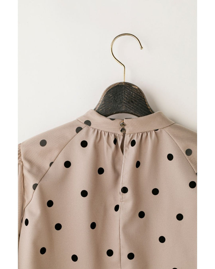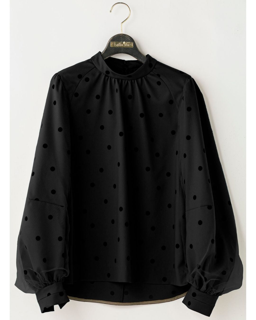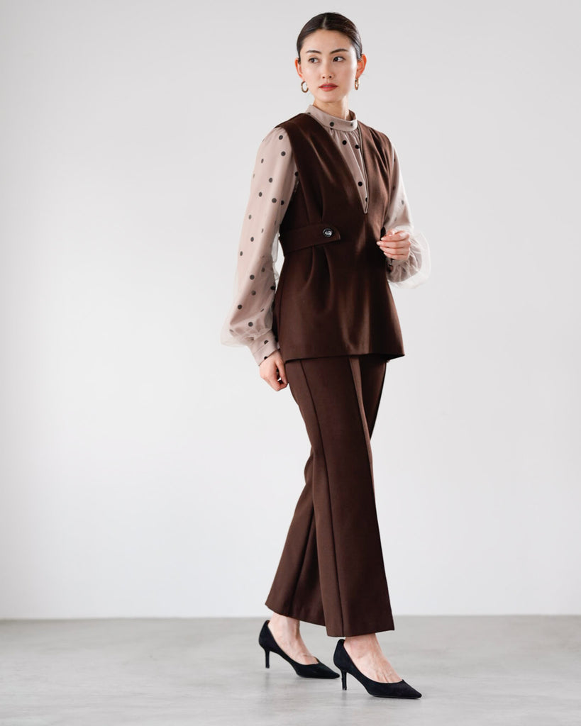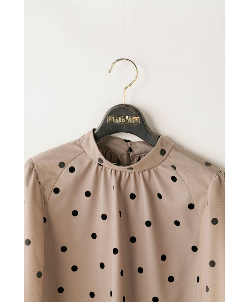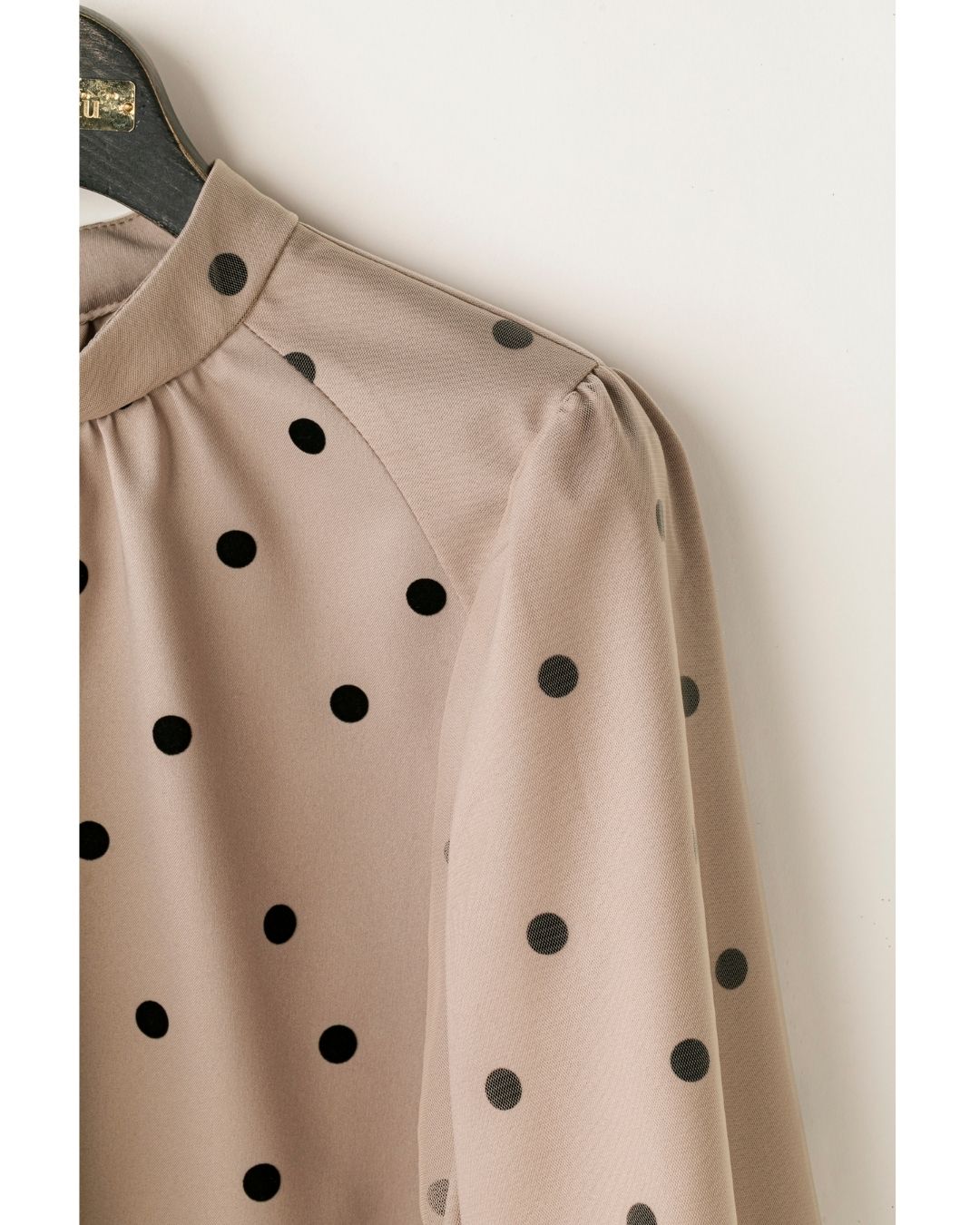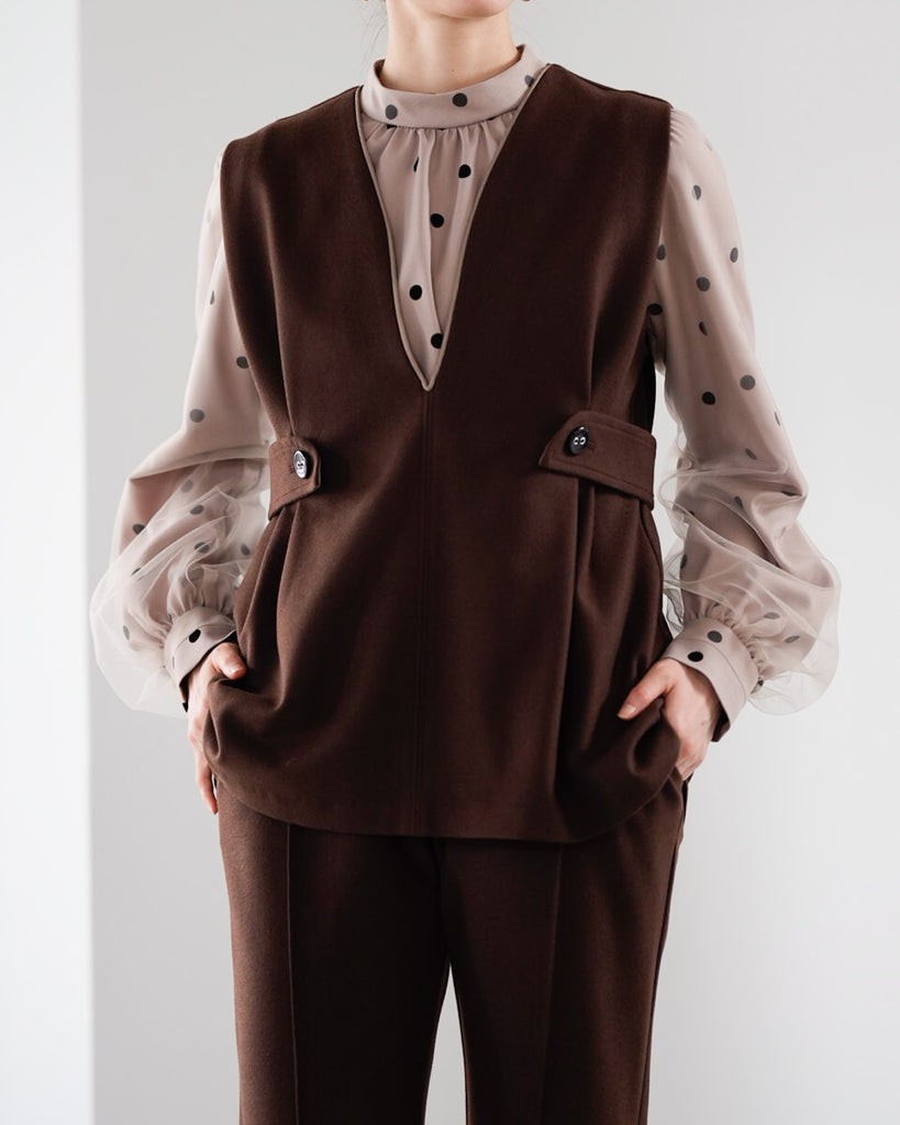 ワードローブに華やかさと上品さを添えるフロッキードットブラウス。ふんわりとぬくもりある立体感が魅力のフロッキードット生地を贅沢に使用し、クラシカルながらもモダンな印象の一枚に仕立てました。肩や袖、衿には繊細な透け感のチュールを重ね、ドット柄との異素材ミックスが表情に奥行きをもたらします。シンプルなボトムスを合わせるだけでワンランク上の着こなしが完成。オフィスシーンから食事会などフォーマルな場にもふさわしいいブラウスです。ミニマムなフォルムで、ベストやサロペット、ジャケットなどのインナーにもおすすめです。