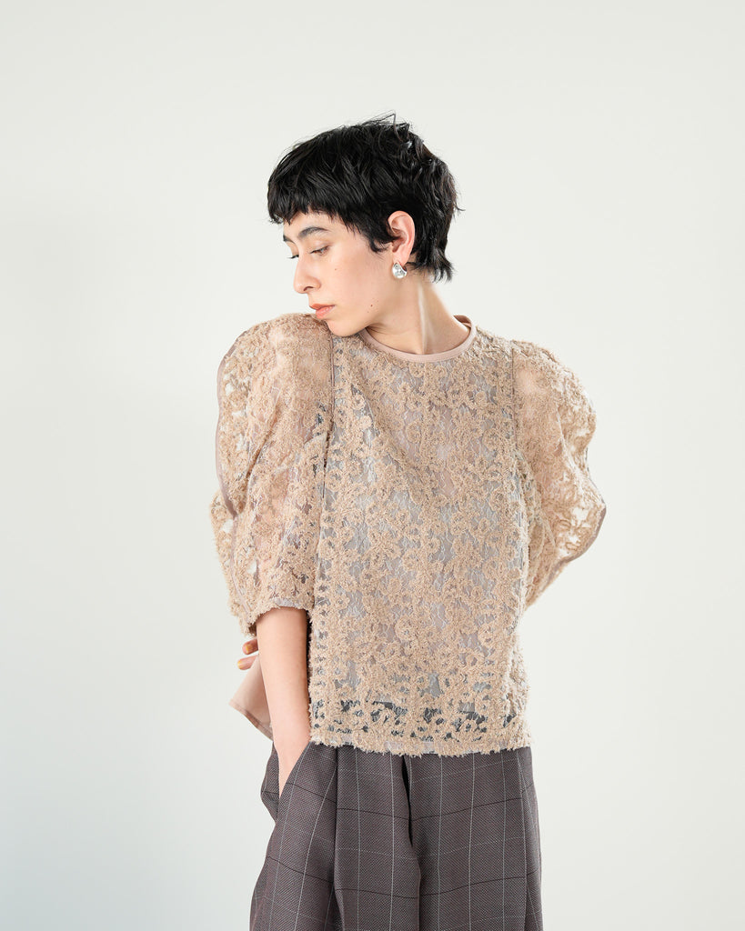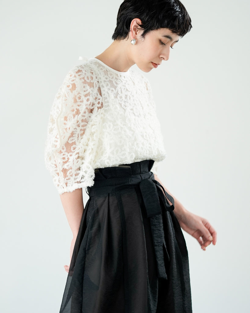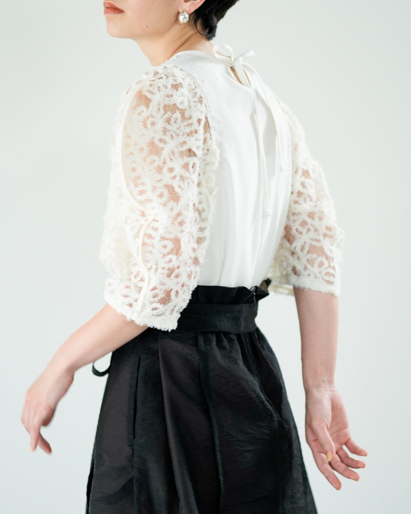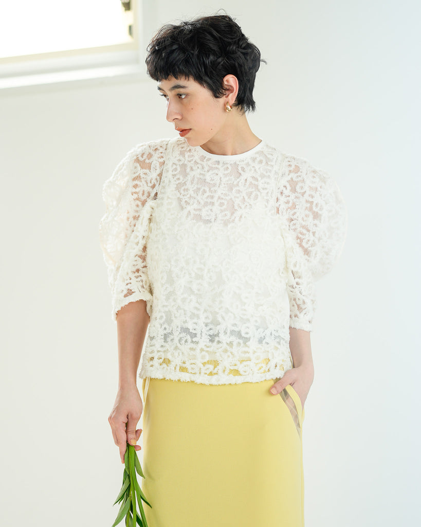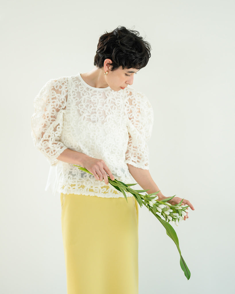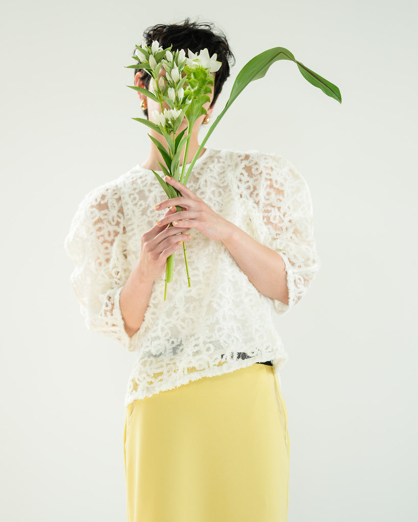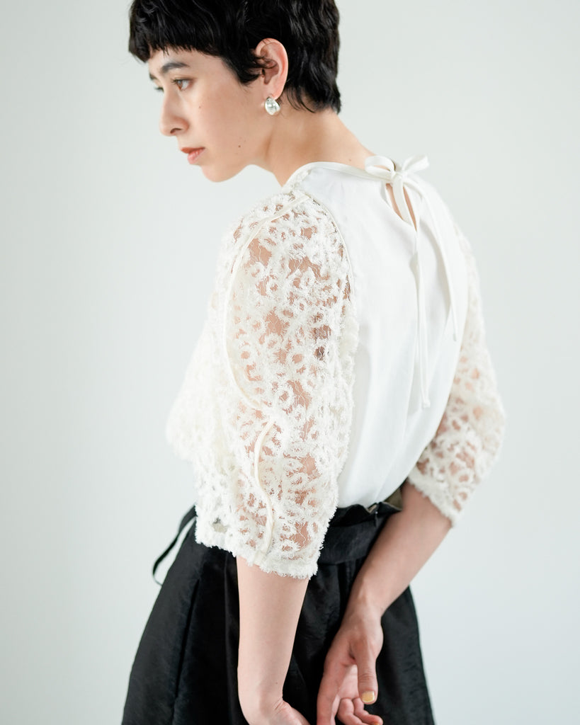 一枚で絵になる春らしくフェミニンな印象のレースブラウス。インパクトのある立体的なモールレースジャガードとアイコニックな袖で甘さとモードさを演出する一枚です。ふんわりと浮かび上がるモールレースが、一枚で主役級の存在感を発揮。大人のフェミニンスタイルに差別化をもたらす構築的なデザインはLallia Múの意匠的な立体裁断から生まれています。合わせるボトム次第でフォーマルにもカジュアルにも対応可能。きれいめボトムと合わせて、オケージョンスタイルにもおすすめです。袖のシルエットをなぞるように丁寧に施されたパイピングが全体を引き締め、甘い中にも大人のこだわりを感じさせる一枚です。