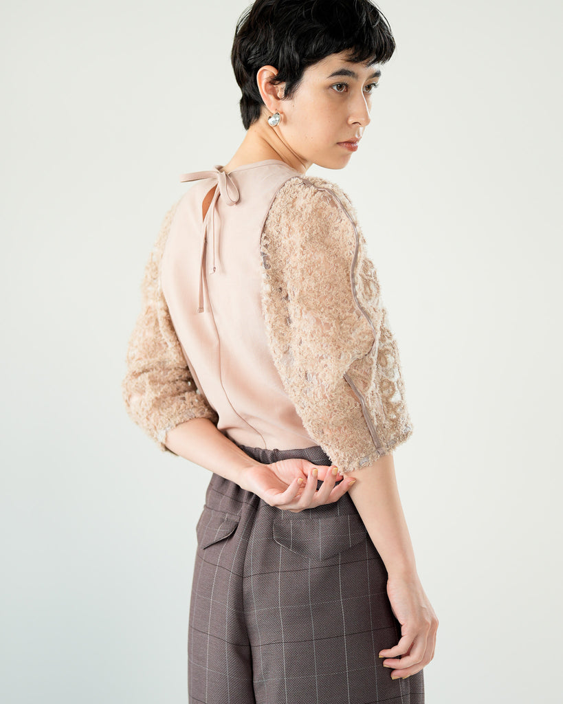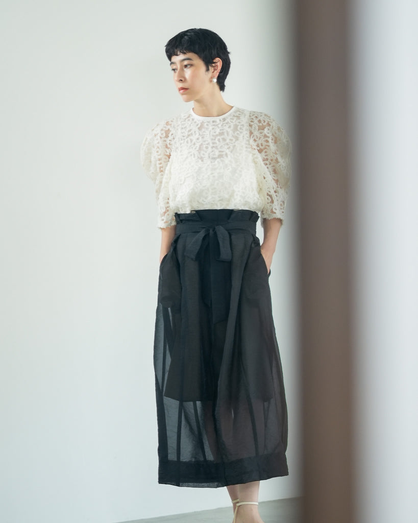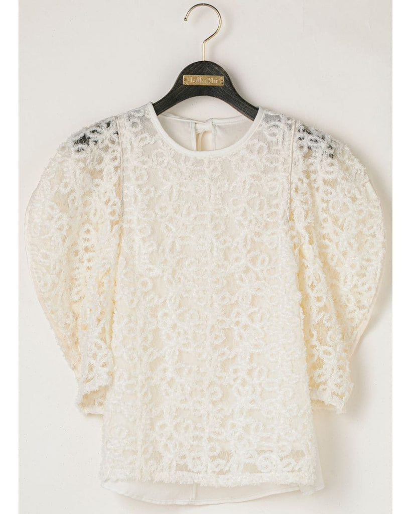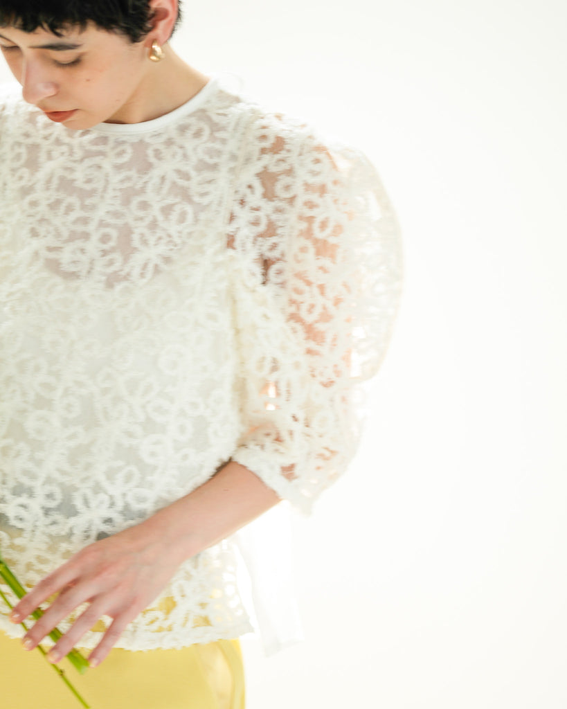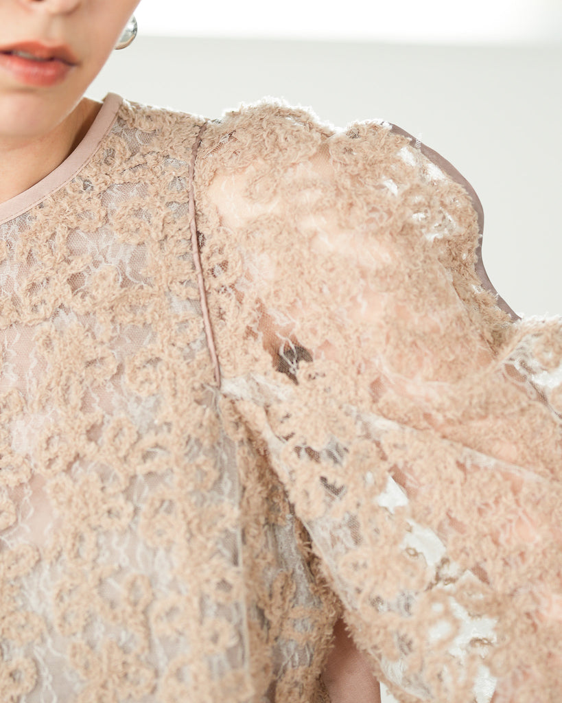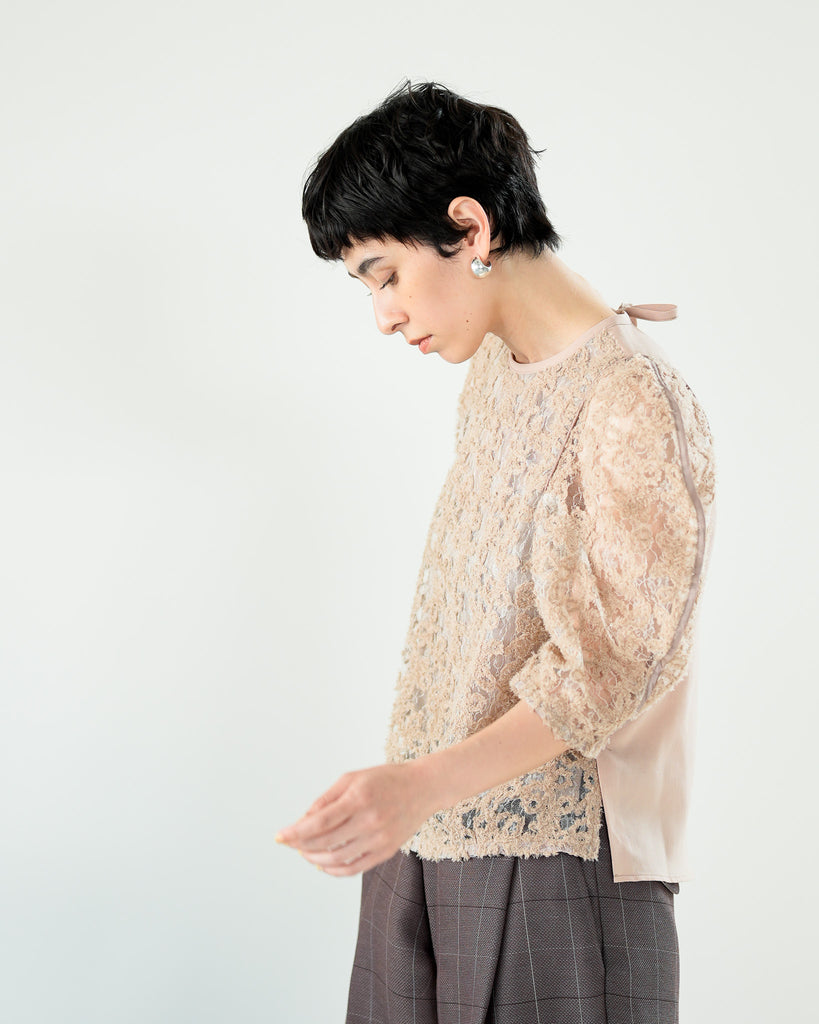 一枚で絵になる春らしくフェミニンな印象のレースブラウス。インパクトのある立体的なモールレースジャガードとアイコニックな袖で甘さとモードさを演出する一枚です。ふんわりと浮かび上がるモールレースが、一枚で主役級の存在感を発揮。大人のフェミニンスタイルに差別化をもたらす構築的なデザインはLallia Múの意匠的な立体裁断から生まれています。合わせるボトム次第でフォーマルにもカジュアルにも対応可能。きれいめボトムと合わせて、オケージョンスタイルにもおすすめです。袖のシルエットをなぞるように丁寧に施されたパイピングが全体を引き締め、甘い中にも大人のこだわりを感じさせる一枚です。