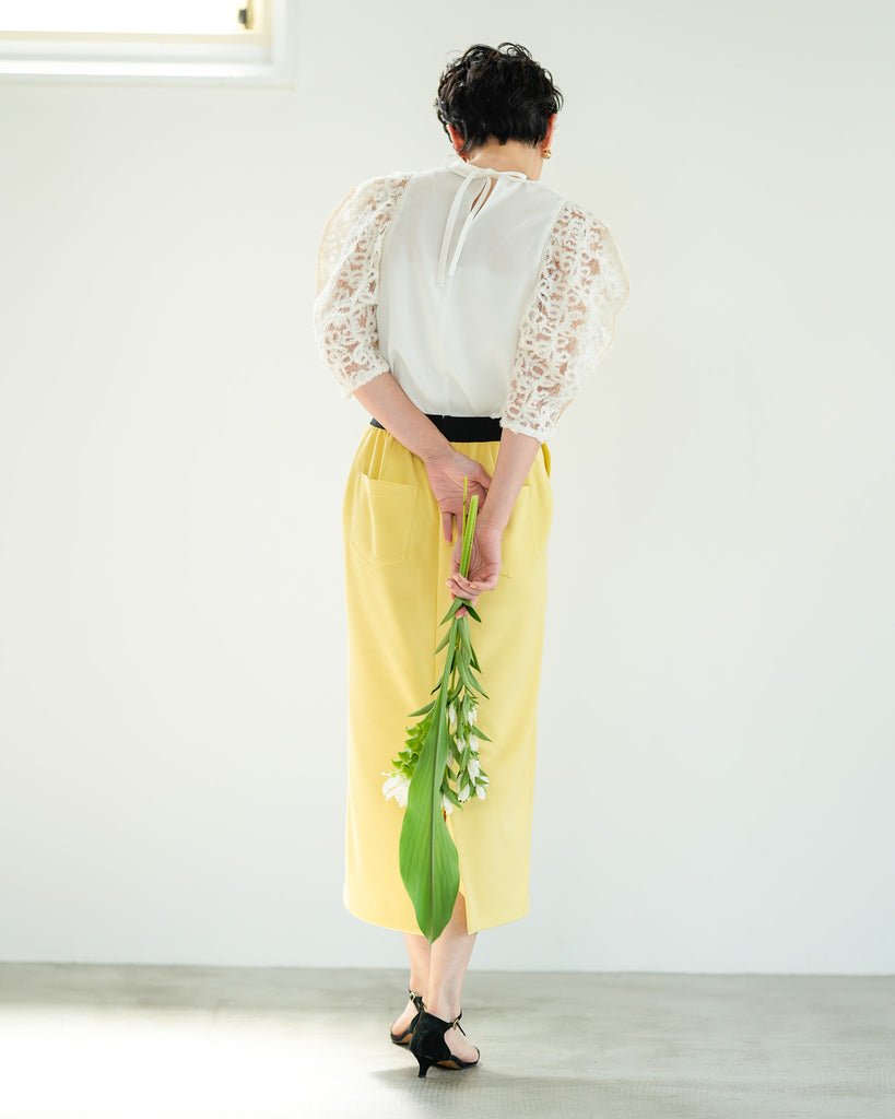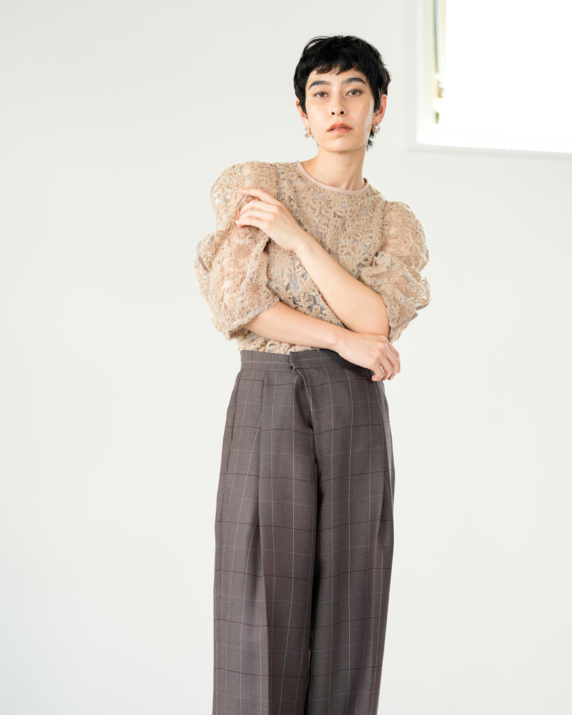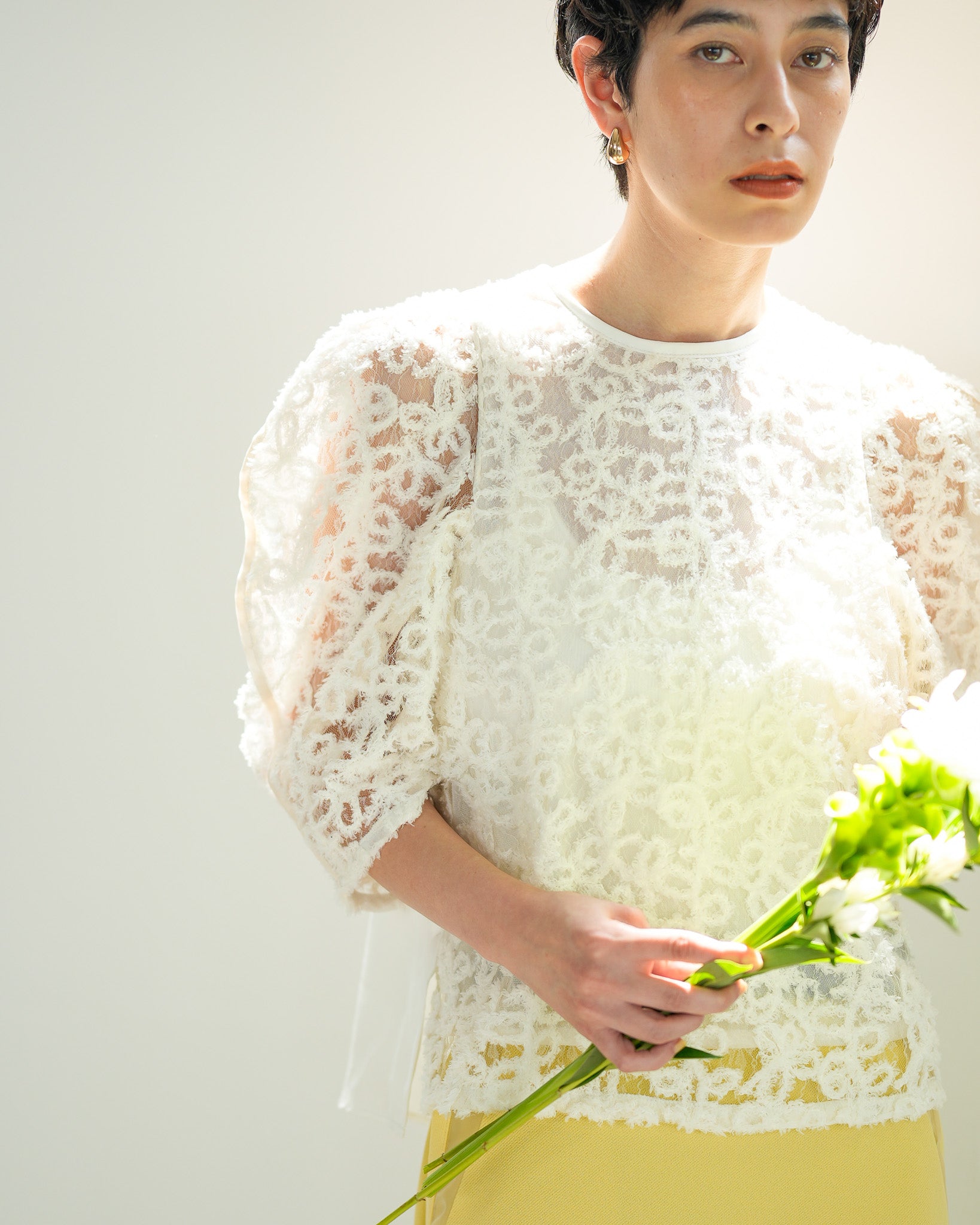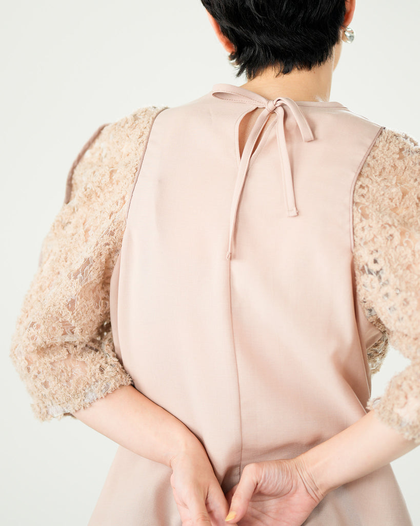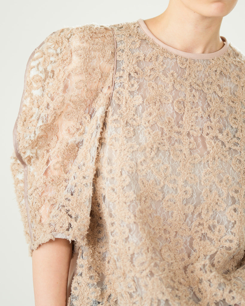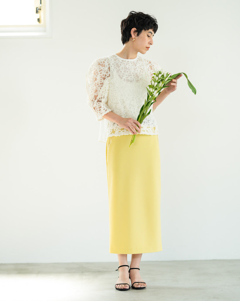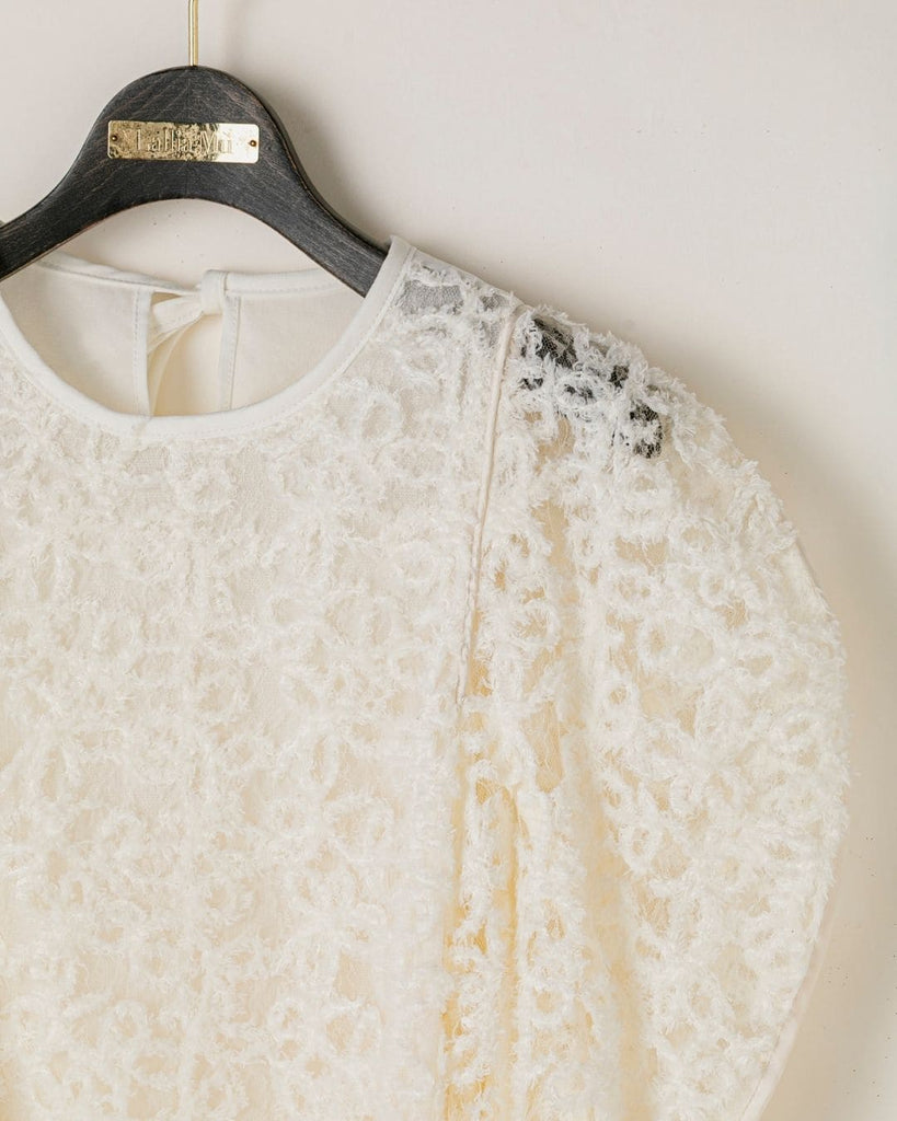 一枚で絵になる春らしくフェミニンな印象のレースブラウス。インパクトのある立体的なモールレースジャガードとアイコニックな袖で甘さとモードさを演出する一枚です。ふんわりと浮かび上がるモールレースが、一枚で主役級の存在感を発揮。大人のフェミニンスタイルに差別化をもたらす構築的なデザインはLallia Múの意匠的な立体裁断から生まれています。合わせるボトム次第でフォーマルにもカジュアルにも対応可能。きれいめボトムと合わせて、オケージョンスタイルにもおすすめです。袖のシルエットをなぞるように丁寧に施されたパイピングが全体を引き締め、甘い中にも大人のこだわりを感じさせる一枚です。