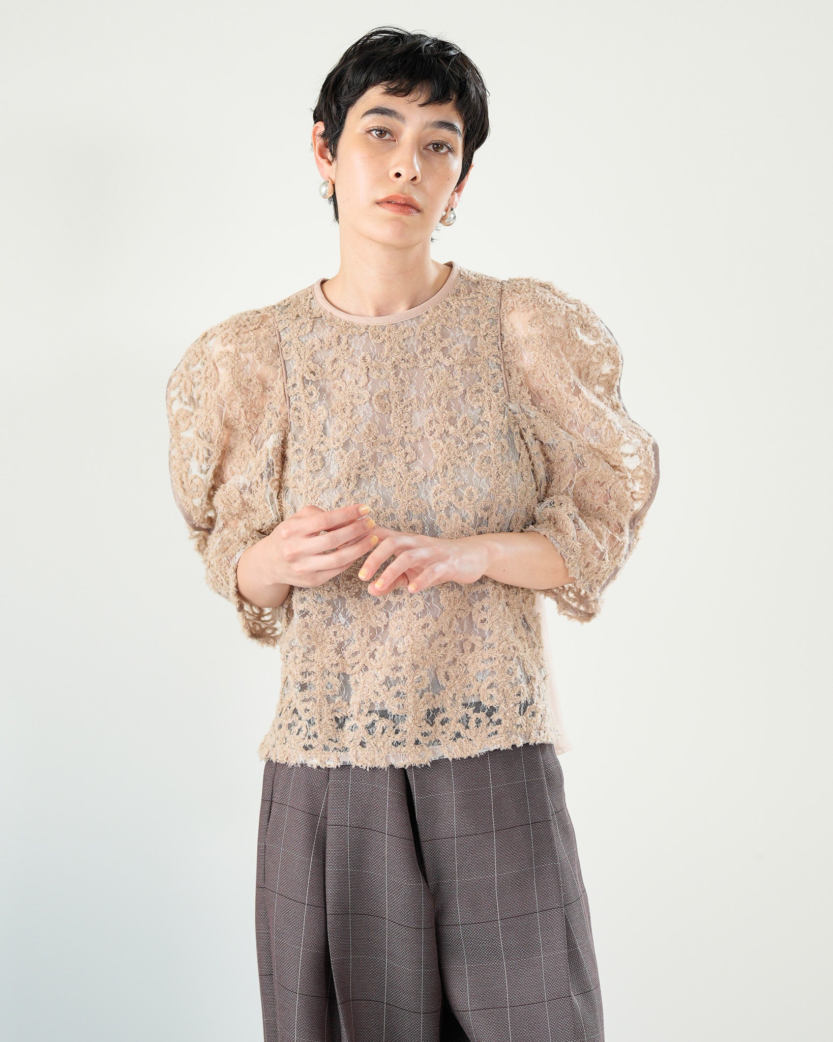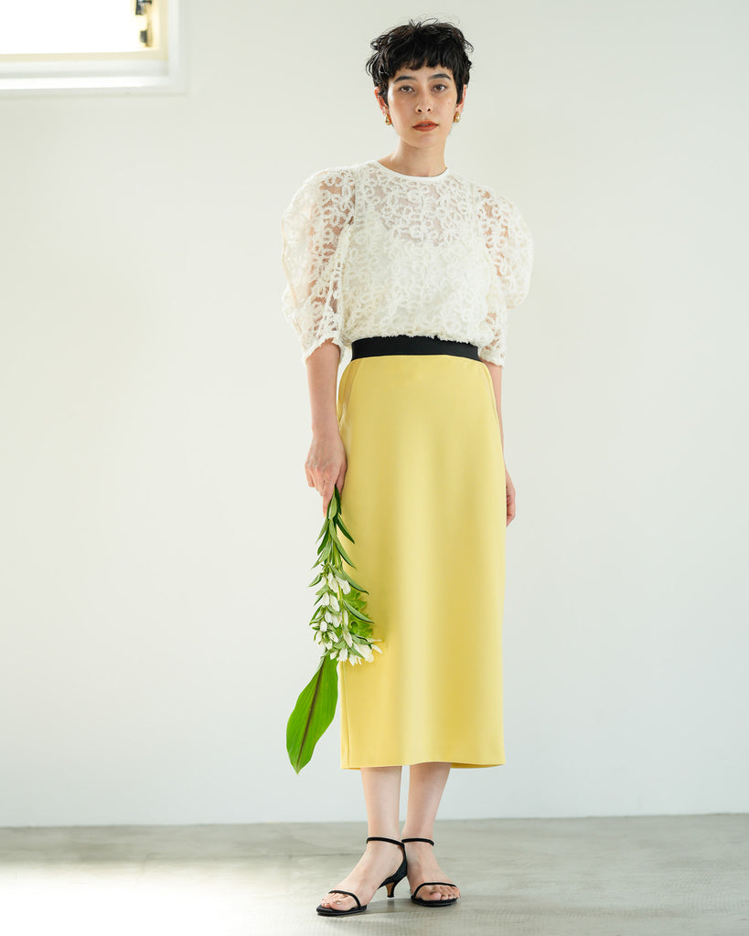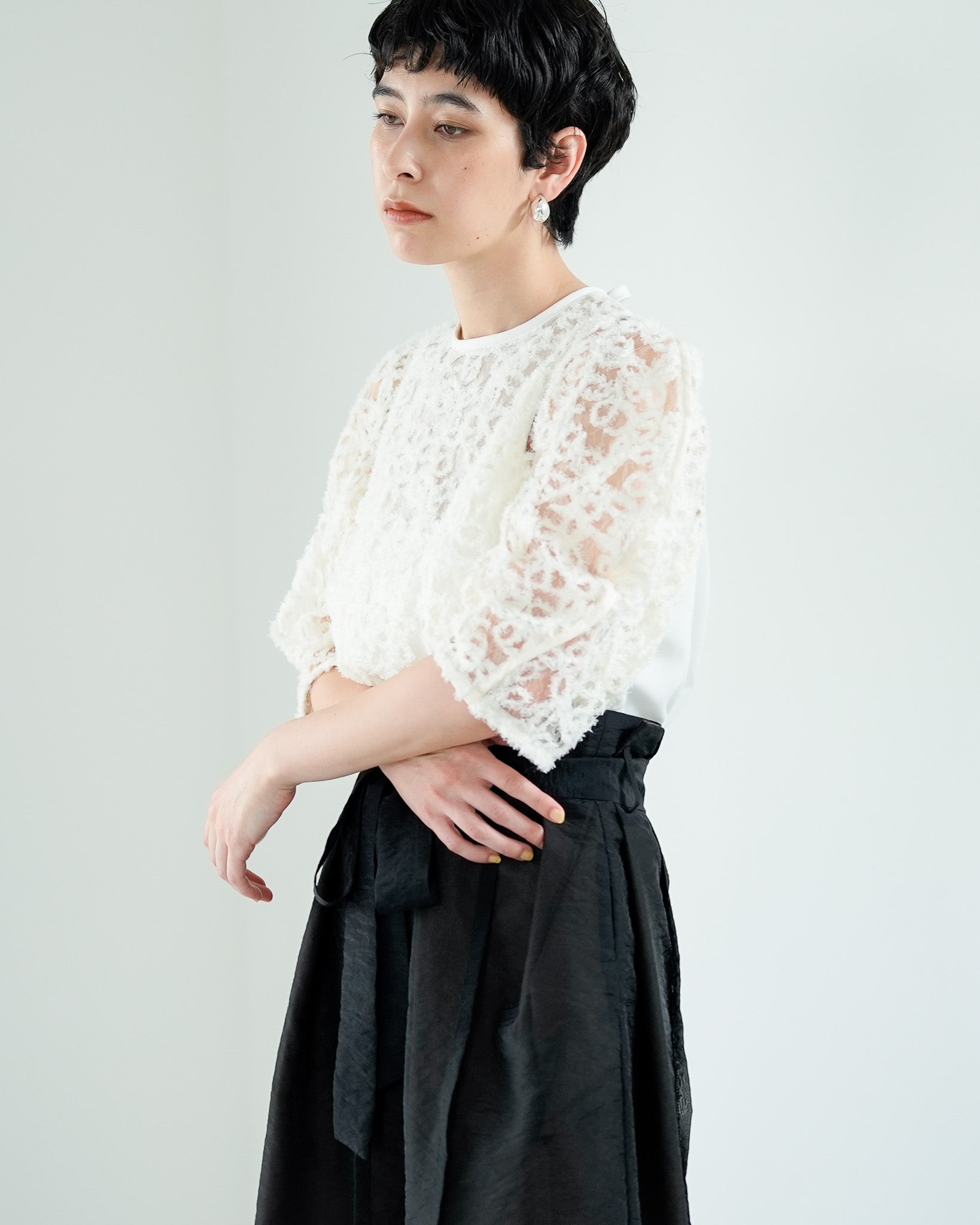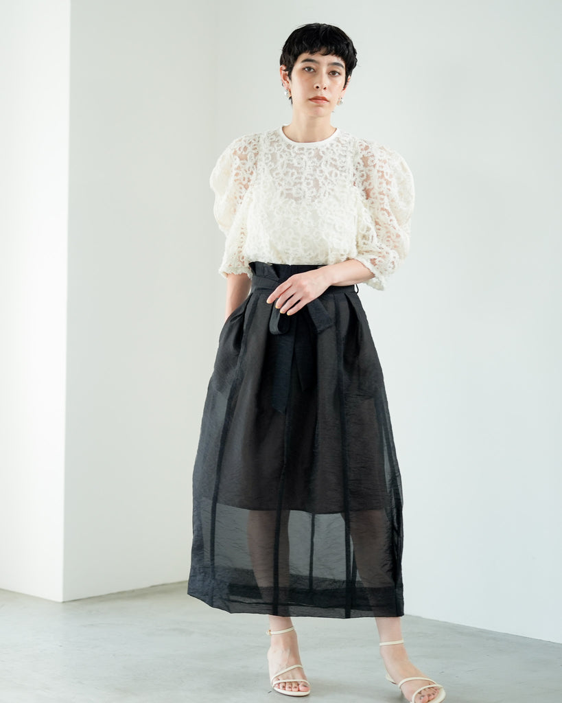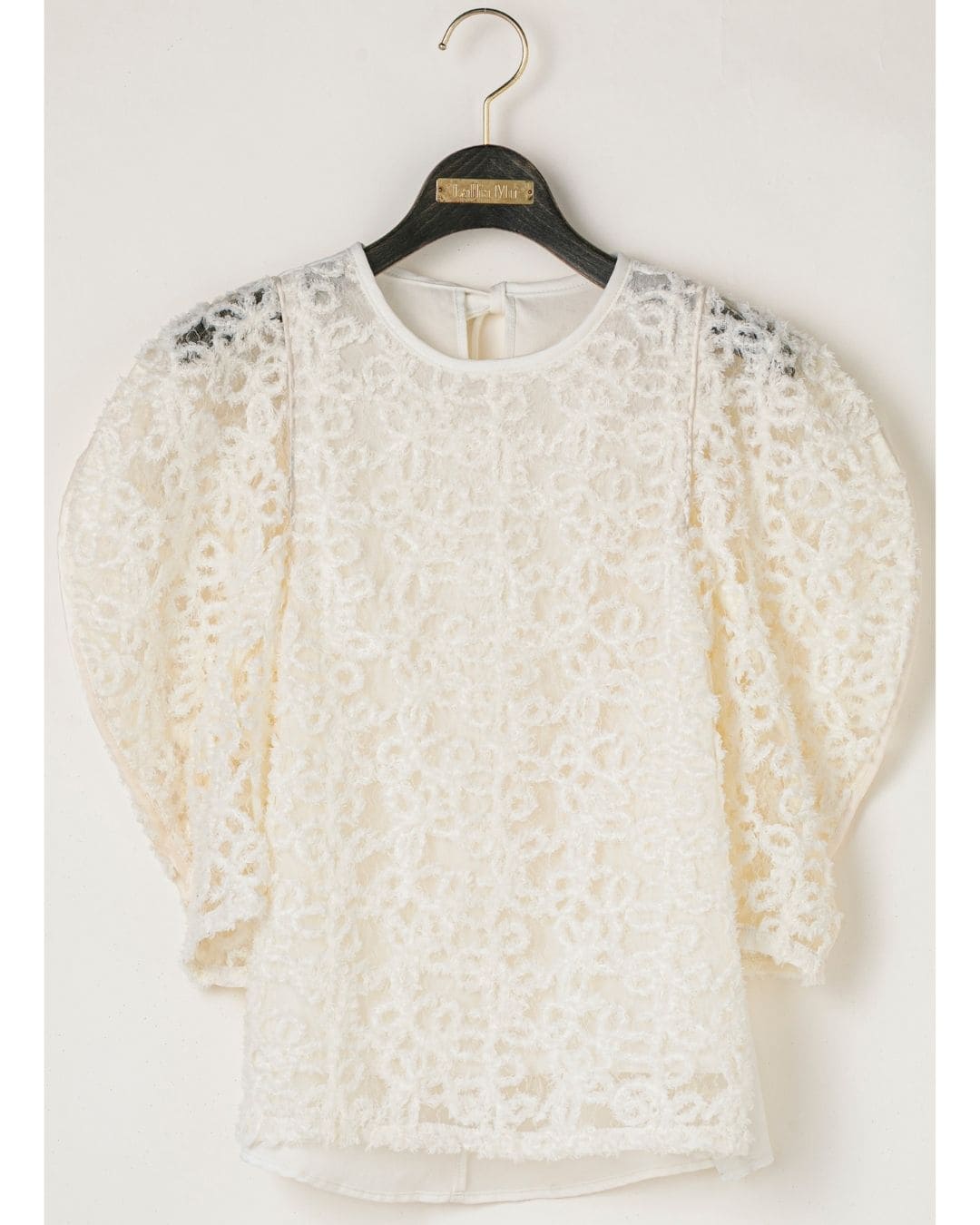 一枚で絵になる春らしくフェミニンな印象のレースブラウス。インパクトのある立体的なモールレースジャガードとアイコニックな袖で甘さとモードさを演出する一枚です。ふんわりと浮かび上がるモールレースが、一枚で主役級の存在感を発揮。大人のフェミニンスタイルに差別化をもたらす構築的なデザインはLallia Múの意匠的な立体裁断から生まれています。合わせるボトム次第でフォーマルにもカジュアルにも対応可能。きれいめボトムと合わせて、オケージョンスタイルにもおすすめです。袖のシルエットをなぞるように丁寧に施されたパイピングが全体を引き締め、甘い中にも大人のこだわりを感じさせる一枚です。