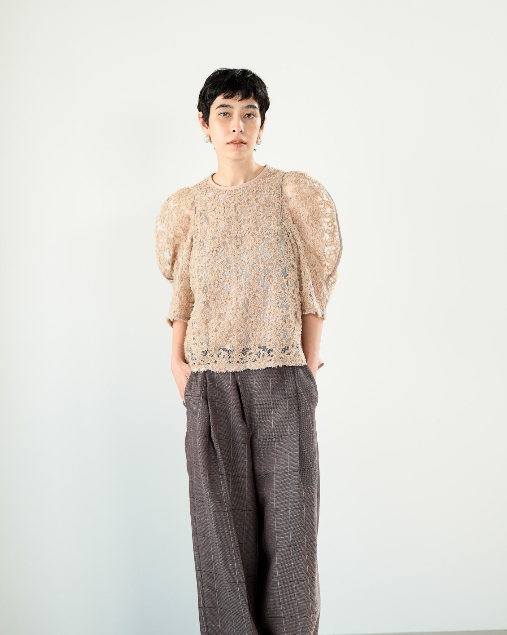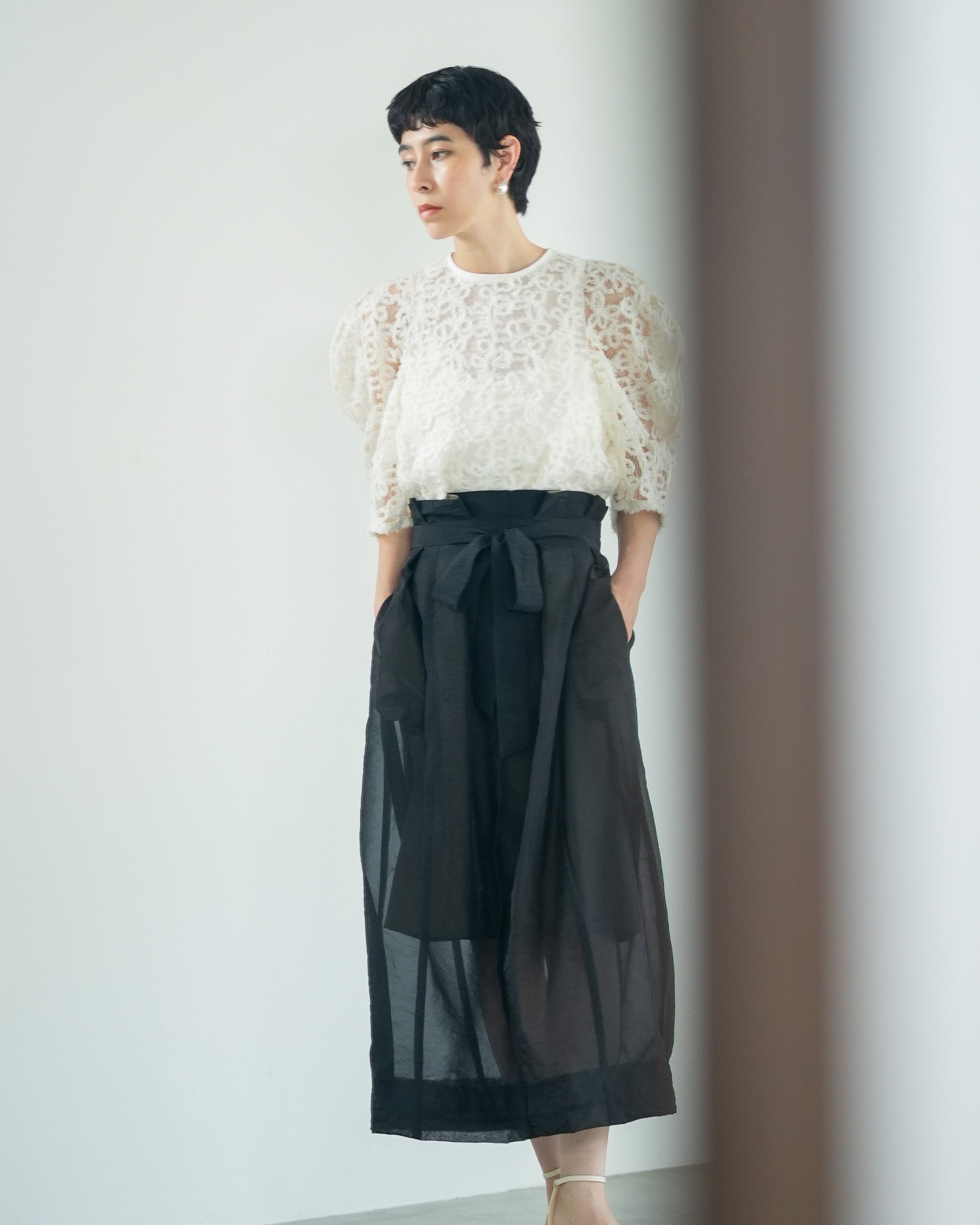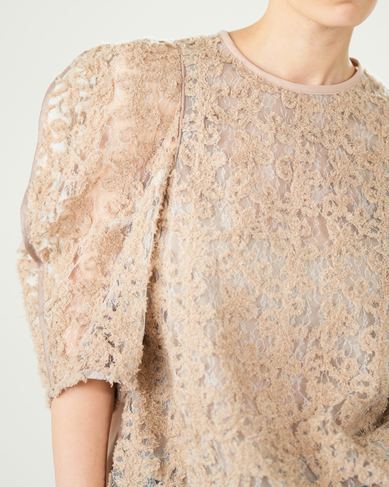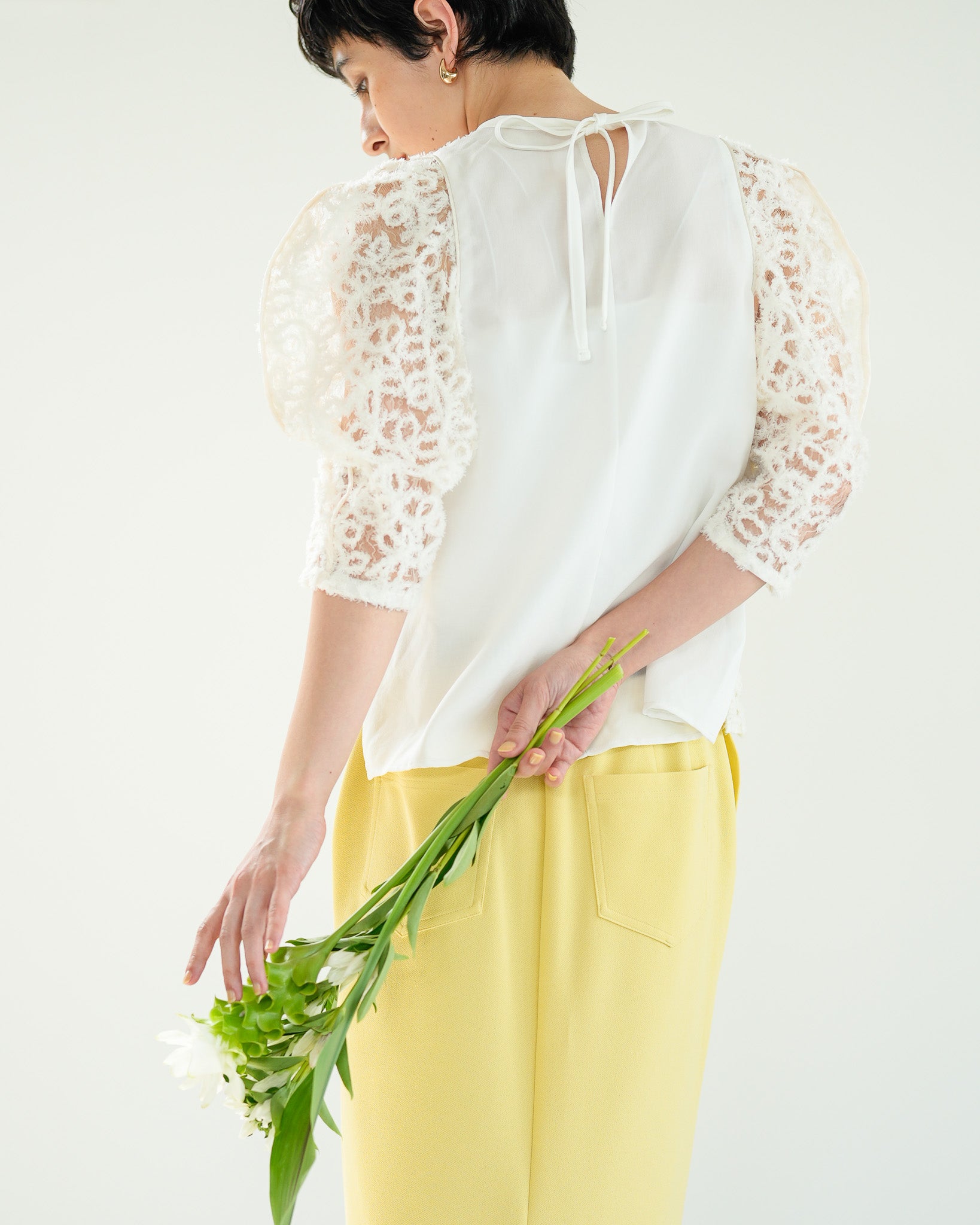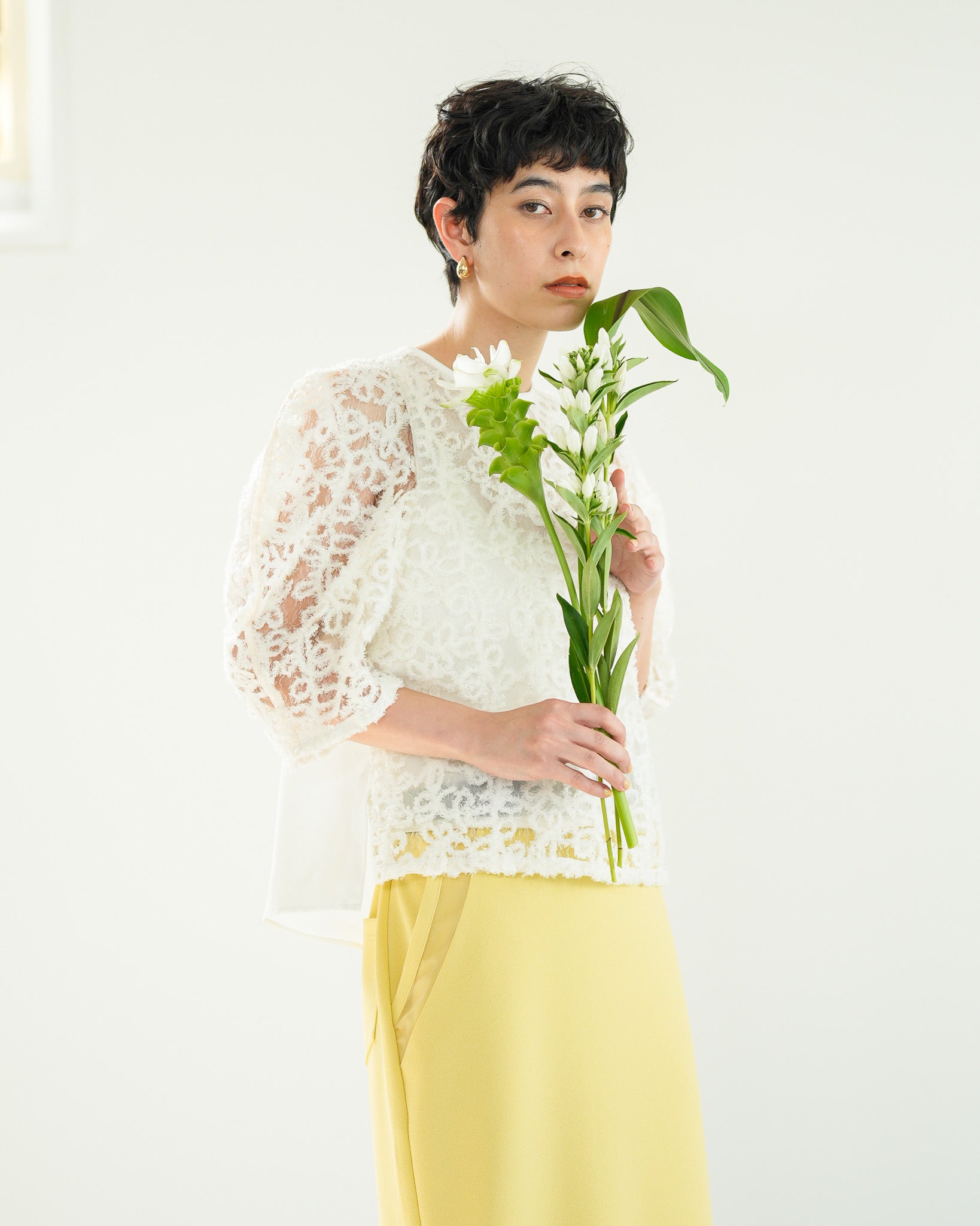 一枚で絵になる春らしくフェミニンな印象のレースブラウス。インパクトのある立体的なモールレースジャガードとアイコニックな袖で甘さとモードさを演出する一枚です。ふんわりと浮かび上がるモールレースが、一枚で主役級の存在感を発揮。大人のフェミニンスタイルに差別化をもたらす構築的なデザインはLallia Múの意匠的な立体裁断から生まれています。合わせるボトム次第でフォーマルにもカジュアルにも対応可能。きれいめボトムと合わせて、オケージョンスタイルにもおすすめです。袖のシルエットをなぞるように丁寧に施されたパイピングが全体を引き締め、甘い中にも大人のこだわりを感じさせる一枚です。