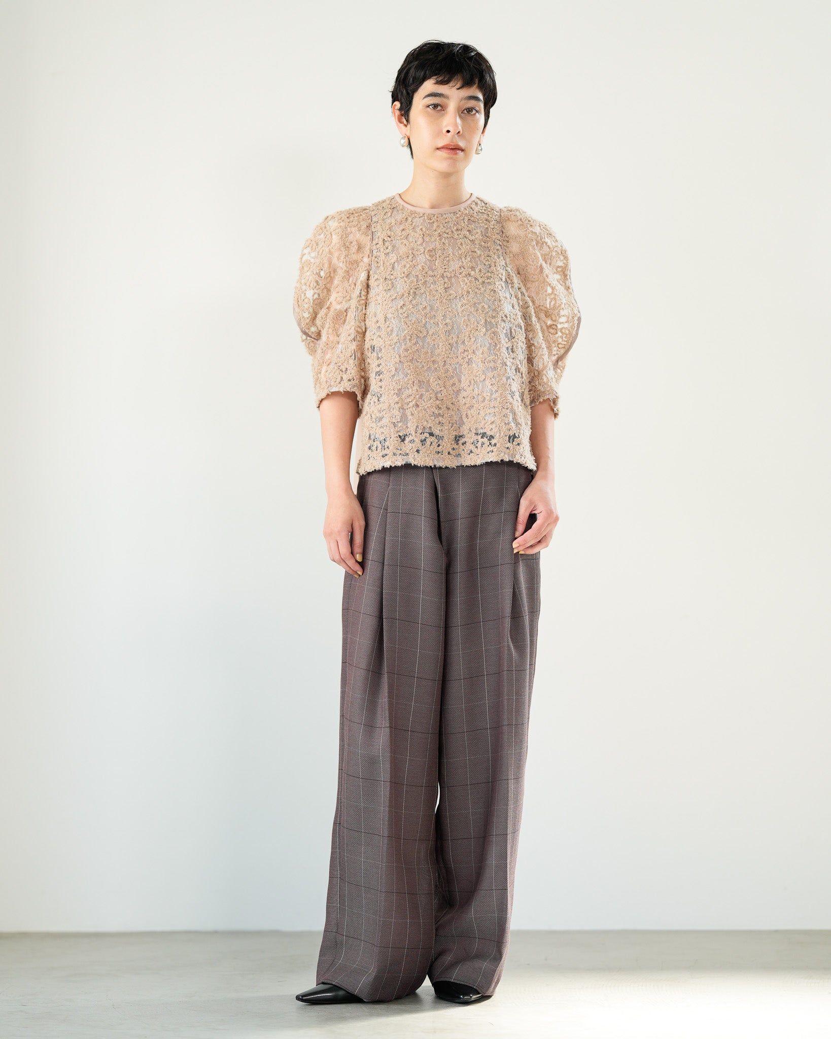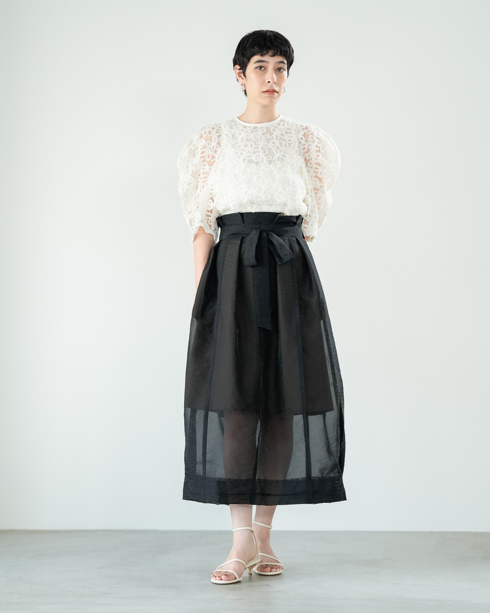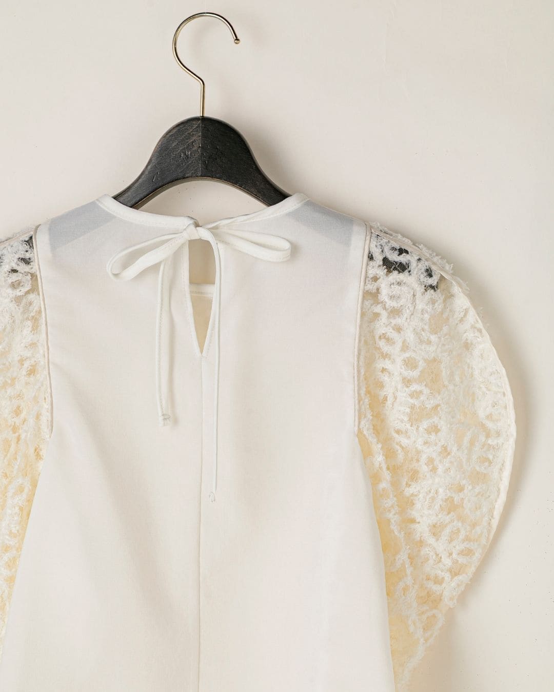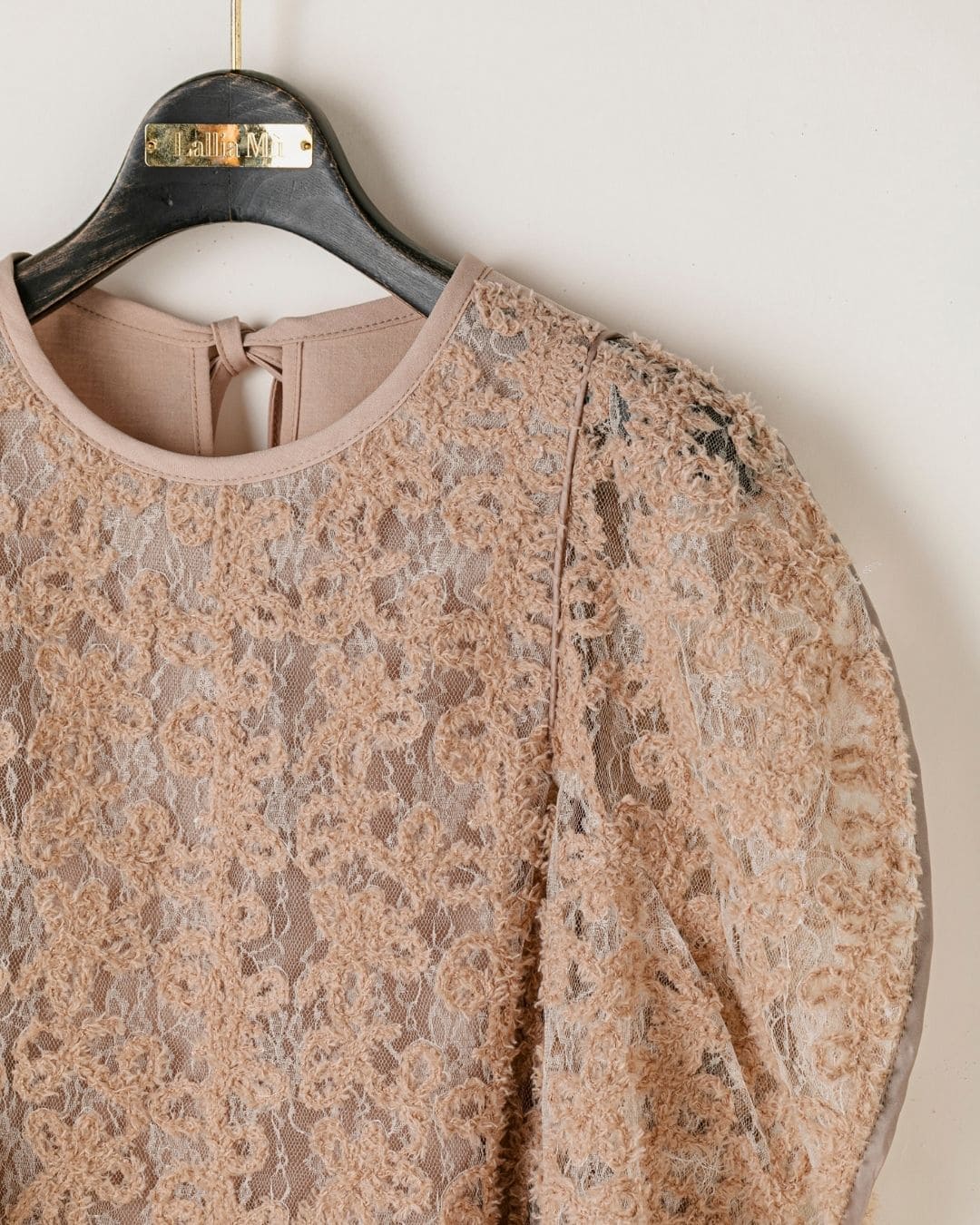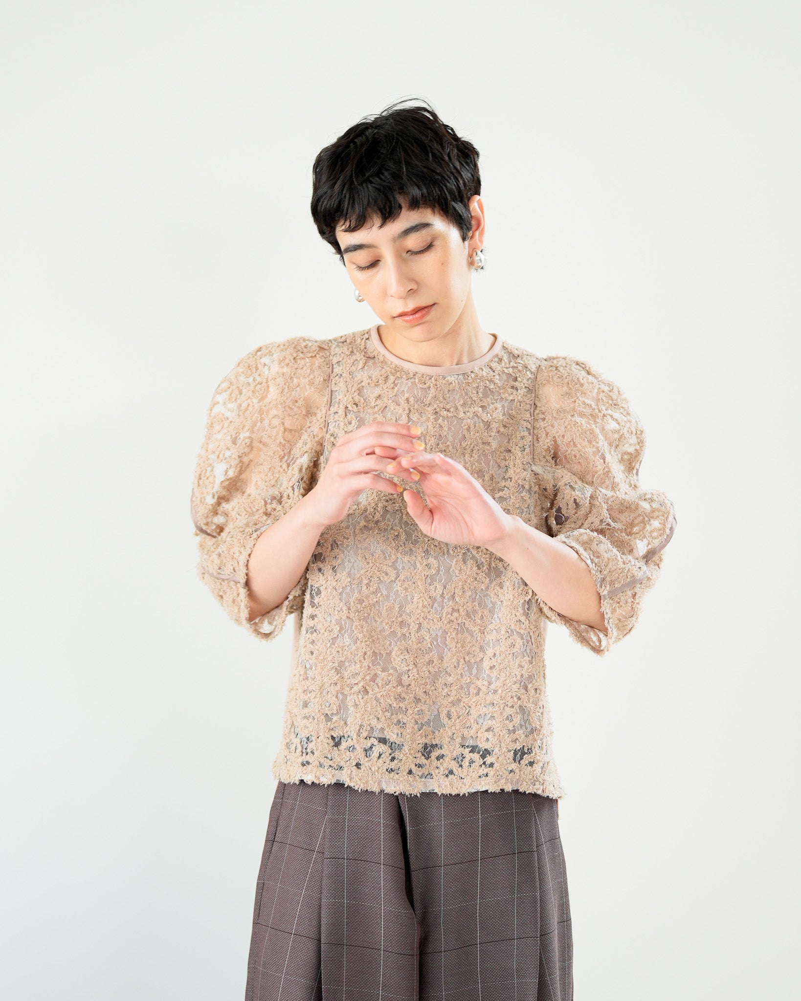 一枚で絵になる春らしくフェミニンな印象のレースブラウス。インパクトのある立体的なモールレースジャガードとアイコニックな袖で甘さとモードさを演出する一枚です。ふんわりと浮かび上がるモールレースが、一枚で主役級の存在感を発揮。大人のフェミニンスタイルに差別化をもたらす構築的なデザインはLallia Múの意匠的な立体裁断から生まれています。合わせるボトム次第でフォーマルにもカジュアルにも対応可能。きれいめボトムと合わせて、オケージョンスタイルにもおすすめです。袖のシルエットをなぞるように丁寧に施されたパイピングが全体を引き締め、甘い中にも大人のこだわりを感じさせる一枚です。