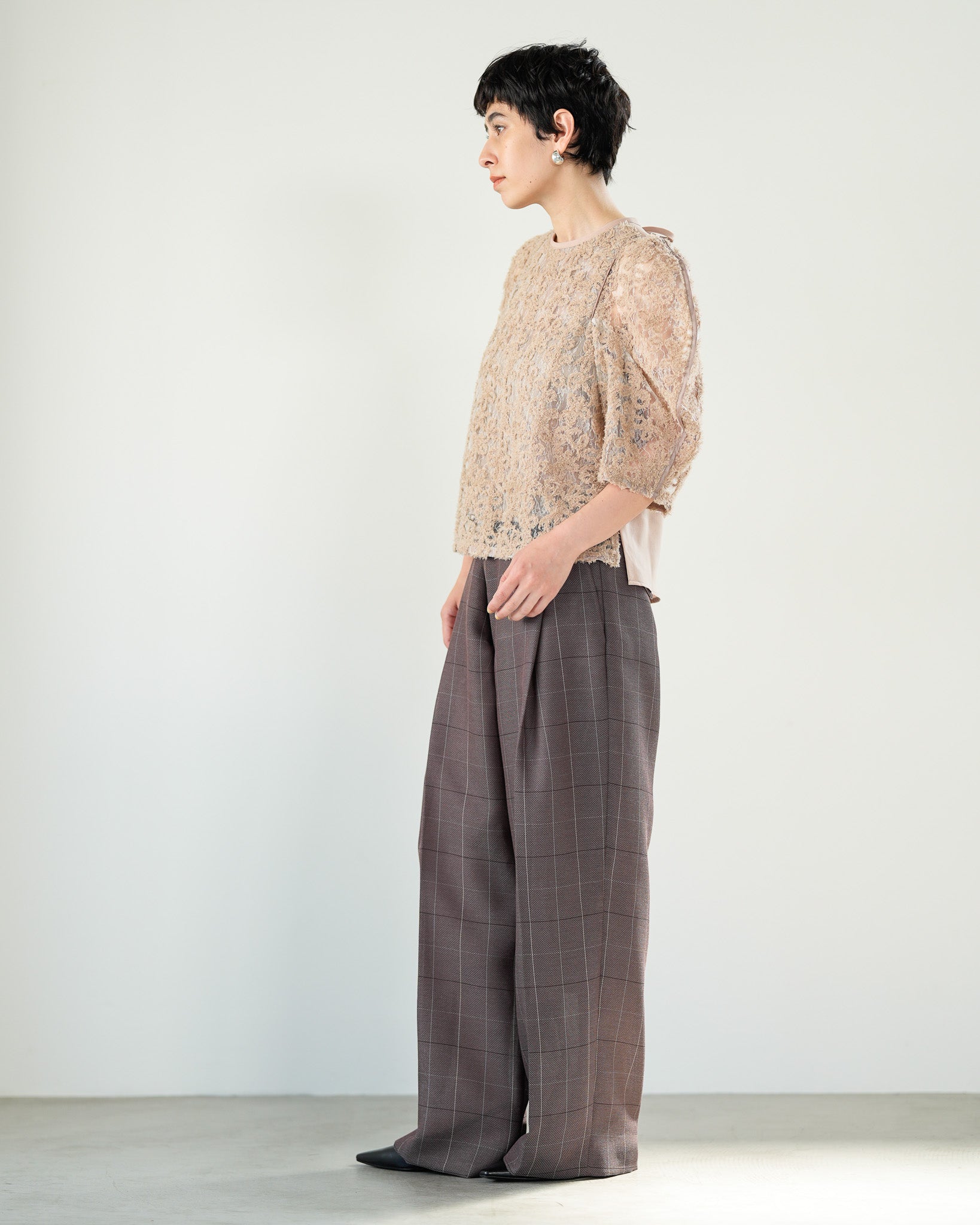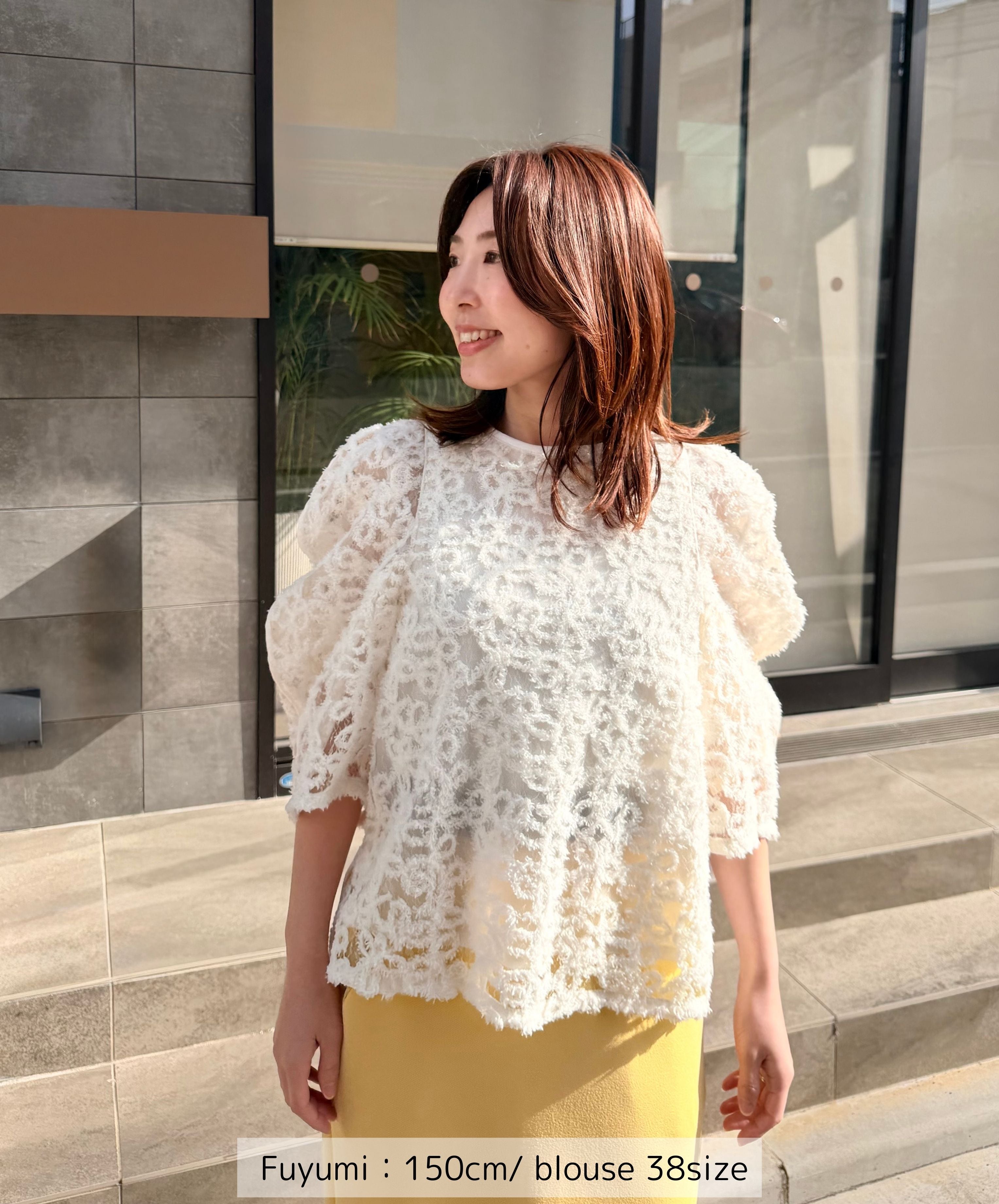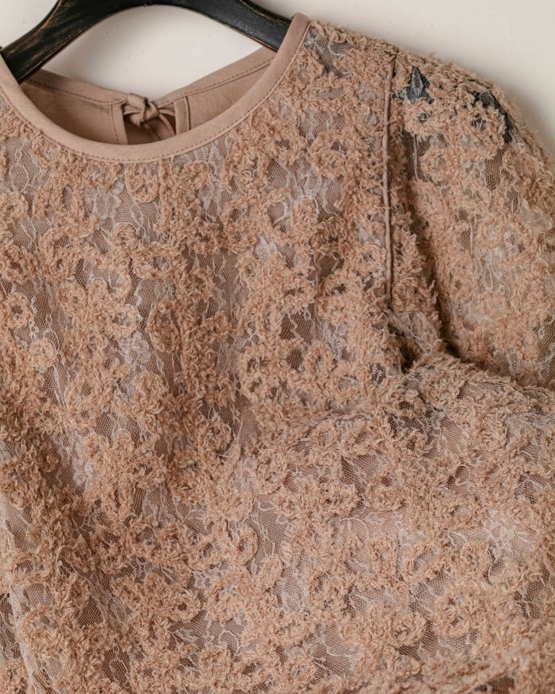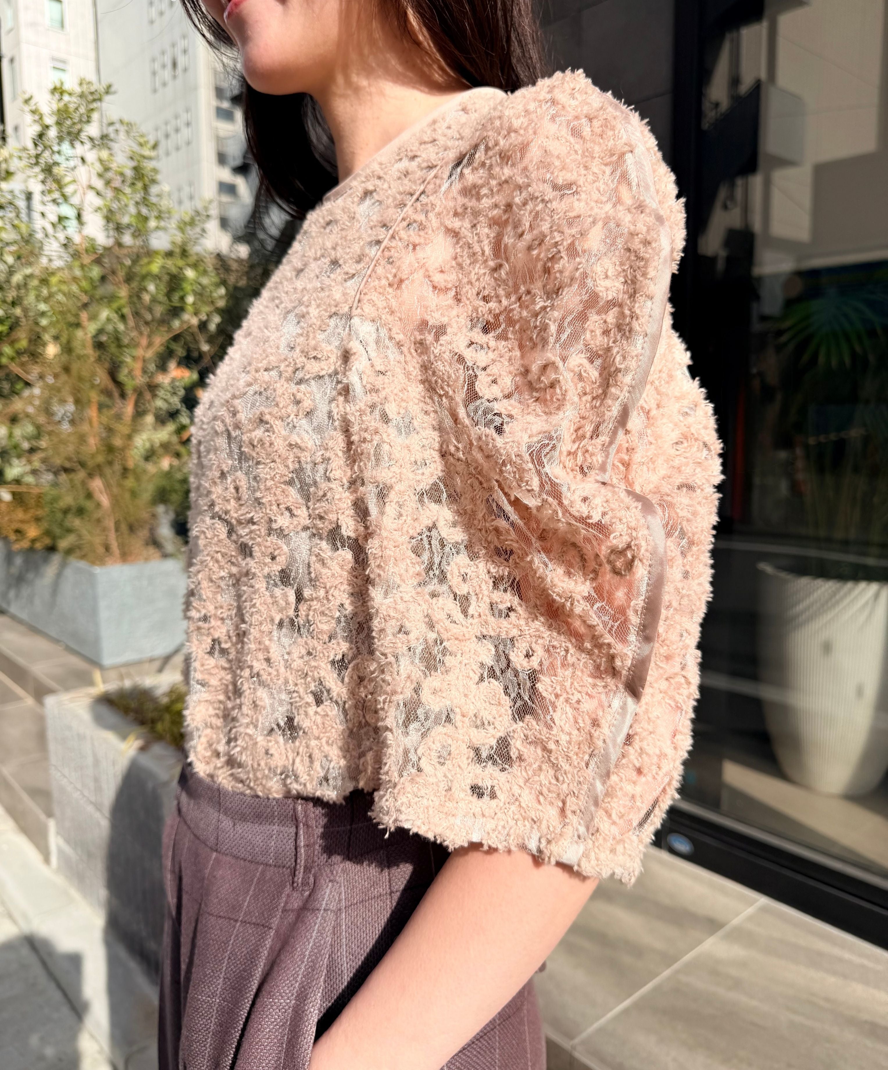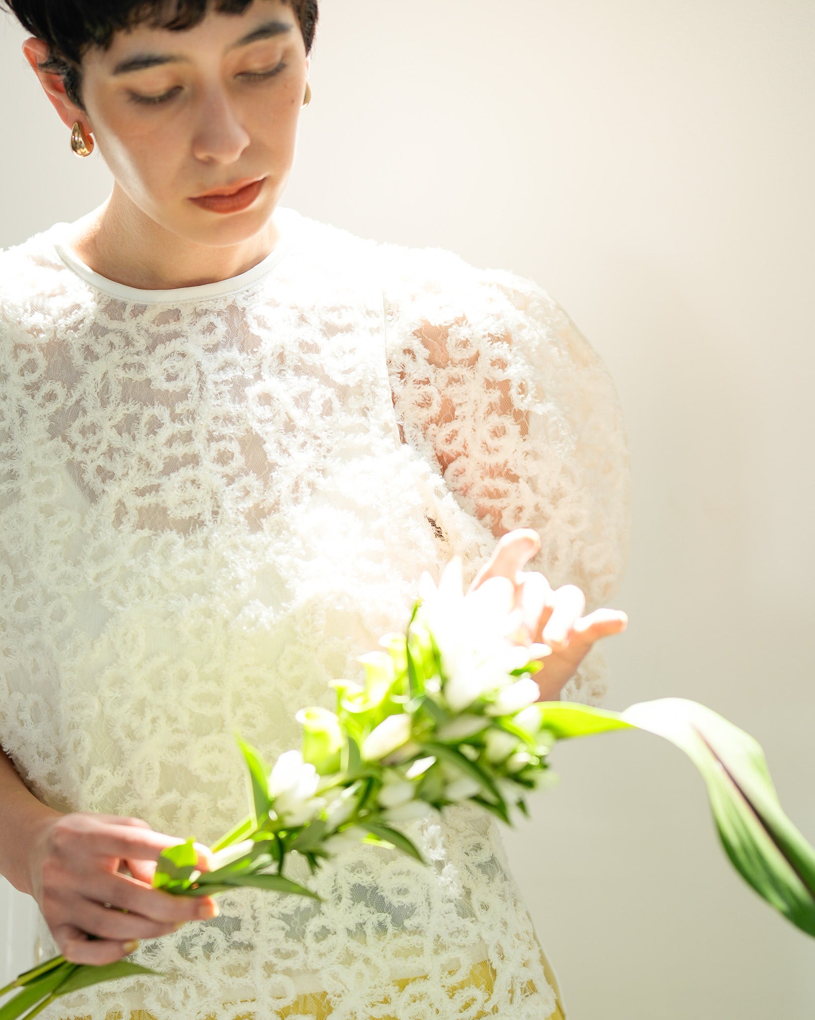 一枚で絵になる春らしくフェミニンな印象のレースブラウス。インパクトのある立体的なモールレースジャガードとアイコニックな袖で甘さとモードさを演出する一枚です。ふんわりと浮かび上がるモールレースが、一枚で主役級の存在感を発揮。大人のフェミニンスタイルに差別化をもたらす構築的なデザインはLallia Múの意匠的な立体裁断から生まれています。合わせるボトム次第でフォーマルにもカジュアルにも対応可能。きれいめボトムと合わせて、オケージョンスタイルにもおすすめです。袖のシルエットをなぞるように丁寧に施されたパイピングが全体を引き締め、甘い中にも大人のこだわりを感じさせる一枚です。