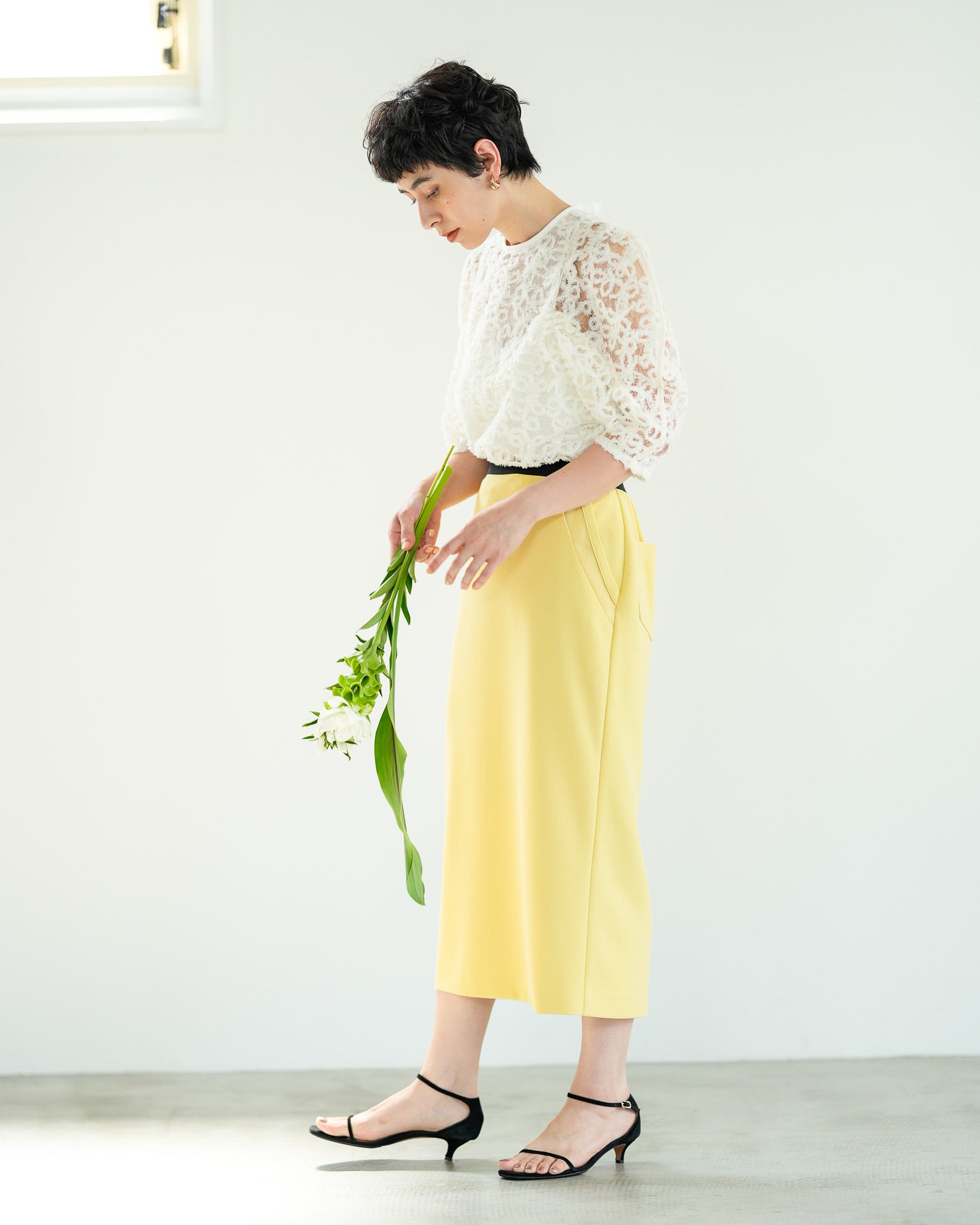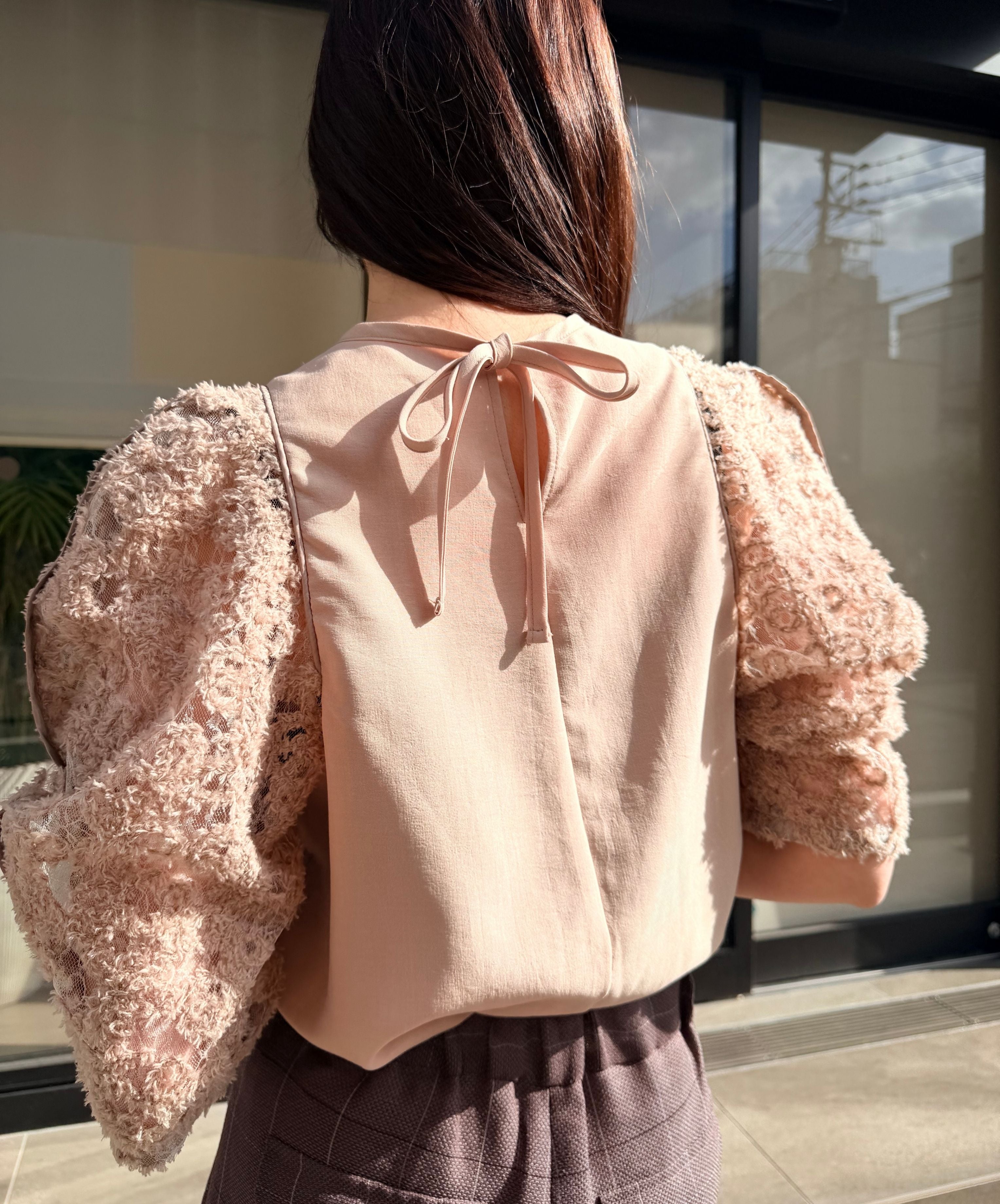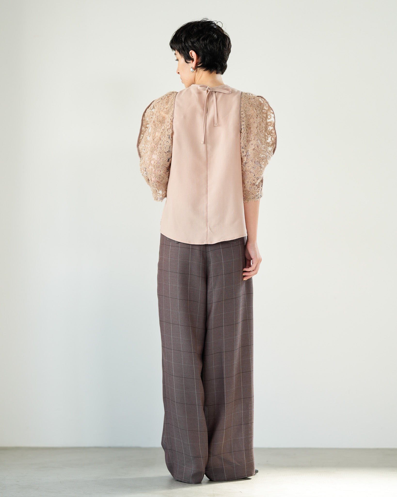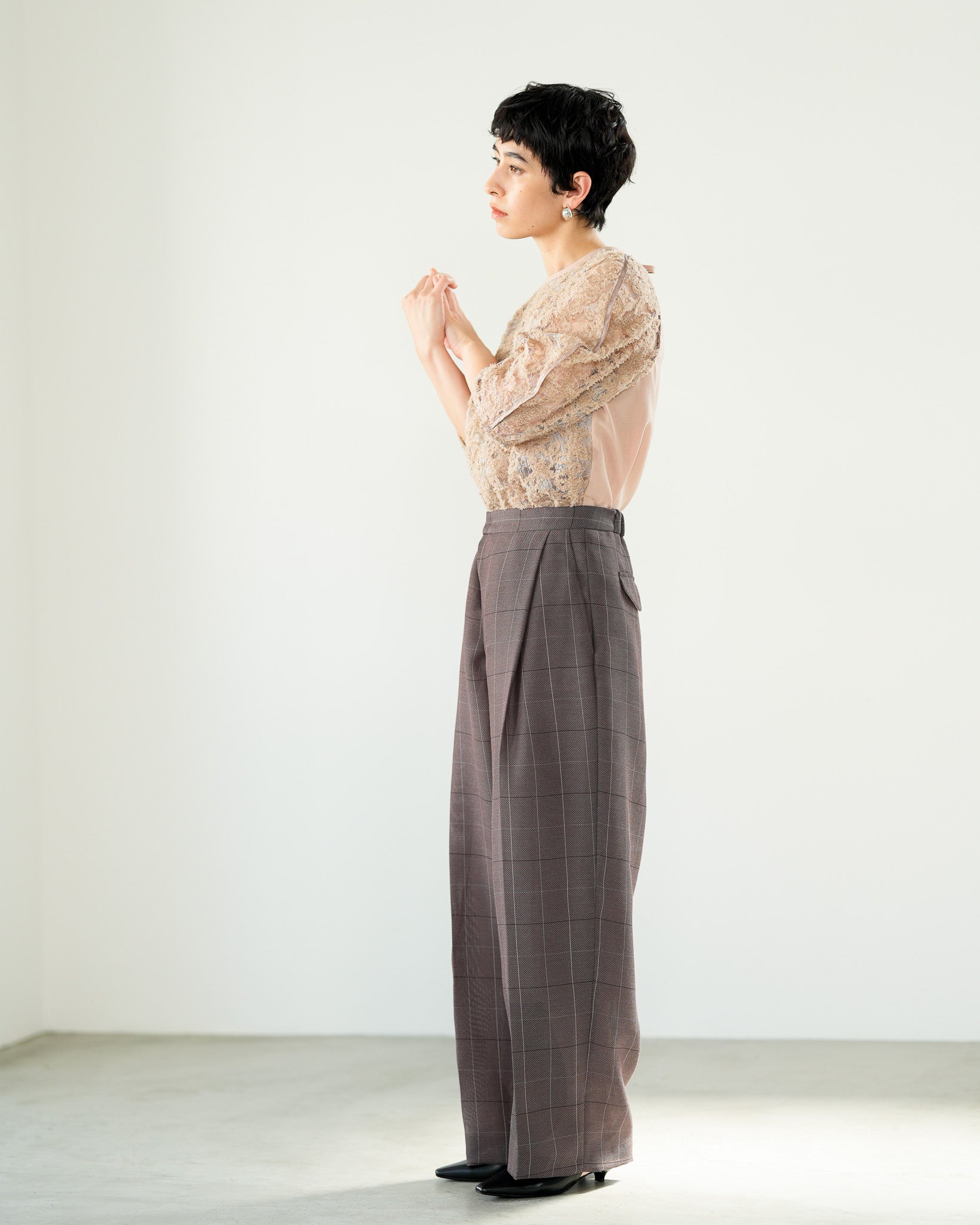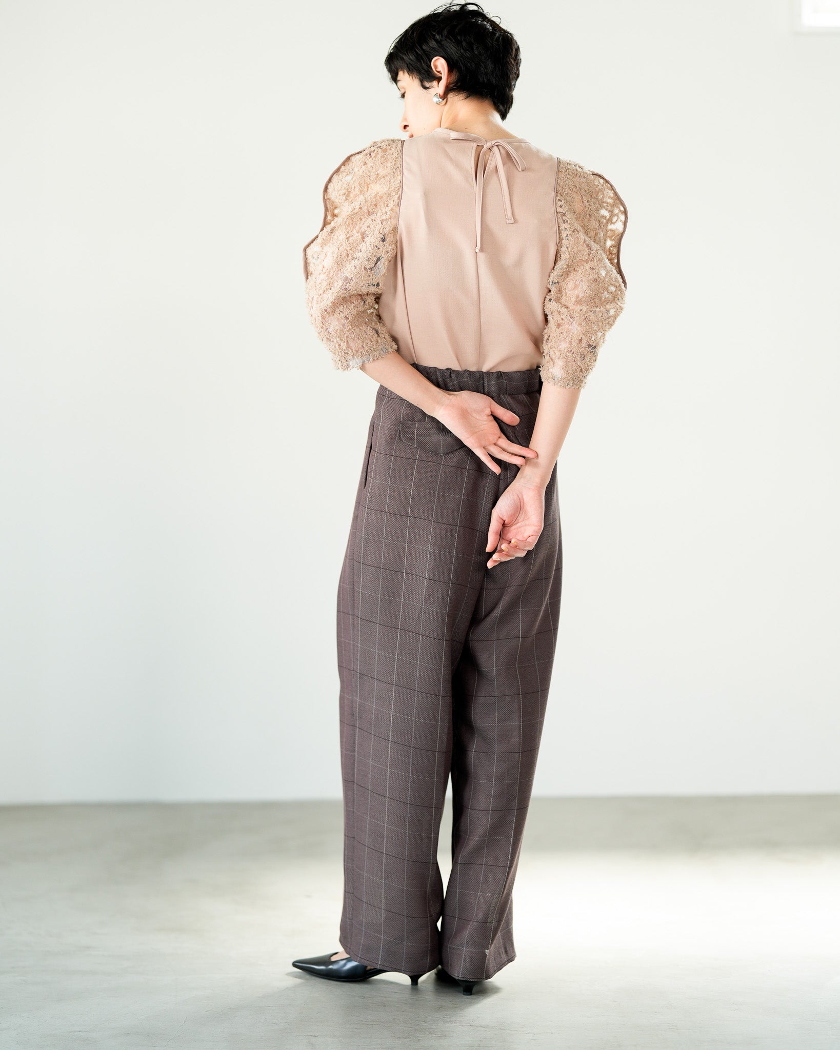 一枚で絵になる春らしくフェミニンな印象のレースブラウス。インパクトのある立体的なモールレースジャガードとアイコニックな袖で甘さとモードさを演出する一枚です。ふんわりと浮かび上がるモールレースが、一枚で主役級の存在感を発揮。大人のフェミニンスタイルに差別化をもたらす構築的なデザインはLallia Múの意匠的な立体裁断から生まれています。合わせるボトム次第でフォーマルにもカジュアルにも対応可能。きれいめボトムと合わせて、オケージョンスタイルにもおすすめです。袖のシルエットをなぞるように丁寧に施されたパイピングが全体を引き締め、甘い中にも大人のこだわりを感じさせる一枚です。