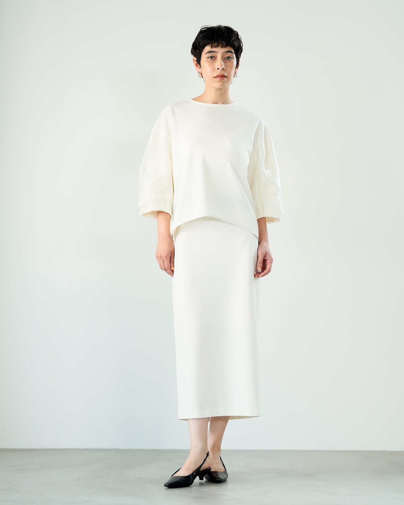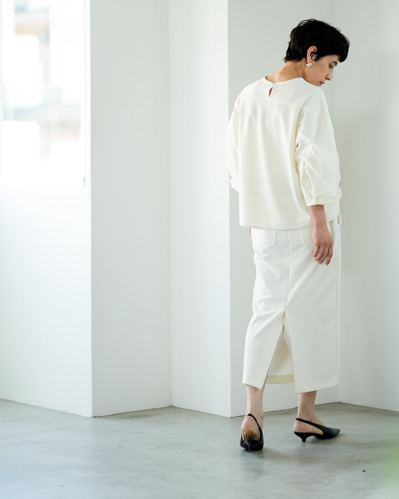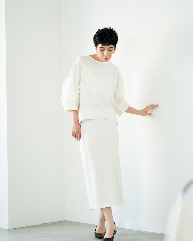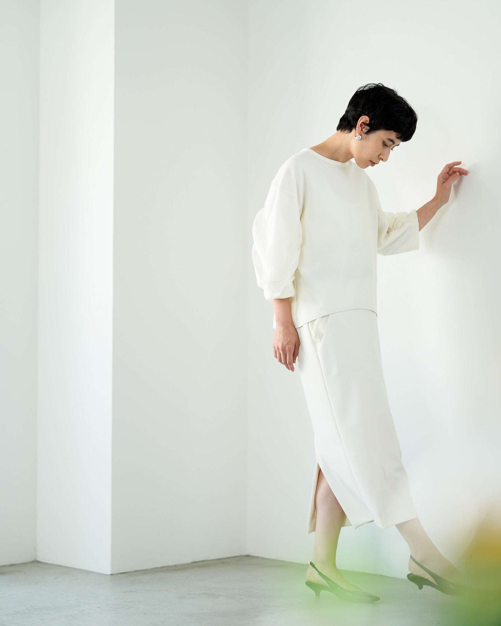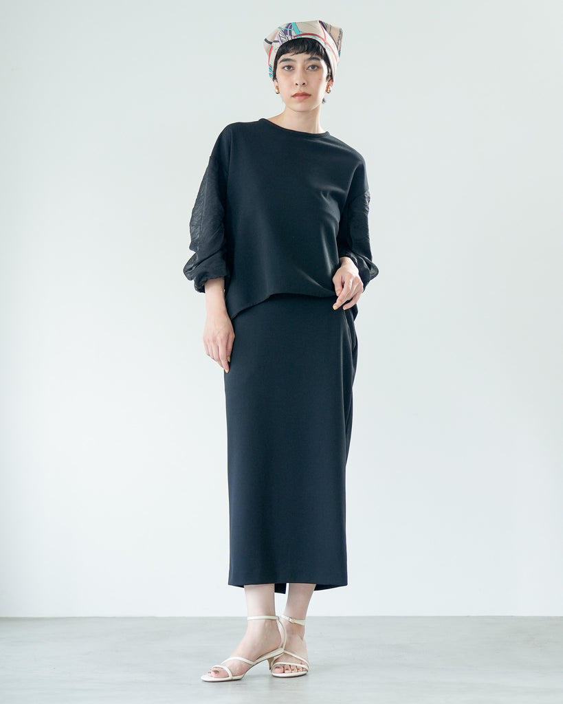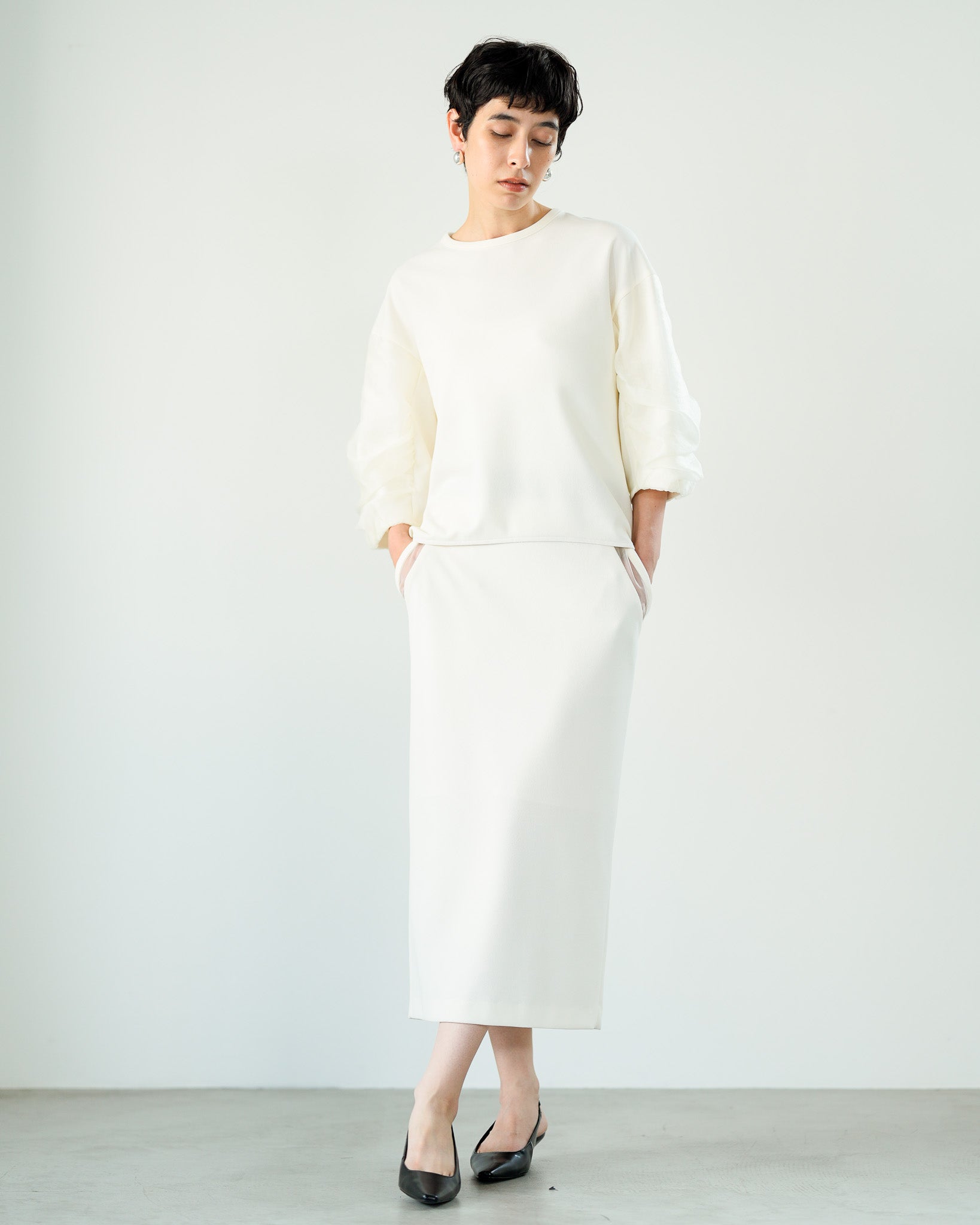 ジョーゼットとツイルを掛け合わせたような新しいダンボール素材を使用したプルオーバートップス。従来のダンボール生地では両立し得なかった軽さと膨らみを絶妙なバランスで融合した新素材です。ストレッチ性に優れ、適度なハリと毛羽のない表面でジャージーならではの楽な着心地と綺麗見えを両立します。オフも透けが気になりにくく、オフィスシーンやフォーマルな場にもおすすめです。同素材のスカートと合わせてセットアップとしても着用いただけます。