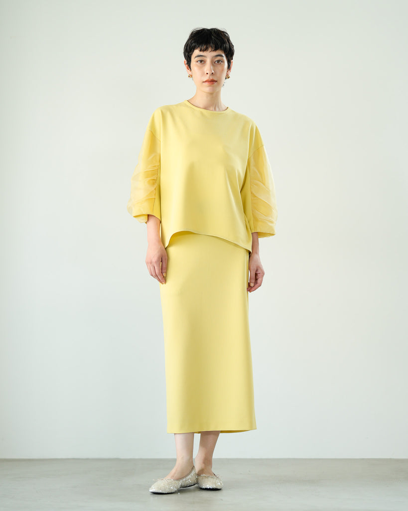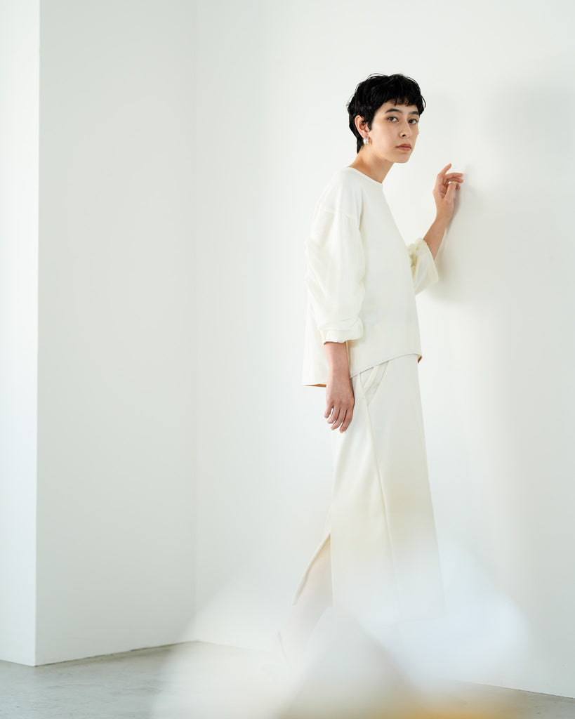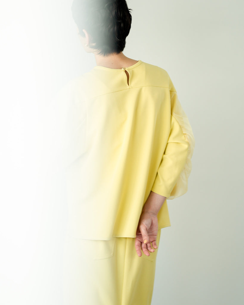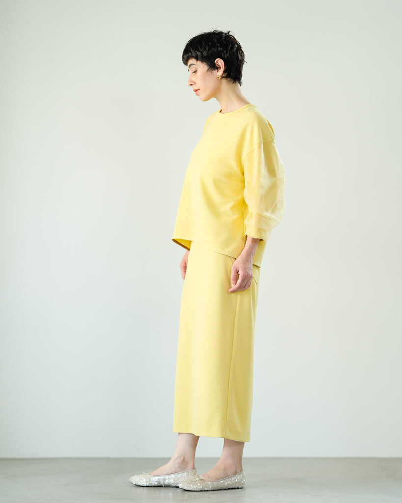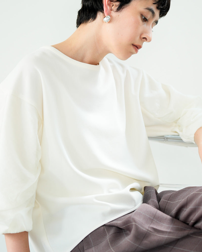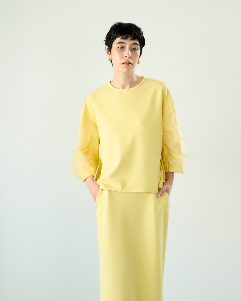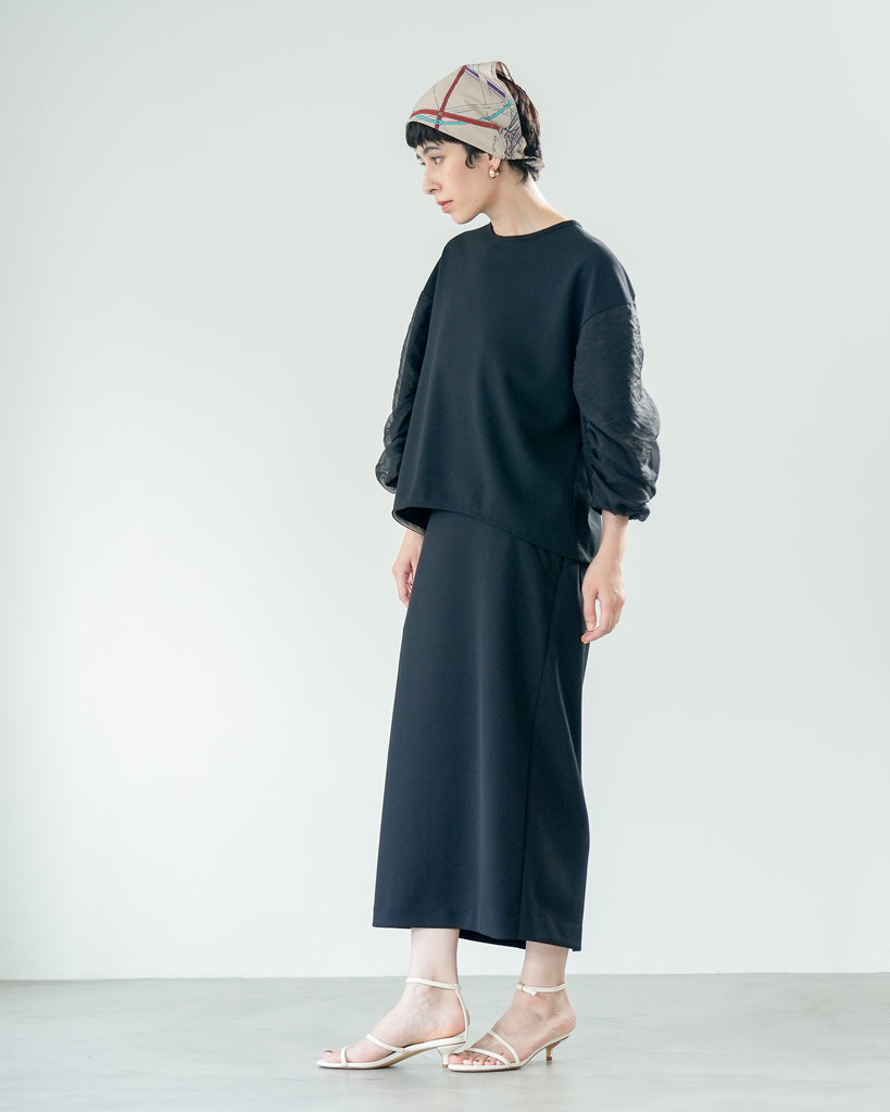 ジョーゼットとツイルを掛け合わせたような新しいダンボール素材を使用したプルオーバートップス。従来のダンボール生地では両立し得なかった軽さと膨らみを絶妙なバランスで融合した新素材です。ストレッチ性に優れ、適度なハリと毛羽のない表面でジャージーならではの楽な着心地と綺麗見えを両立します。オフも透けが気になりにくく、オフィスシーンやフォーマルな場にもおすすめです。同素材のスカートと合わせてセットアップとしても着用いただけます。