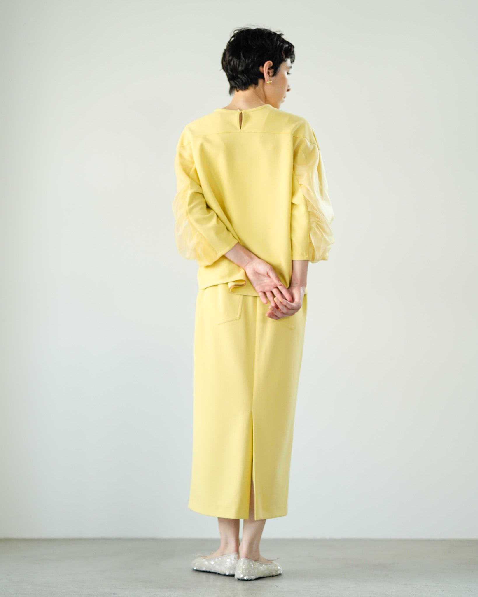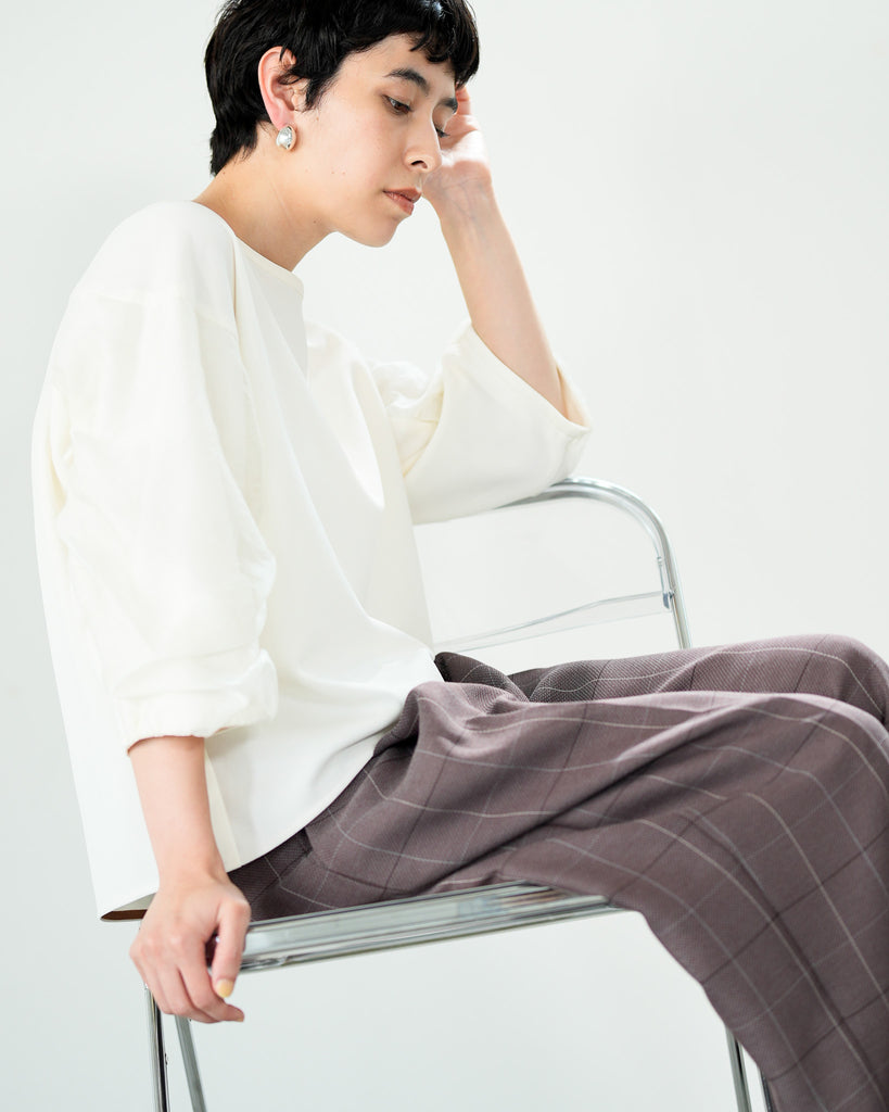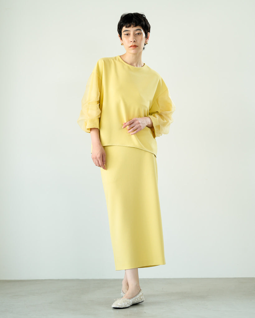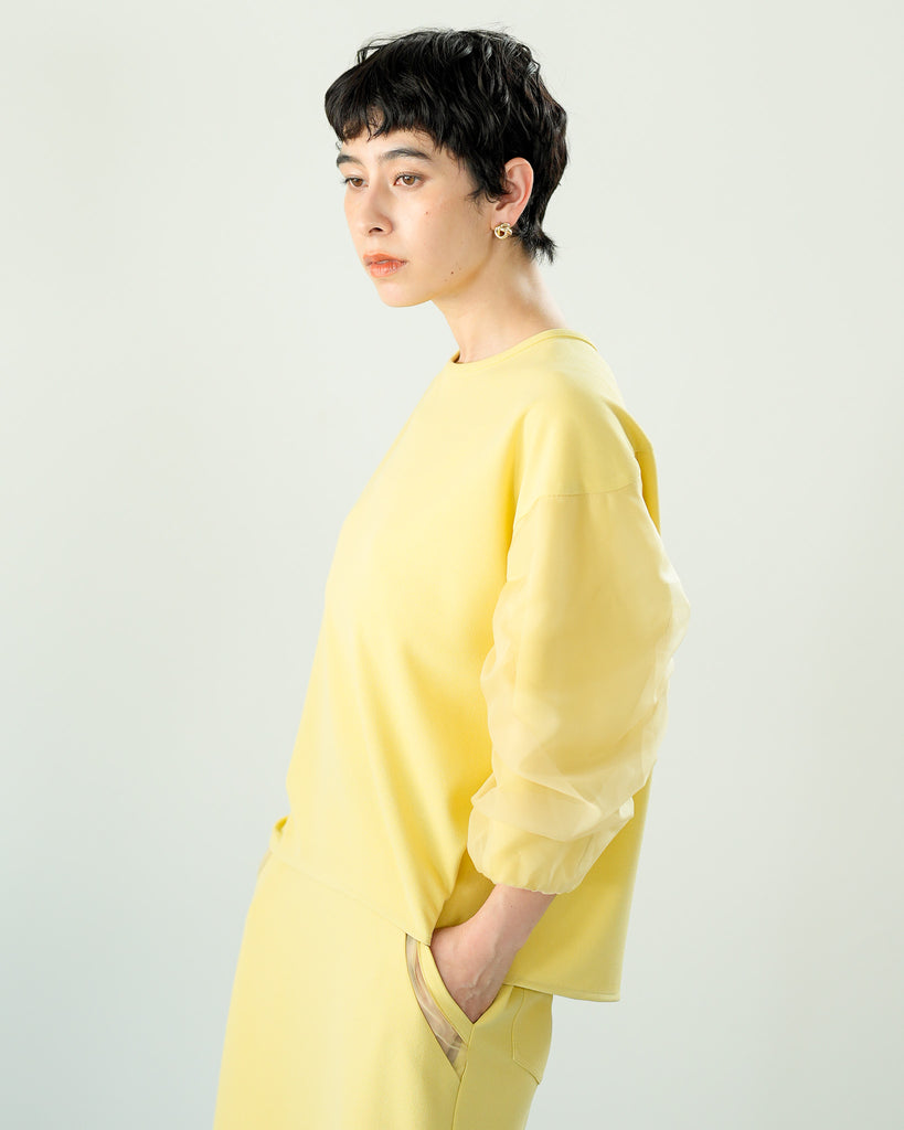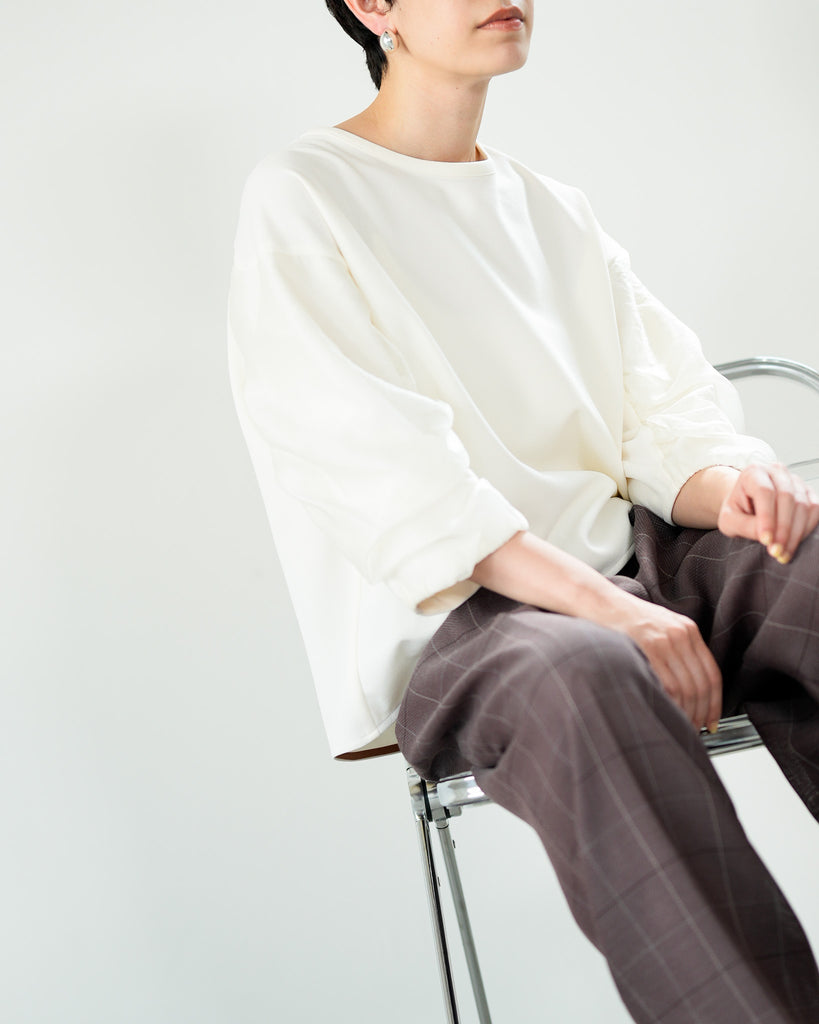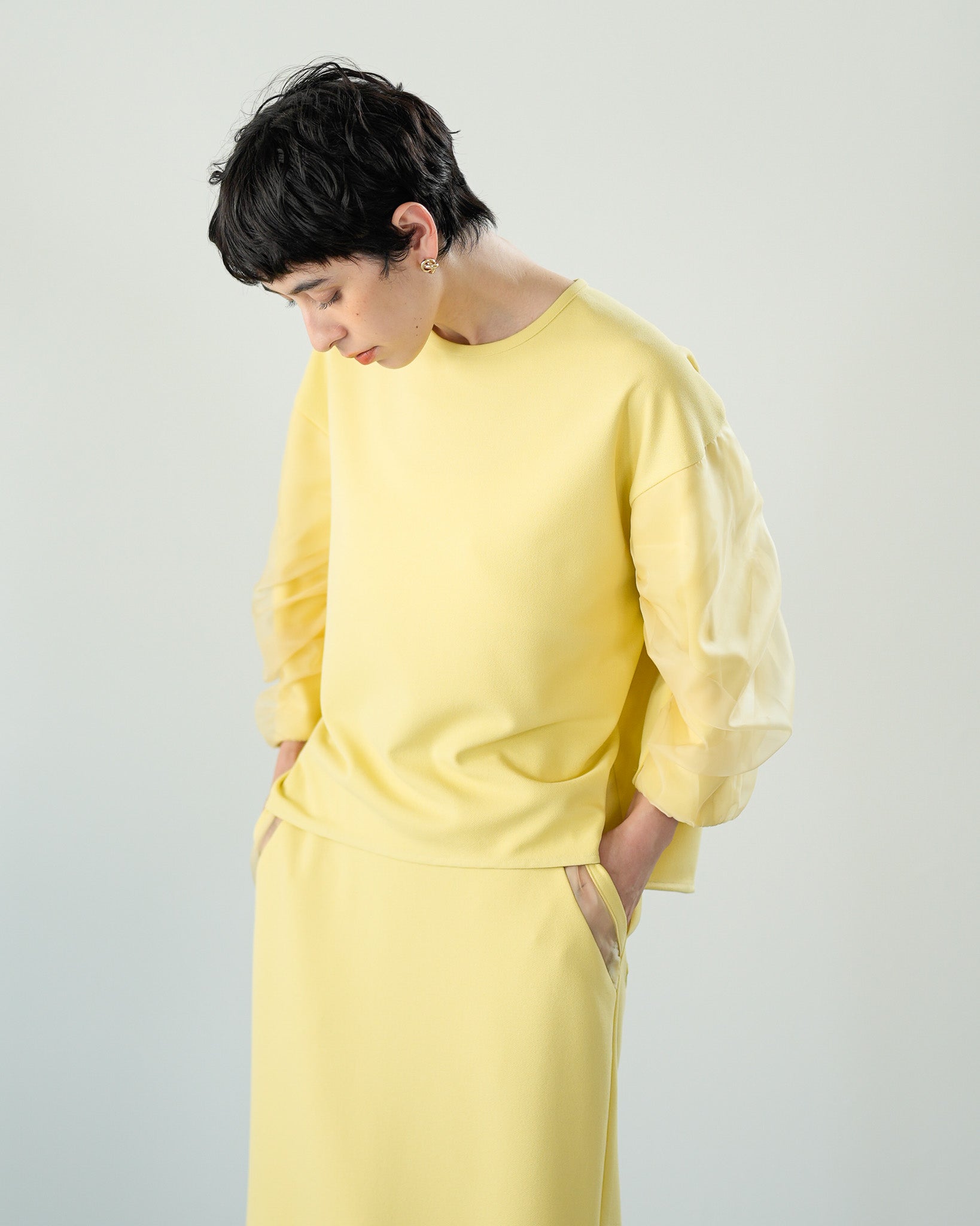 ジョーゼットとツイルを掛け合わせたような新しいダンボール素材を使用したプルオーバートップス。従来のダンボール生地では両立し得なかった軽さと膨らみを絶妙なバランスで融合した新素材です。ストレッチ性に優れ、適度なハリと毛羽のない表面でジャージーならではの楽な着心地と綺麗見えを両立します。オフも透けが気になりにくく、オフィスシーンやフォーマルな場にもおすすめです。同素材のスカートと合わせてセットアップとしても着用いただけます。