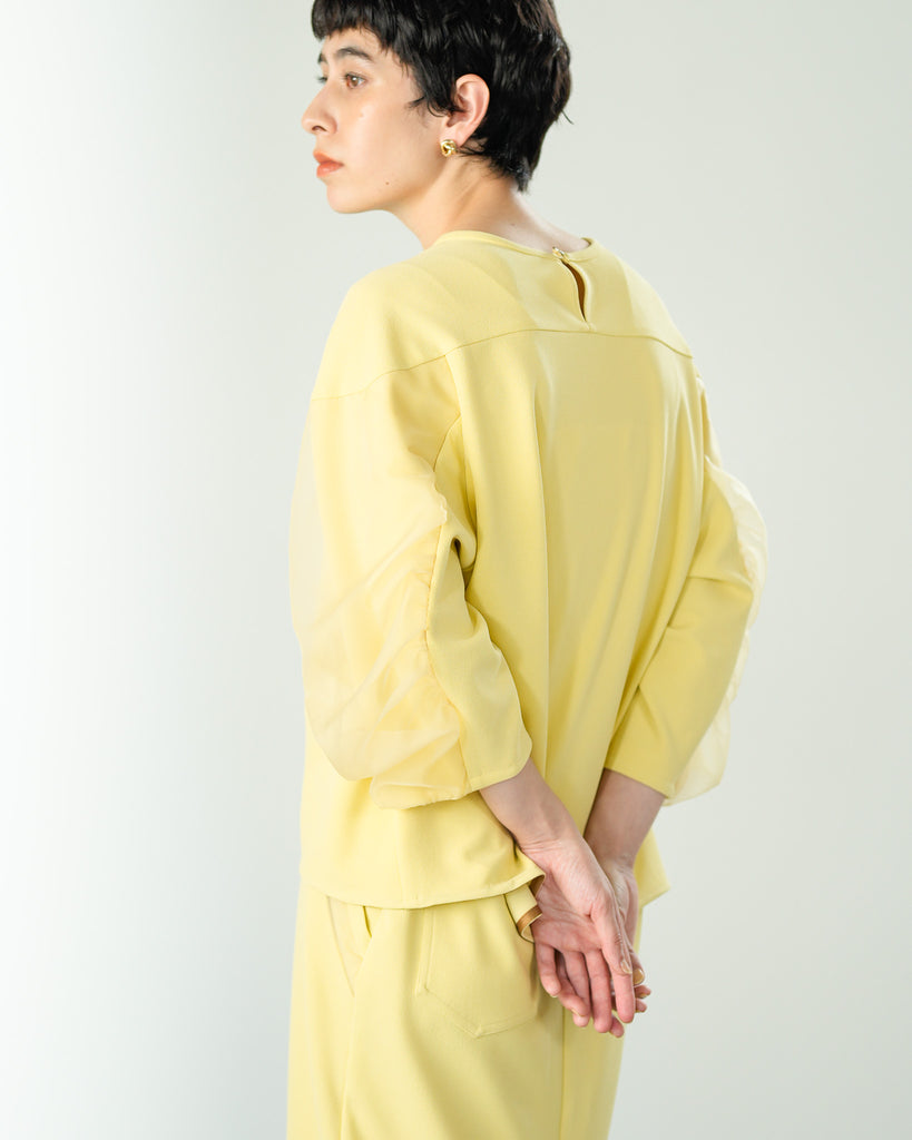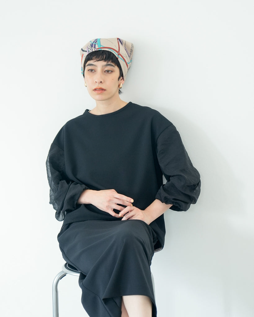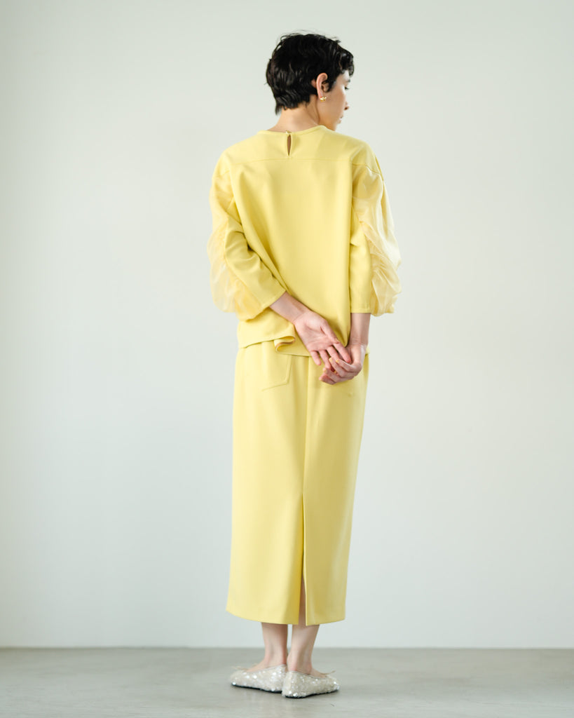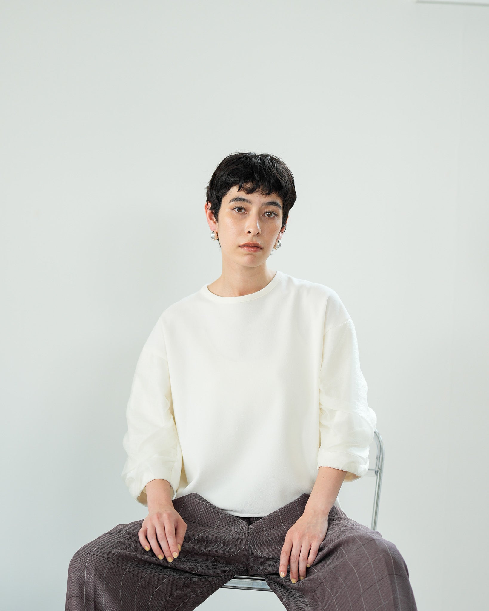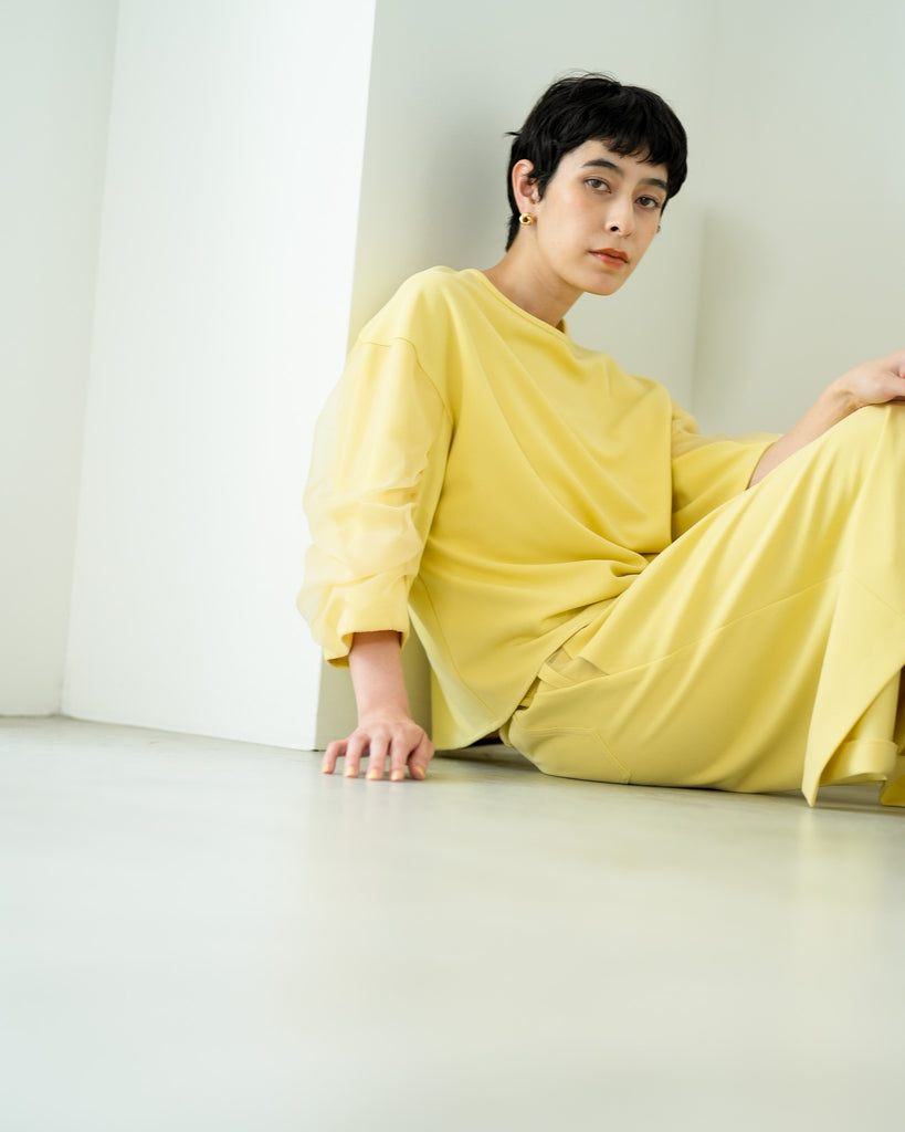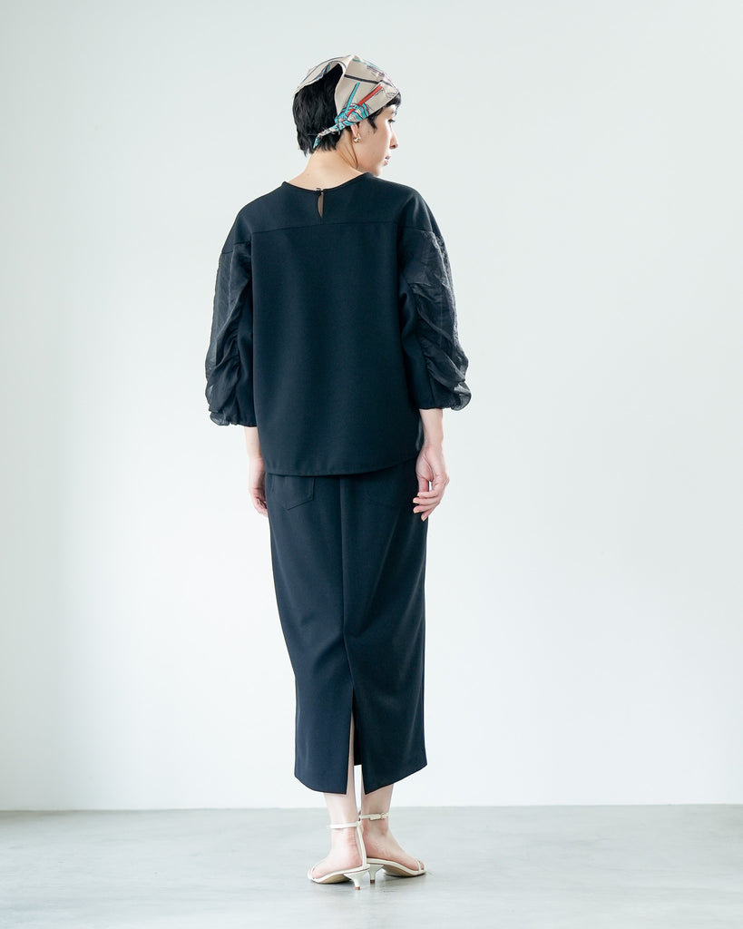 ジョーゼットとツイルを掛け合わせたような新しいダンボール素材を使用したプルオーバートップス。従来のダンボール生地では両立し得なかった軽さと膨らみを絶妙なバランスで融合した新素材です。ストレッチ性に優れ、適度なハリと毛羽のない表面でジャージーならではの楽な着心地と綺麗見えを両立します。オフも透けが気になりにくく、オフィスシーンやフォーマルな場にもおすすめです。同素材のスカートと合わせてセットアップとしても着用いただけます。