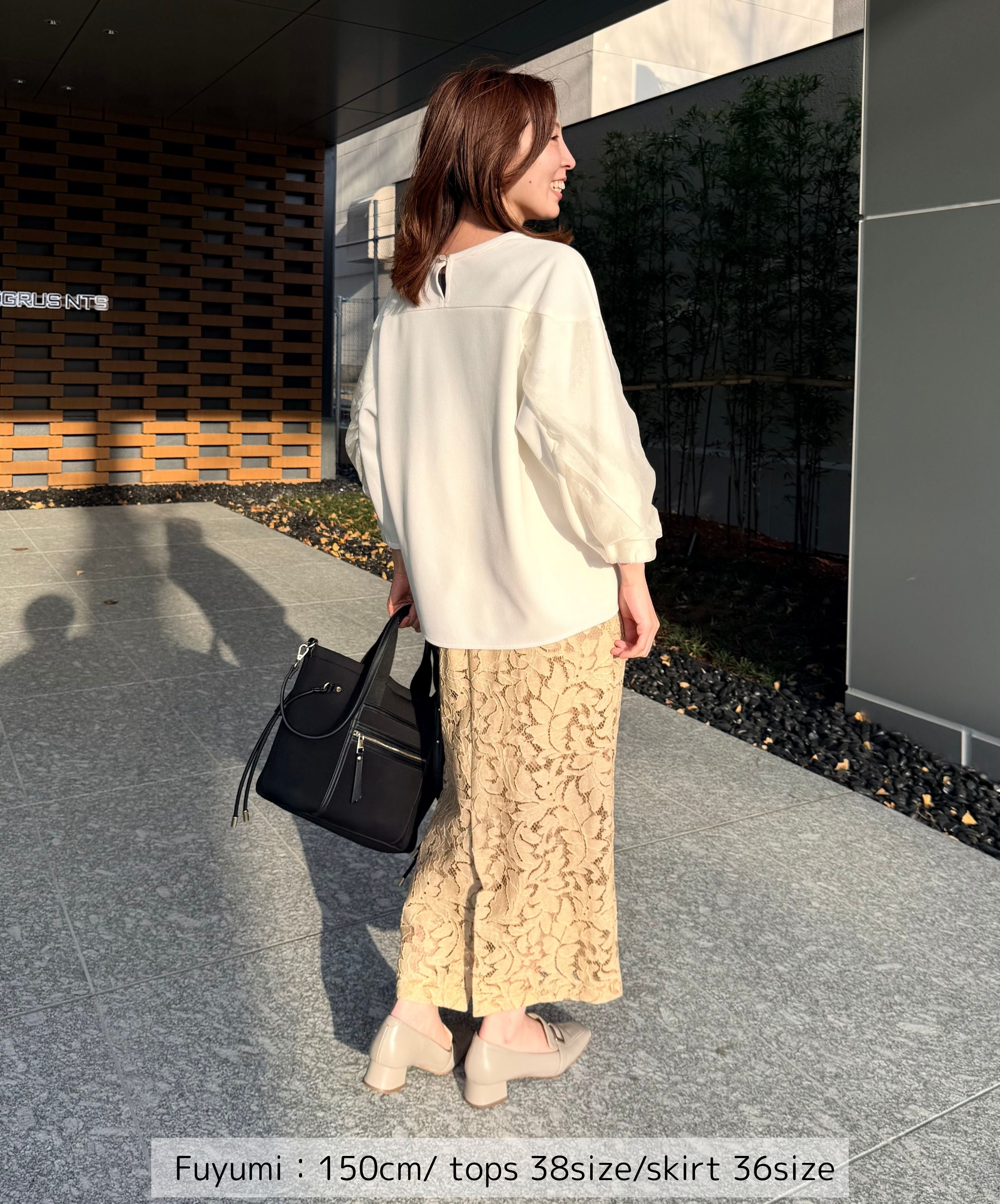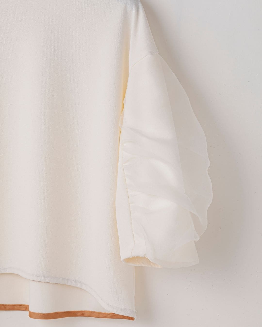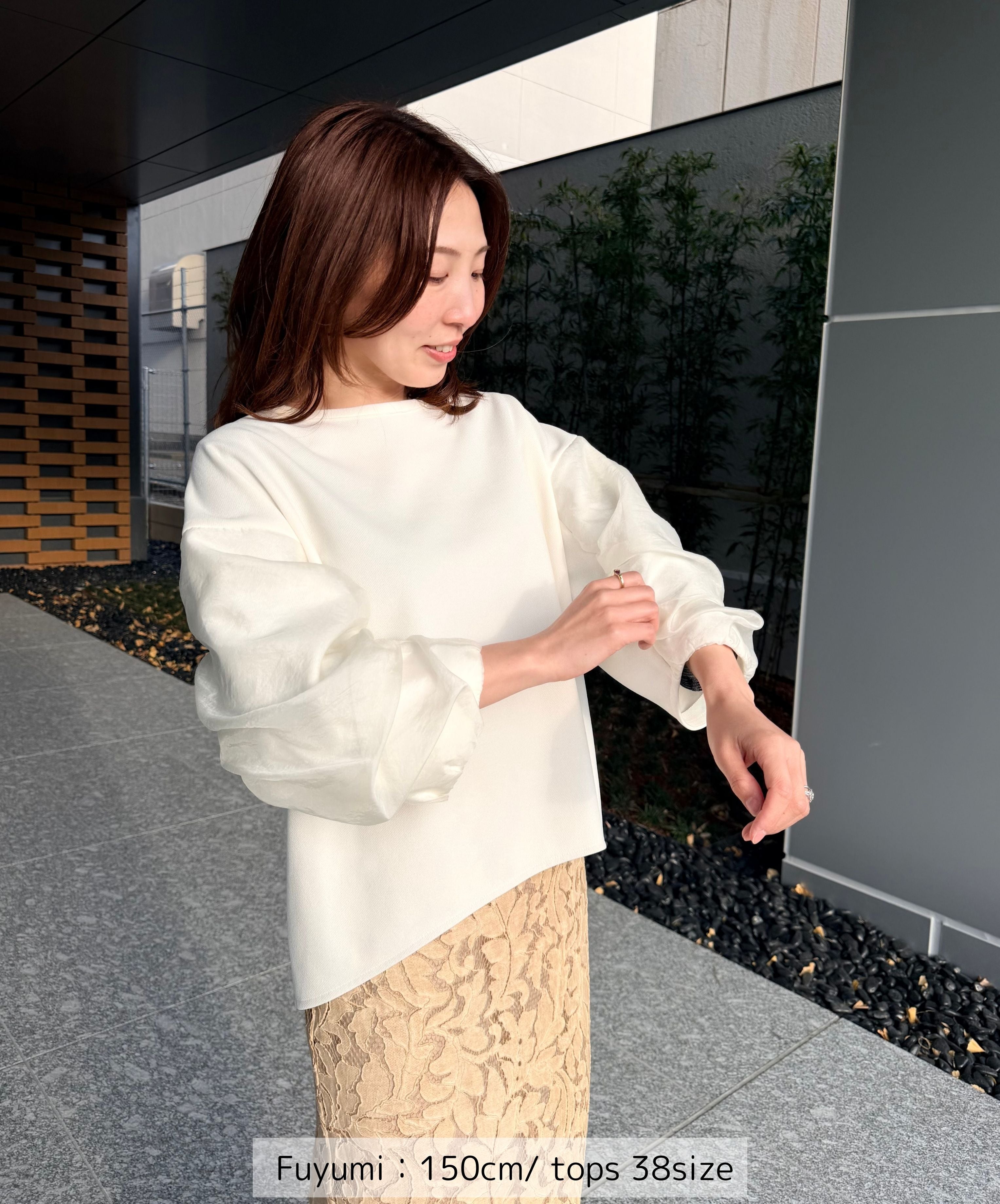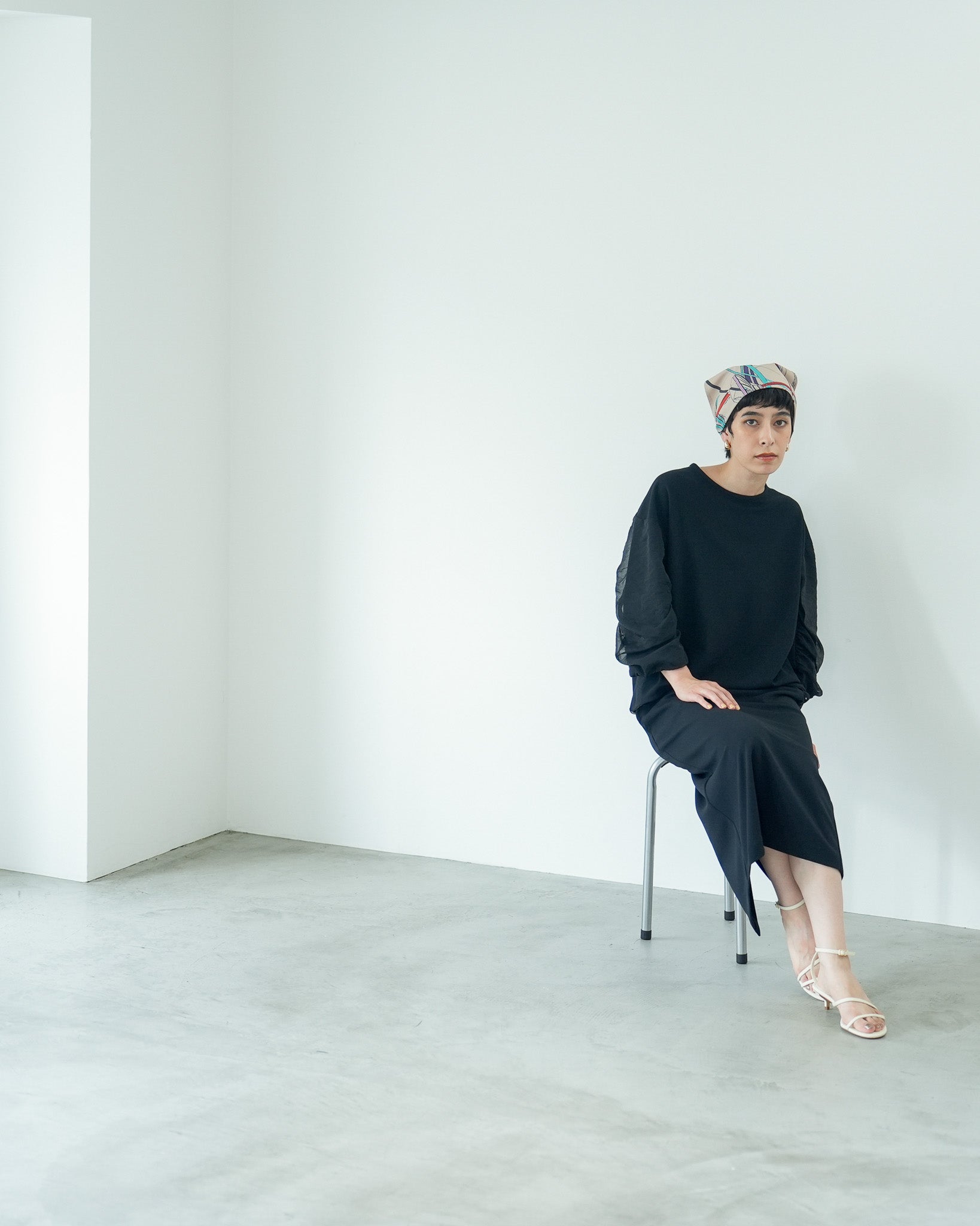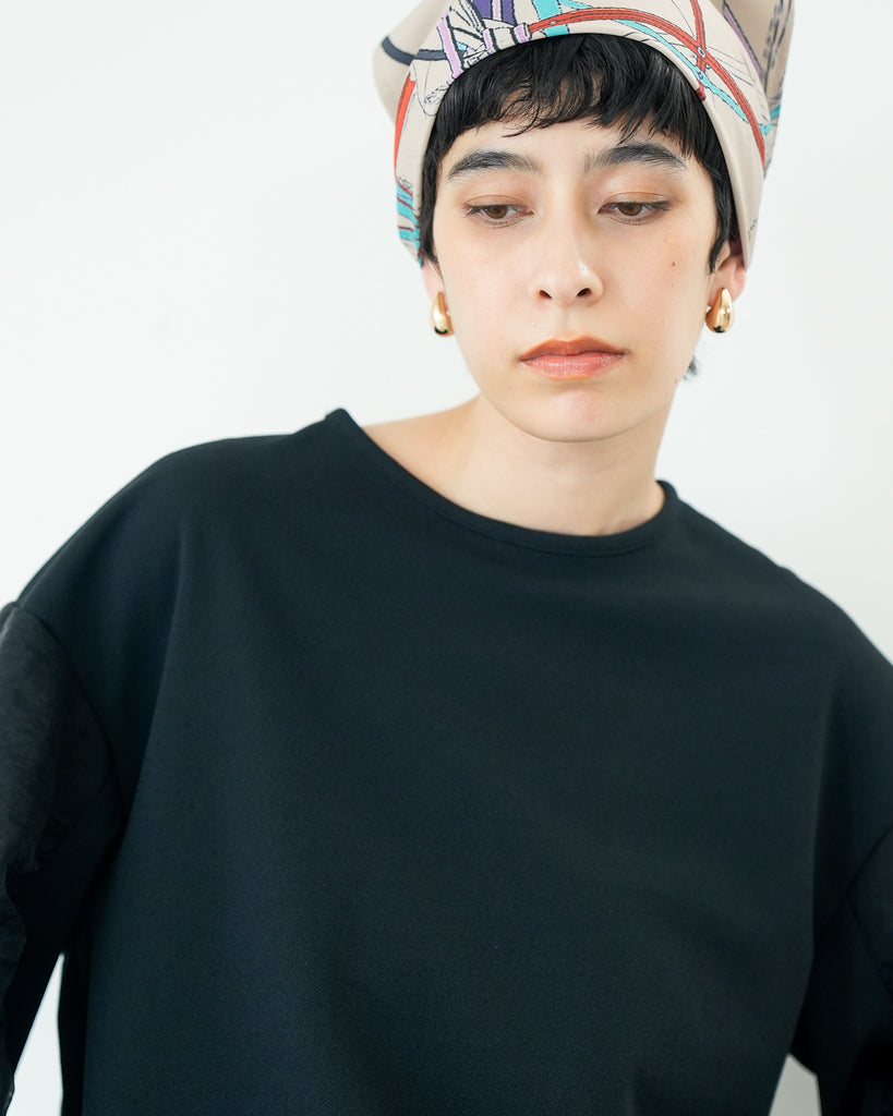 ジョーゼットとツイルを掛け合わせたような新しいダンボール素材を使用したプルオーバートップス。従来のダンボール生地では両立し得なかった軽さと膨らみを絶妙なバランスで融合した新素材です。ストレッチ性に優れ、適度なハリと毛羽のない表面でジャージーならではの楽な着心地と綺麗見えを両立します。オフも透けが気になりにくく、オフィスシーンやフォーマルな場にもおすすめです。同素材のスカートと合わせてセットアップとしても着用いただけます。