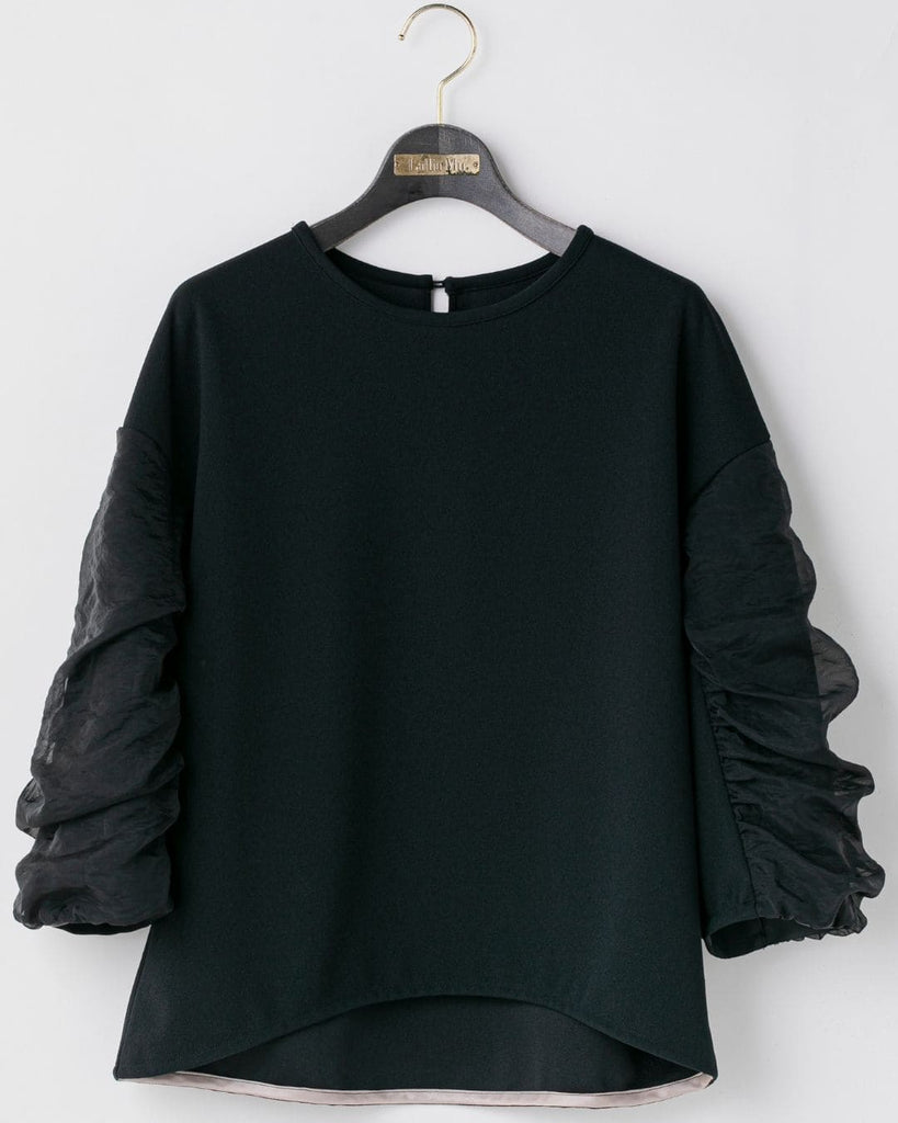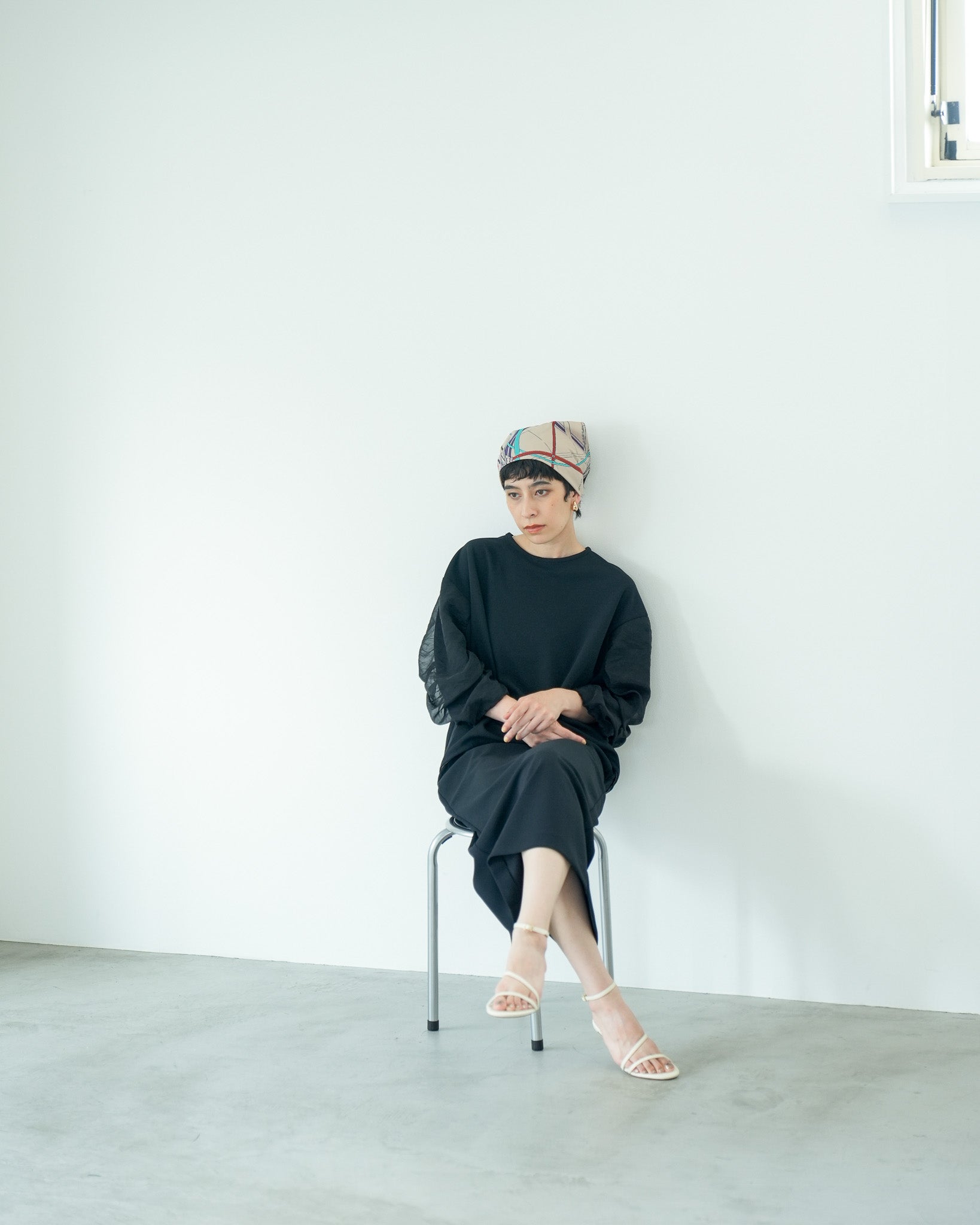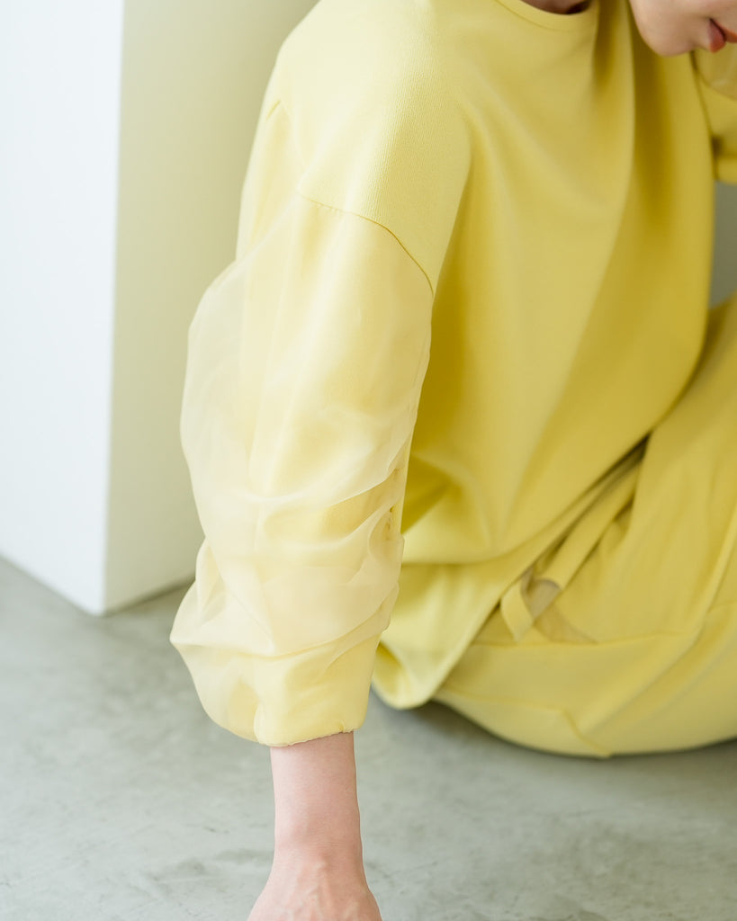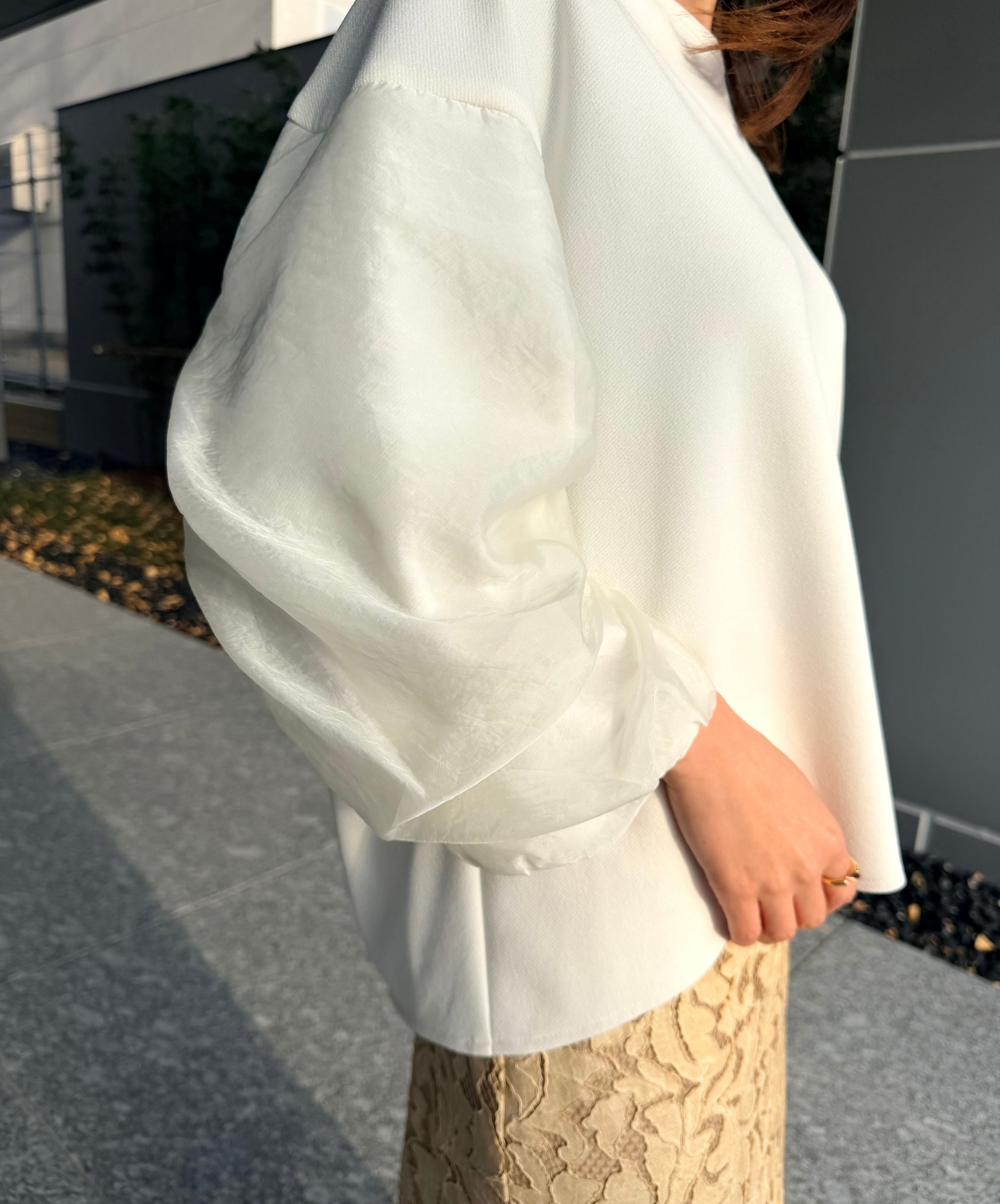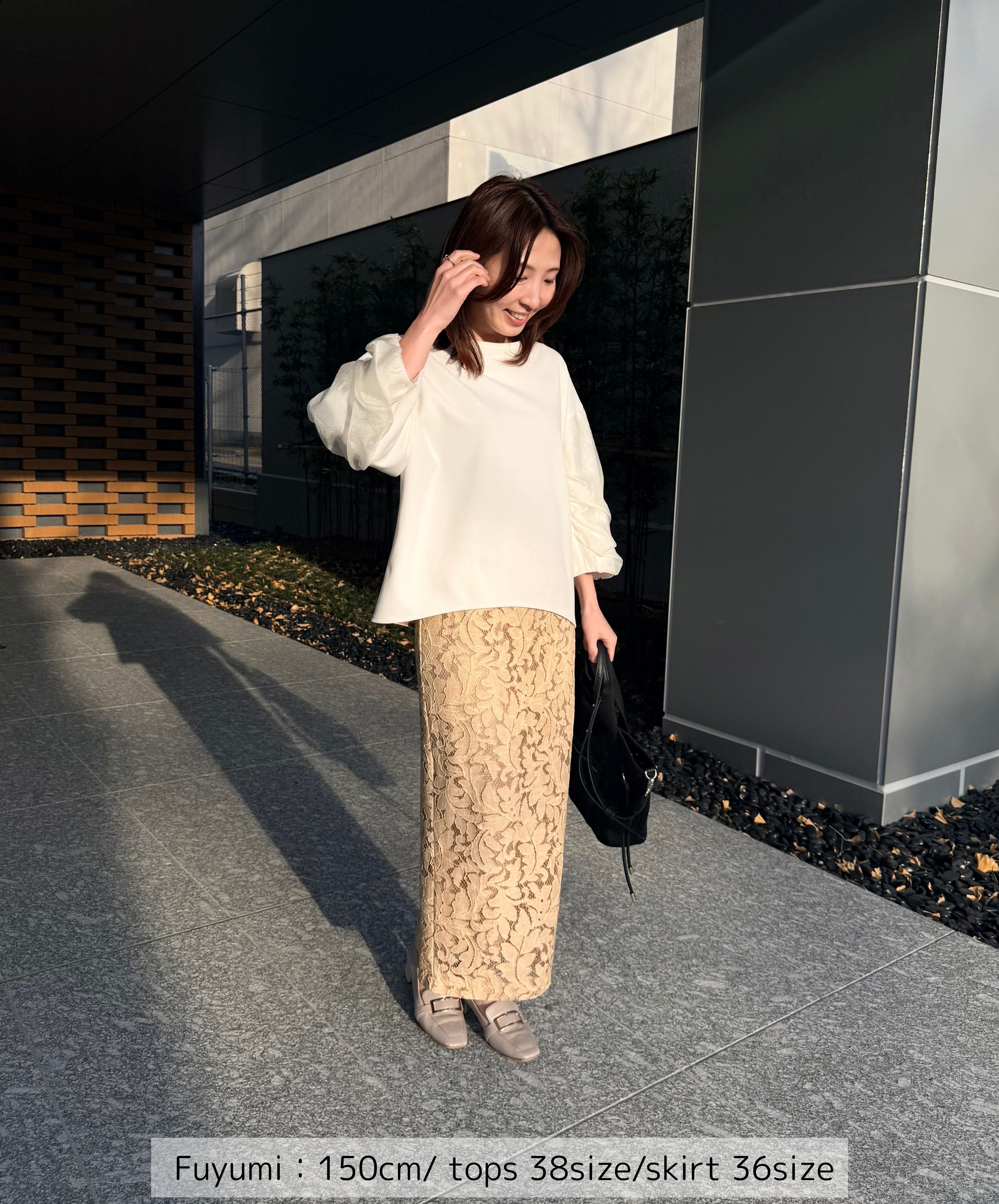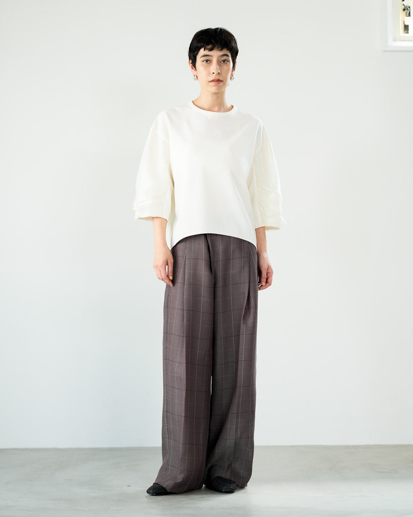 ジョーゼットとツイルを掛け合わせたような新しいダンボール素材を使用したプルオーバートップス。従来のダンボール生地では両立し得なかった軽さと膨らみを絶妙なバランスで融合した新素材です。ストレッチ性に優れ、適度なハリと毛羽のない表面でジャージーならではの楽な着心地と綺麗見えを両立します。オフも透けが気になりにくく、オフィスシーンやフォーマルな場にもおすすめです。同素材のスカートと合わせてセットアップとしても着用いただけます。