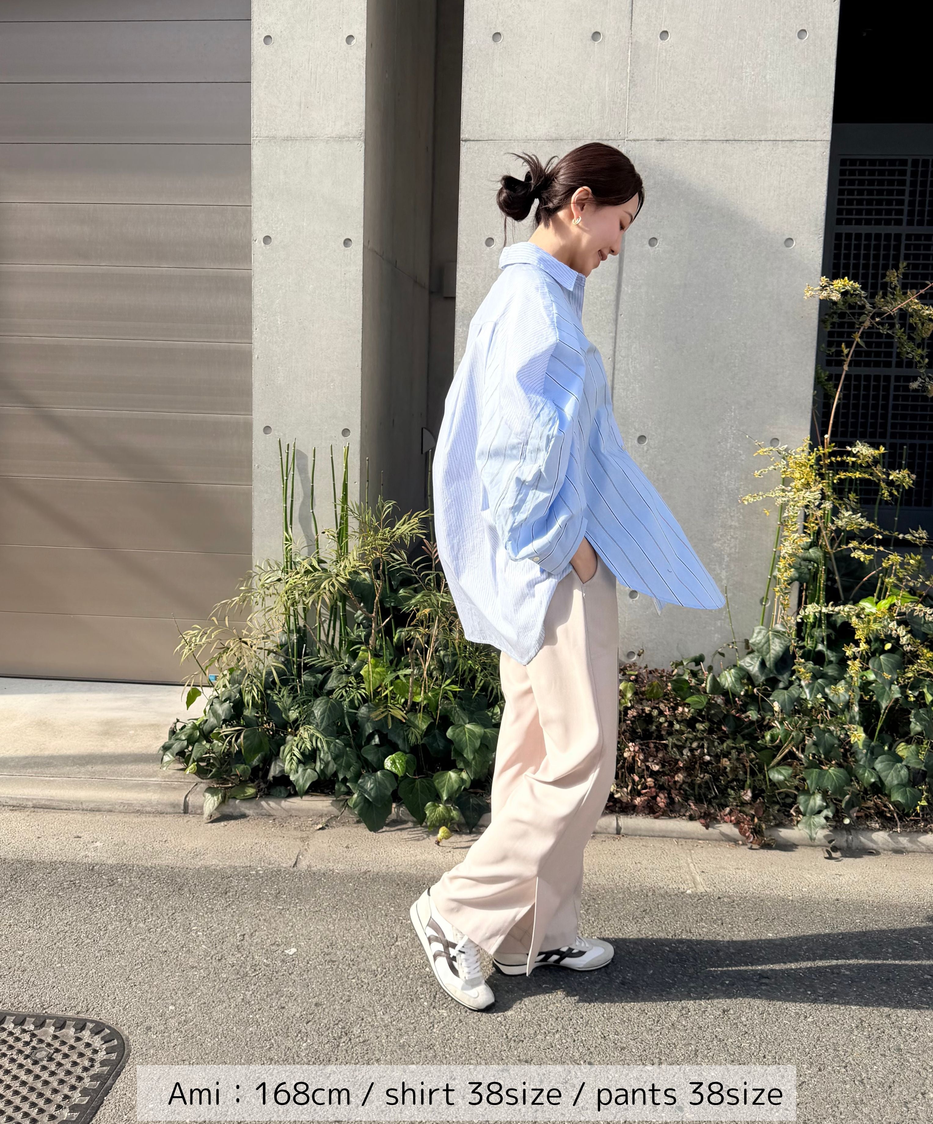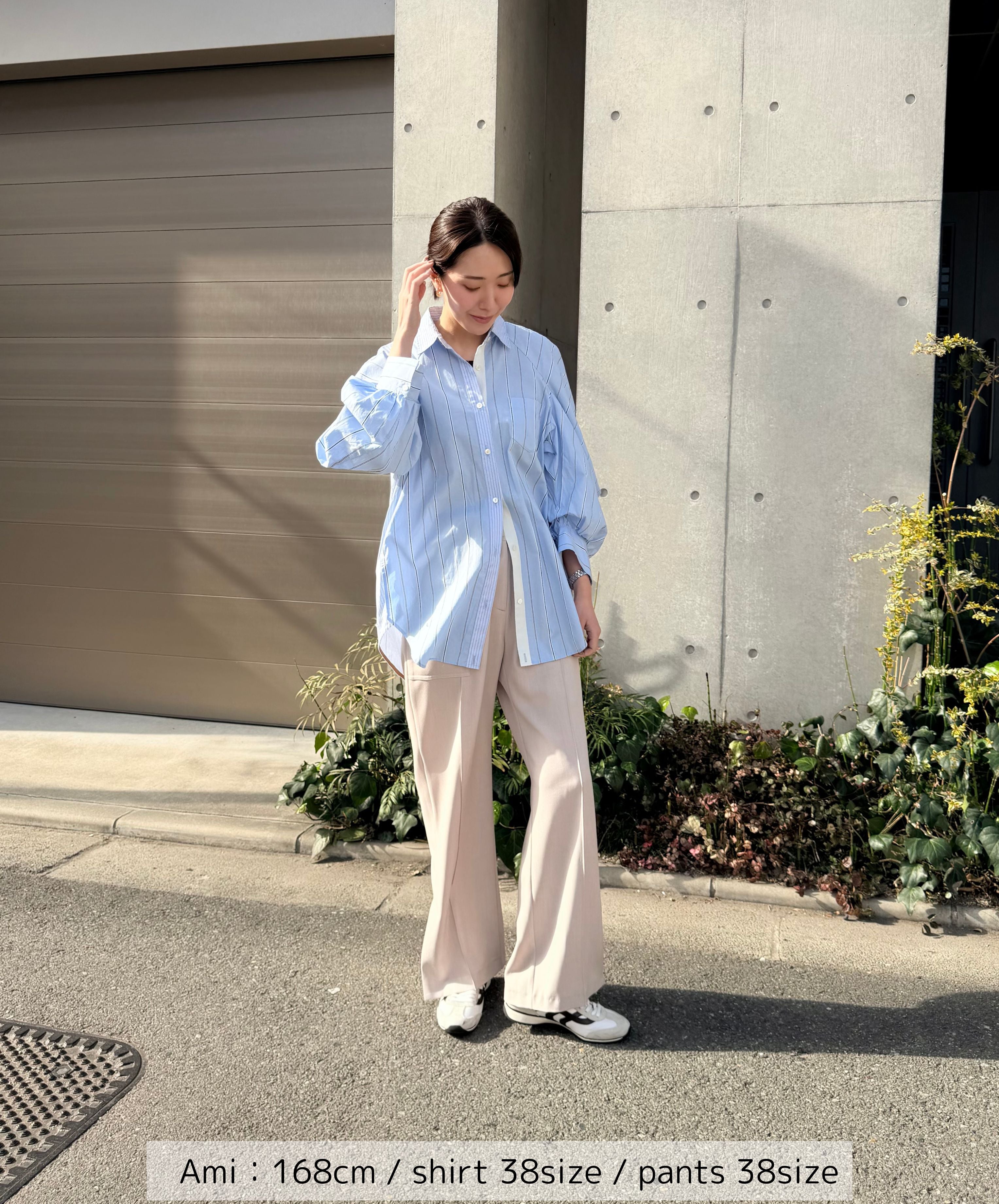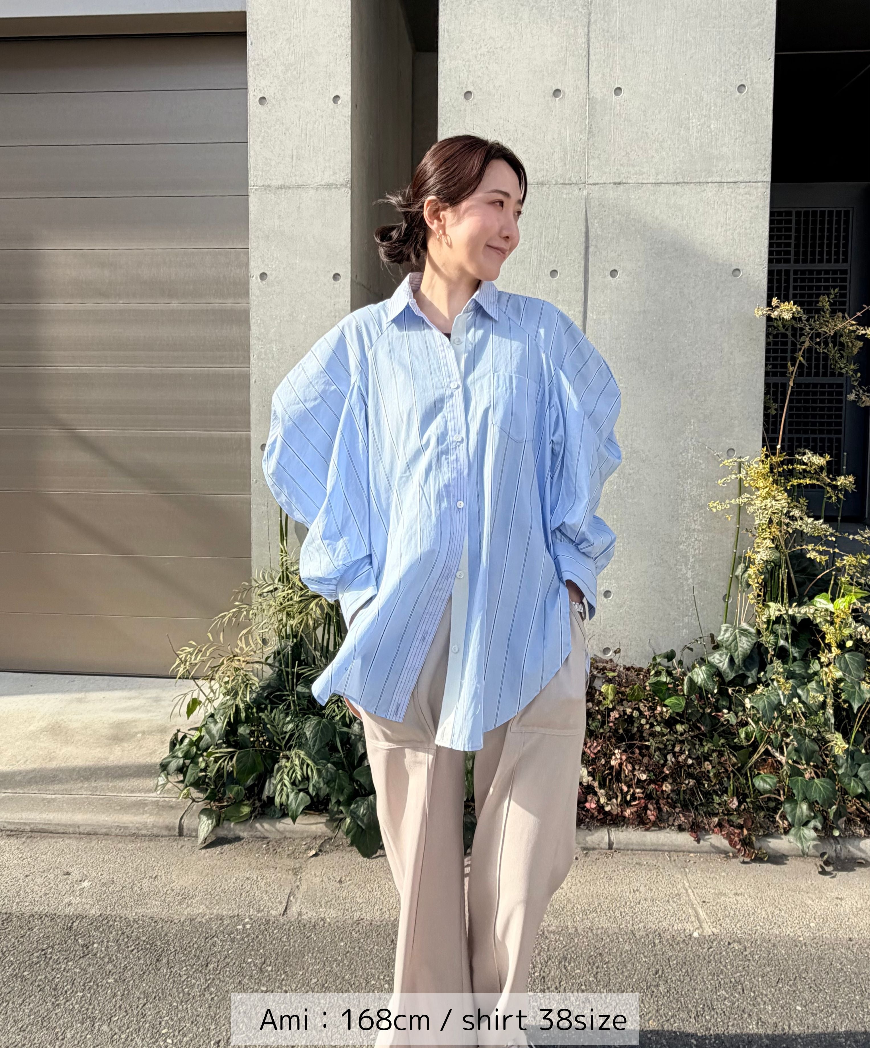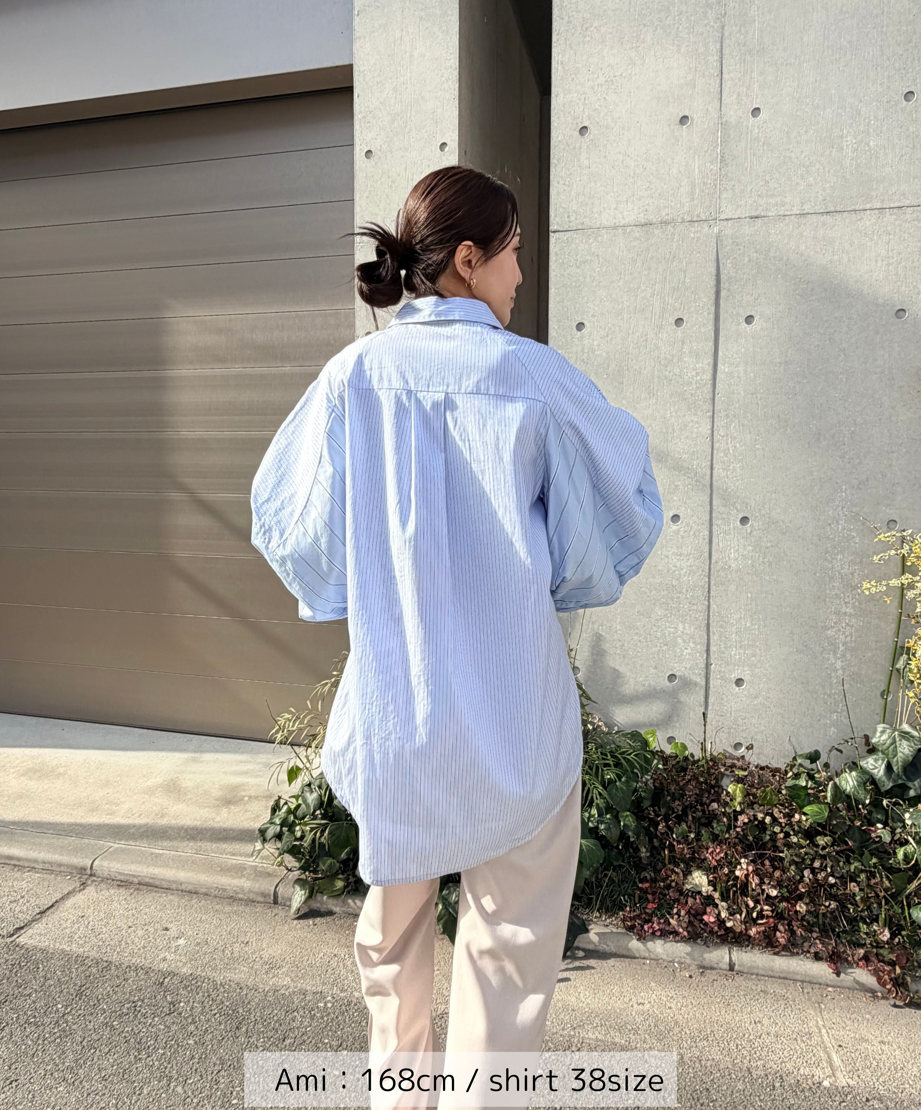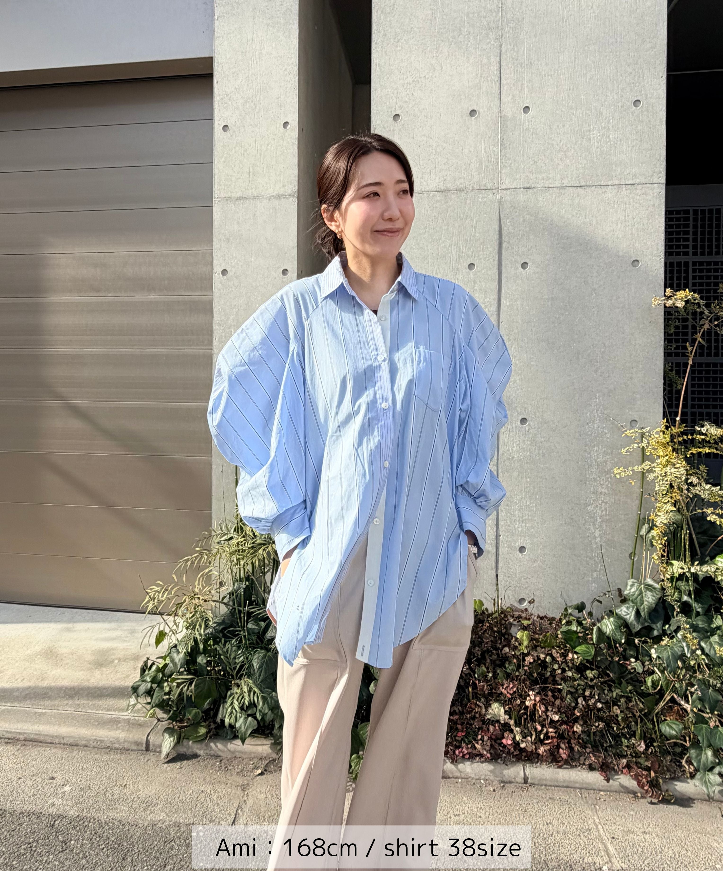 モードなシルエットで感度高めのカーブスリーブチュニックシャツ。遊び心あふれる、2種類のストライプ生地の組み合わせは、膨大な生地の中から一つ一つマッチングを繰り返し採用したこだわり。ゆったりとした抜け感とハリのあるフォルムを併せ持つ、Lallia Múらしい立体的なデザインシャツで、生地のハリを考慮し、無地ver.とは異なるパターンを設計で製作しています。一枚ではもちろん、軽羽織としても長いシーズンで活躍し、トレンドライクなルックスでボタンの留め方や着こなし方でニュアンスを変えて楽しめる一枚です。