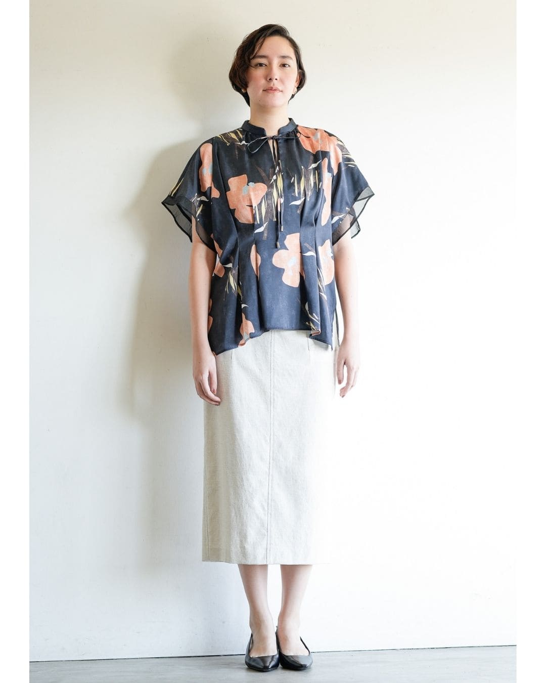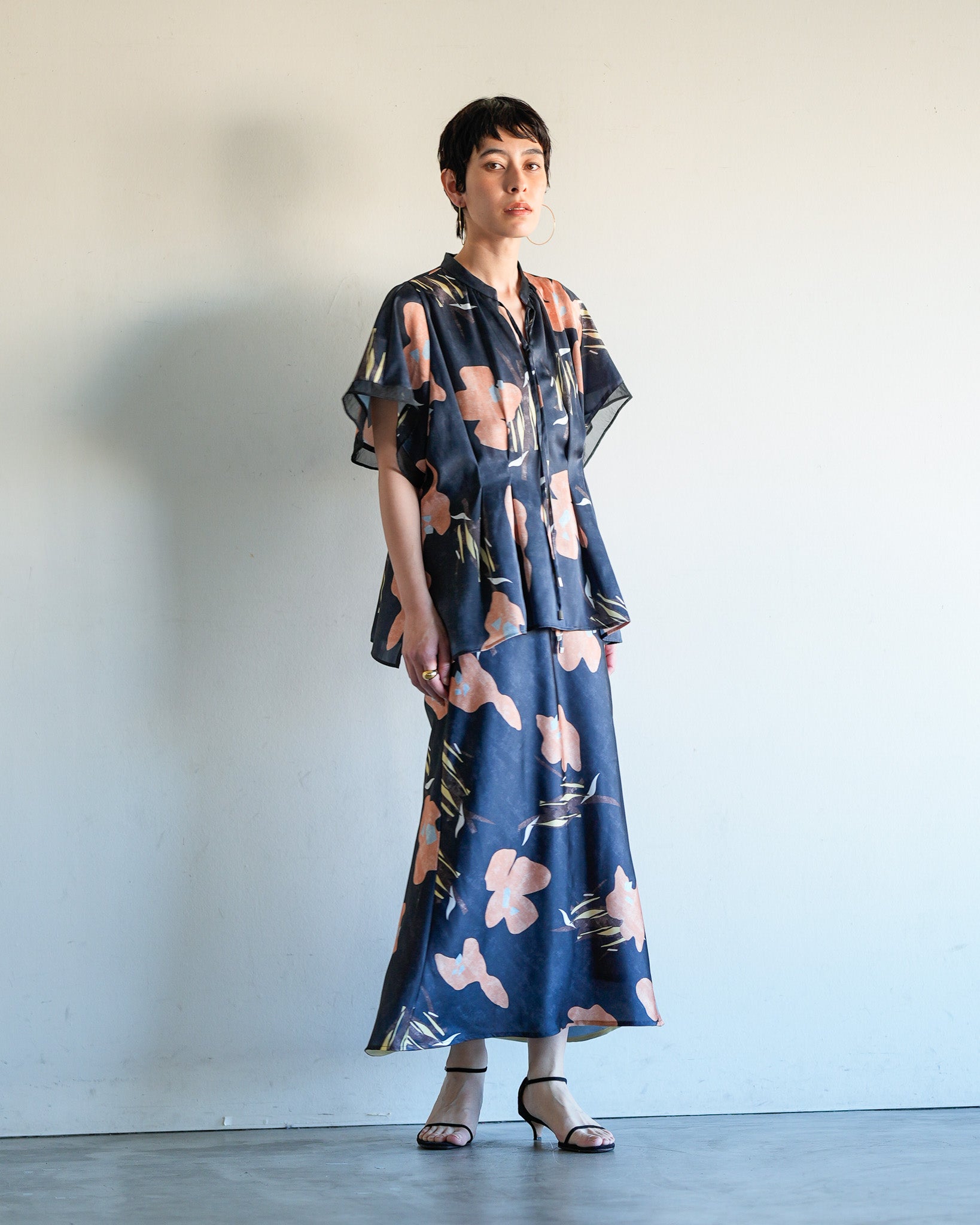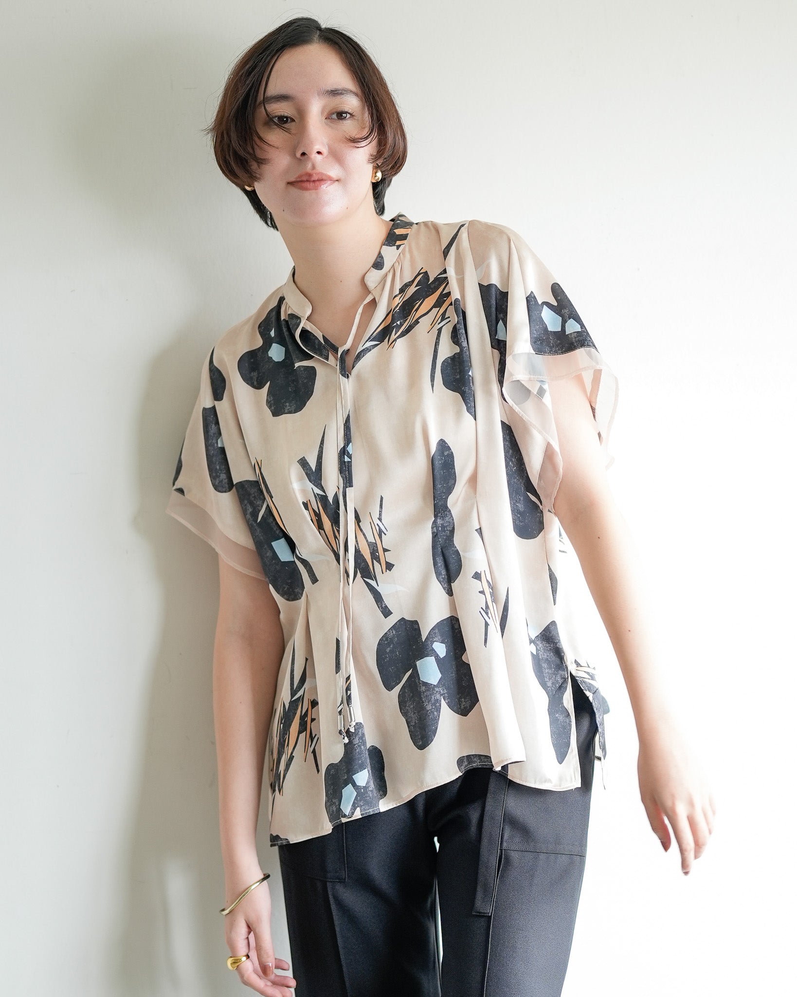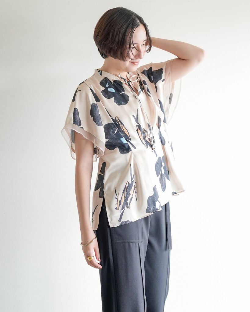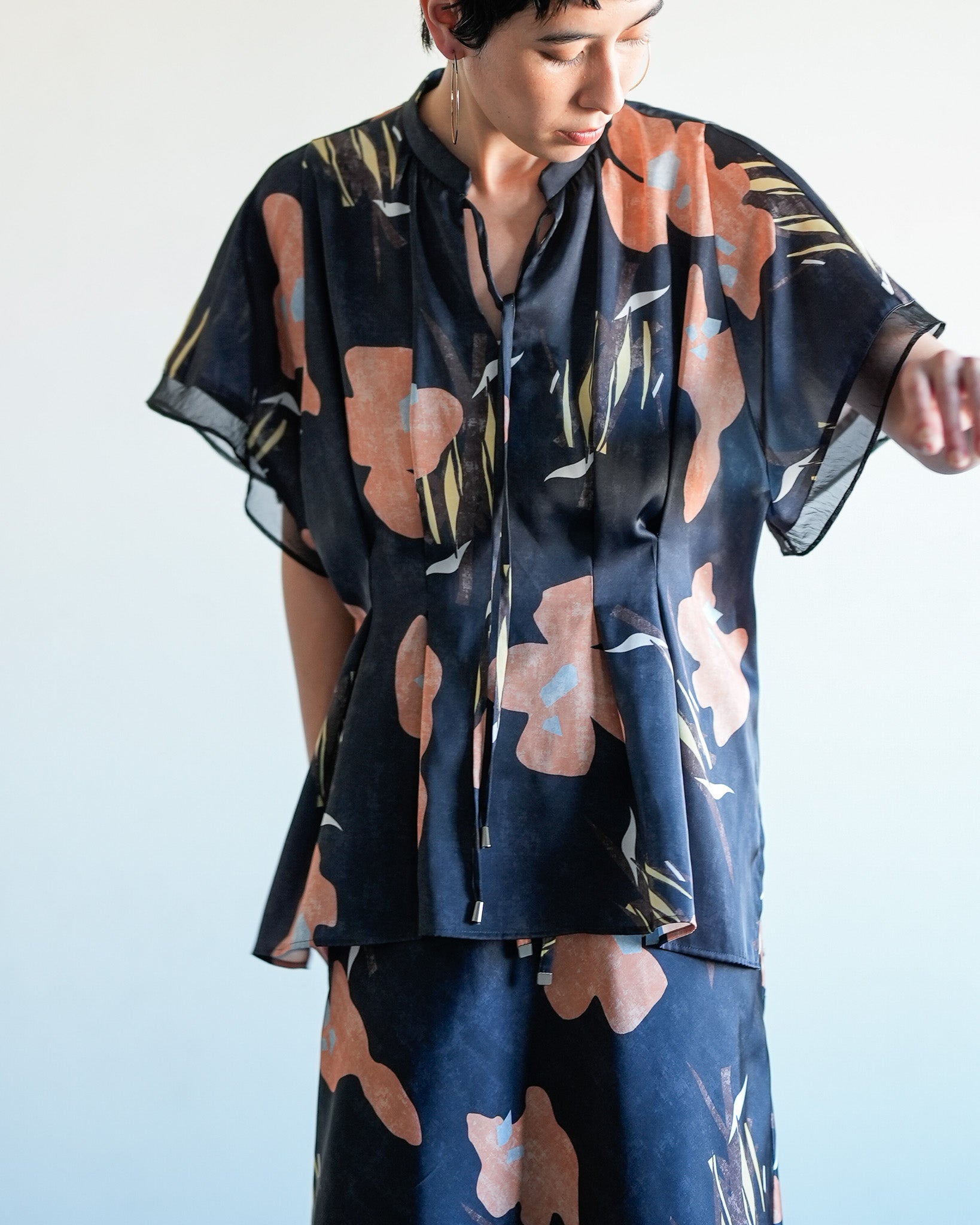 “日常をアートに変える”ラリア・ムー完全オリジナルプロダクトのプリントシリーズ。ラリア・ムーの企画チームが一から制作した、オリジナルサテンのプリント生地を使用したブラウス。袖に柔らかなオーカンジーをドッキングし、爽やかな涼感と洗練された印象を持つサマーブラウスへ落とし込みました。ひらひらと風になびくフレアスリーブは気になる腕周りもカバー。ウエストにはタックを施し、自然にシェイプさせることで、女性らしいメリハリある美しいシルエットを描きます。ボトム次第でon/off幅広いシーンで活躍する一枚です。