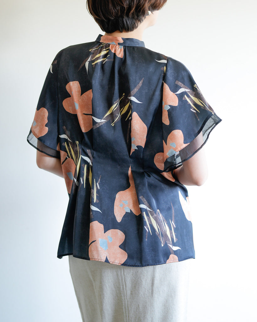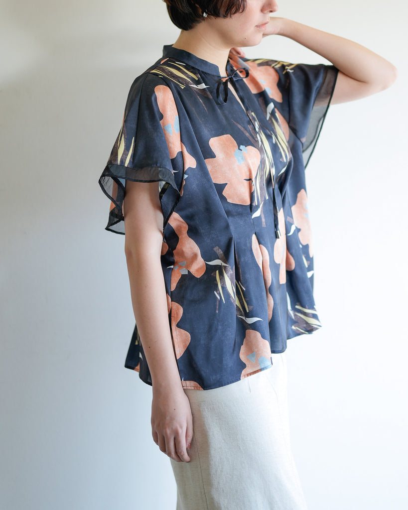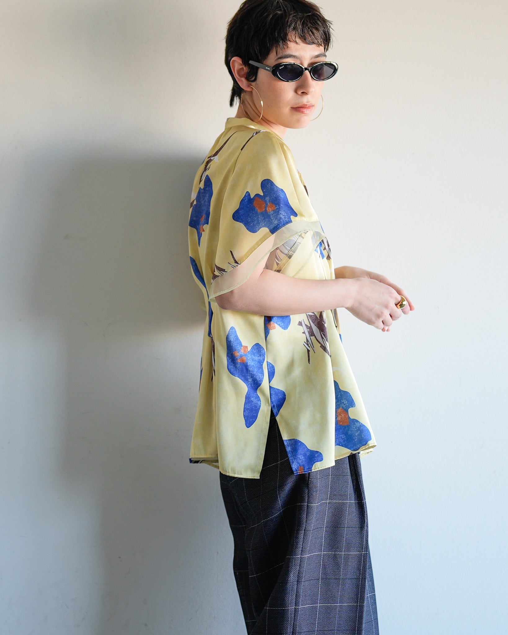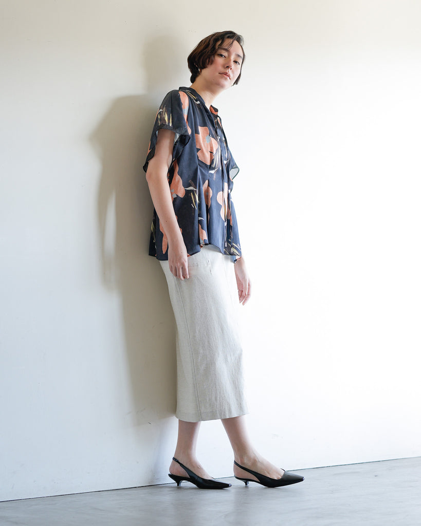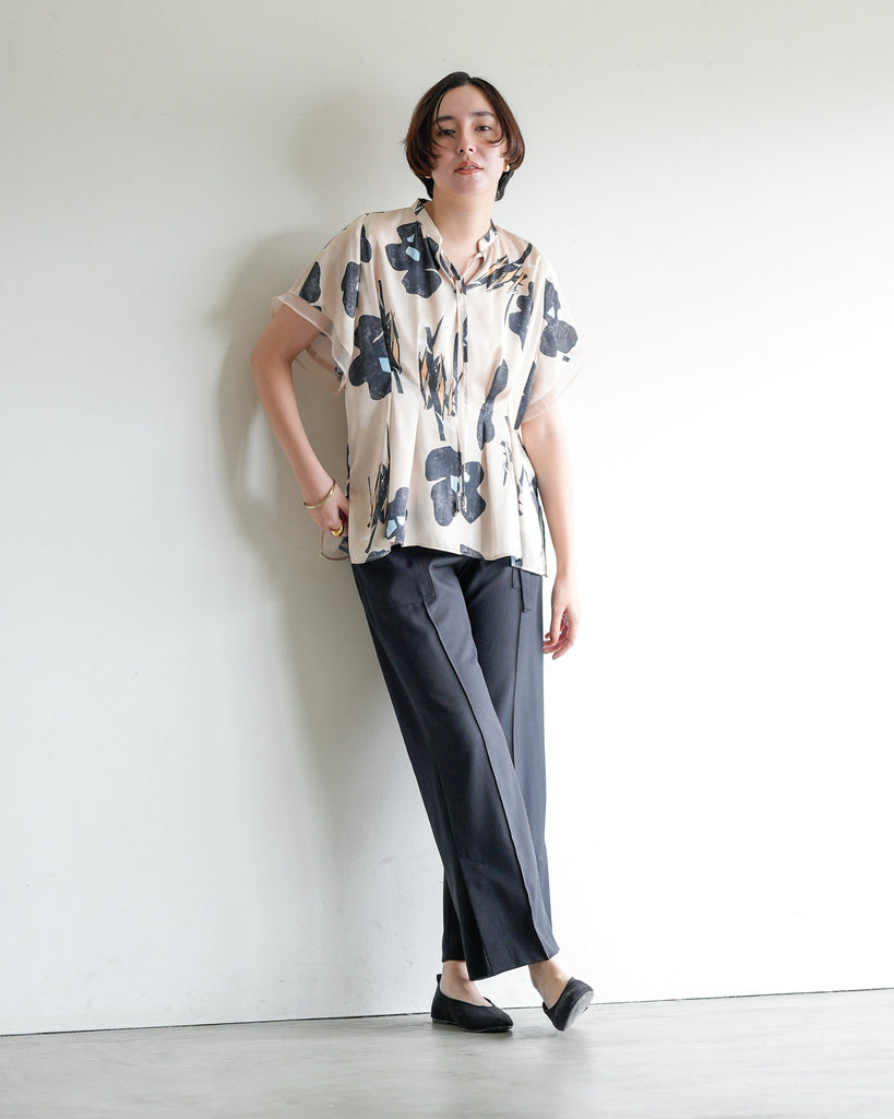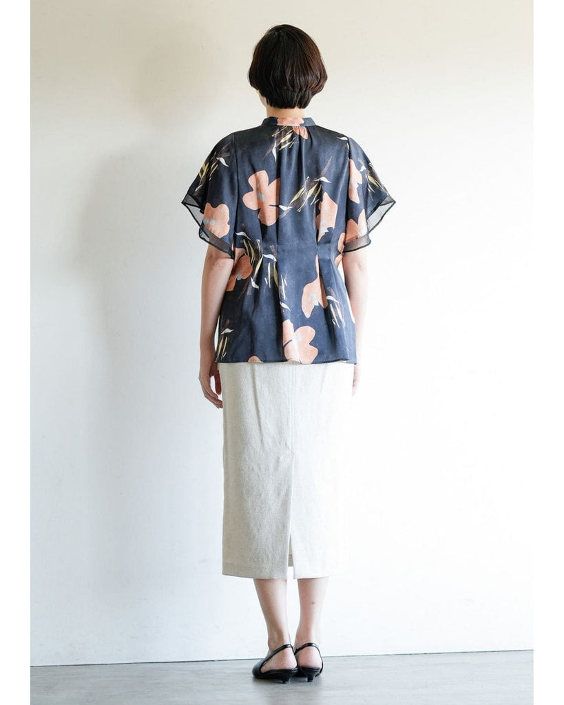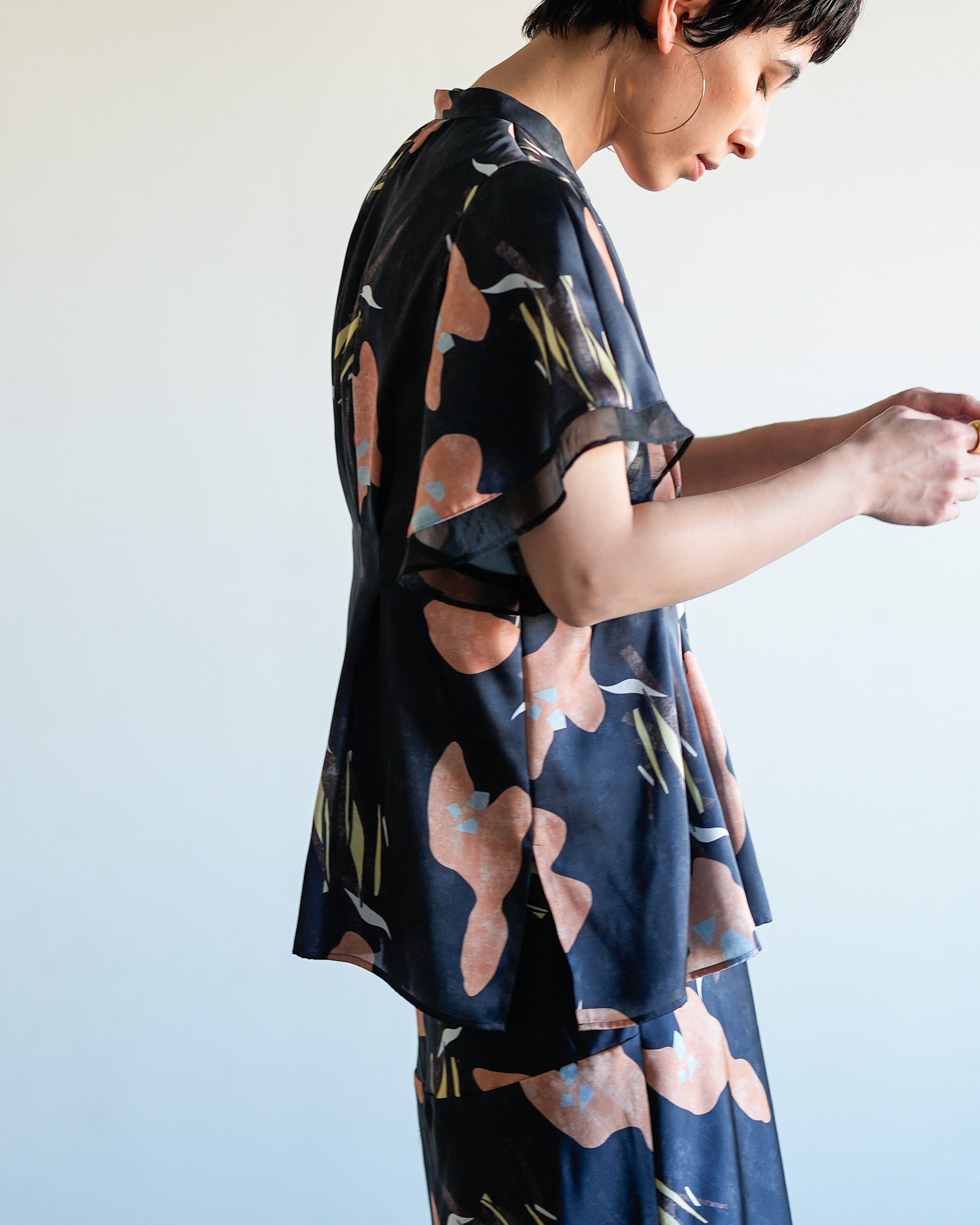 “日常をアートに変える”ラリア・ムー完全オリジナルプロダクトのプリントシリーズ。ラリア・ムーの企画チームが一から制作した、オリジナルサテンのプリント生地を使用したブラウス。袖に柔らかなオーカンジーをドッキングし、爽やかな涼感と洗練された印象を持つサマーブラウスへ落とし込みました。ひらひらと風になびくフレアスリーブは気になる腕周りもカバー。ウエストにはタックを施し、自然にシェイプさせることで、女性らしいメリハリある美しいシルエットを描きます。ボトム次第でon/off幅広いシーンで活躍する一枚です。