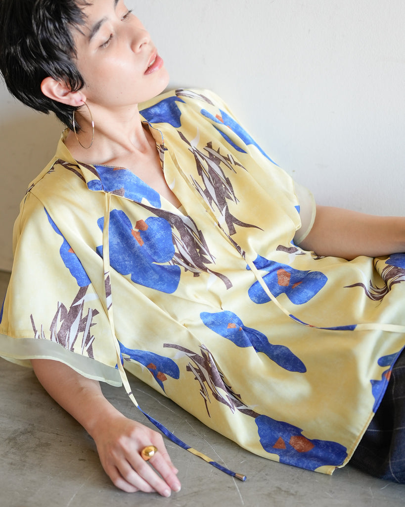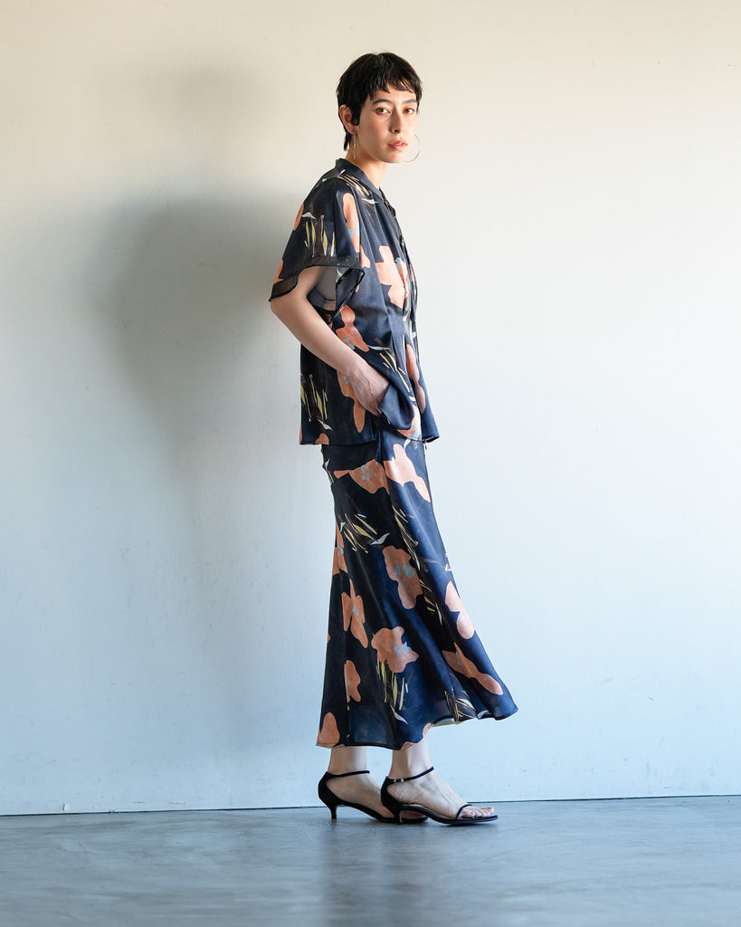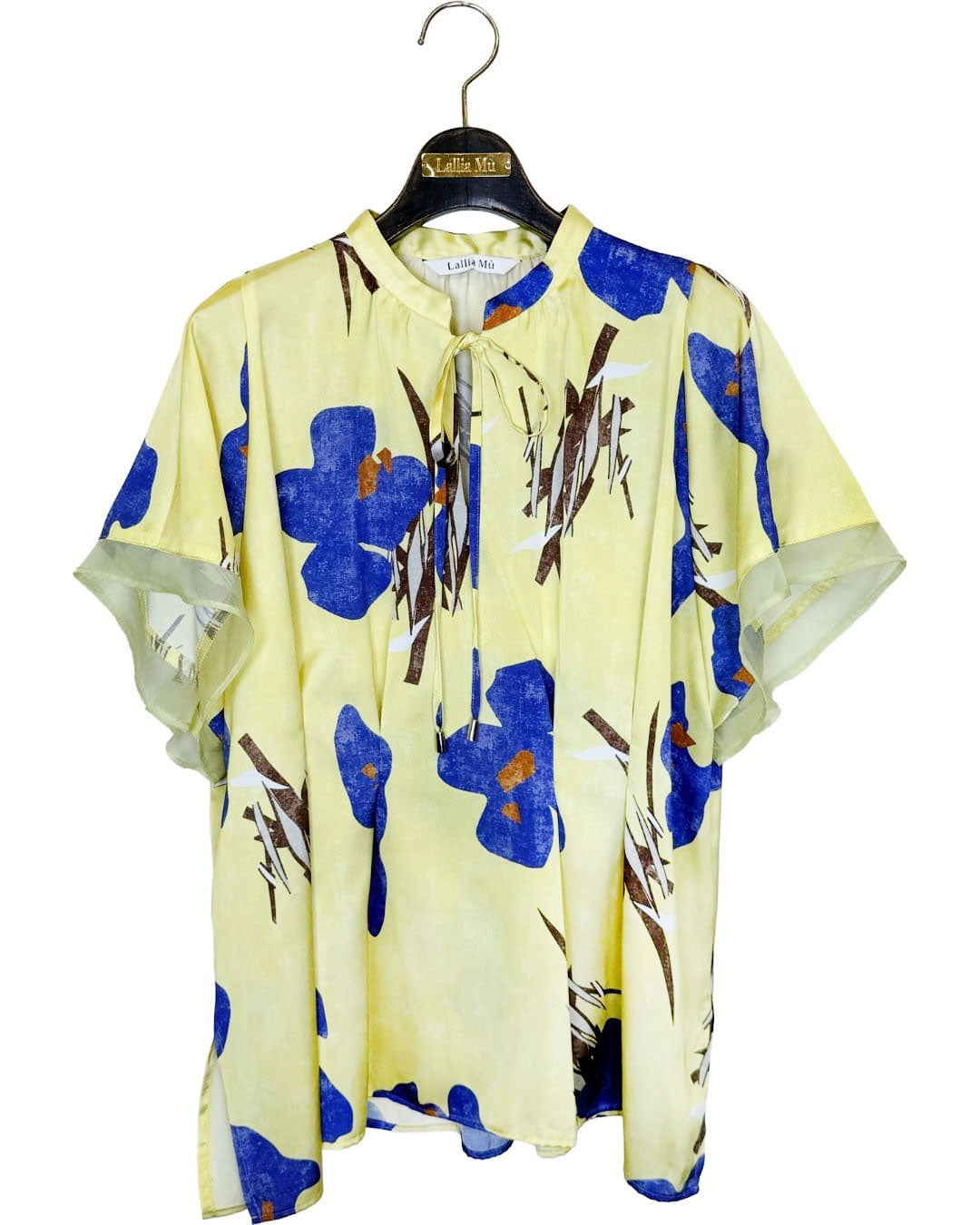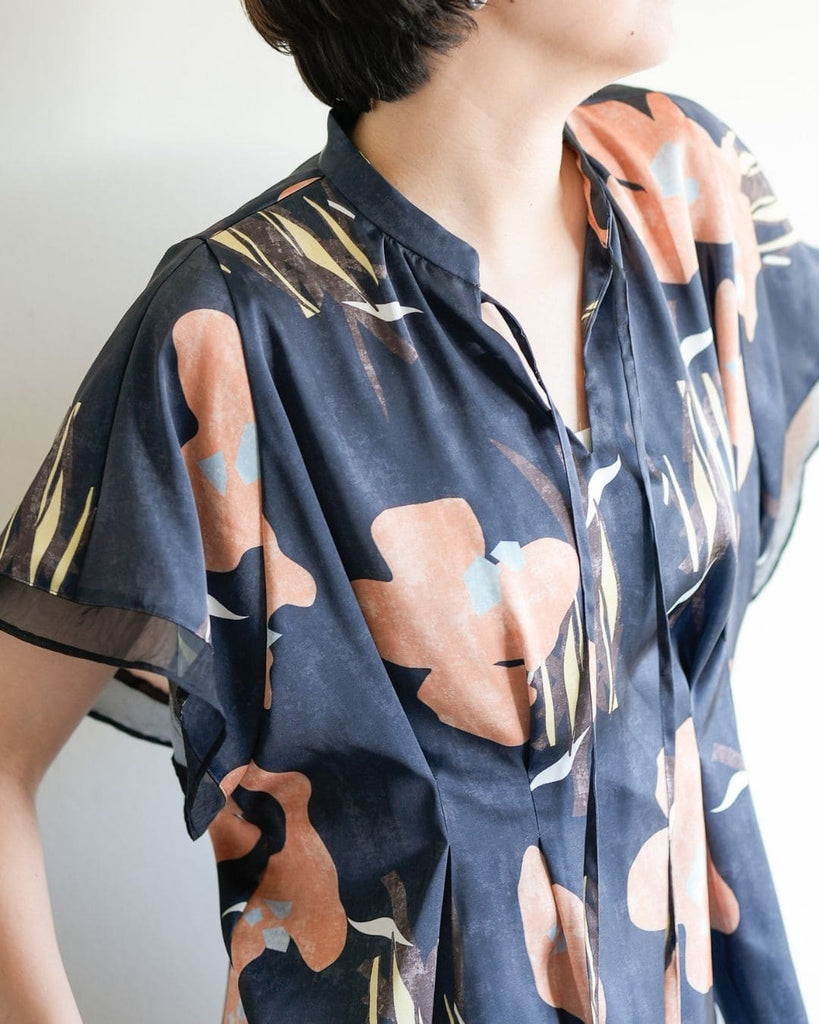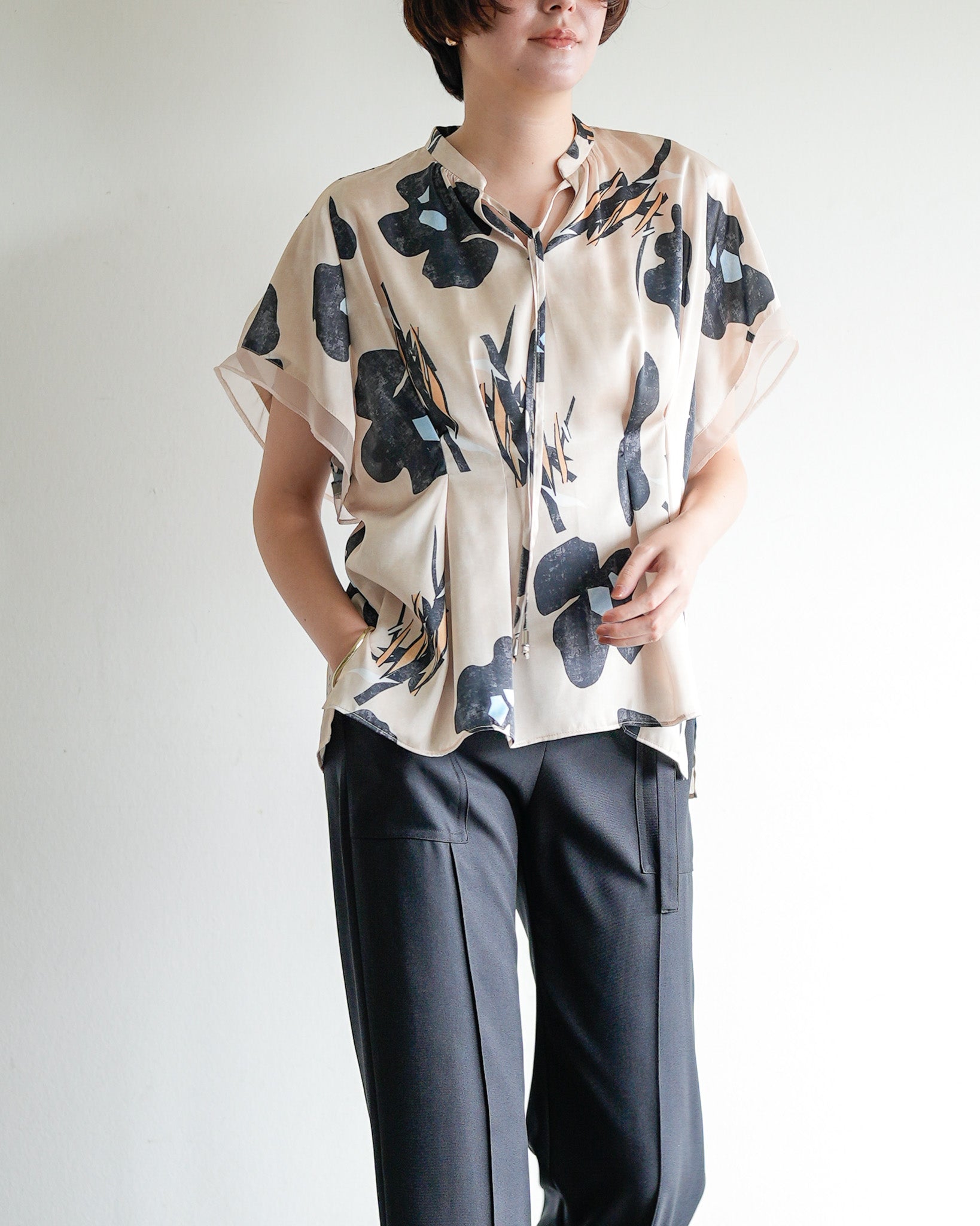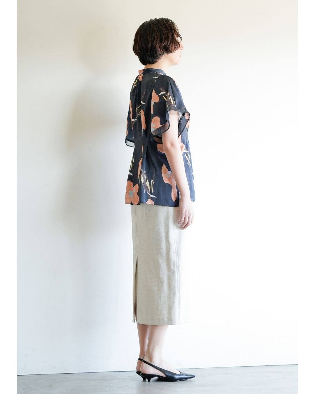 “日常をアートに変える”ラリア・ムー完全オリジナルプロダクトのプリントシリーズ。ラリア・ムーの企画チームが一から制作した、オリジナルサテンのプリント生地を使用したブラウス。袖に柔らかなオーカンジーをドッキングし、爽やかな涼感と洗練された印象を持つサマーブラウスへ落とし込みました。ひらひらと風になびくフレアスリーブは気になる腕周りもカバー。ウエストにはタックを施し、自然にシェイプさせることで、女性らしいメリハリある美しいシルエットを描きます。ボトム次第でon/off幅広いシーンで活躍する一枚です。