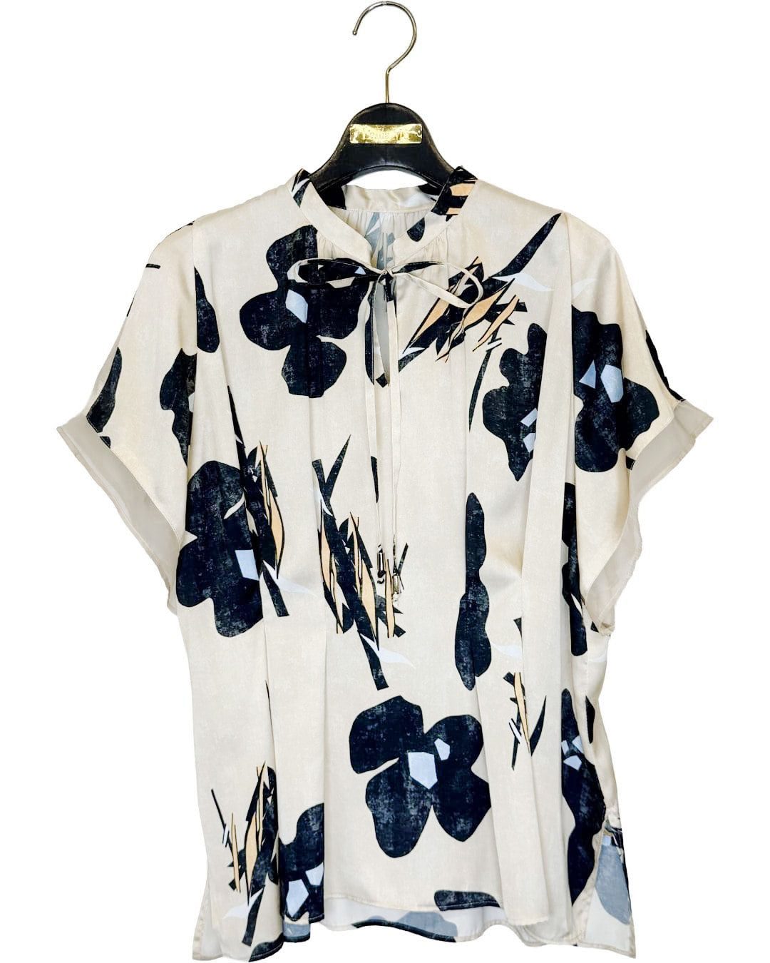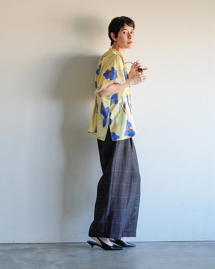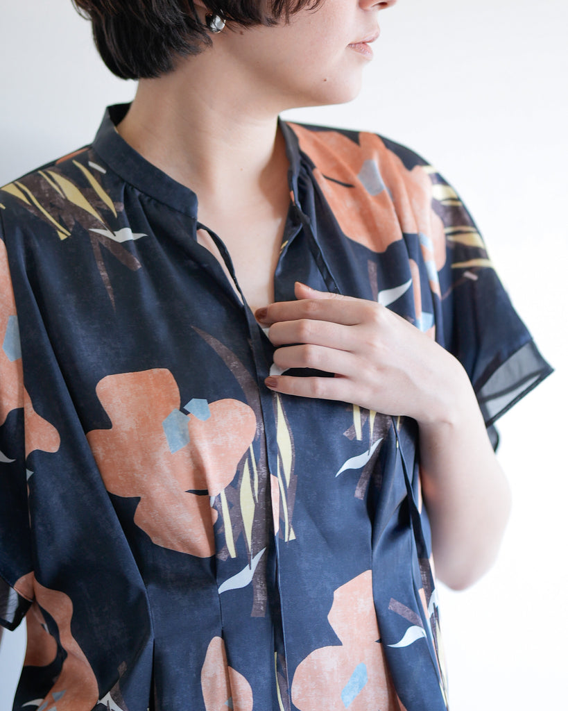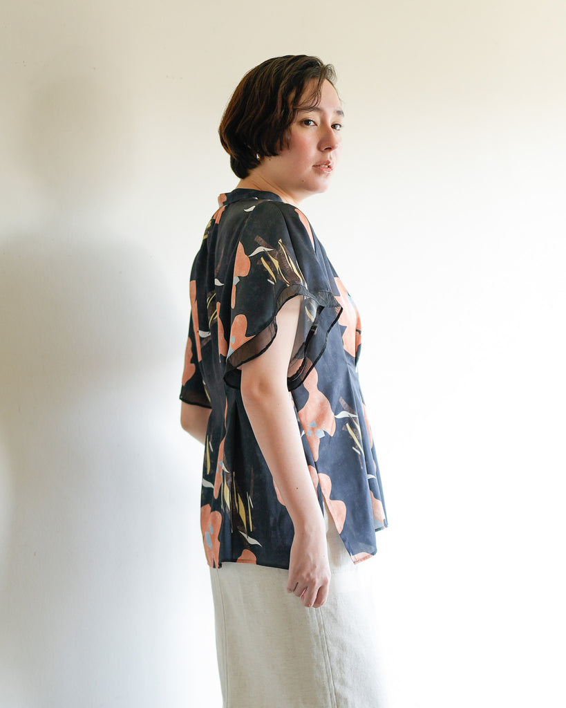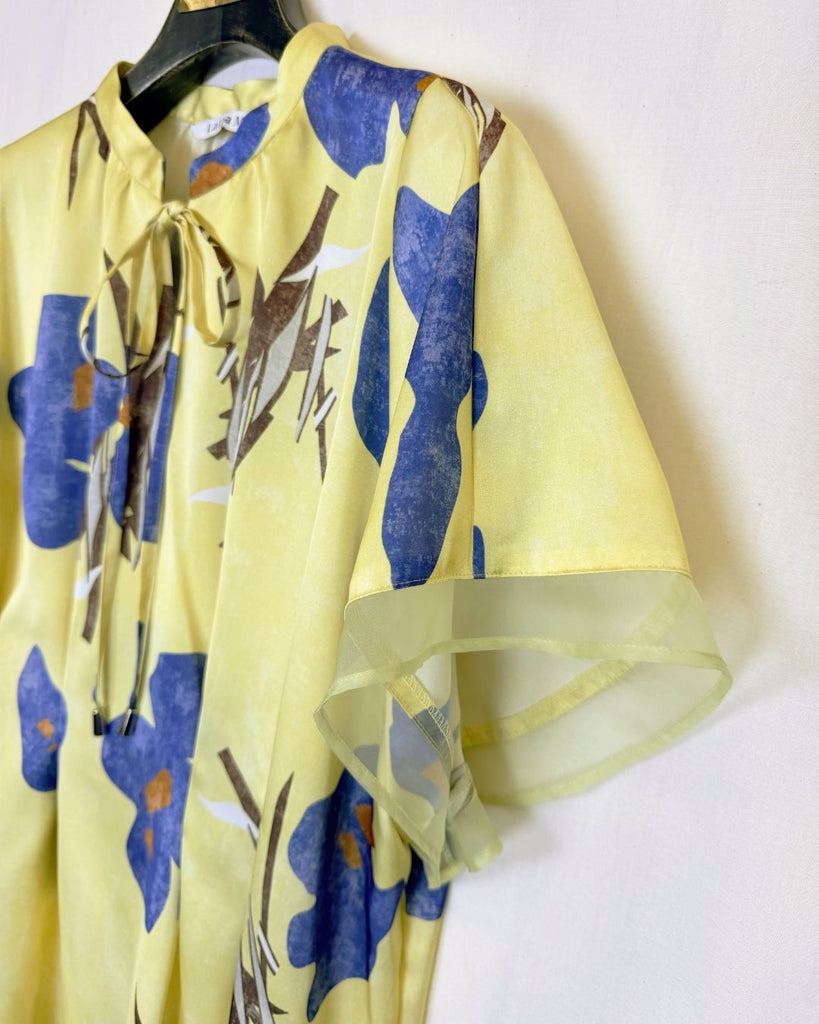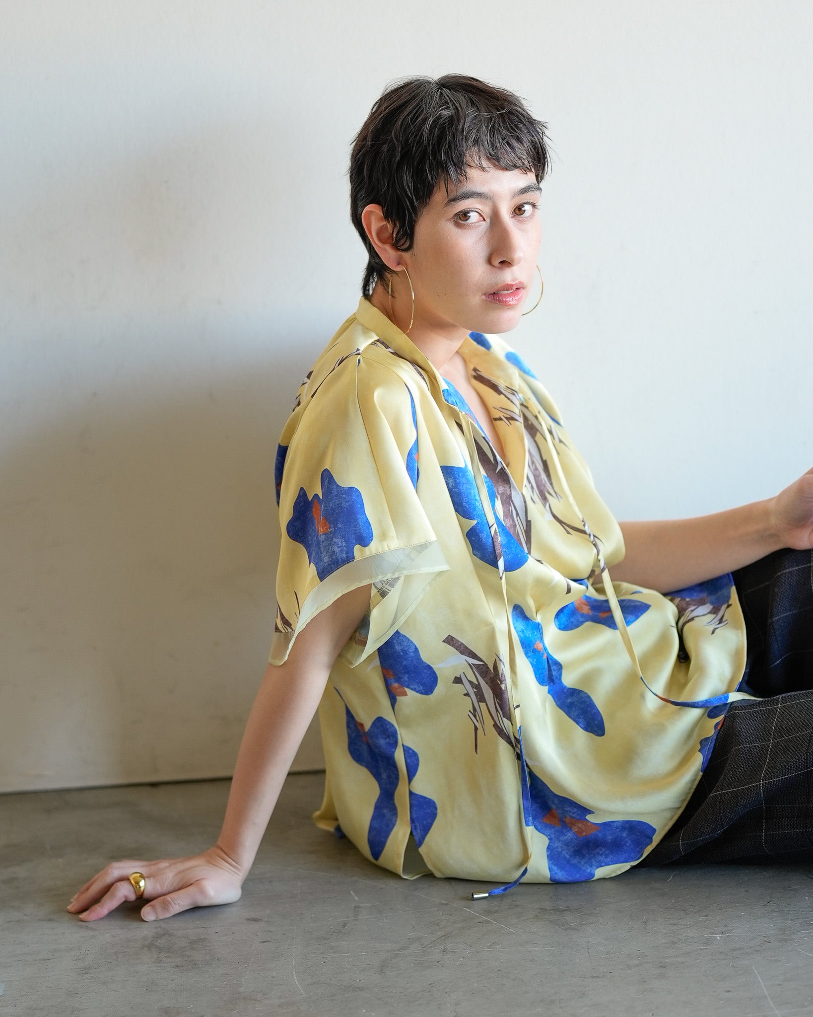 “日常をアートに変える”ラリア・ムー完全オリジナルプロダクトのプリントシリーズ。ラリア・ムーの企画チームが一から制作した、オリジナルサテンのプリント生地を使用したブラウス。袖に柔らかなオーカンジーをドッキングし、爽やかな涼感と洗練された印象を持つサマーブラウスへ落とし込みました。ひらひらと風になびくフレアスリーブは気になる腕周りもカバー。ウエストにはタックを施し、自然にシェイプさせることで、女性らしいメリハリある美しいシルエットを描きます。ボトム次第でon/off幅広いシーンで活躍する一枚です。