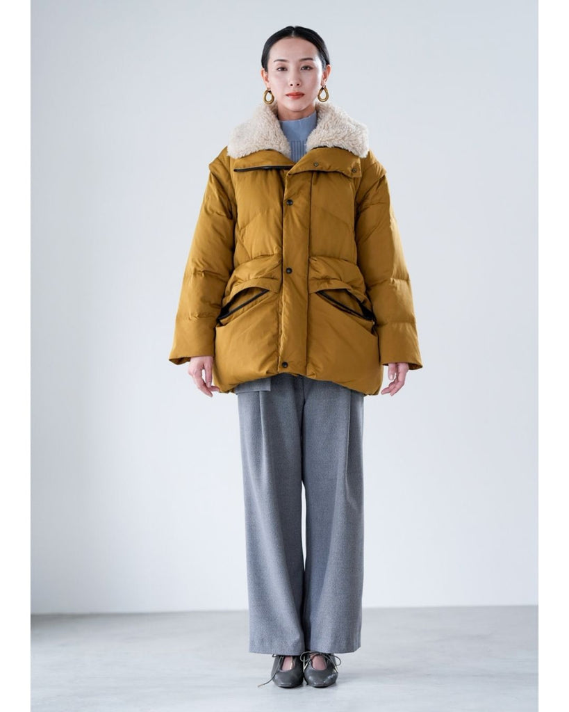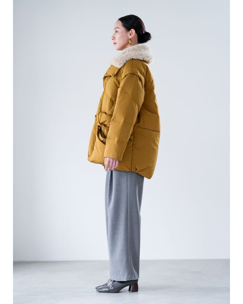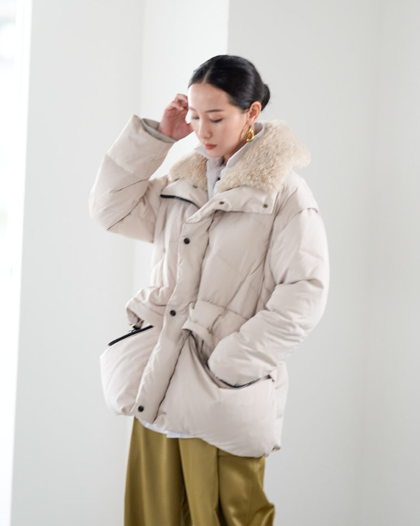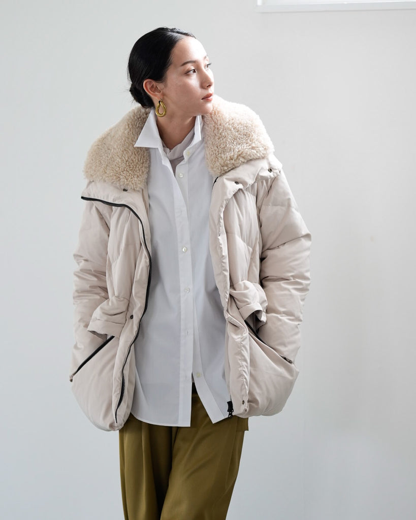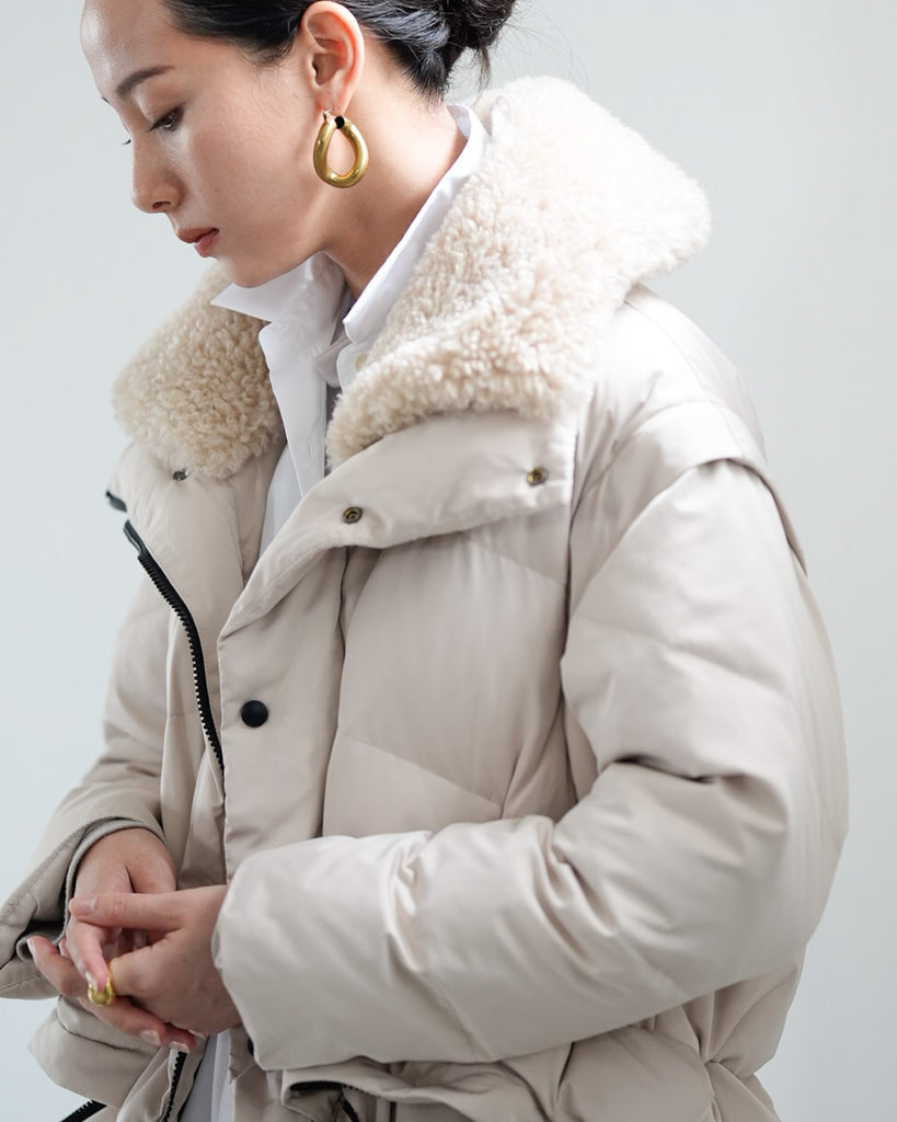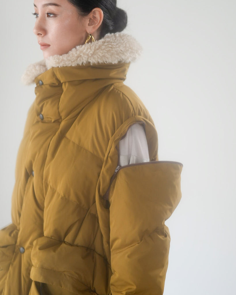 アームホールのファスナーで袖をセパレートできる2wayダウンジャケット。リアルダウンで防寒性はもちろん、モードなデザインでファッション性も高いラリアムーのダウンです。衿のムートン風エコファーは取り外し可能で、顔まわりに華やかさとあたたかさをもたらします。身頃は程よいハリ感のダウン量に調整し、肩やアーム周りのダウン量を少なくすることで気になる着膨れに配慮しました。(ダウンパック入)ポケット口のファスナーは開けて着用することもでき、スタイリッシュなムードを作ってくれます。腰がしっかり隠れる着丈で真冬も安心して着用できます。