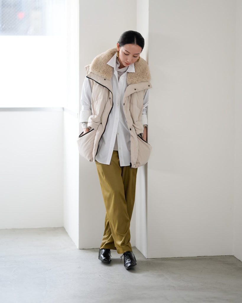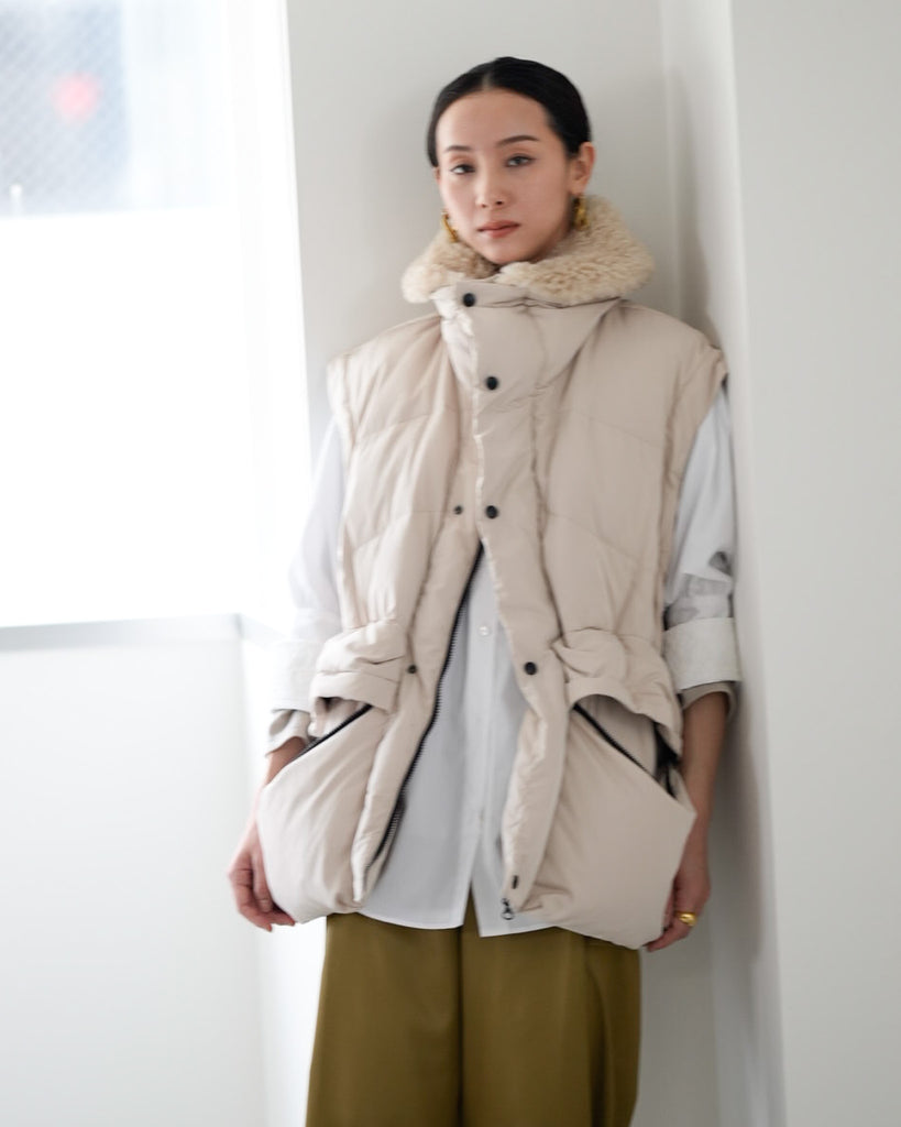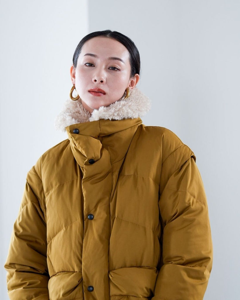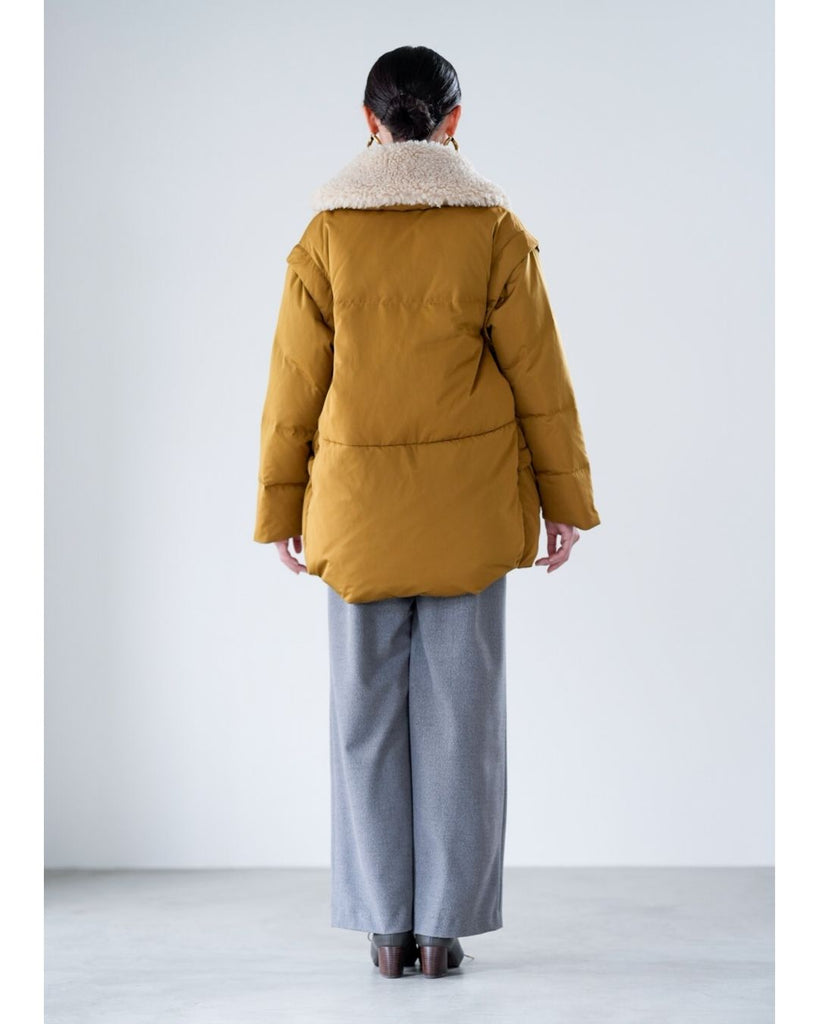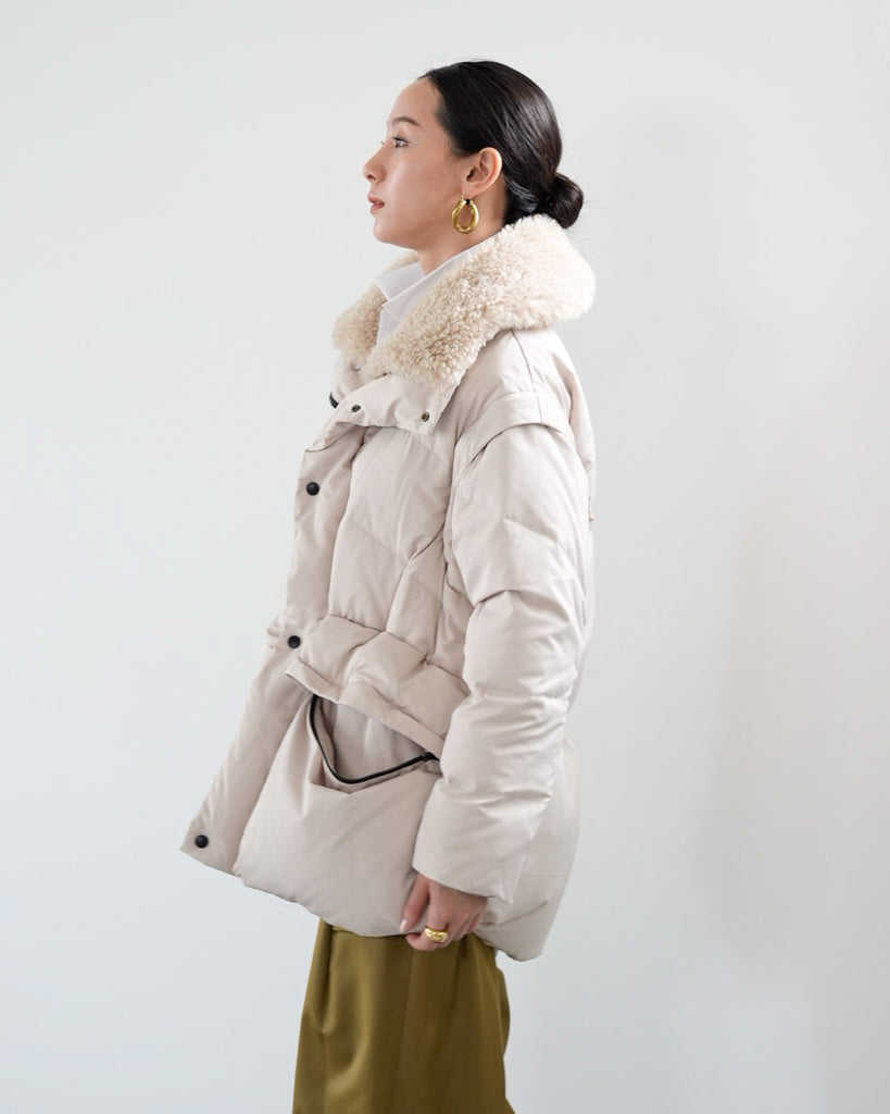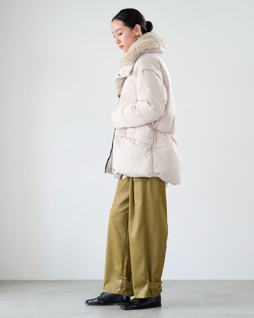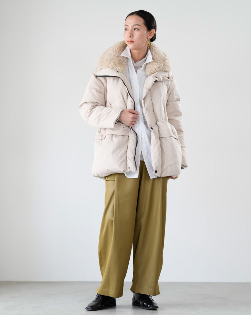 アームホールのファスナーで袖をセパレートできる2wayダウンジャケット。リアルダウンで防寒性はもちろん、モードなデザインでファッション性も高いラリアムーのダウンです。衿のムートン風エコファーは取り外し可能で、顔まわりに華やかさとあたたかさをもたらします。身頃は程よいハリ感のダウン量に調整し、肩やアーム周りのダウン量を少なくすることで気になる着膨れに配慮しました。(ダウンパック入)ポケット口のファスナーは開けて着用することもでき、スタイリッシュなムードを作ってくれます。腰がしっかり隠れる着丈で真冬も安心して着用できます。