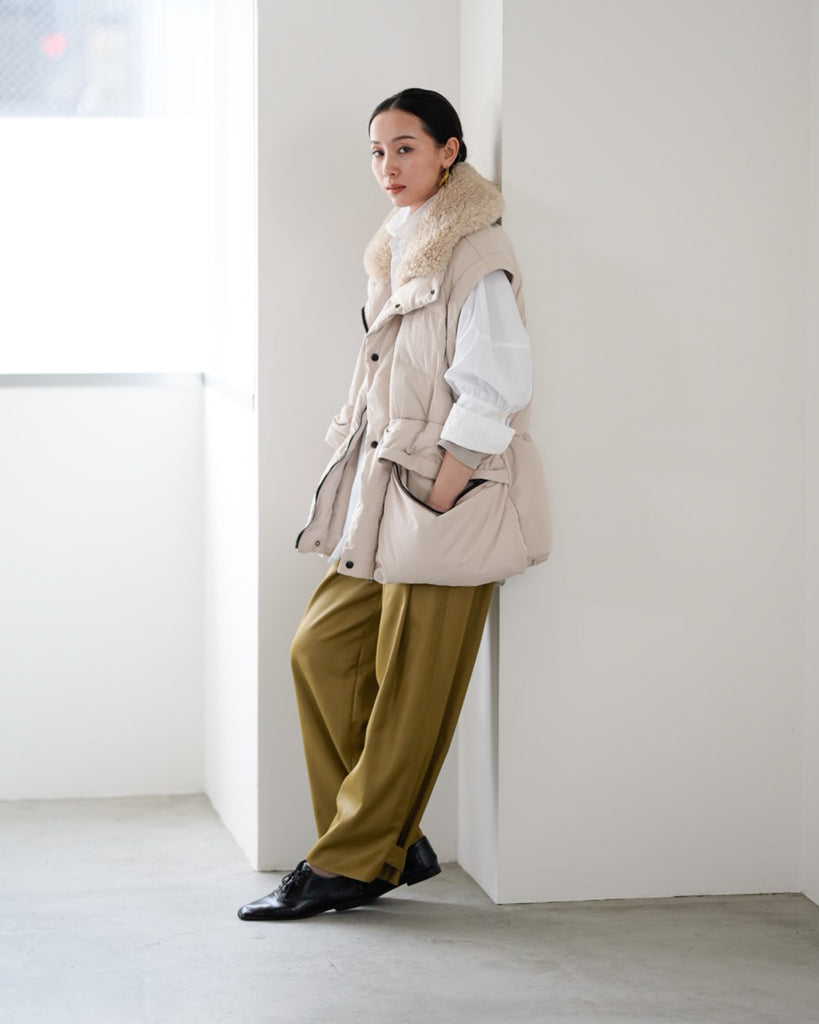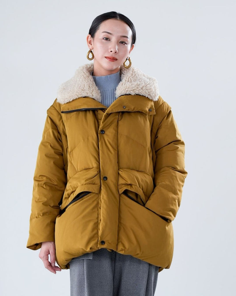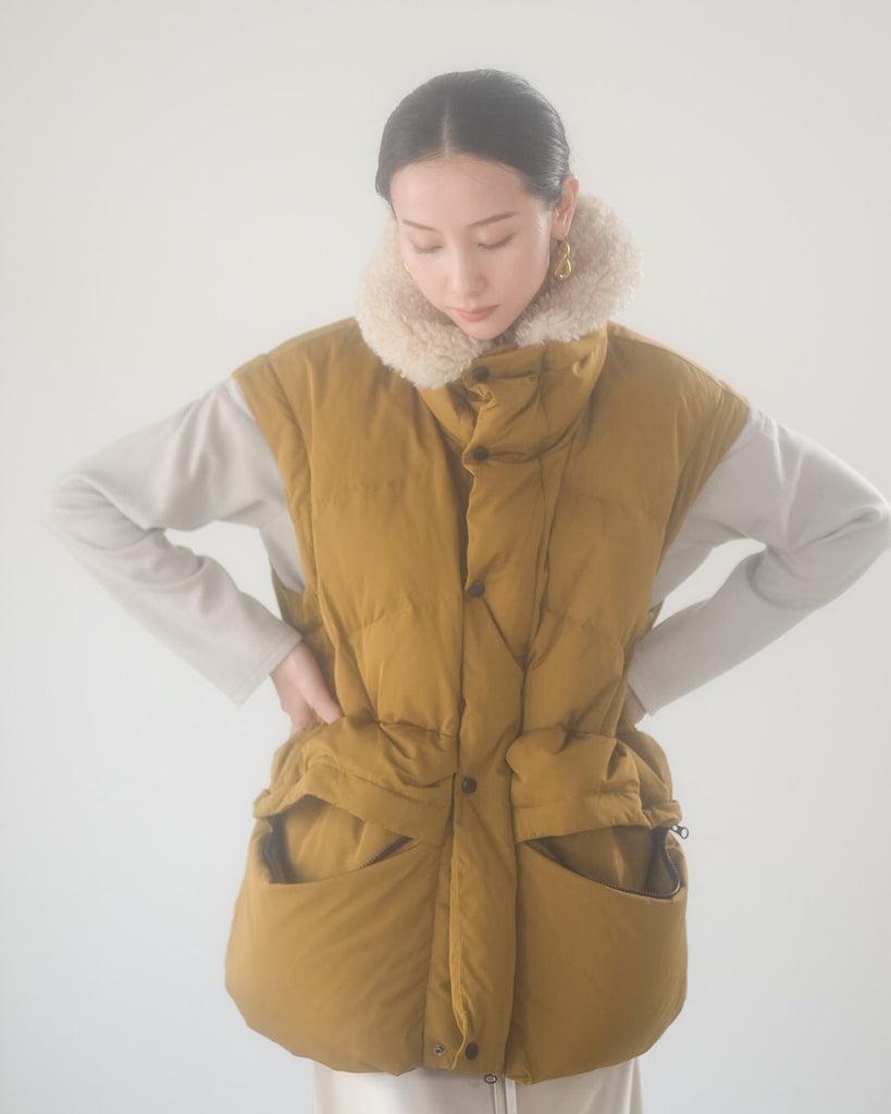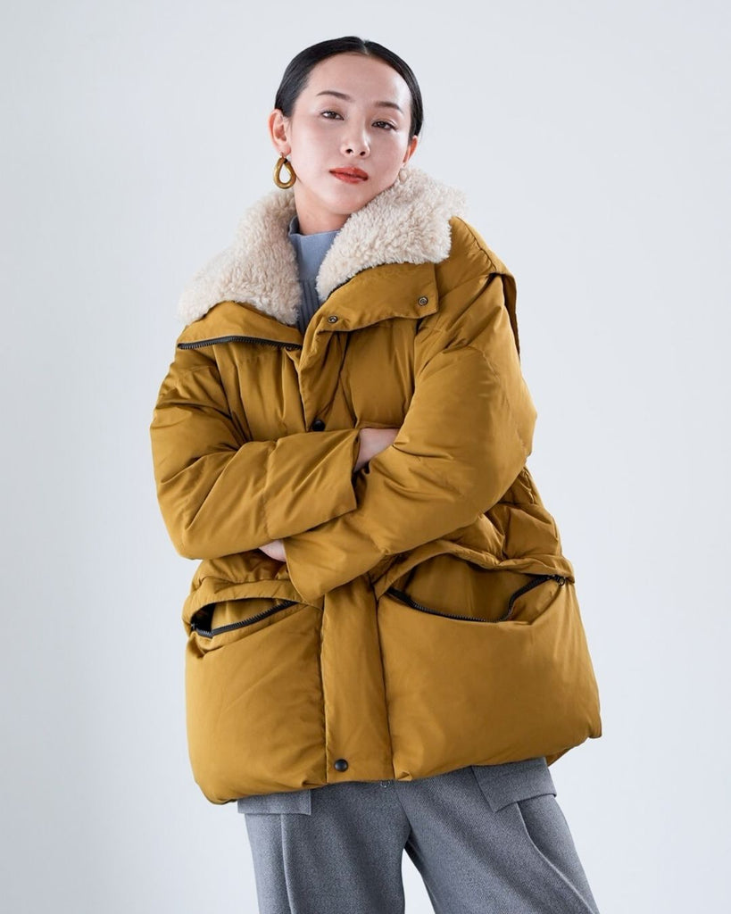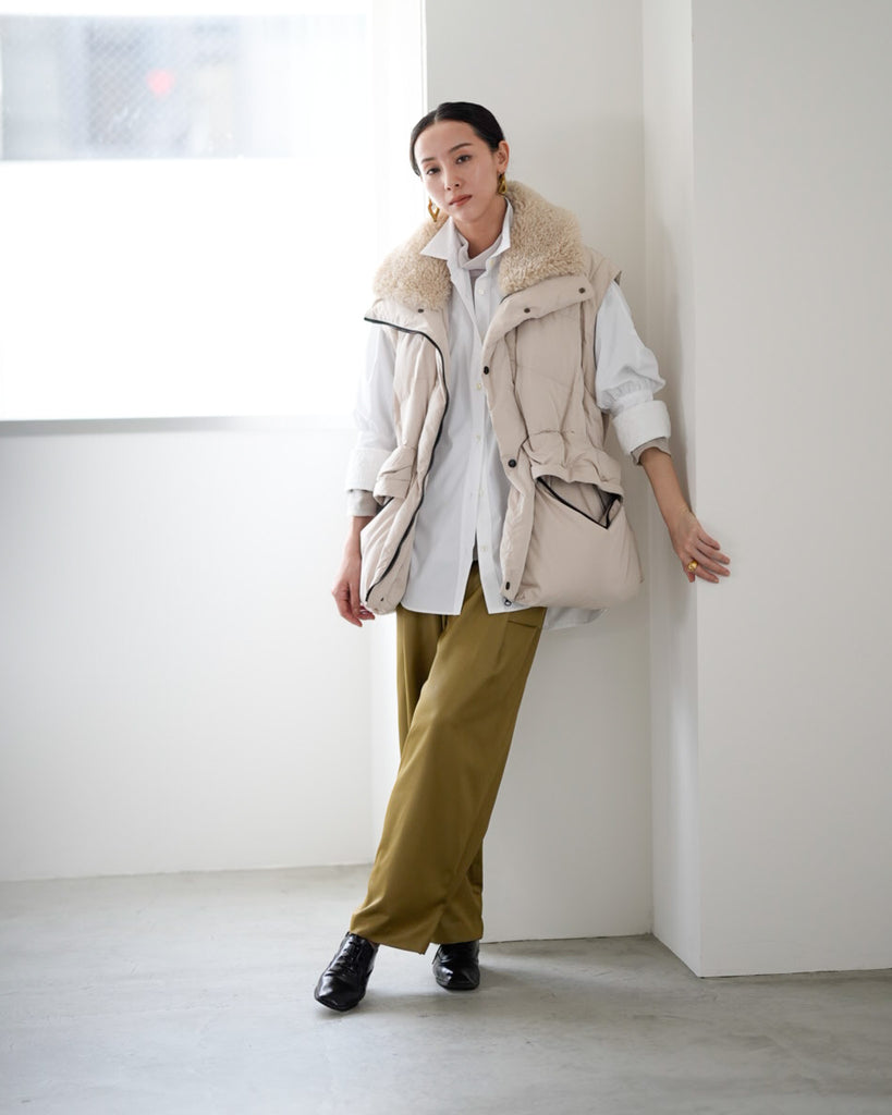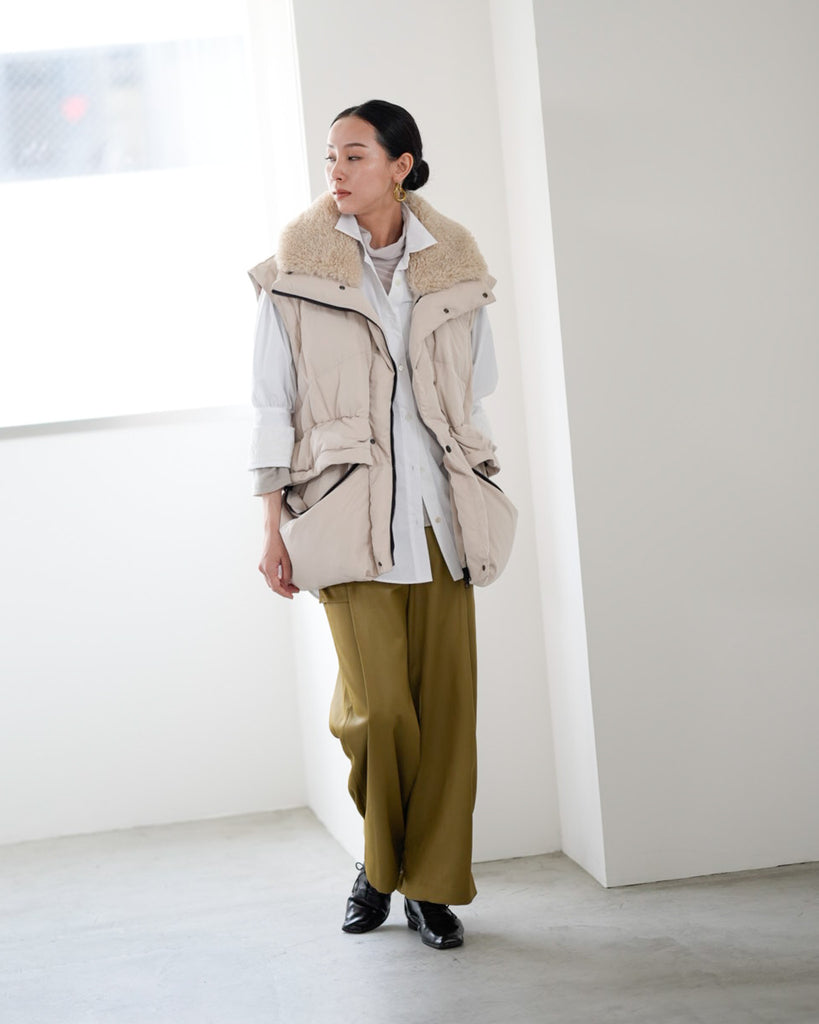 アームホールのファスナーで袖をセパレートできる2wayダウンジャケット。リアルダウンで防寒性はもちろん、モードなデザインでファッション性も高いラリアムーのダウンです。衿のムートン風エコファーは取り外し可能で、顔まわりに華やかさとあたたかさをもたらします。身頃は程よいハリ感のダウン量に調整し、肩やアーム周りのダウン量を少なくすることで気になる着膨れに配慮しました。(ダウンパック入)ポケット口のファスナーは開けて着用することもでき、スタイリッシュなムードを作ってくれます。腰がしっかり隠れる着丈で真冬も安心して着用できます。