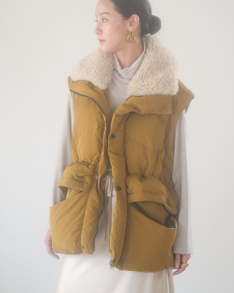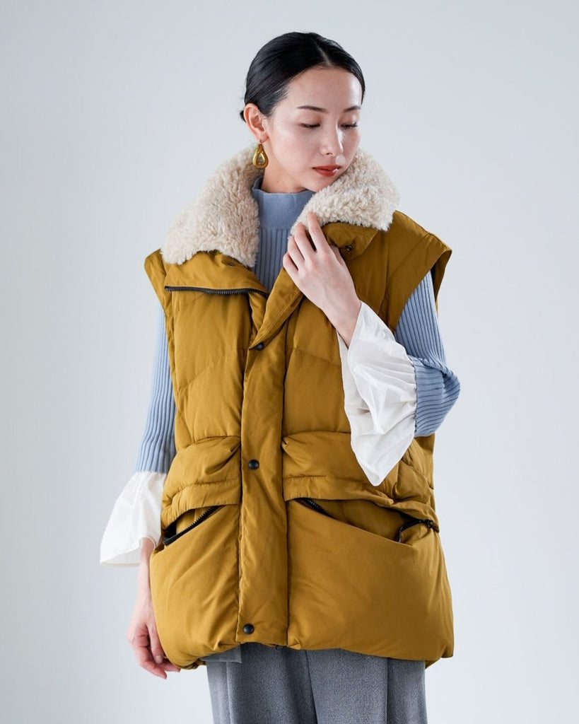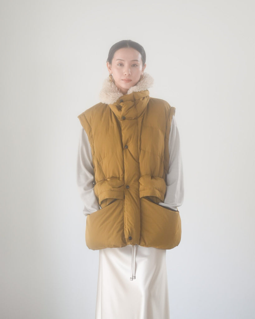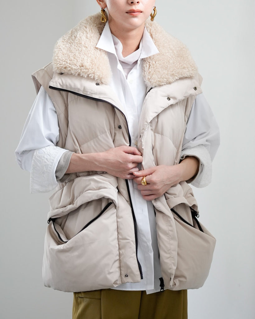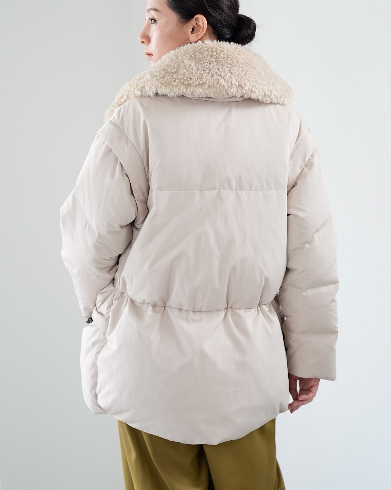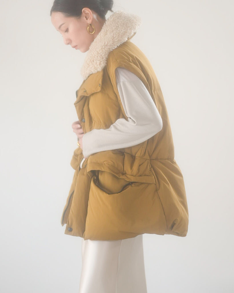 アームホールのファスナーで袖をセパレートできる2wayダウンジャケット。リアルダウンで防寒性はもちろん、モードなデザインでファッション性も高いラリアムーのダウンです。衿のムートン風エコファーは取り外し可能で、顔まわりに華やかさとあたたかさをもたらします。身頃は程よいハリ感のダウン量に調整し、肩やアーム周りのダウン量を少なくすることで気になる着膨れに配慮しました。(ダウンパック入)ポケット口のファスナーは開けて着用することもでき、スタイリッシュなムードを作ってくれます。腰がしっかり隠れる着丈で真冬も安心して着用できます。