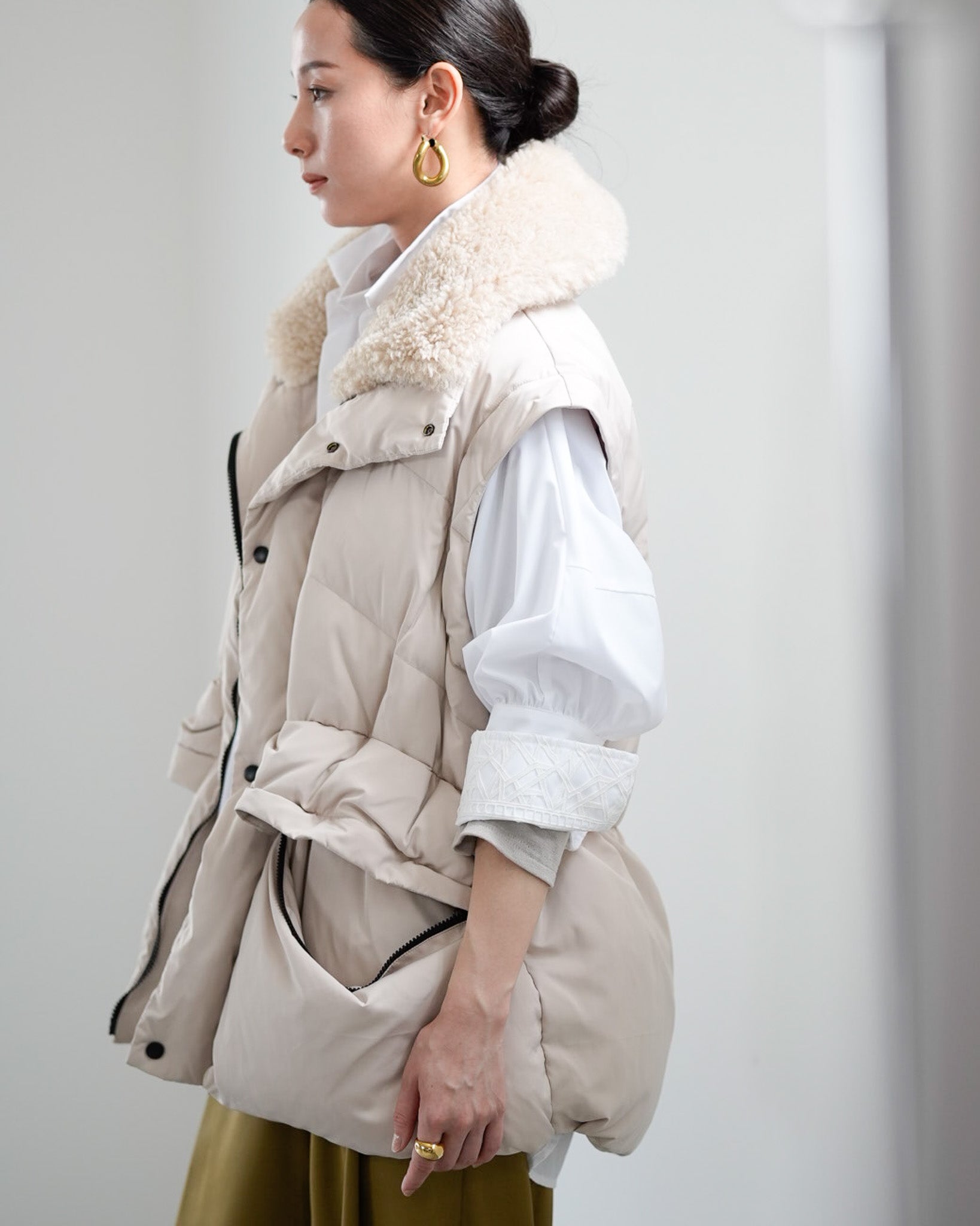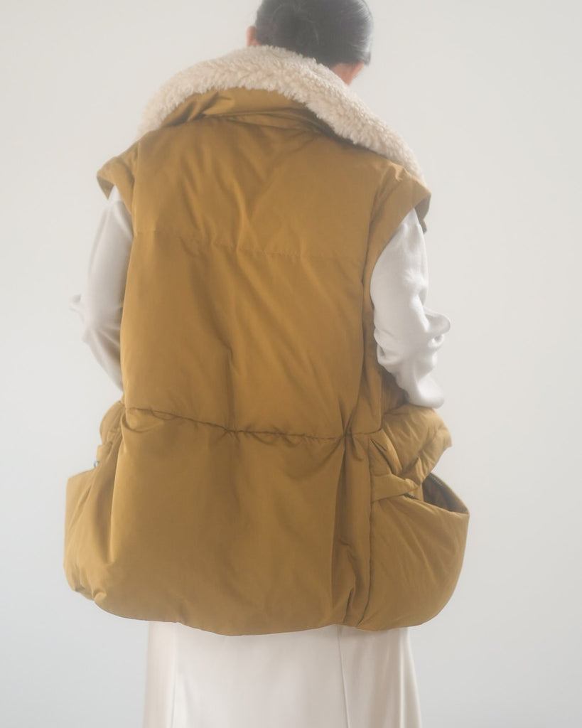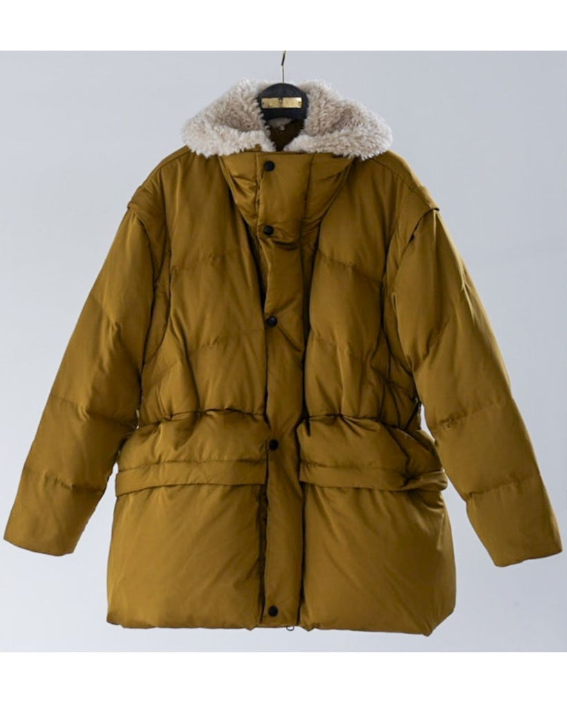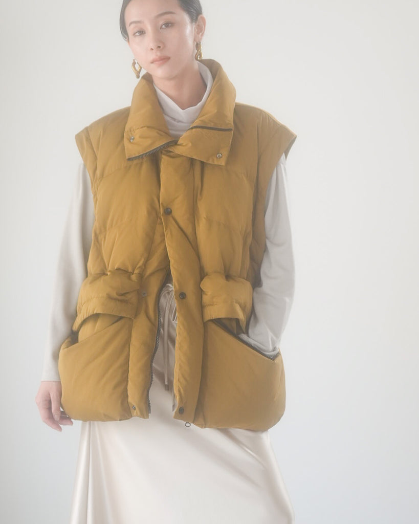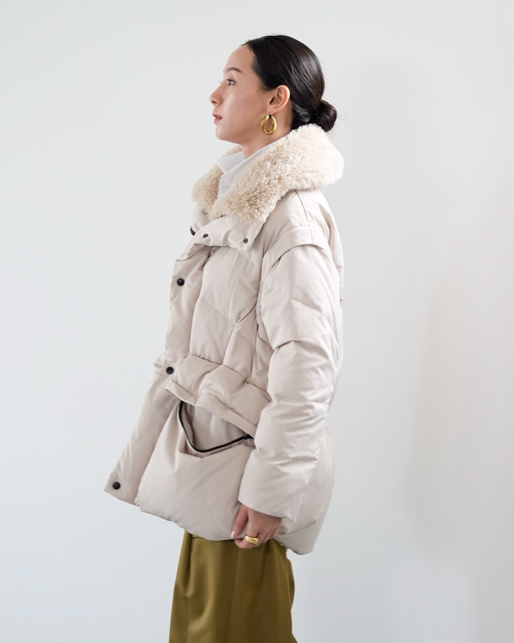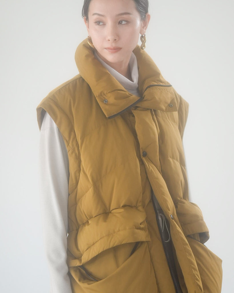 アームホールのファスナーで袖をセパレートできる2wayダウンジャケット。リアルダウンで防寒性はもちろん、モードなデザインでファッション性も高いラリアムーのダウンです。衿のムートン風エコファーは取り外し可能で、顔まわりに華やかさとあたたかさをもたらします。身頃は程よいハリ感のダウン量に調整し、肩やアーム周りのダウン量を少なくすることで気になる着膨れに配慮しました。(ダウンパック入)ポケット口のファスナーは開けて着用することもでき、スタイリッシュなムードを作ってくれます。腰がしっかり隠れる着丈で真冬も安心して着用できます。