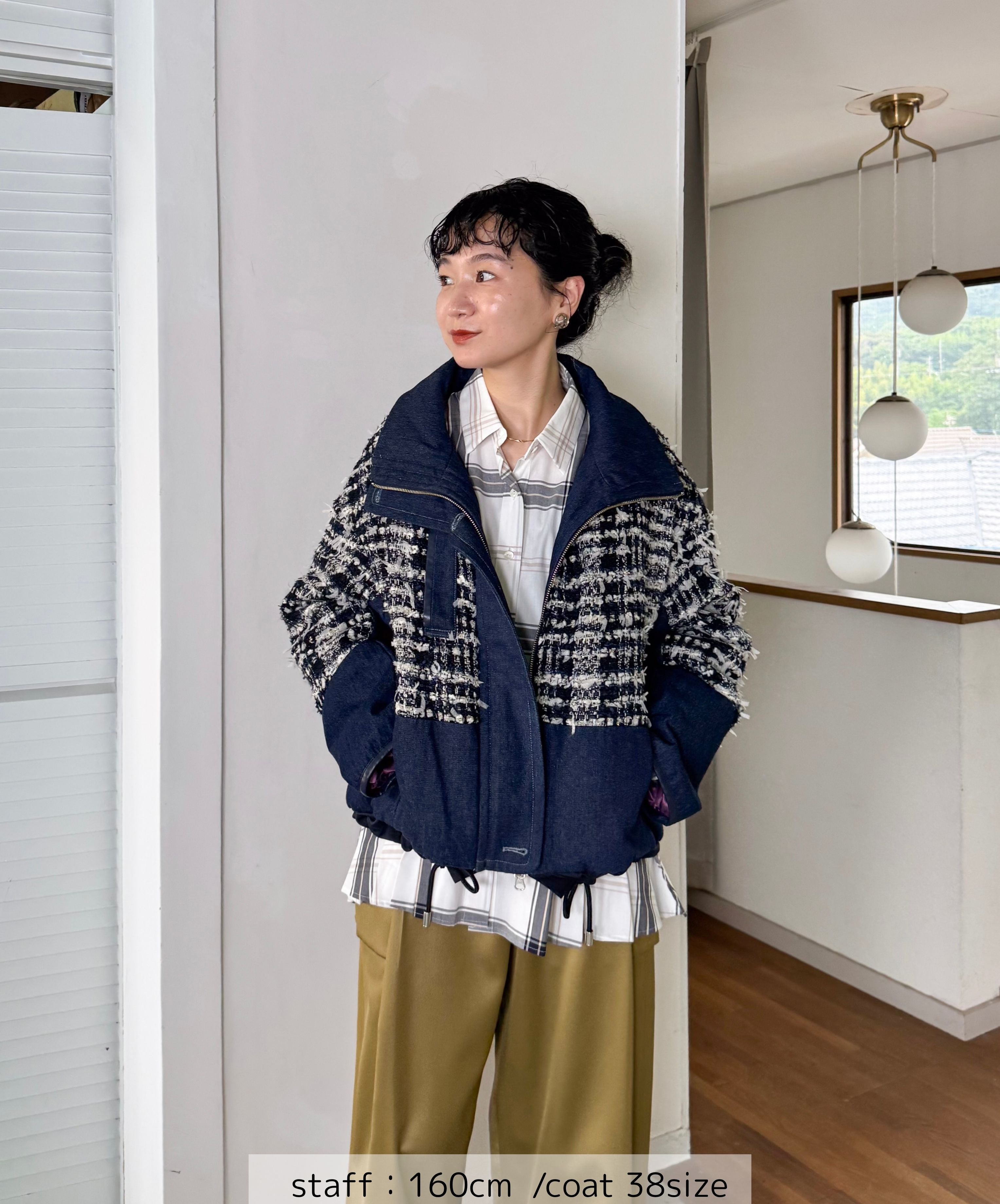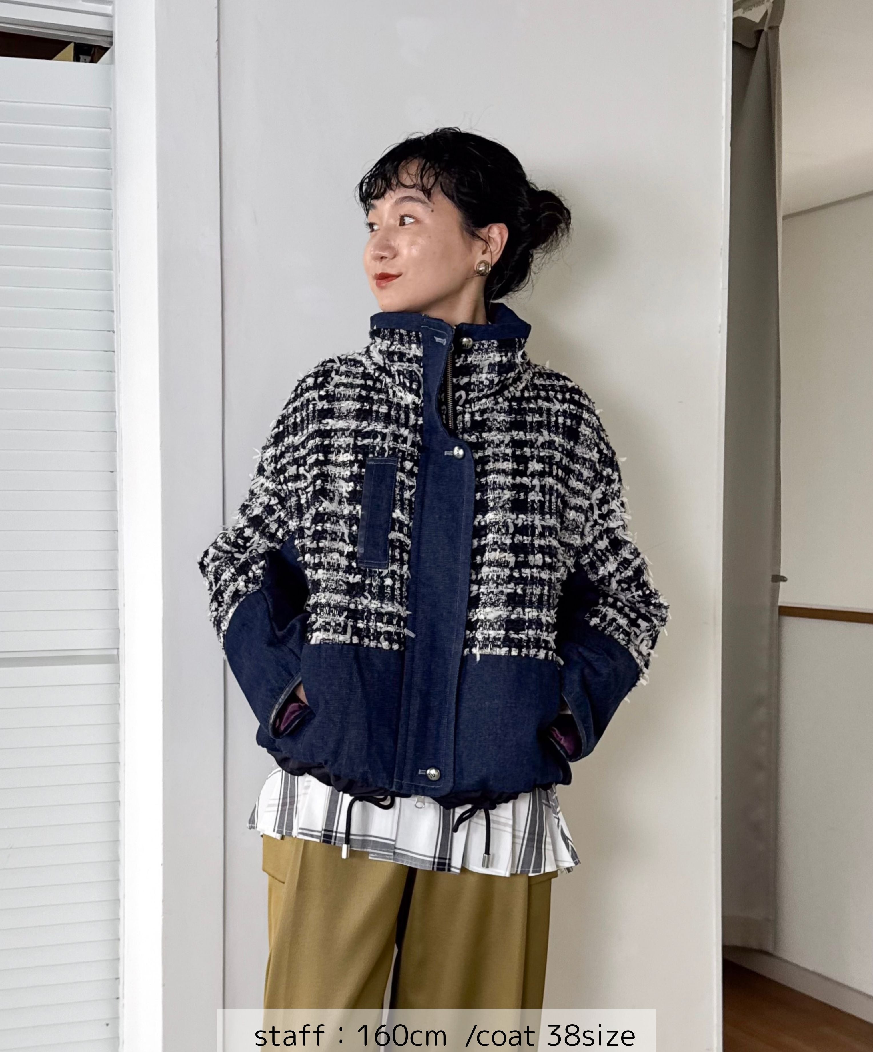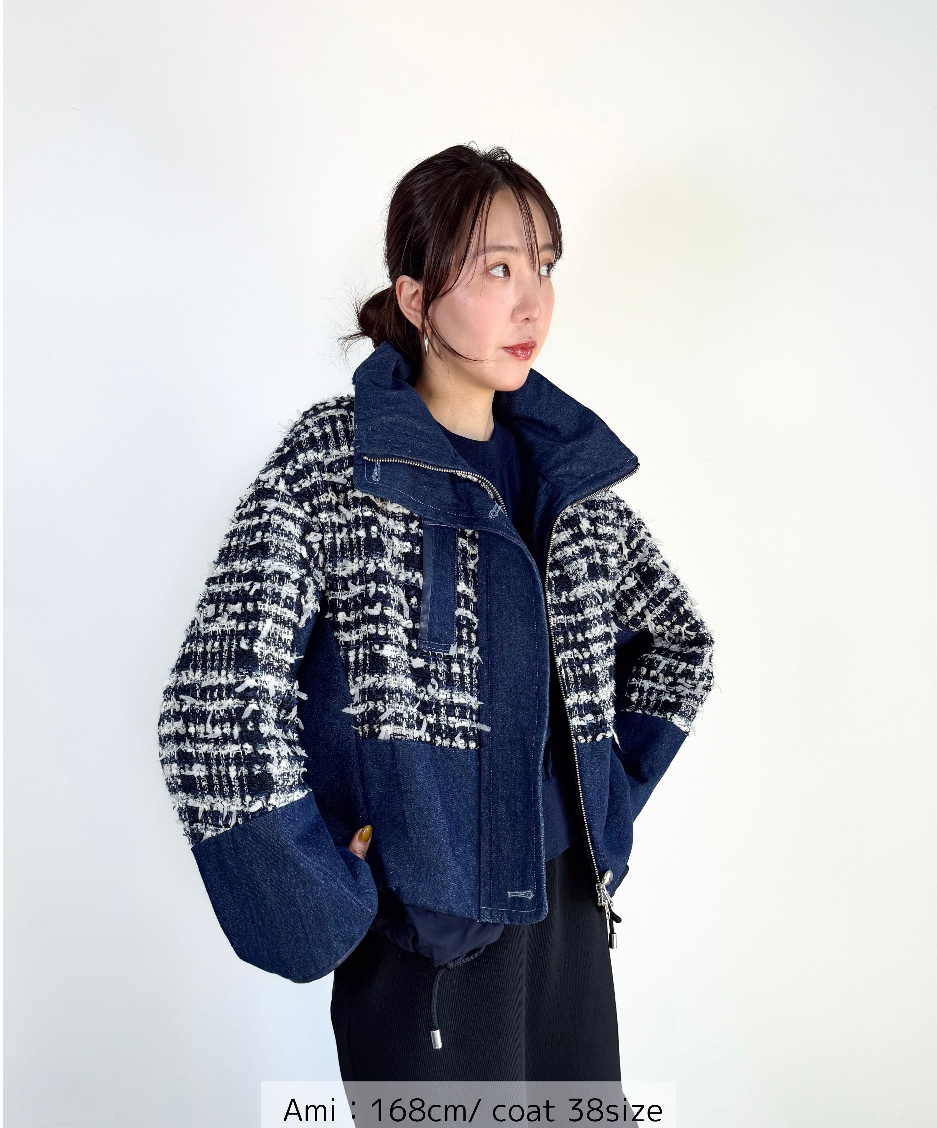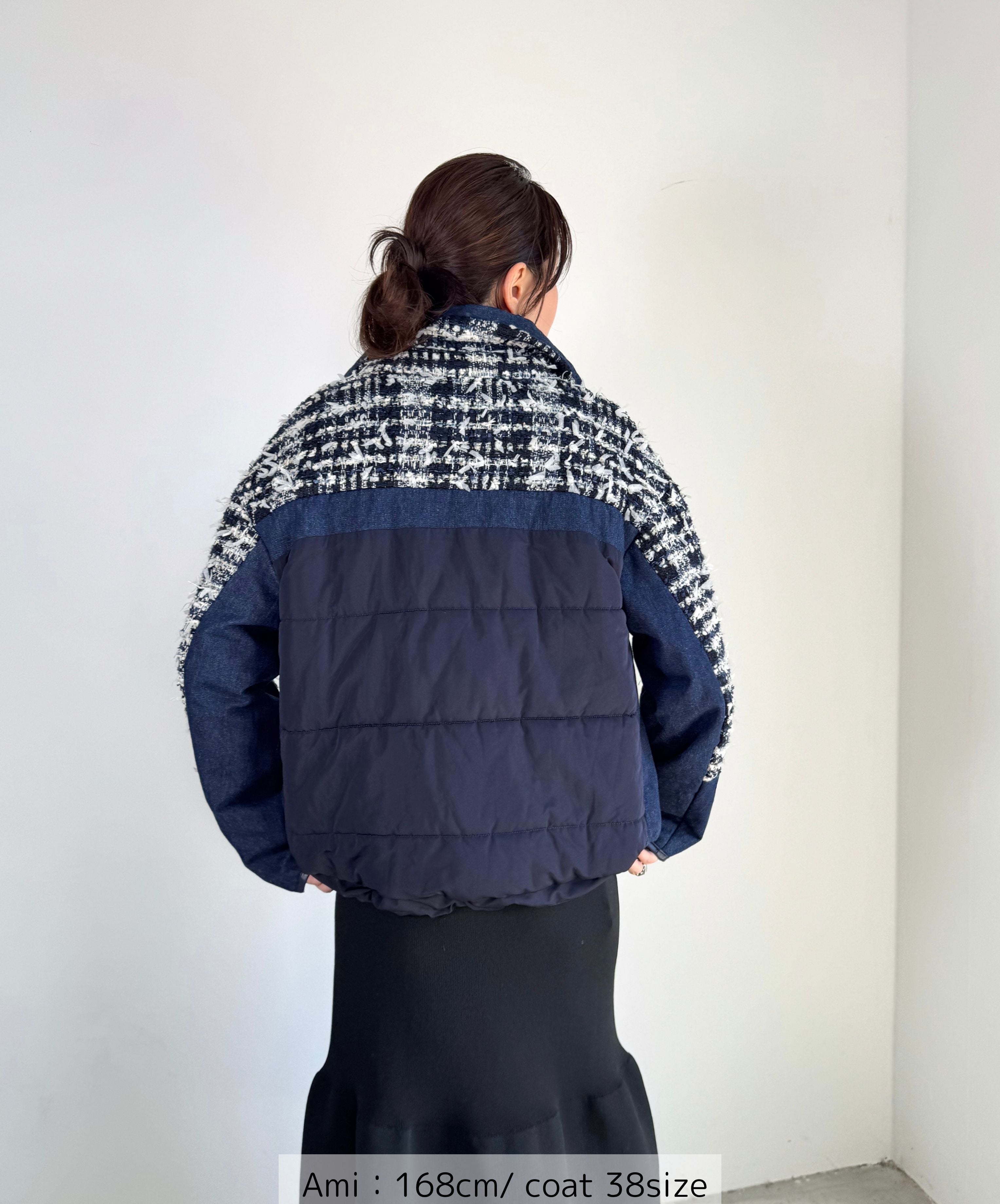 冬のコーディネートに新しい風を。ファンシーツイードとデニムをドッキングした中綿入りのコートジャケット。デニムのカジュアルさとツイードのエレガンスが絶妙に組み合わさり、どんなシーンでも活躍します。暖かく軽やかな着心地で、アクティブな日常にもぴったり。取り入れるだけでいつものスタイルを格上げしてくれる一着です。