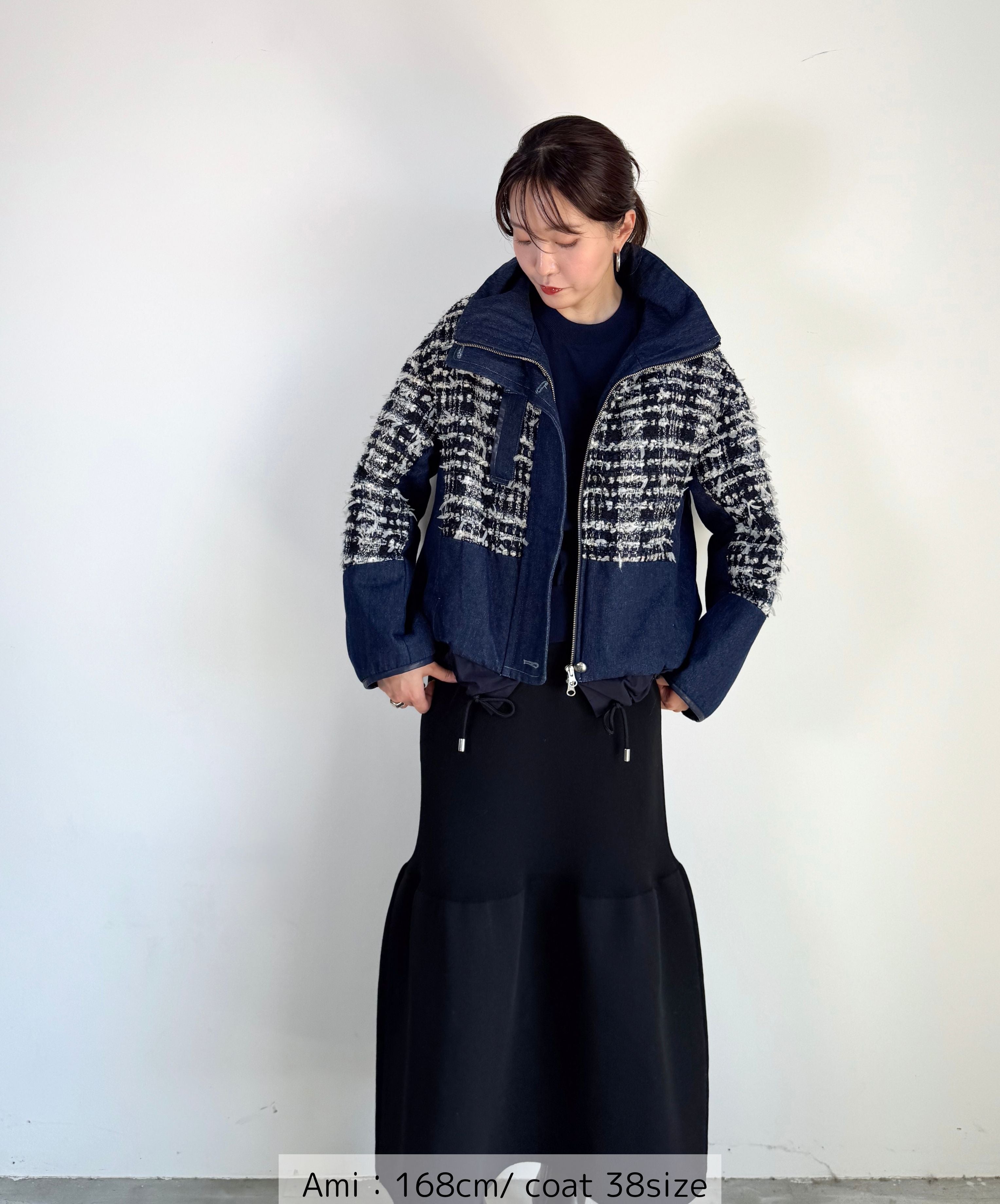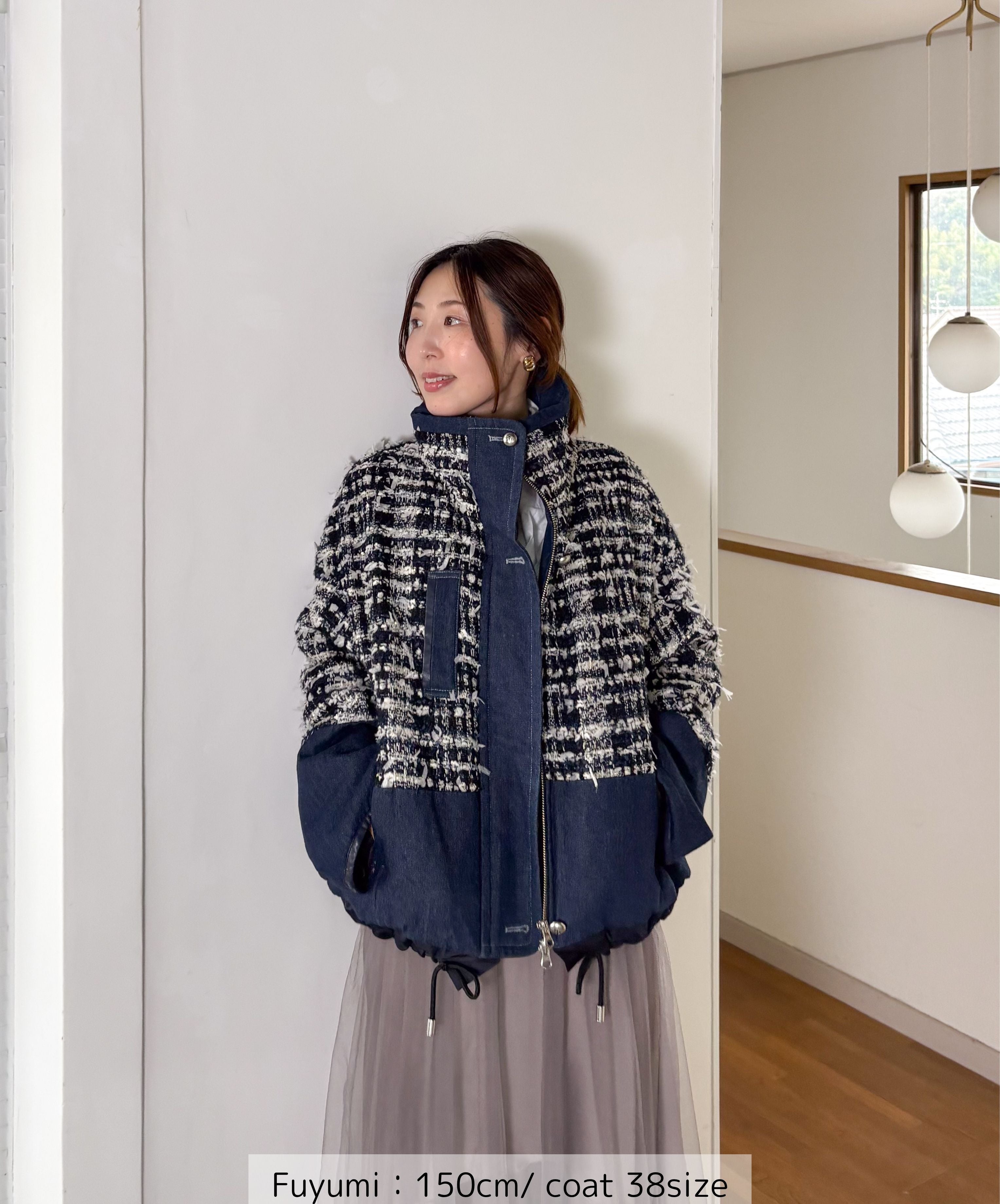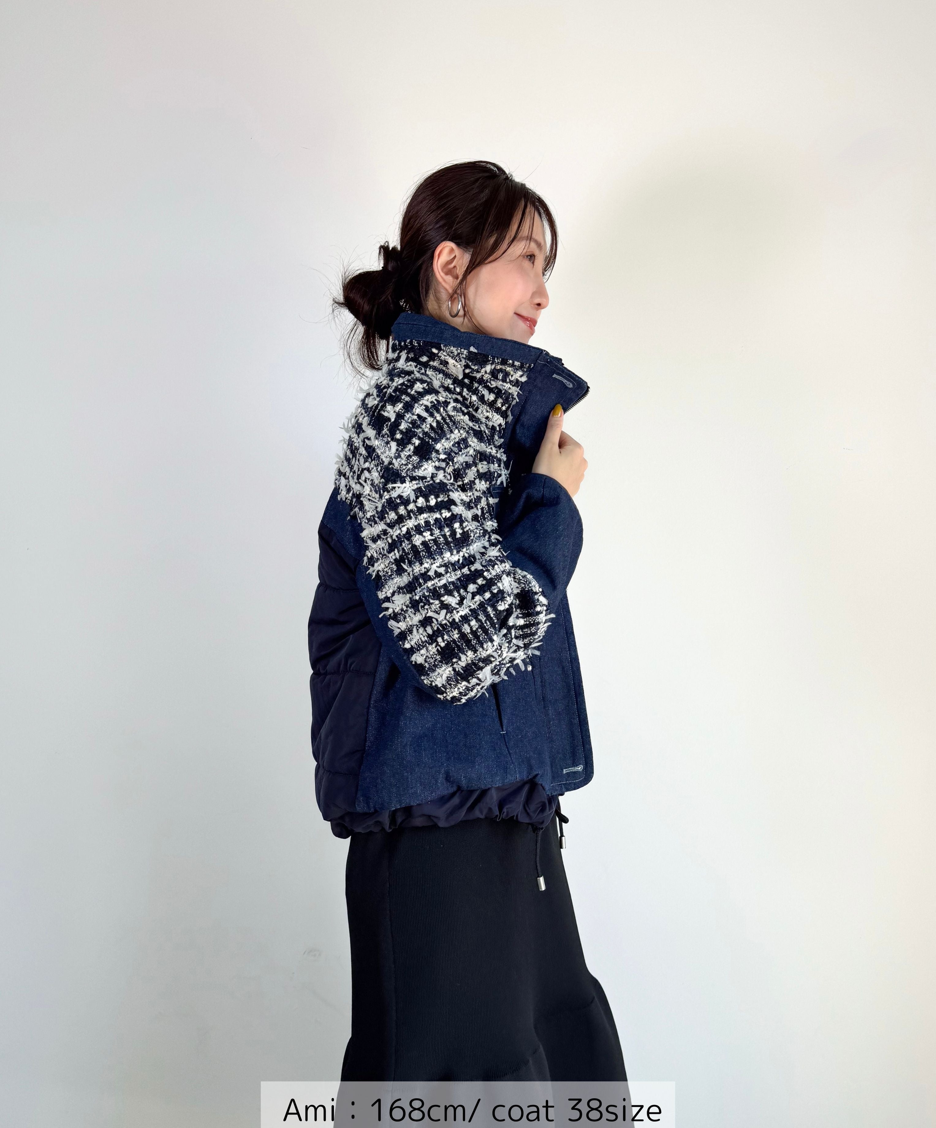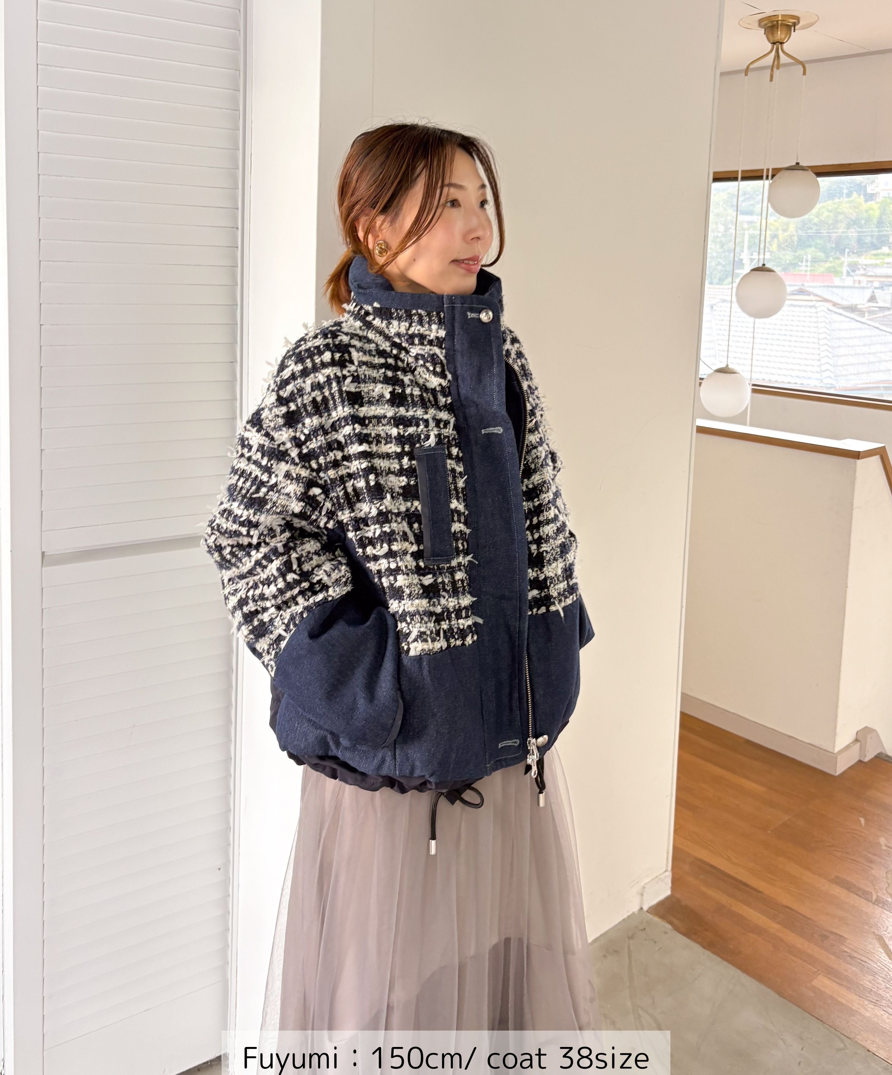 冬のコーディネートに新しい風を。ファンシーツイードとデニムをドッキングした中綿入りのコートジャケット。デニムのカジュアルさとツイードのエレガンスが絶妙に組み合わさり、どんなシーンでも活躍します。暖かく軽やかな着心地で、アクティブな日常にもぴったり。取り入れるだけでいつものスタイルを格上げしてくれる一着です。