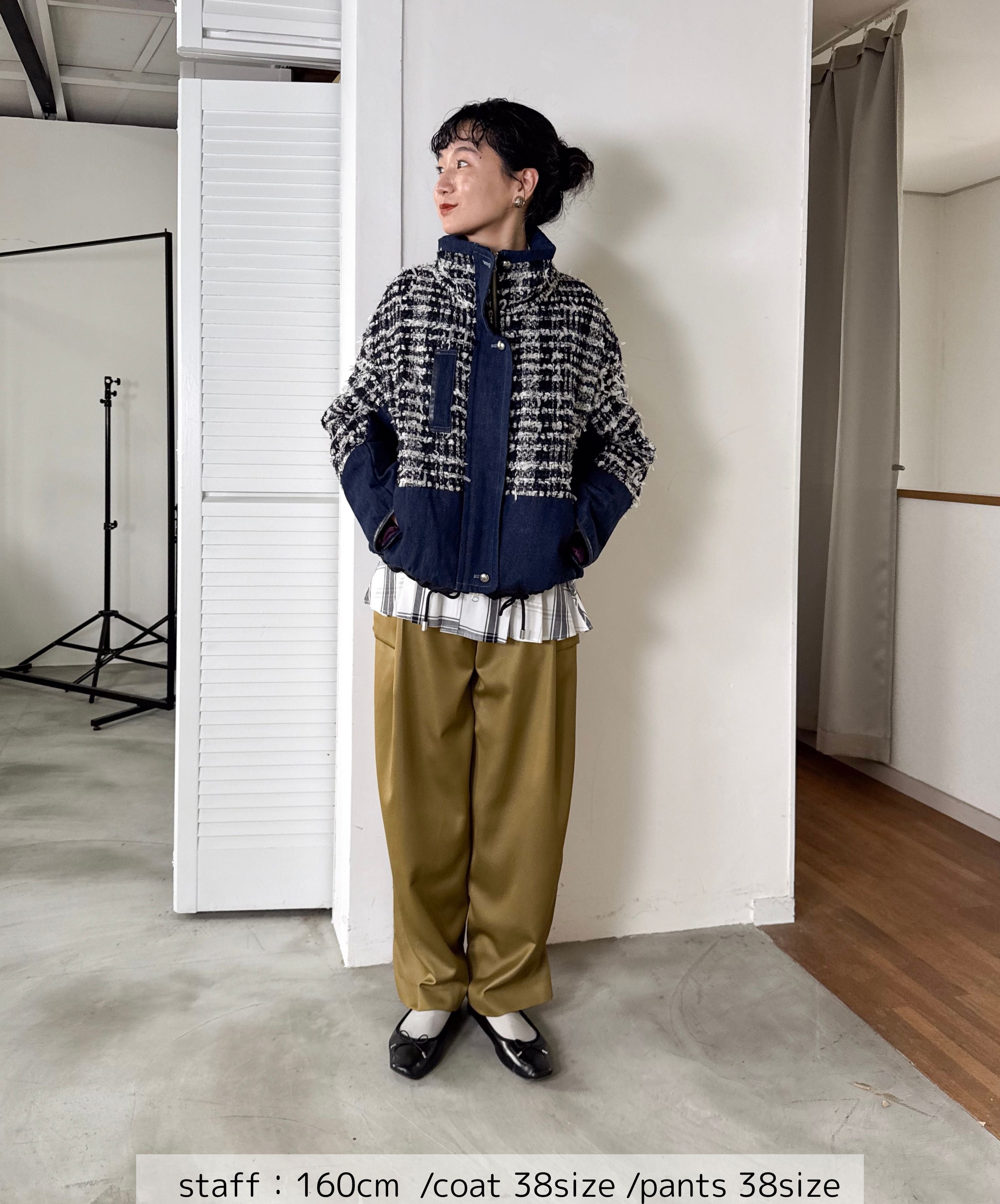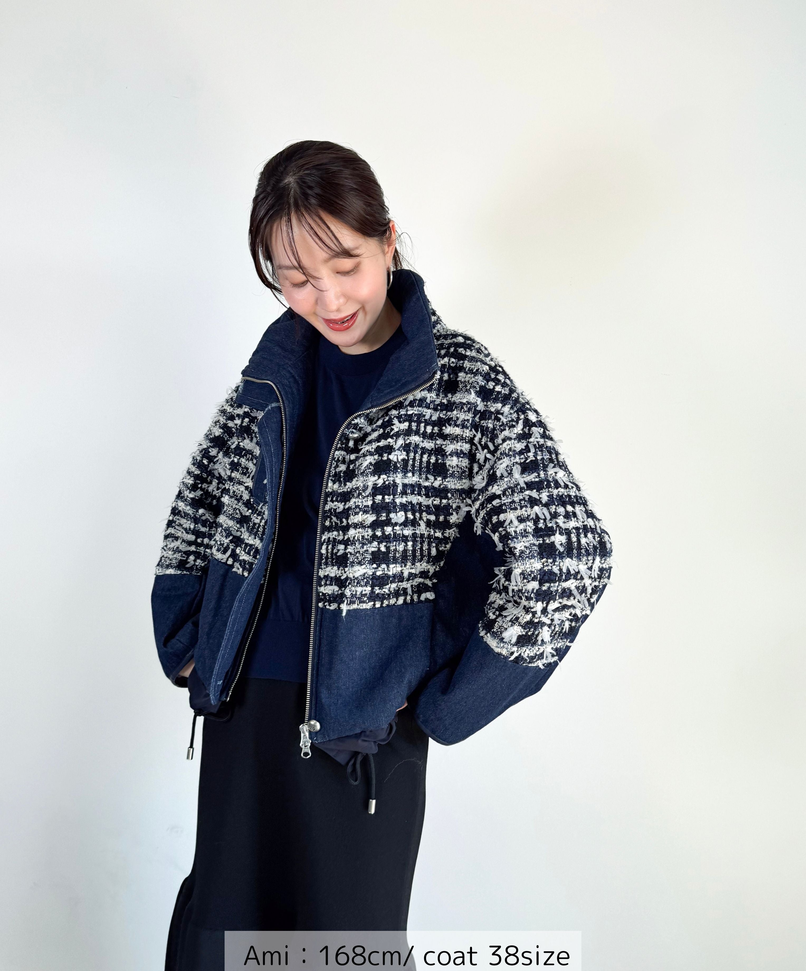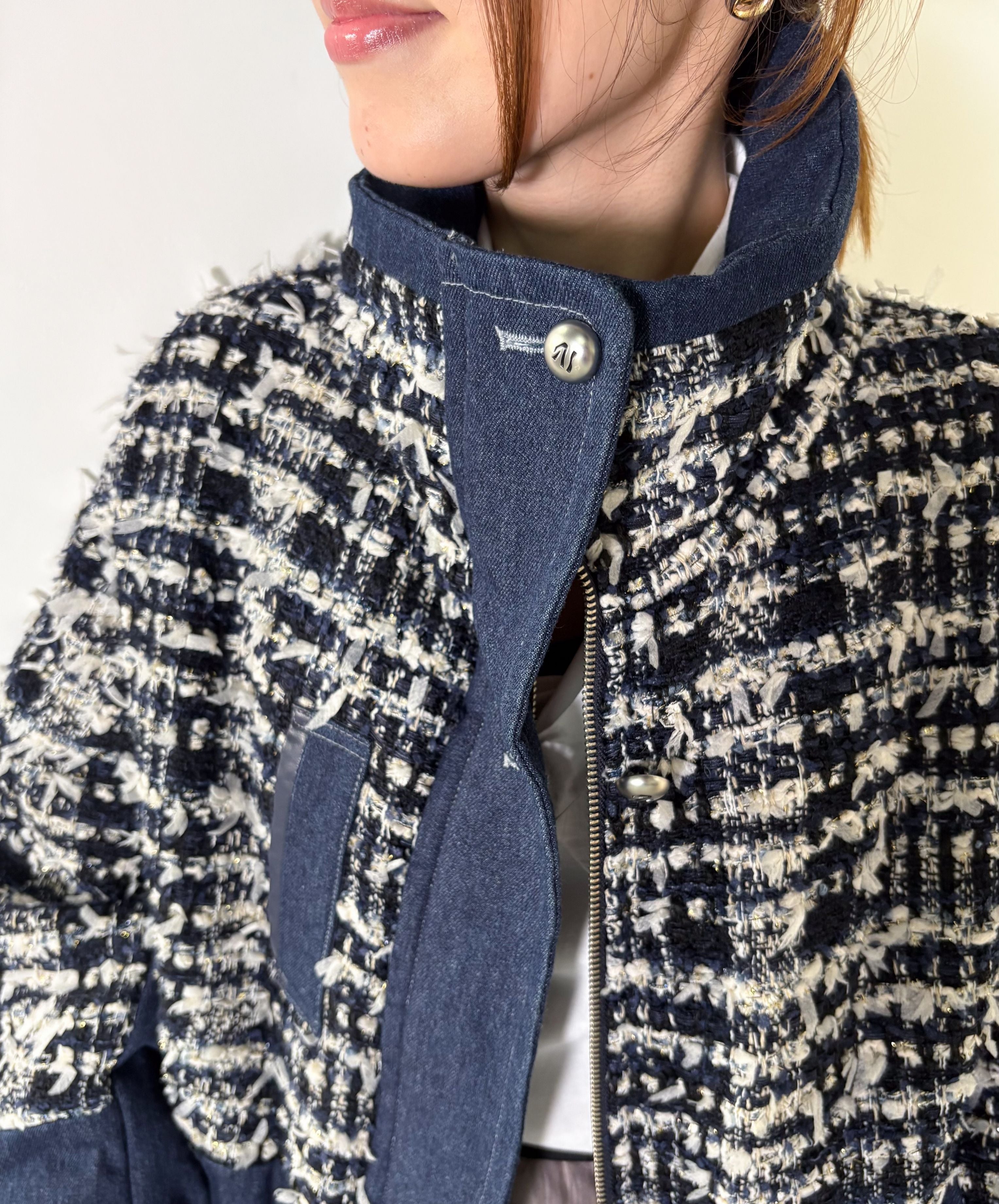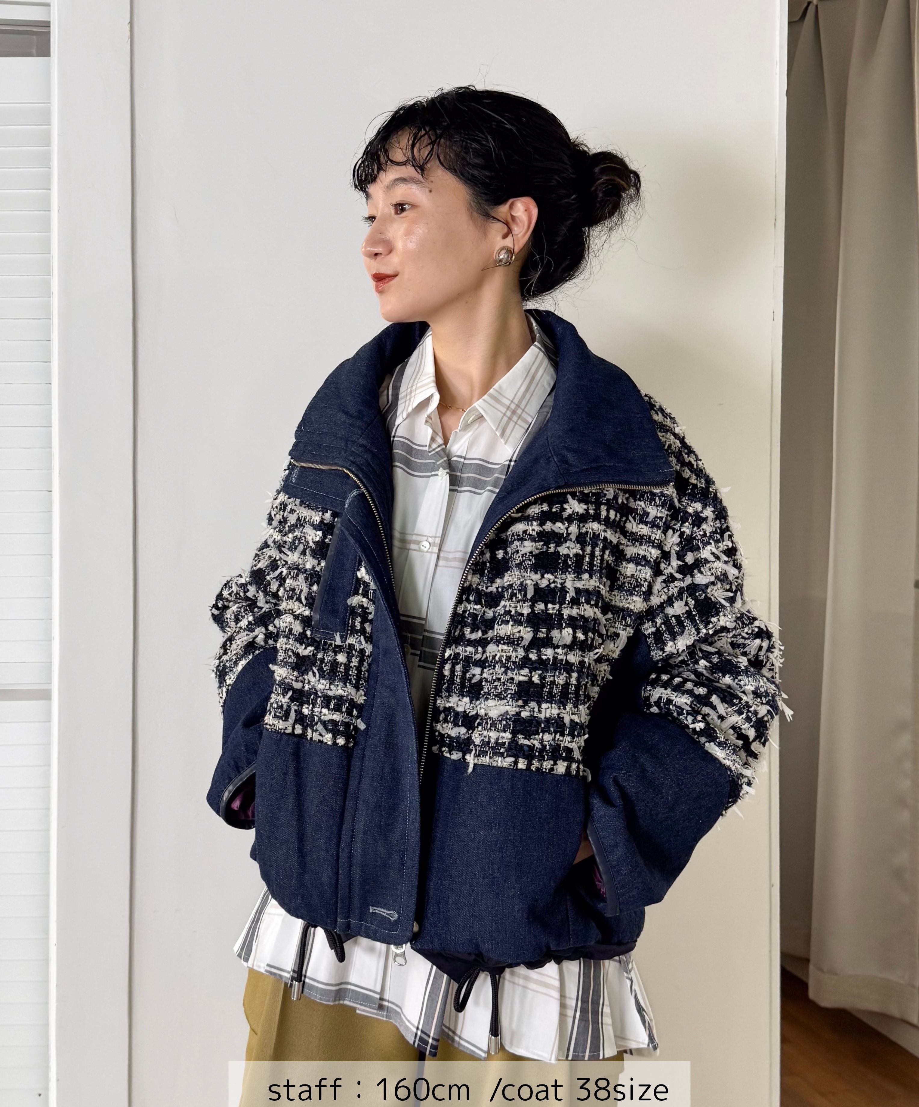 冬のコーディネートに新しい風を。ファンシーツイードとデニムをドッキングした中綿入りのコートジャケット。デニムのカジュアルさとツイードのエレガンスが絶妙に組み合わさり、どんなシーンでも活躍します。暖かく軽やかな着心地で、アクティブな日常にもぴったり。取り入れるだけでいつものスタイルを格上げしてくれる一着です。