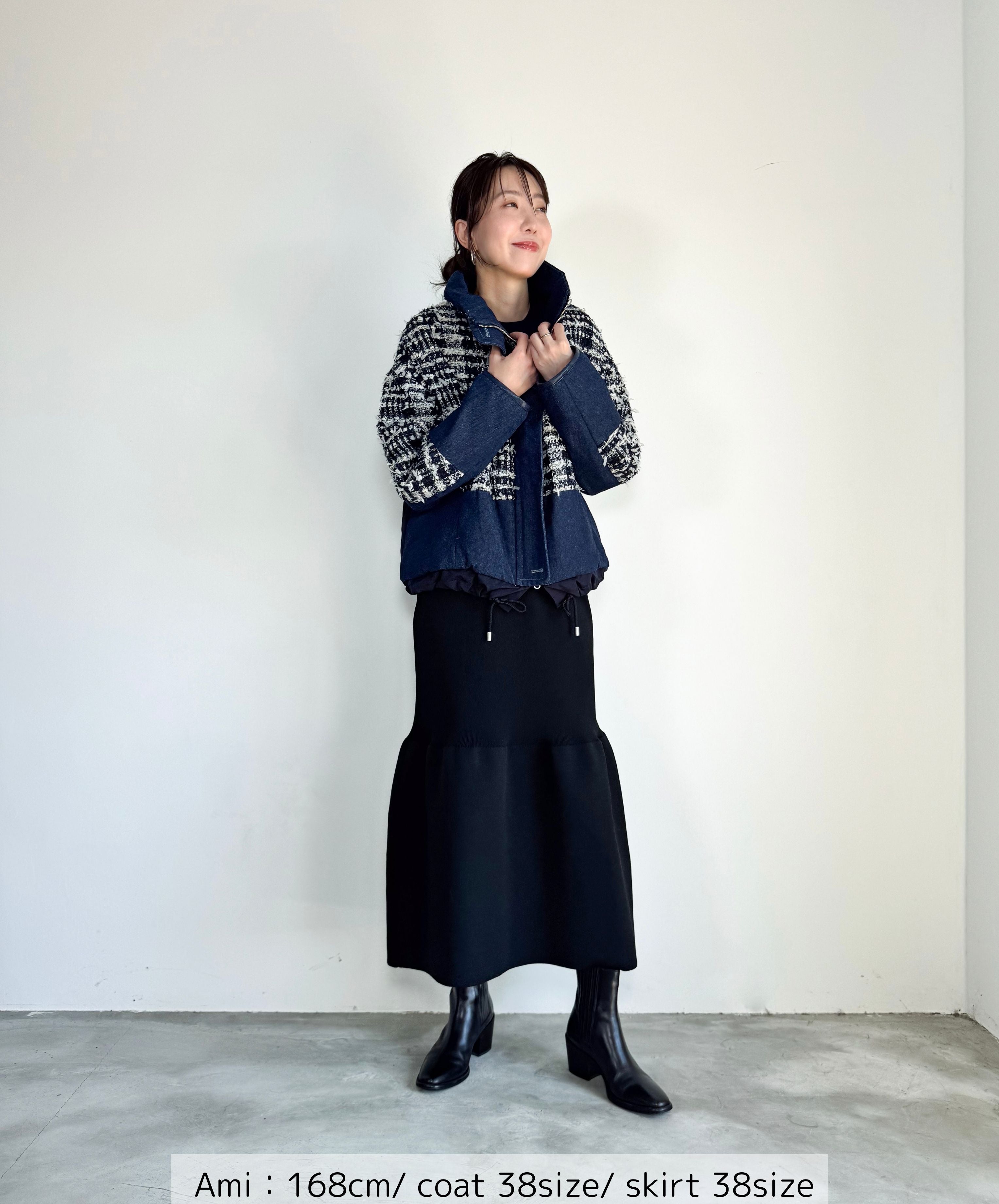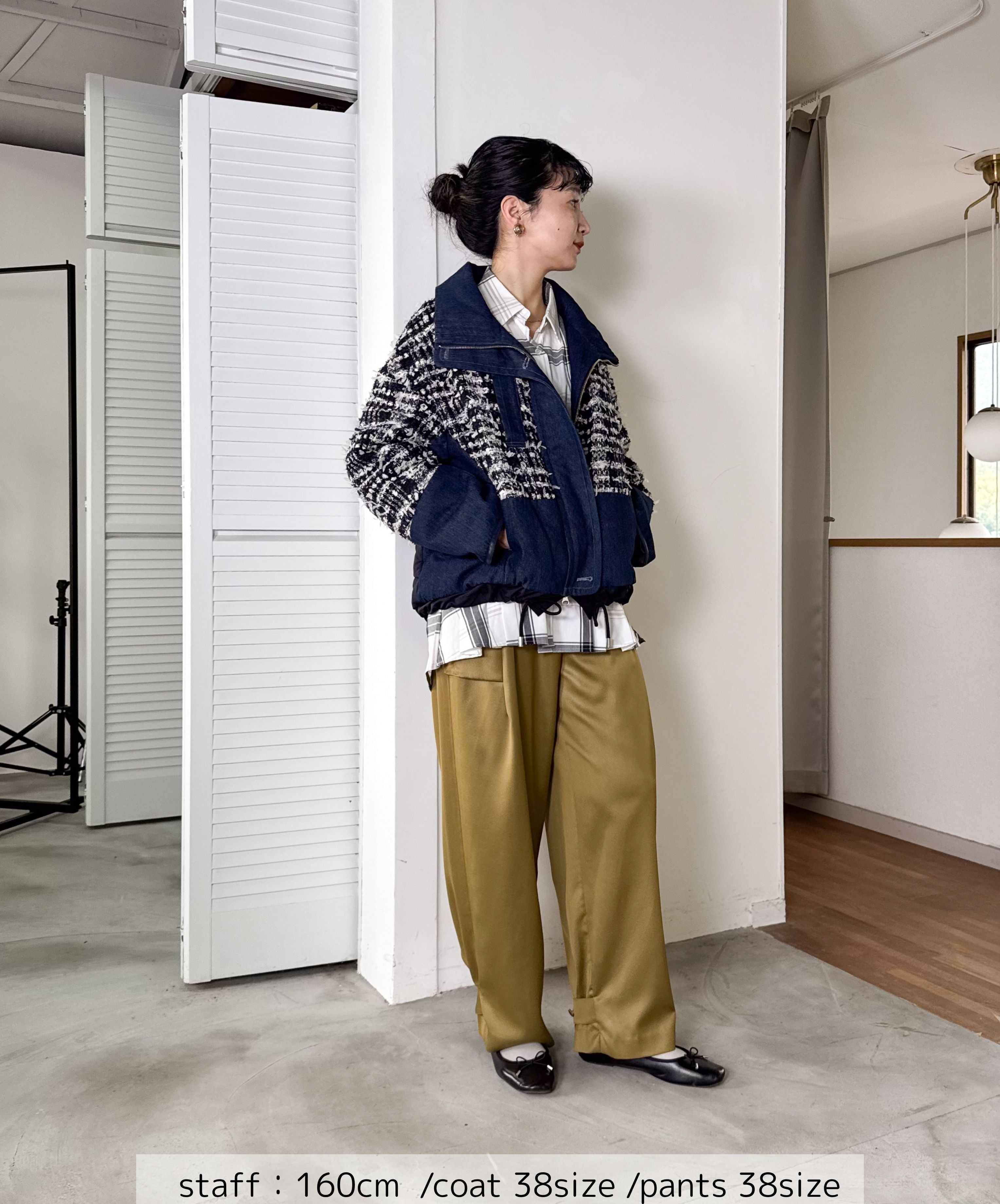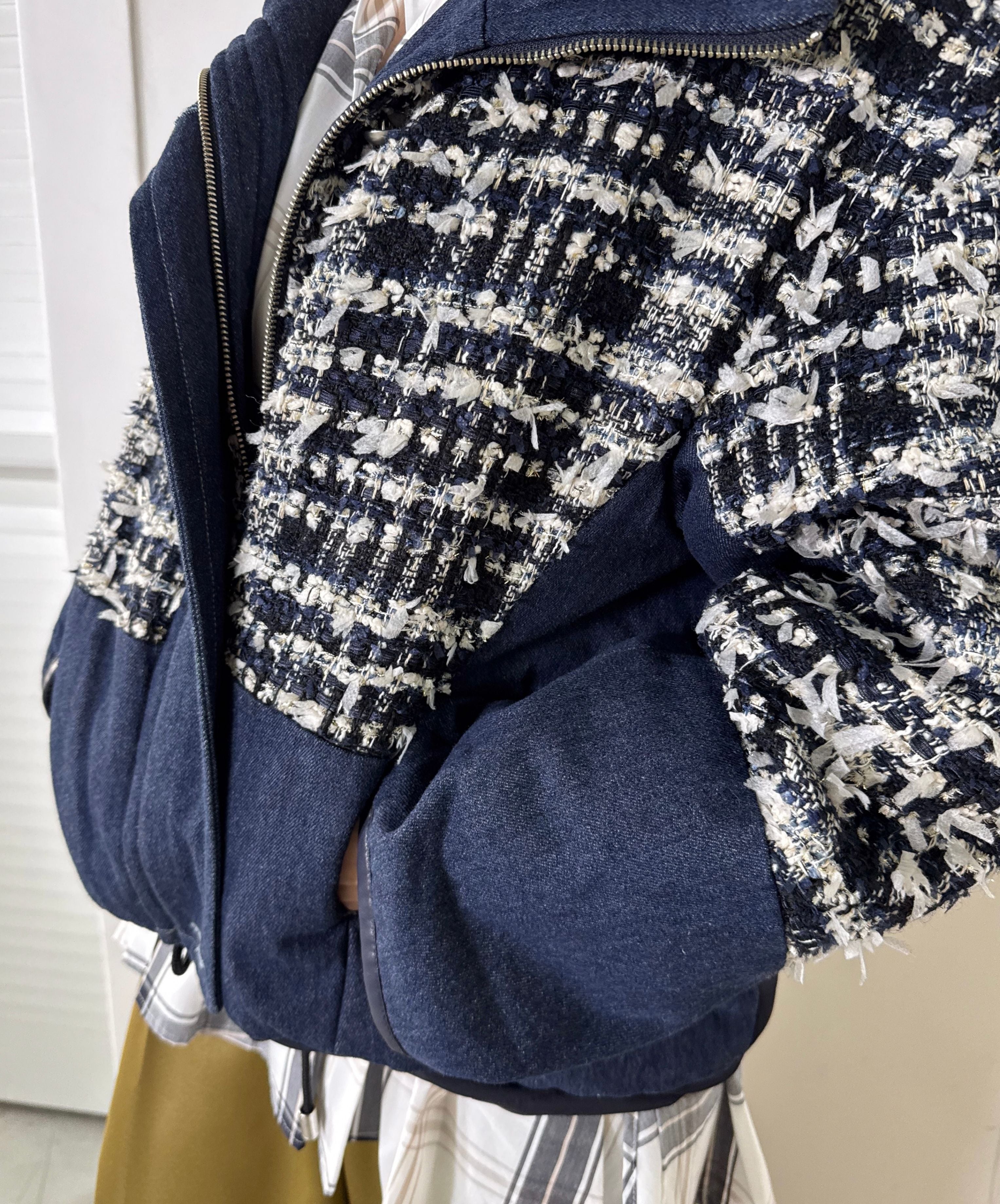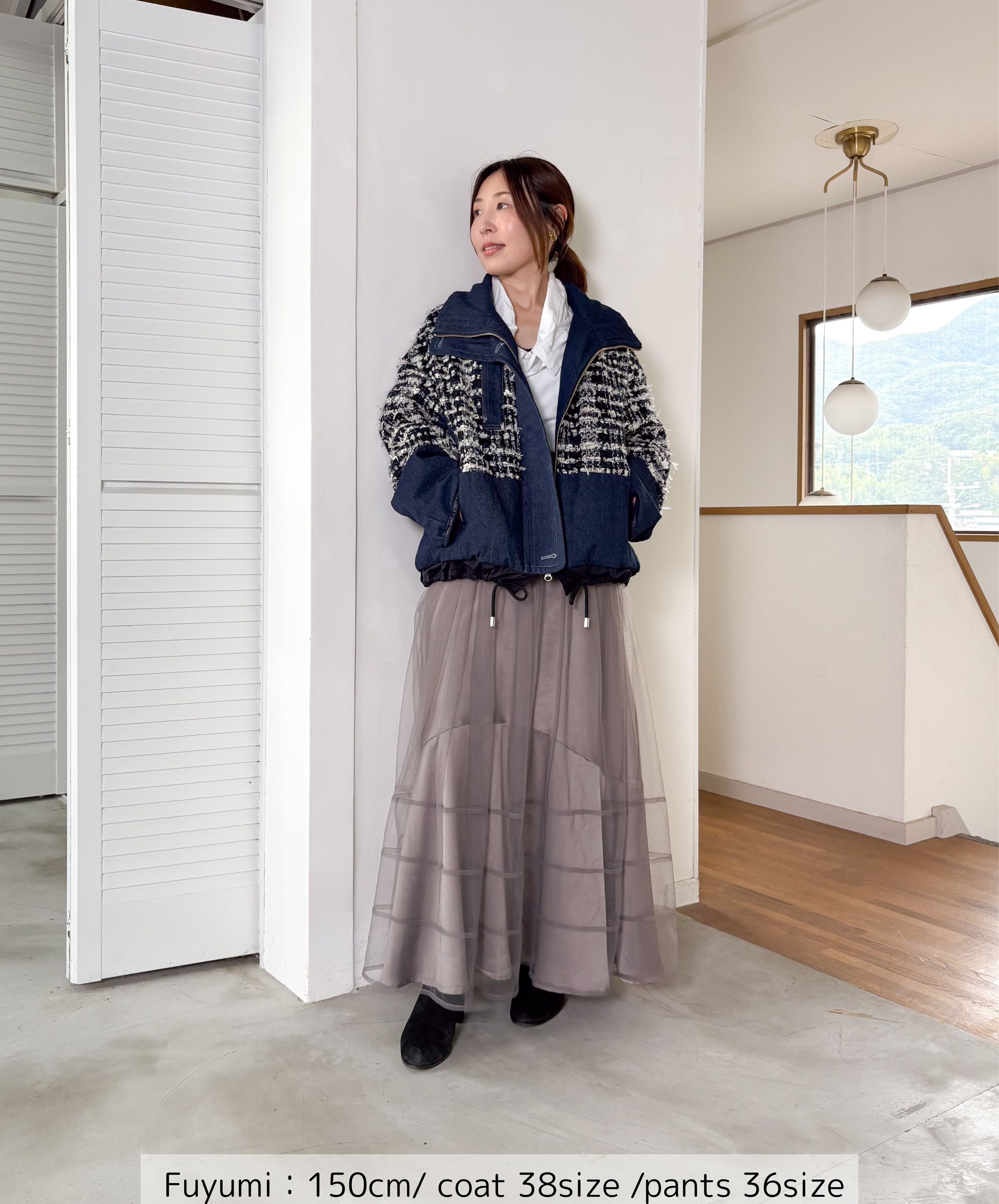 冬のコーディネートに新しい風を。ファンシーツイードとデニムをドッキングした中綿入りのコートジャケット。デニムのカジュアルさとツイードのエレガンスが絶妙に組み合わさり、どんなシーンでも活躍します。暖かく軽やかな着心地で、アクティブな日常にもぴったり。取り入れるだけでいつものスタイルを格上げしてくれる一着です。