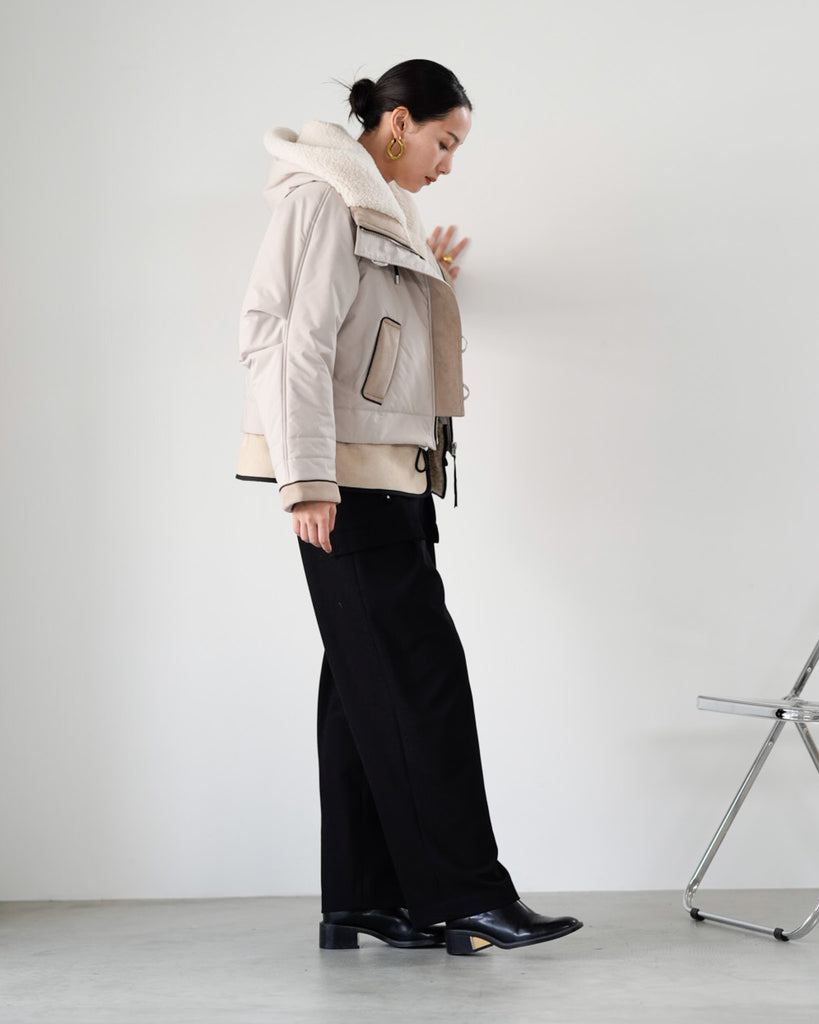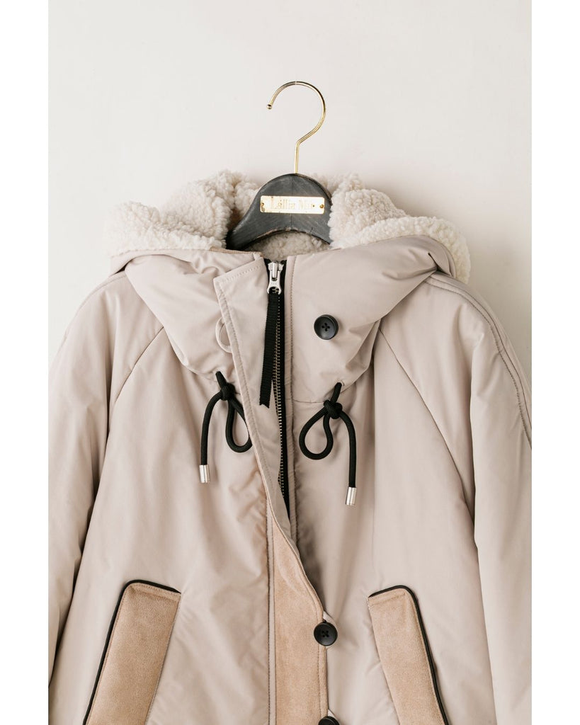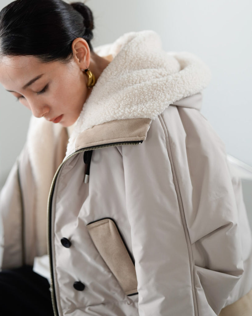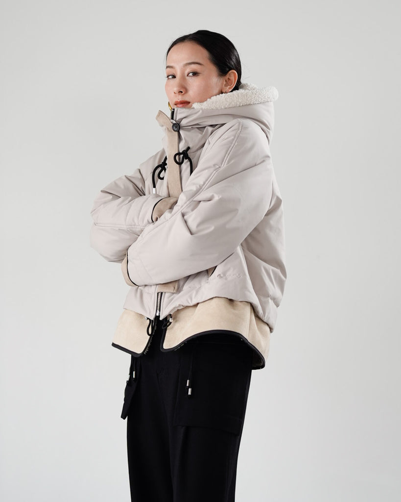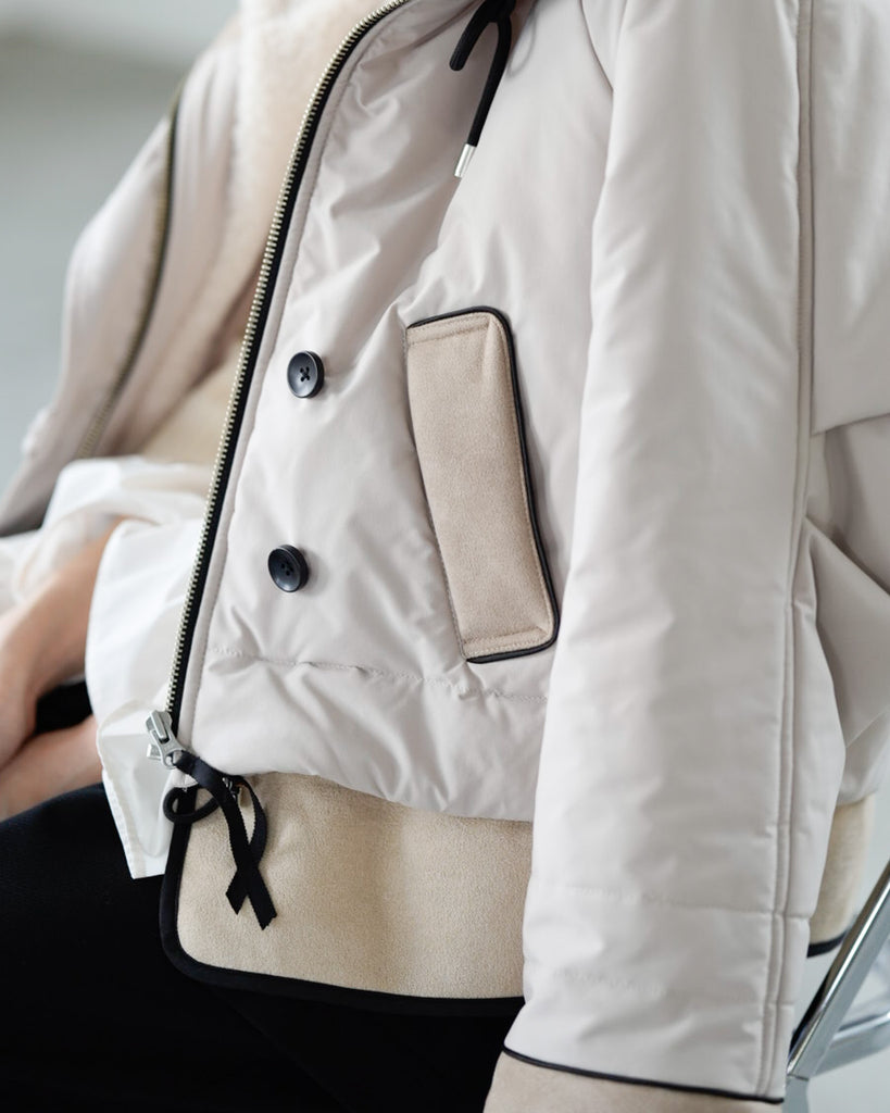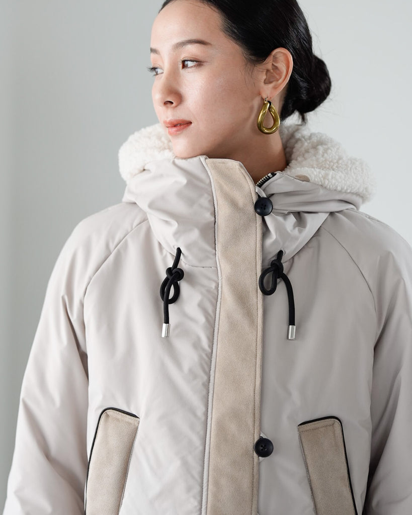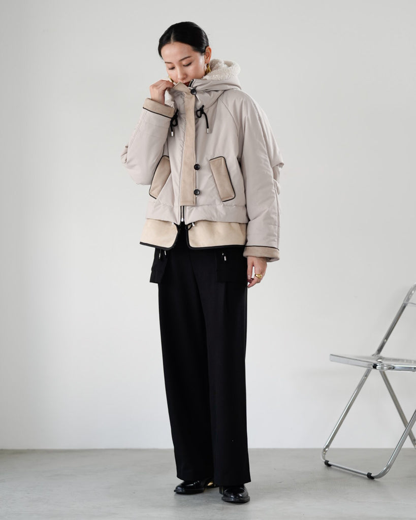 裾にバイカラースエードをドッキングしたアイコニックなデザインのラリアムーらしいフードコート。中綿入りで軽く、腰が隠れる着丈で冬も暖かく着用できます。カジュアルな表情で、気軽に羽織りやすいショート丈コートは、どんなスタイルにもマッチし、デイリーユースからお出かけまで、大人の日常の幅広いシーンで活躍する一着です。