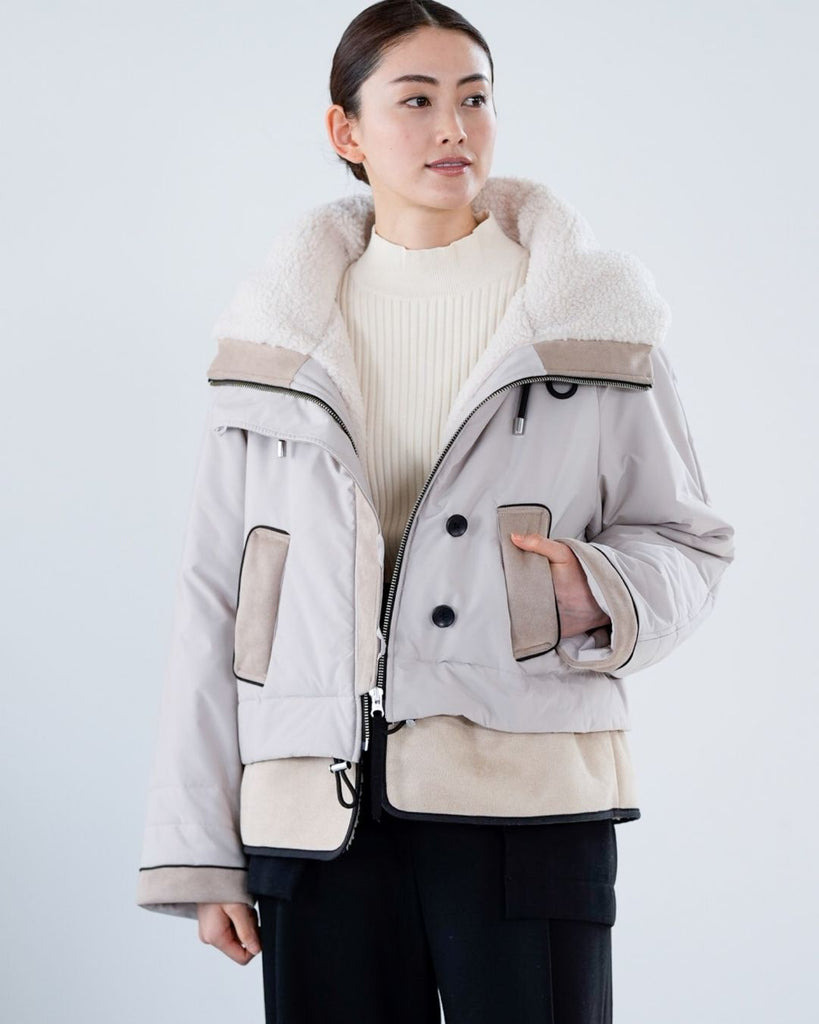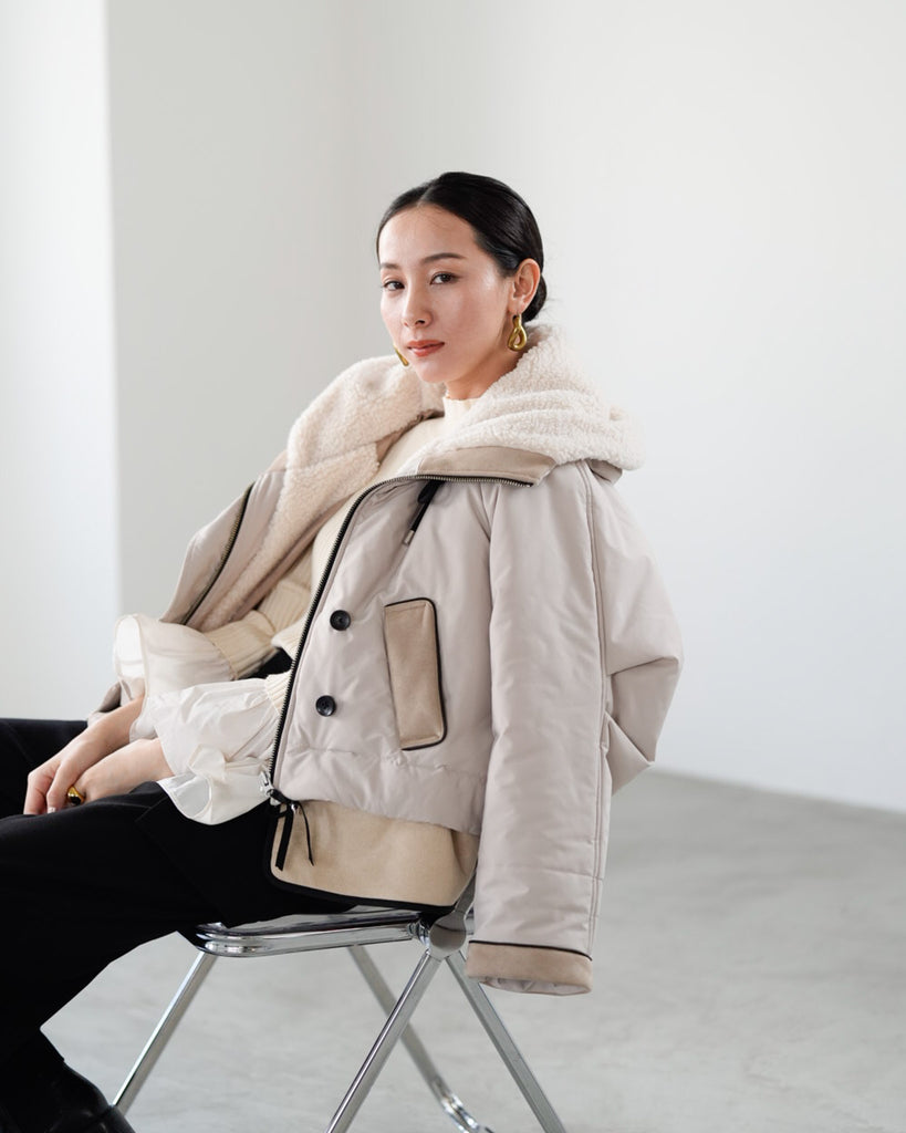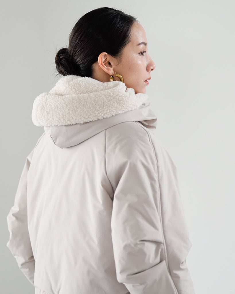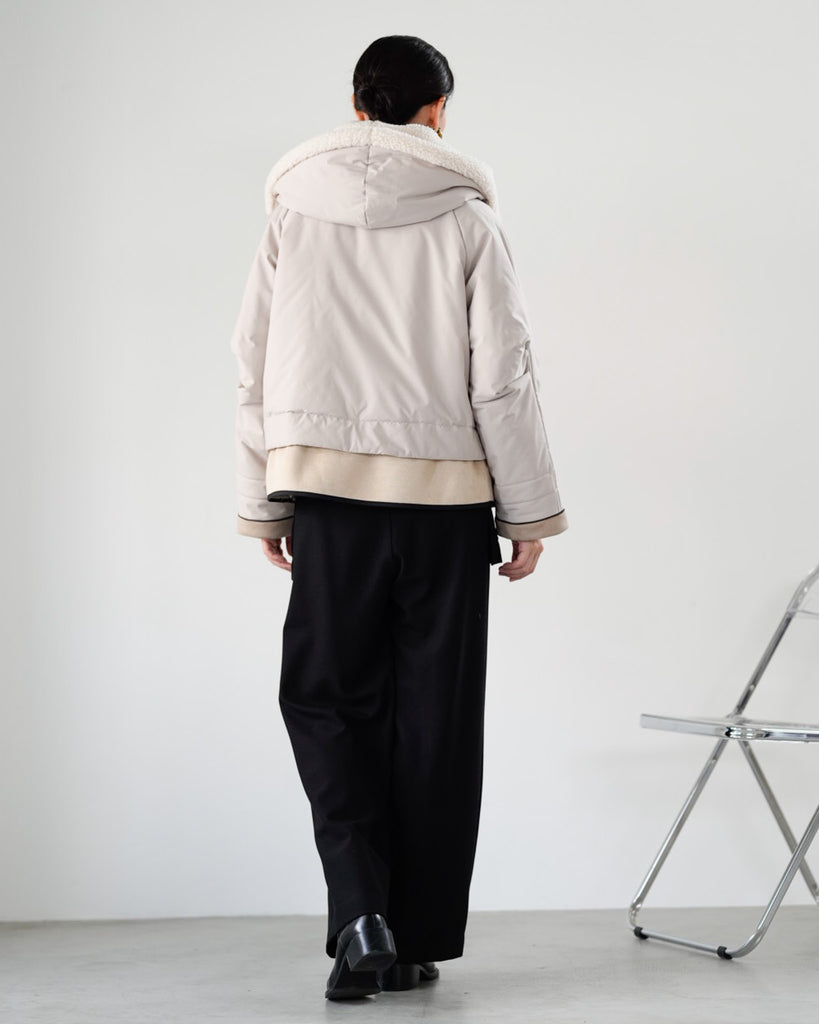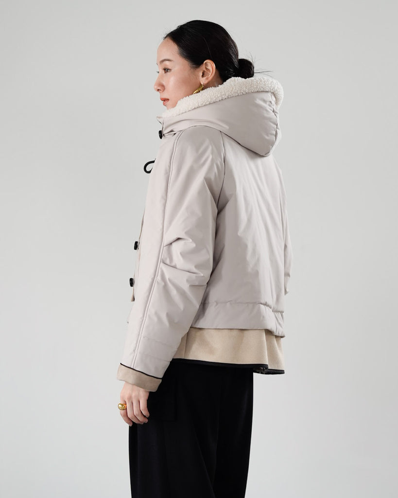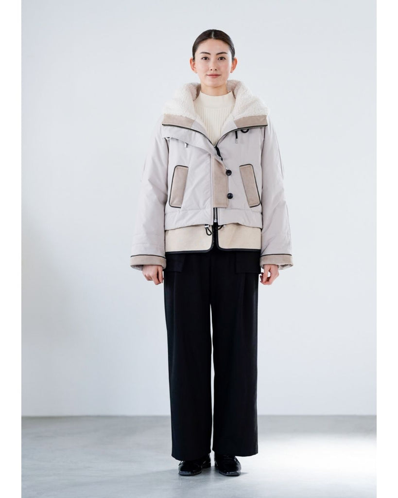 裾にバイカラースエードをドッキングしたアイコニックなデザインのラリアムーらしいフードコート。中綿入りで軽く、腰が隠れる着丈で冬も暖かく着用できます。カジュアルな表情で、気軽に羽織りやすいショート丈コートは、どんなスタイルにもマッチし、デイリーユースからお出かけまで、大人の日常の幅広いシーンで活躍する一着です。