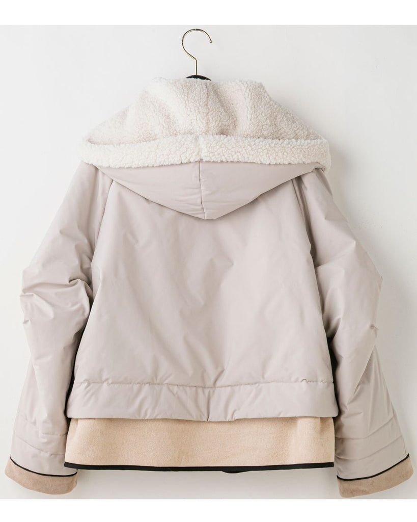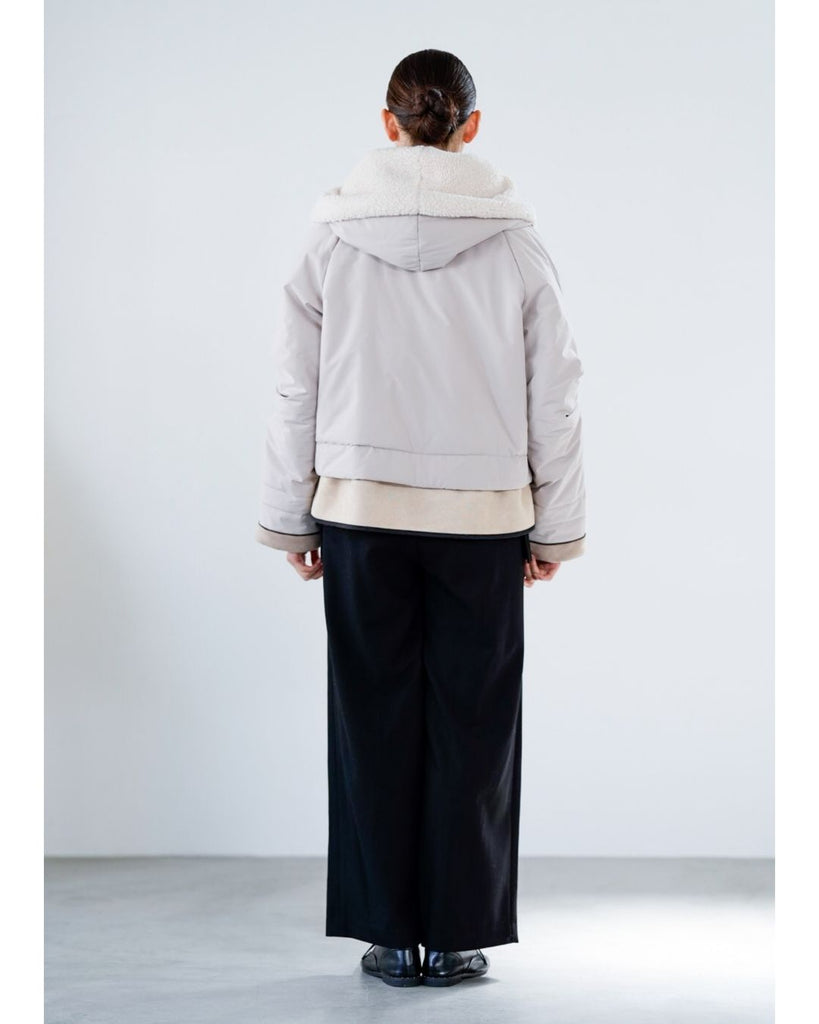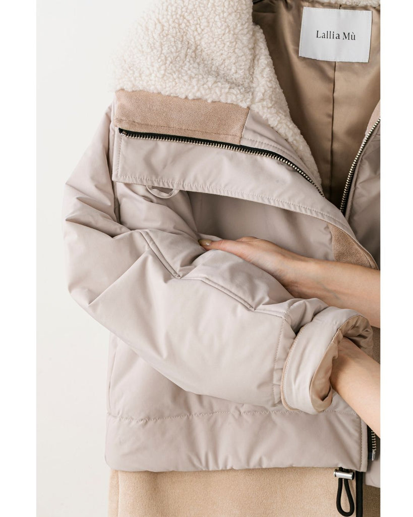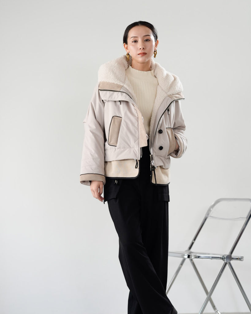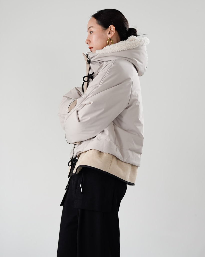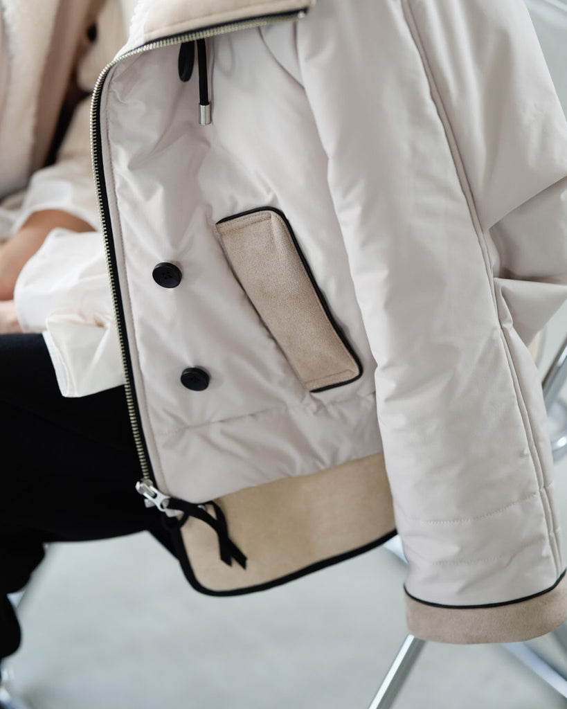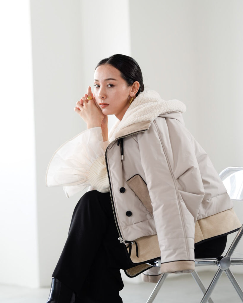裾にバイカラースエードをドッキングしたアイコニックなデザインのラリアムーらしいフードコート。中綿入りで軽く、腰が隠れる着丈で冬も暖かく着用できます。カジュアルな表情で、気軽に羽織りやすいショート丈コートは、どんなスタイルにもマッチし、デイリーユースからお出かけまで、大人の日常の幅広いシーンで活躍する一着です。
