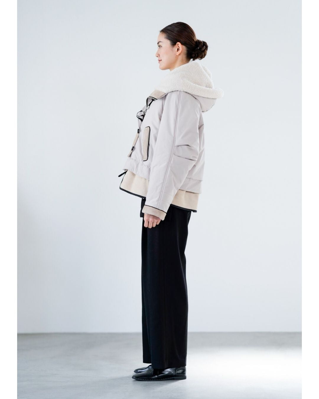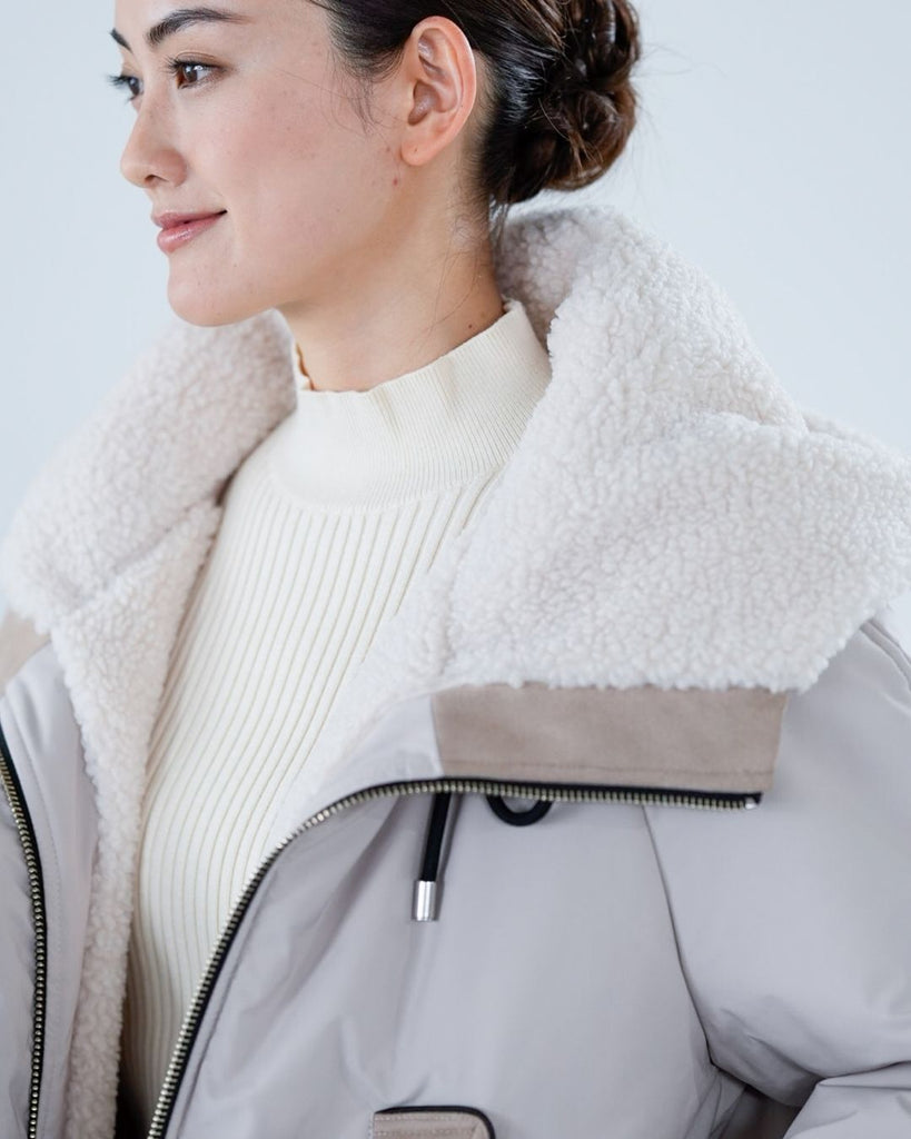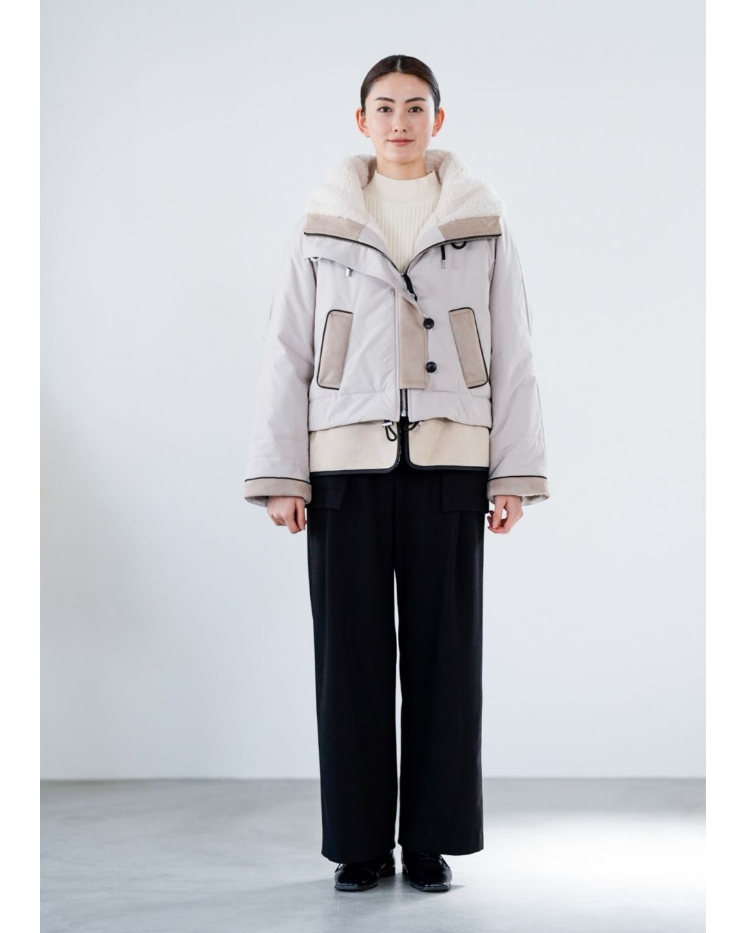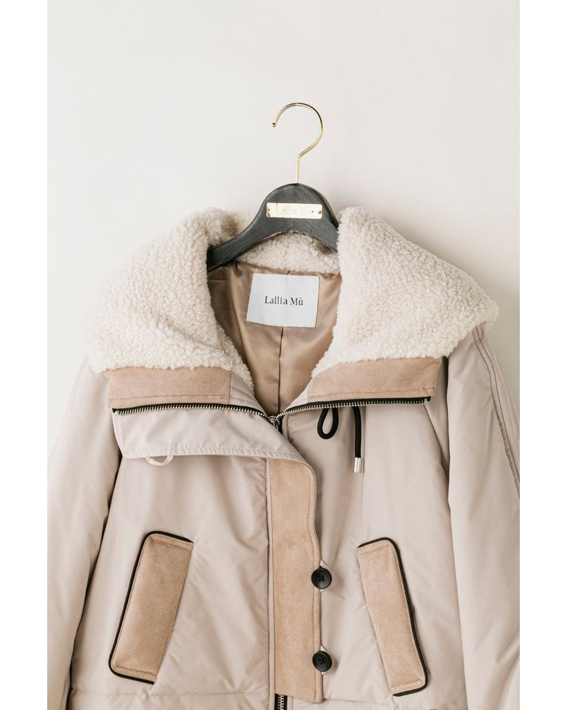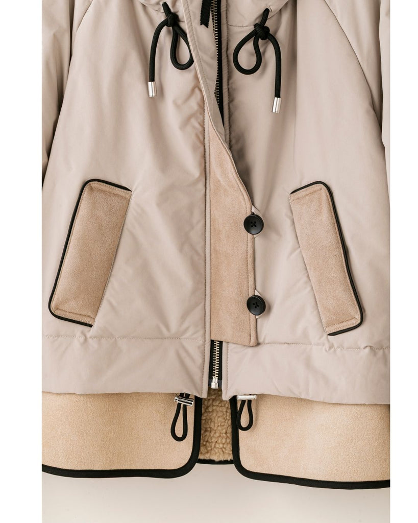 裾にバイカラースエードをドッキングしたアイコニックなデザインのラリアムーらしいフードコート。中綿入りで軽く、腰が隠れる着丈で冬も暖かく着用できます。カジュアルな表情で、気軽に羽織りやすいショート丈コートは、どんなスタイルにもマッチし、デイリーユースからお出かけまで、大人の日常の幅広いシーンで活躍する一着です。