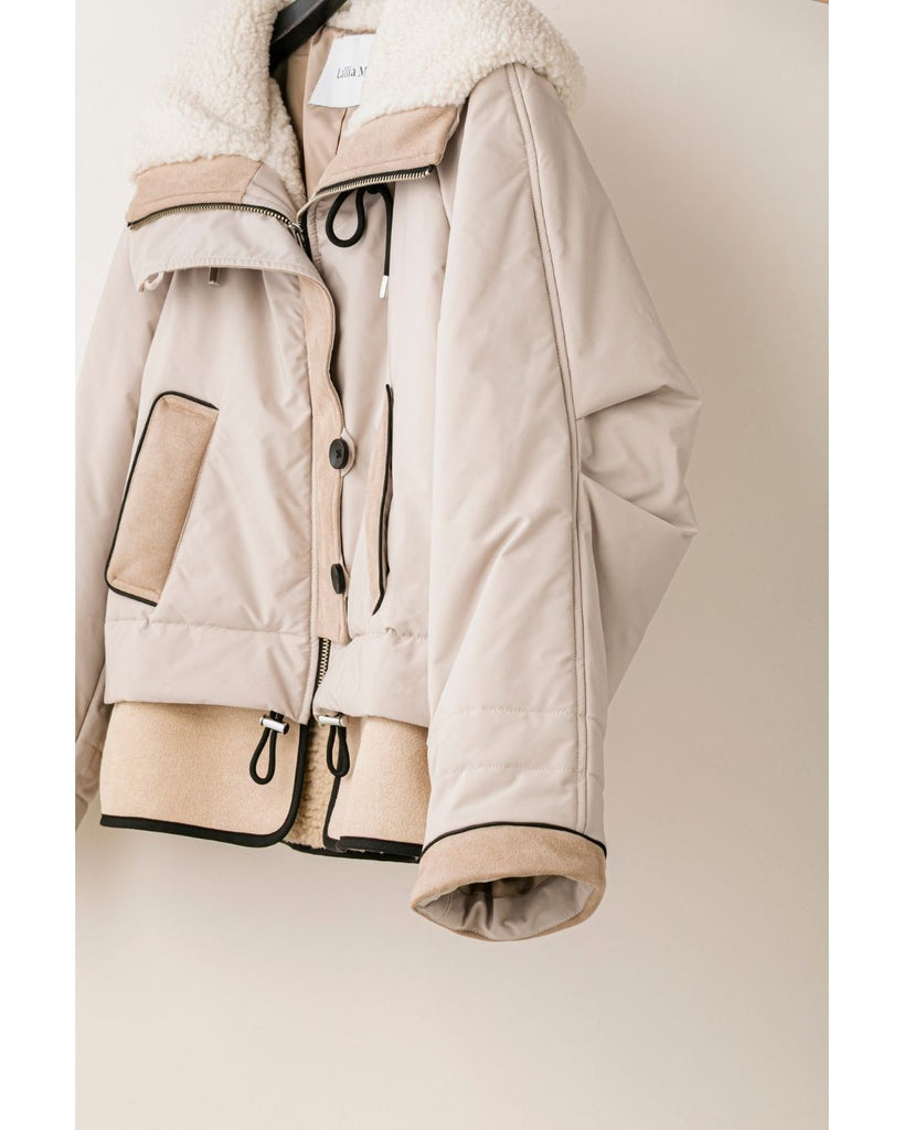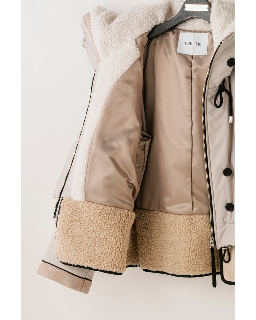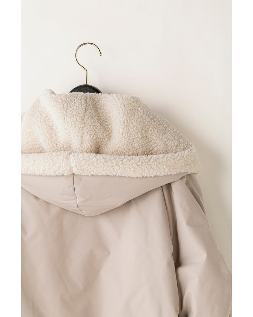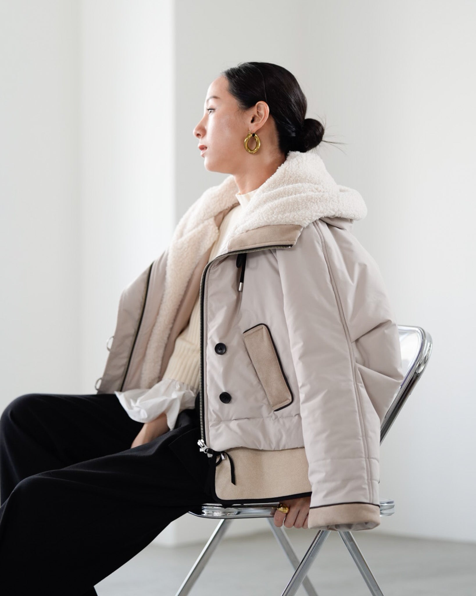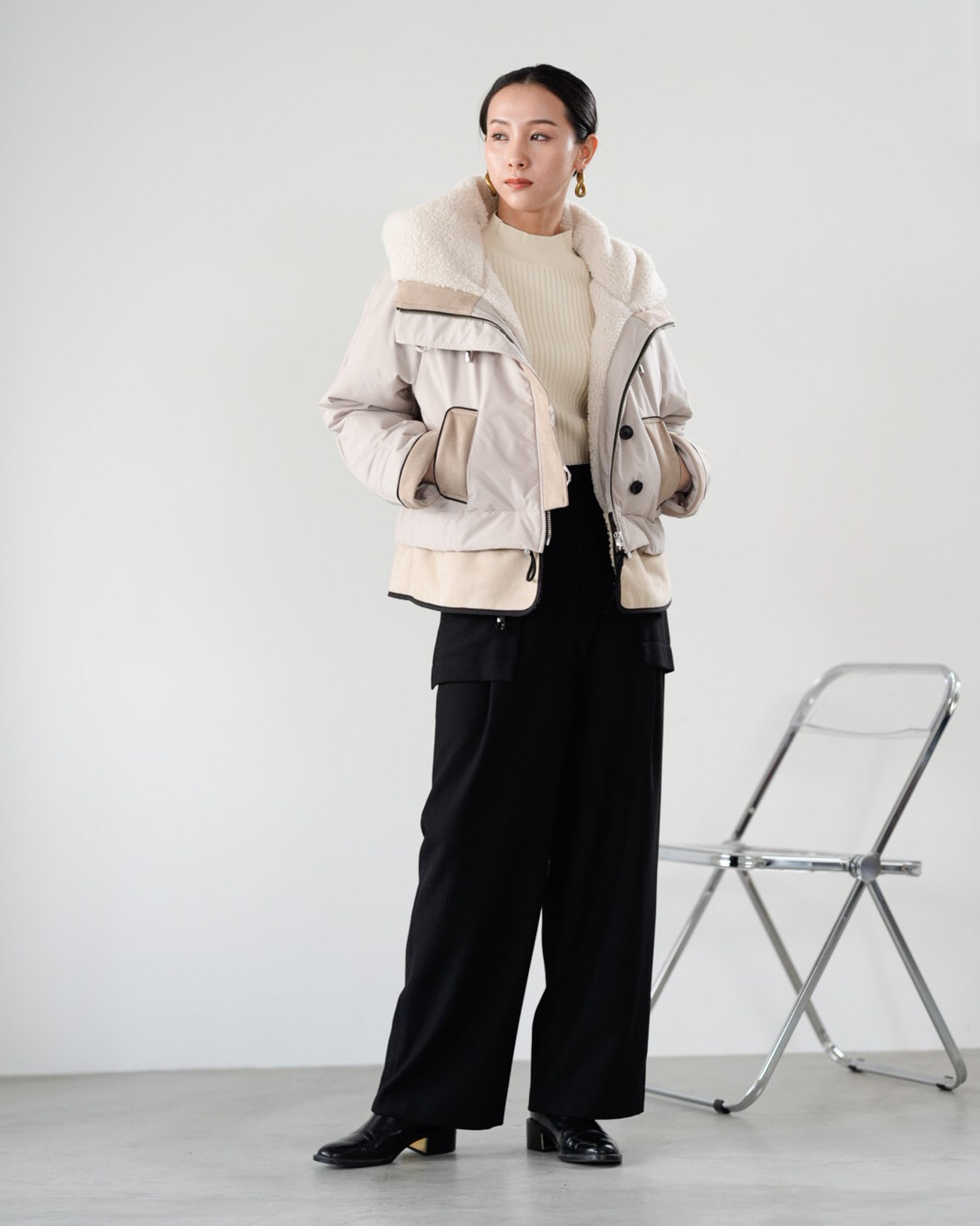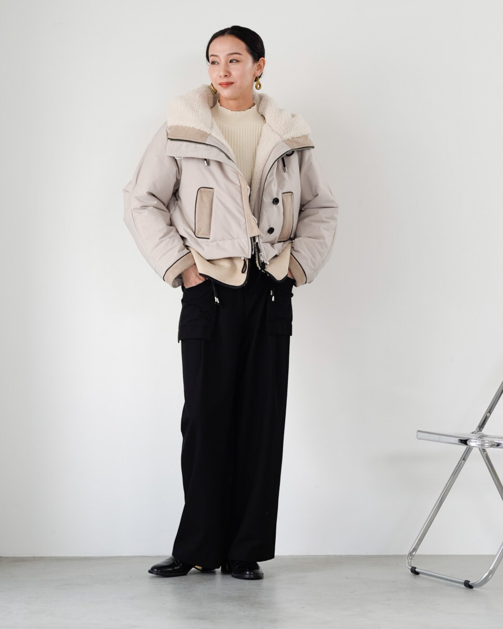 裾にバイカラースエードをドッキングしたアイコニックなデザインのラリアムーらしいフードコート。中綿入りで軽く、腰が隠れる着丈で冬も暖かく着用できます。カジュアルな表情で、気軽に羽織りやすいショート丈コートは、どんなスタイルにもマッチし、デイリーユースからお出かけまで、大人の日常の幅広いシーンで活躍する一着です。