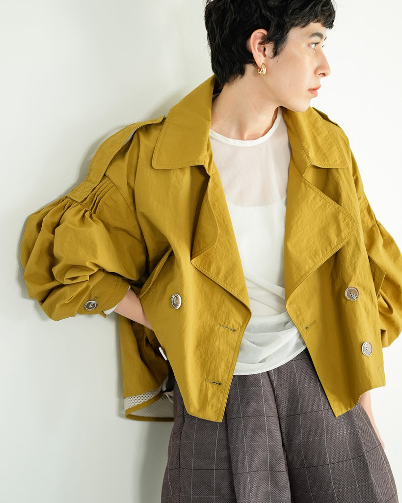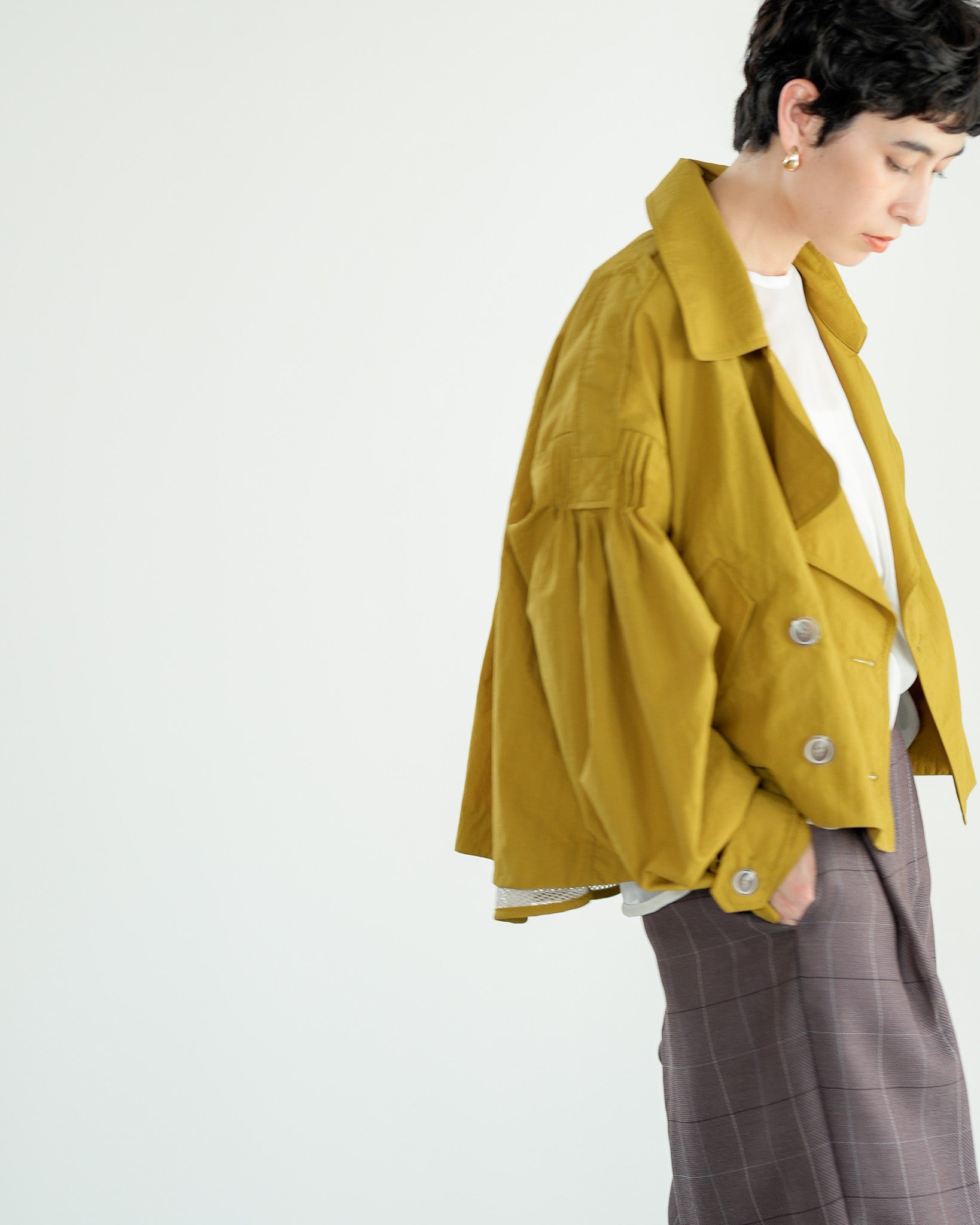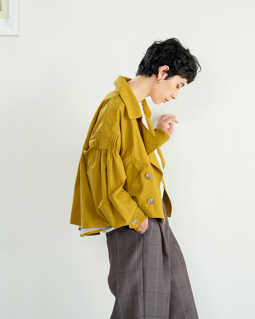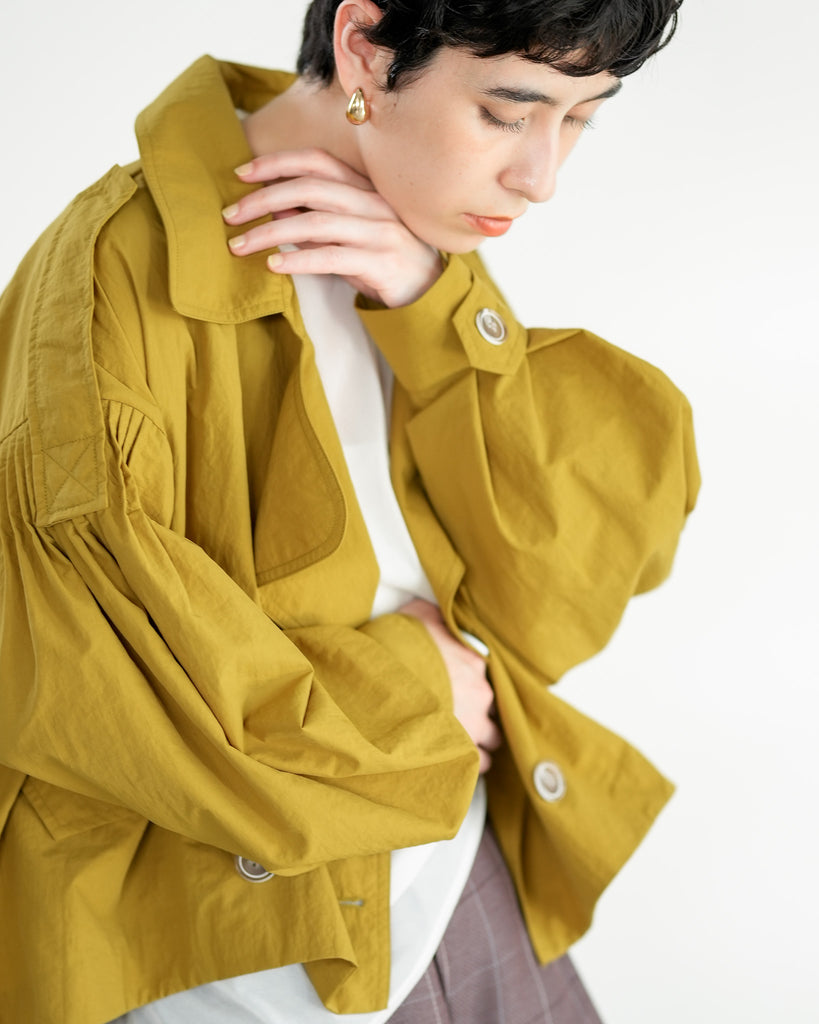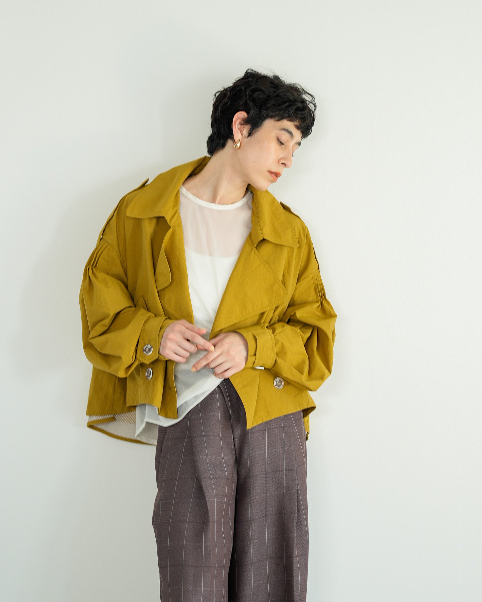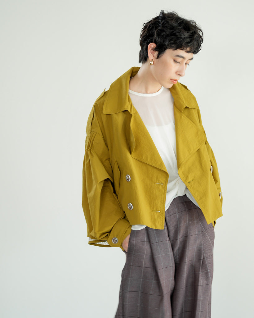 ショート丈ながら美しいシルエットと軽やかな抜け感。裾に向かってふんわりと広がるテントラインが、シンプルながらも女性らしい優雅さを演出します。