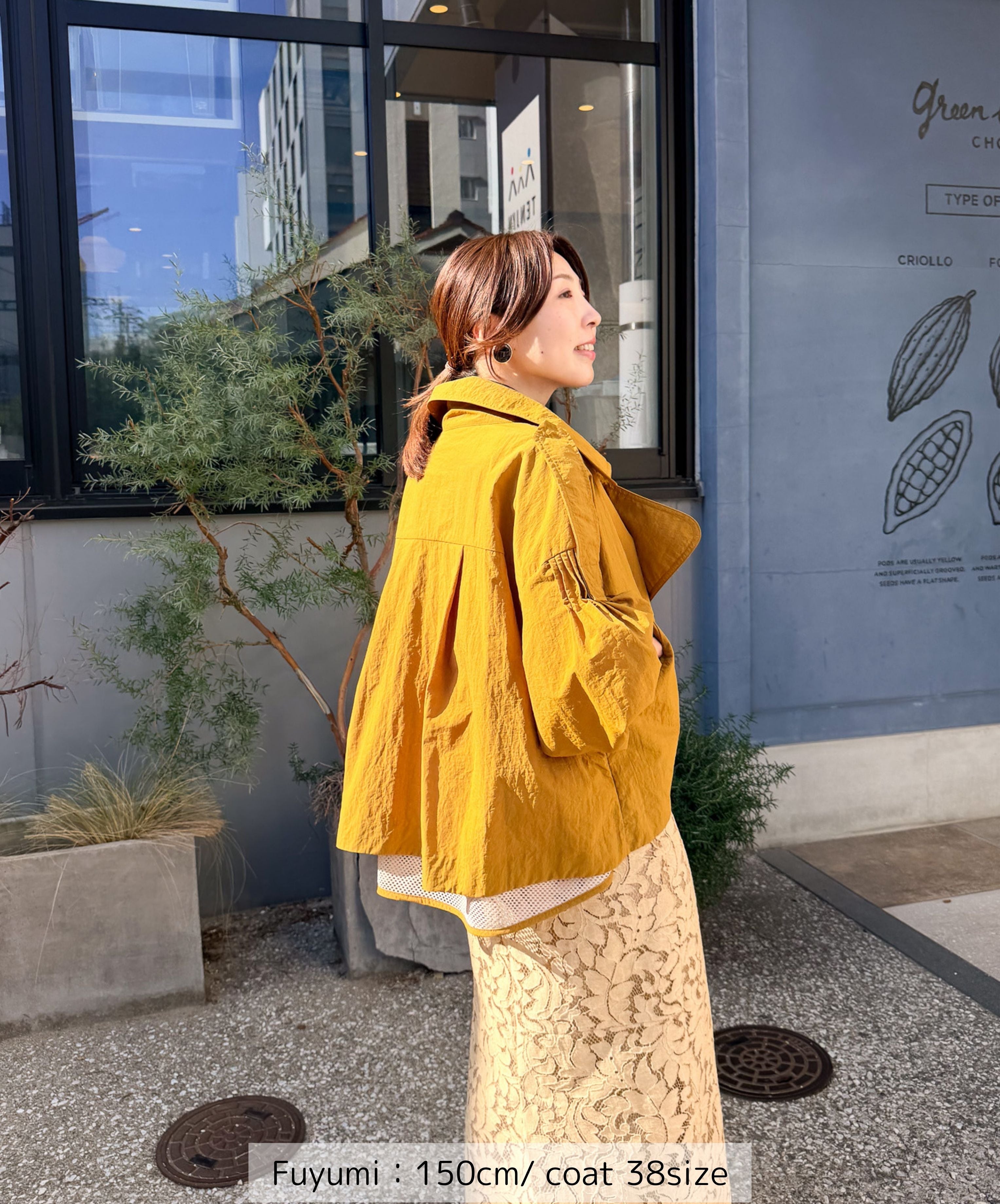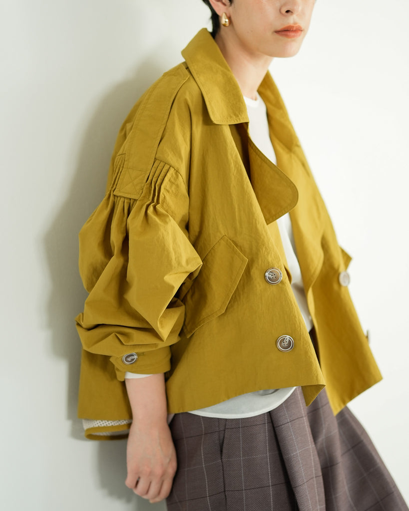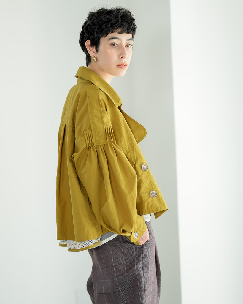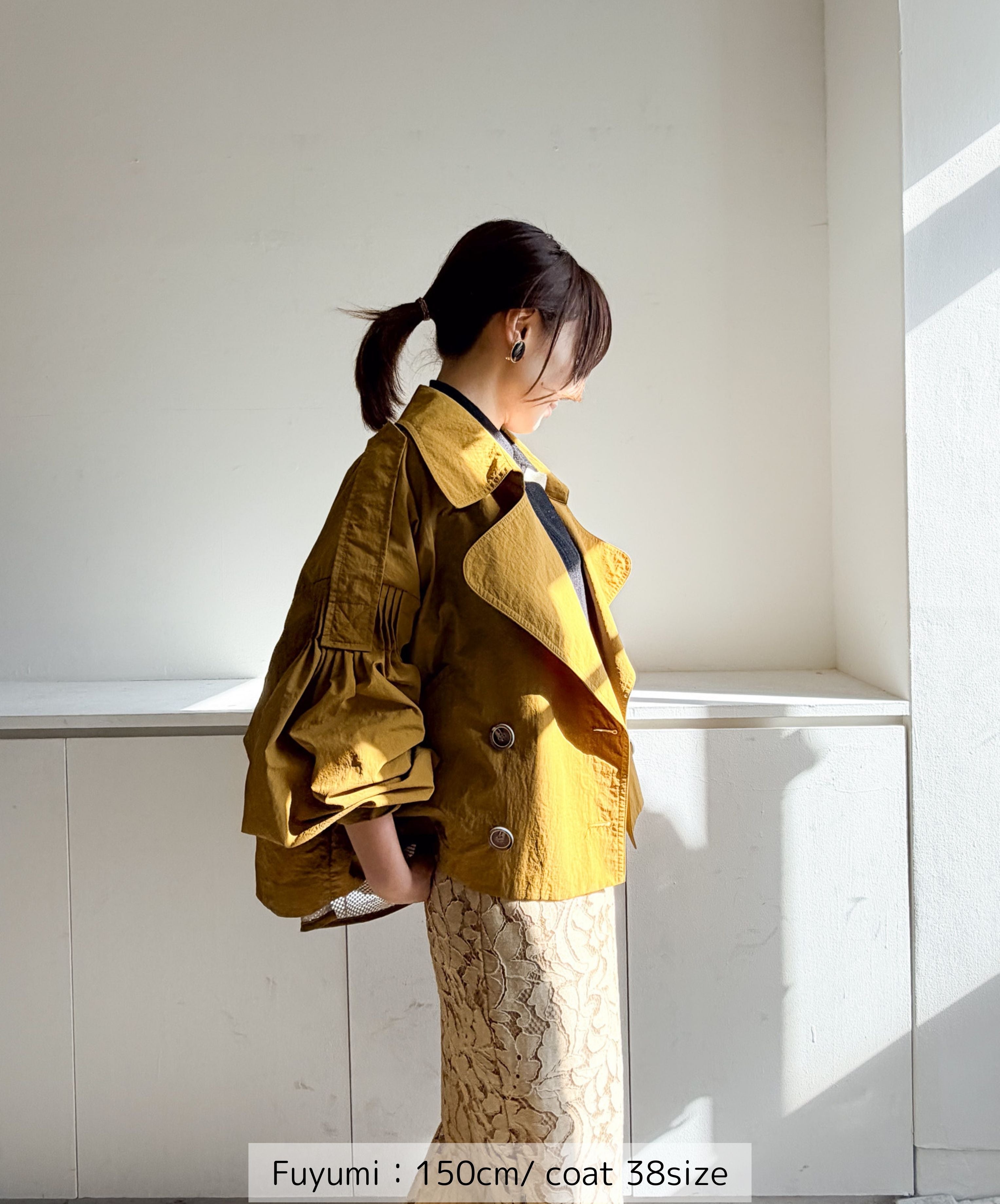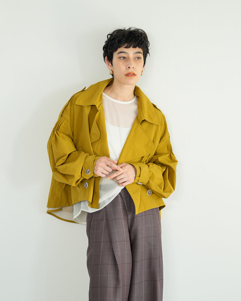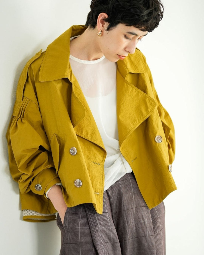 ショート丈ながら美しいシルエットと軽やかな抜け感。裾に向かってふんわりと広がるテントラインが、シンプルながらも女性らしい優雅さを演出します。