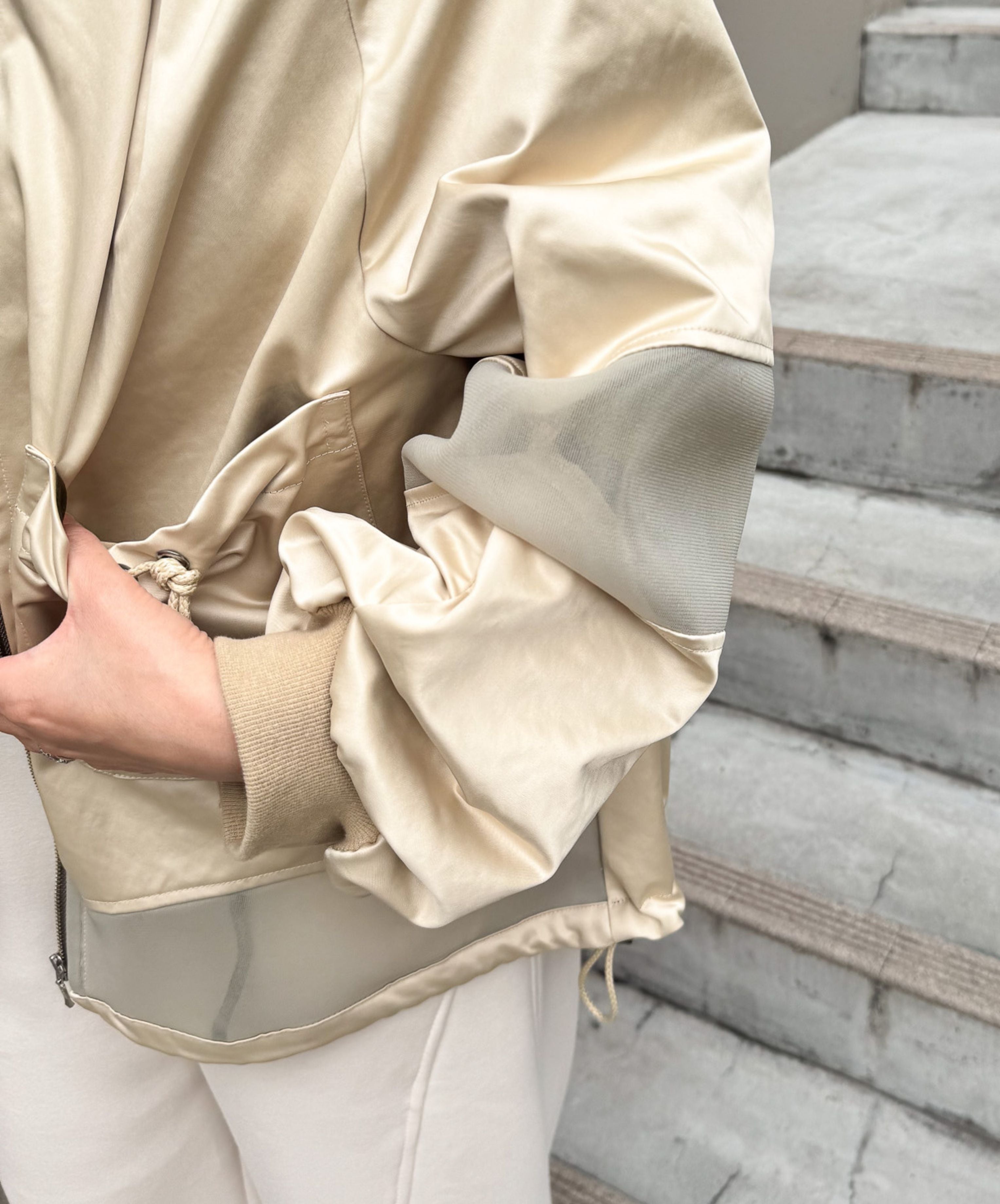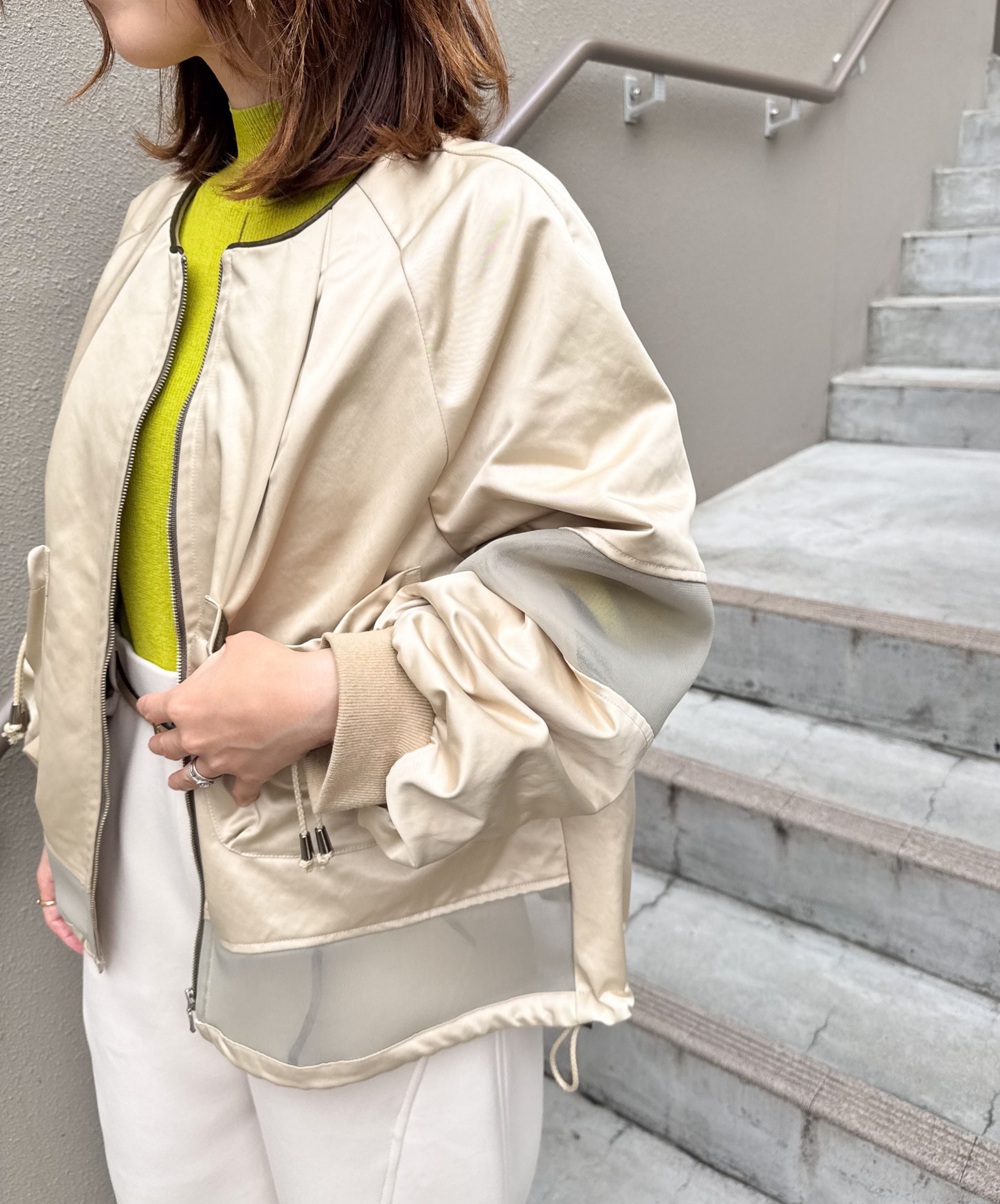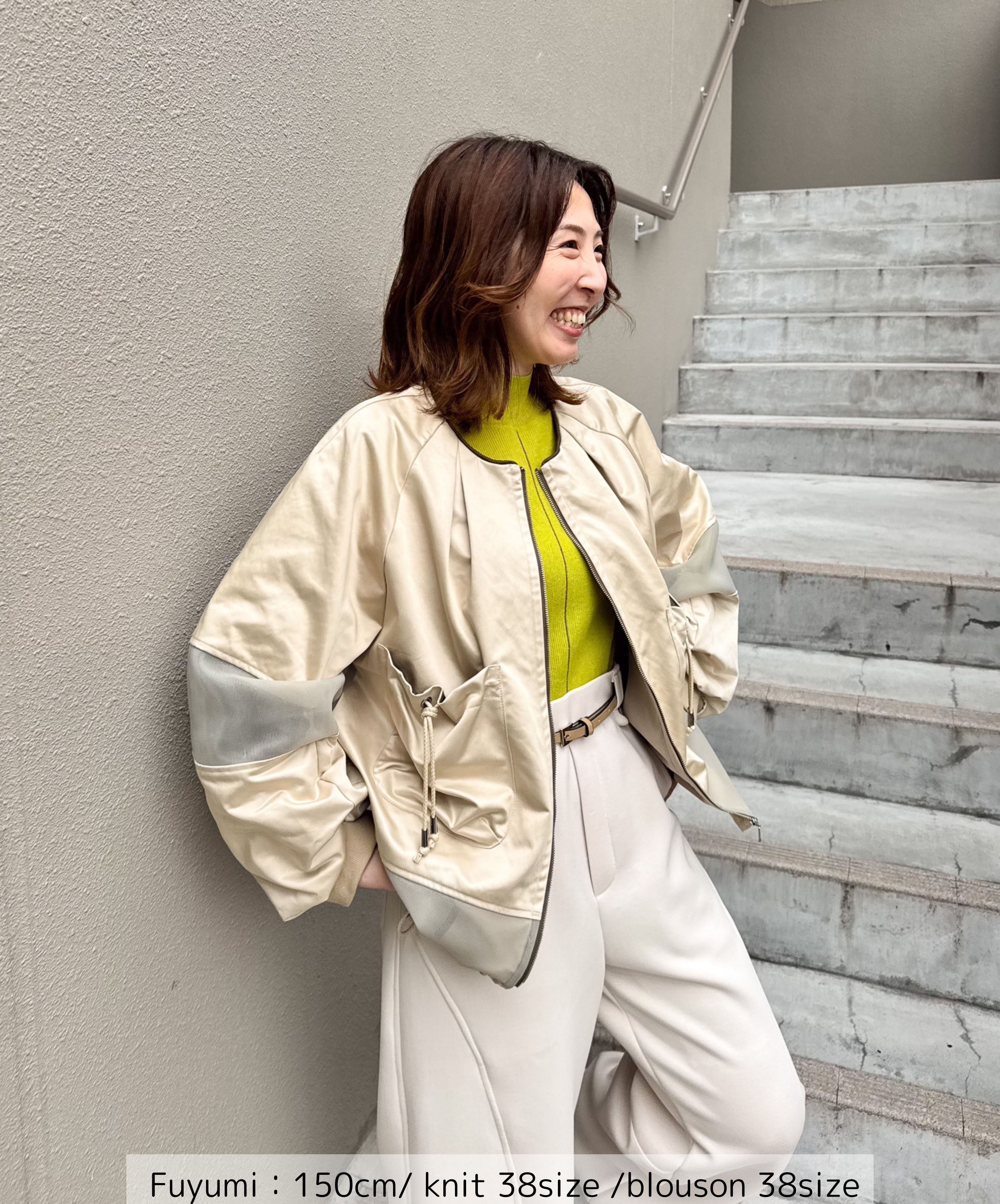 上品な光沢感と機能性を兼ね備えたフェイクレザーブルゾン。合皮の中でも希少な中肉サテンのフェイクレザー素材を使用。表面に光沢チンツ加工を施し、品のいい光沢とハリ感を実現しました。裾のシアー素材が軽やかで抜け感のある印象に。撥水性もあり、汚れにくく急な天候の変化にも安心です。ポケットの内側やパイピングの配色にもこだわり、ラリア・ムーらしい遊び心を表現しています。きれいめにもカジュアルにも着こなせるラグジュアリーなムードのブルゾンジャケットです。