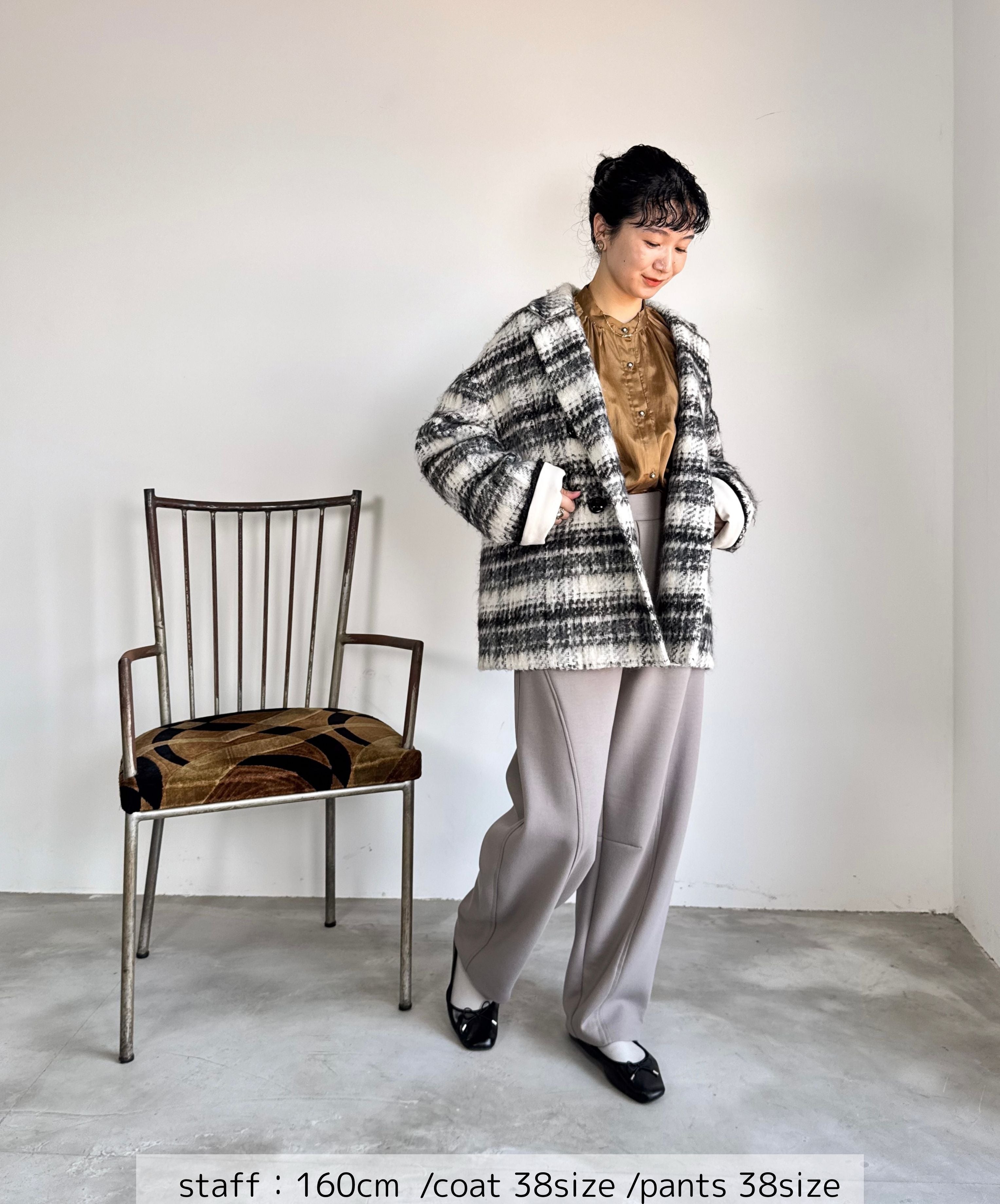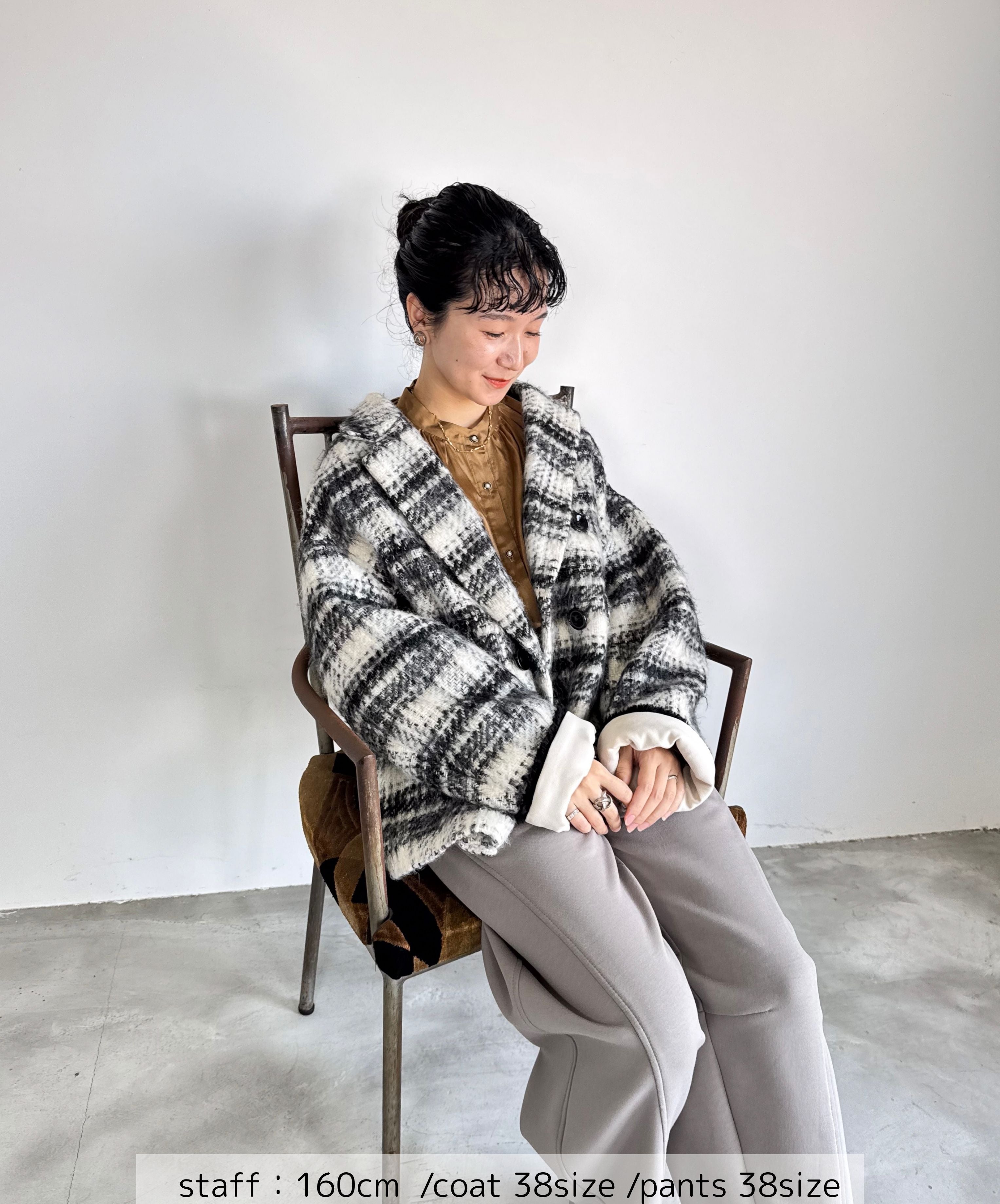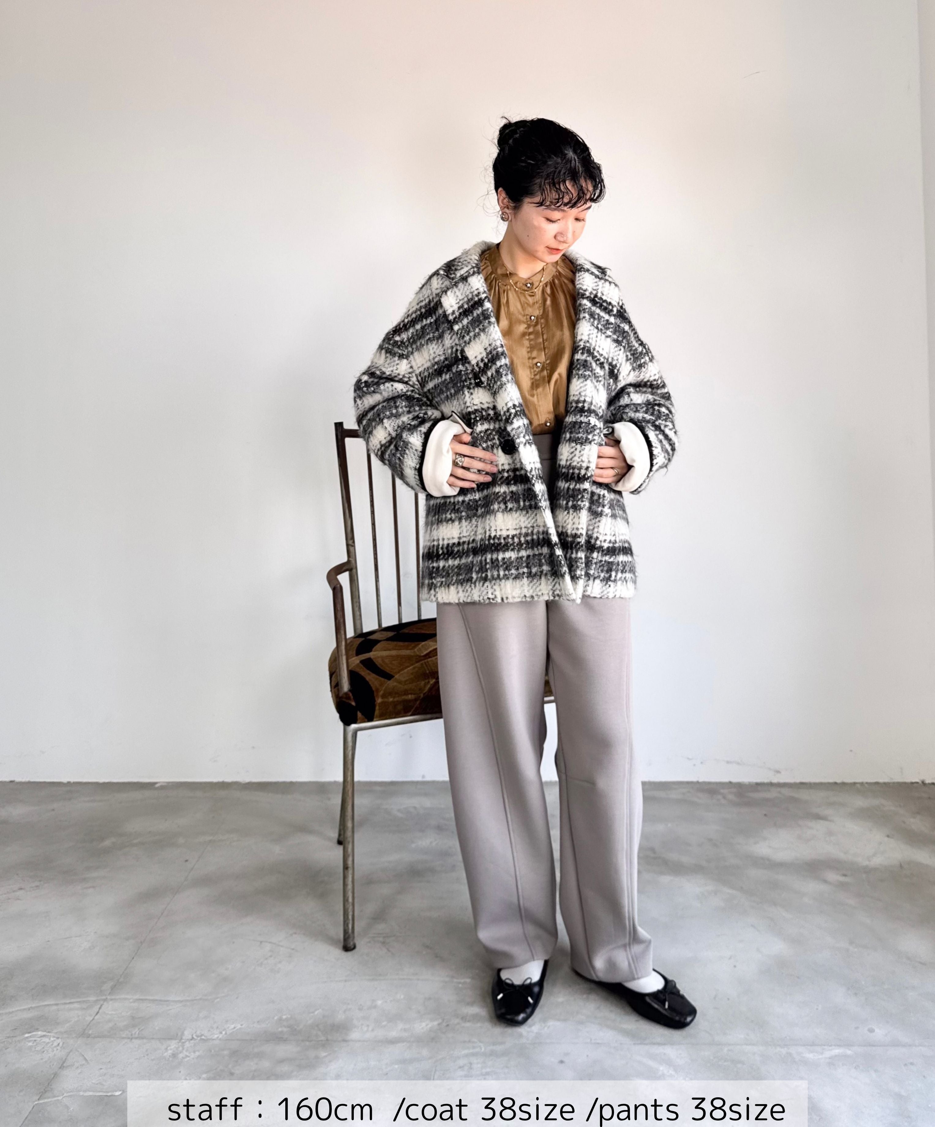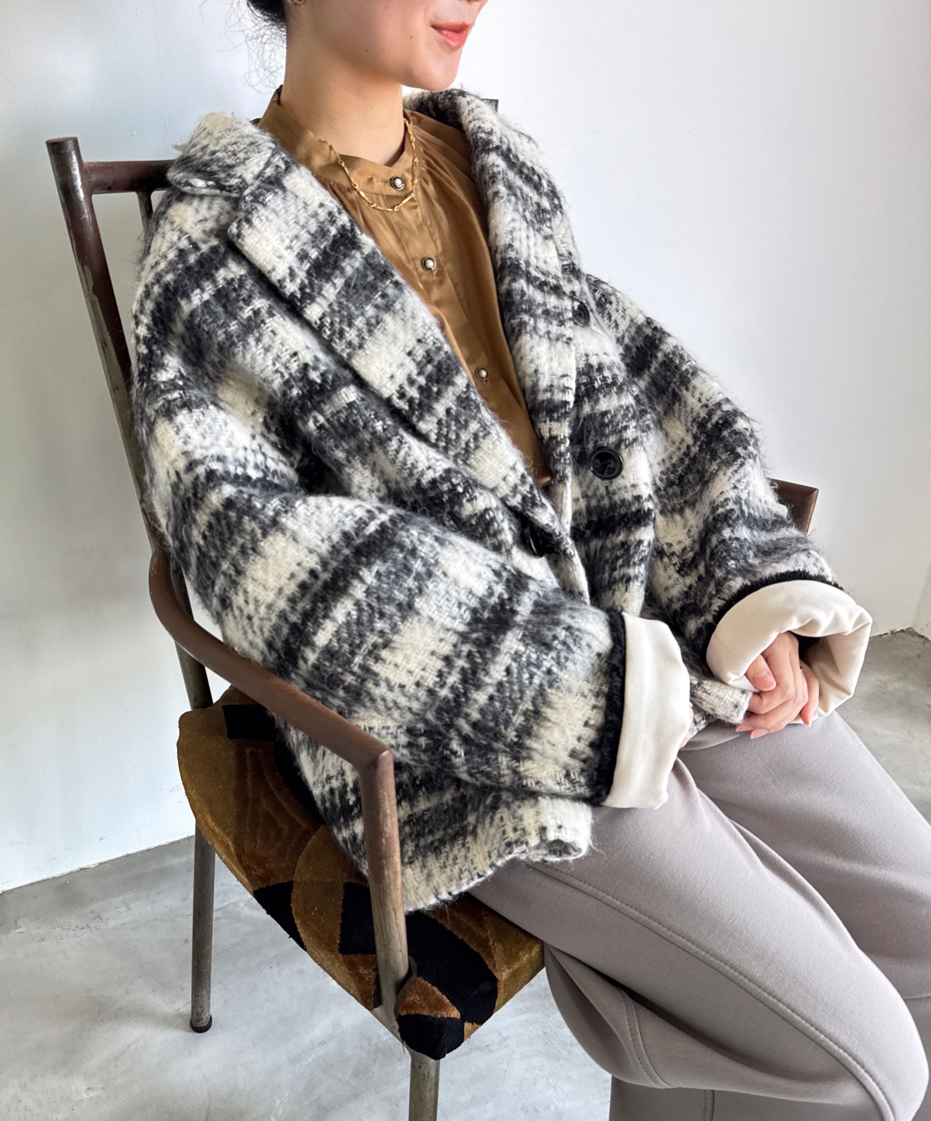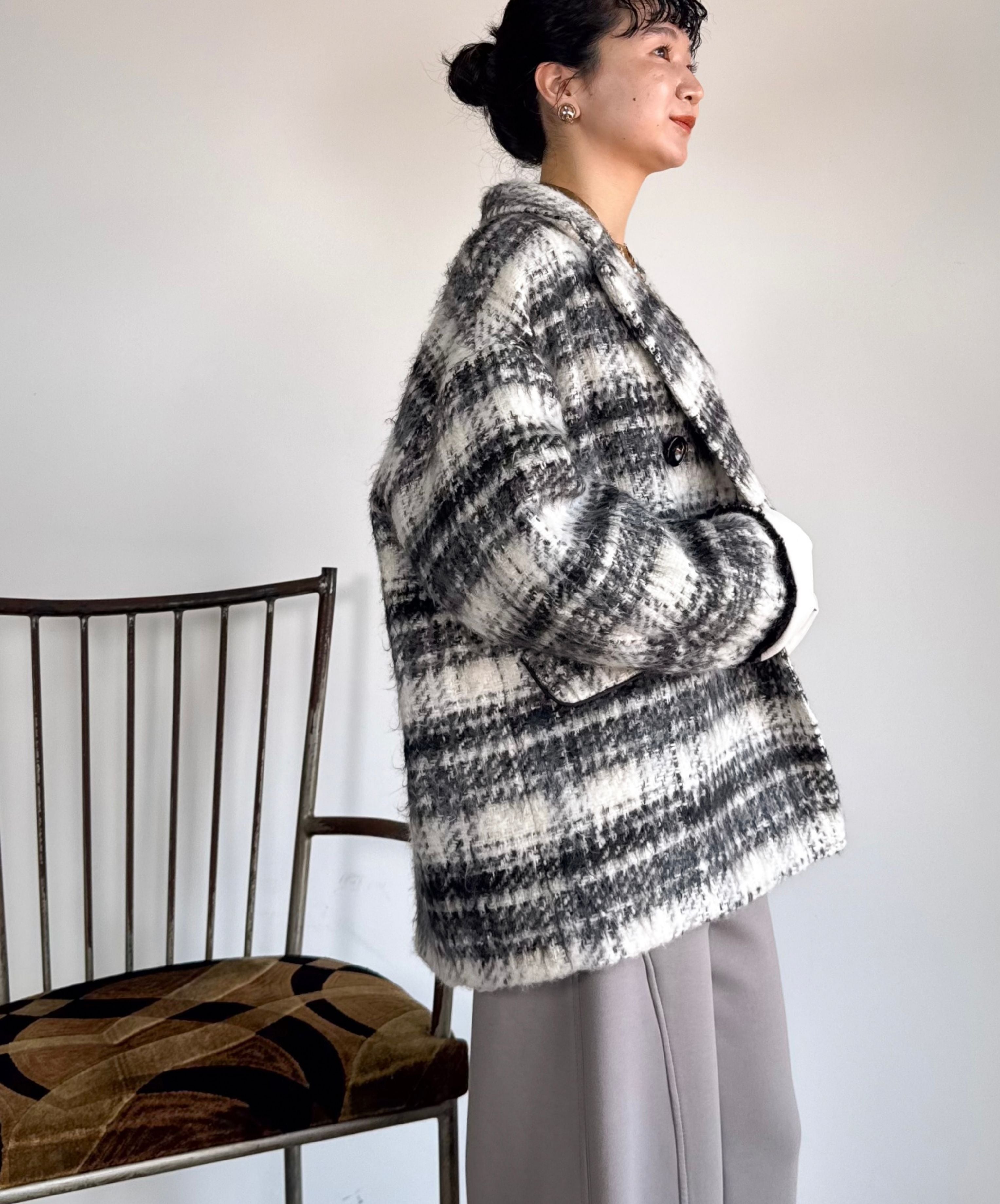 ふんわりとした毛足があたたかみと柔らかさを演出。コーディネートにボリュームと華やかさを加えます。(ツイードより厚みがありコートのような着心地)