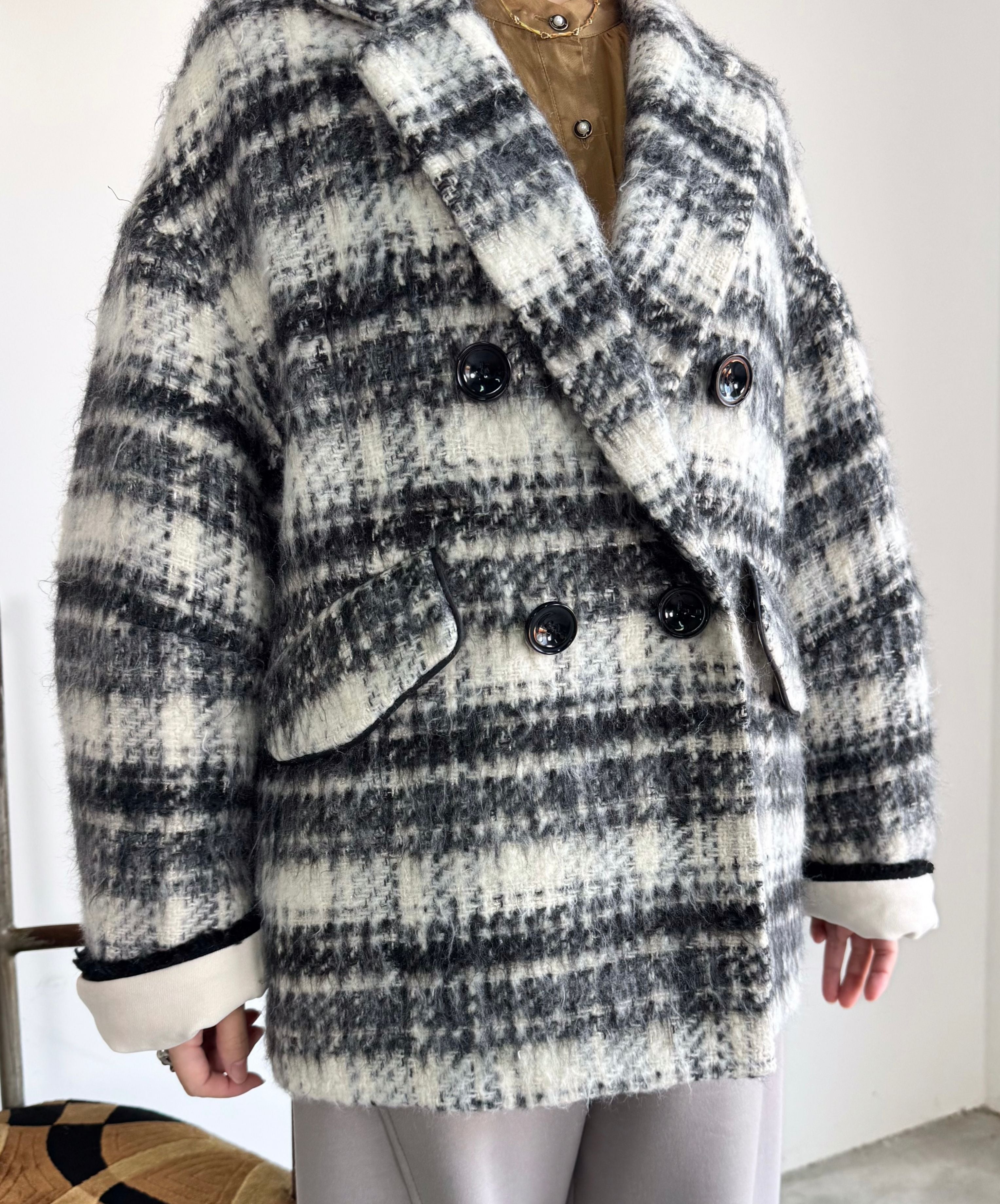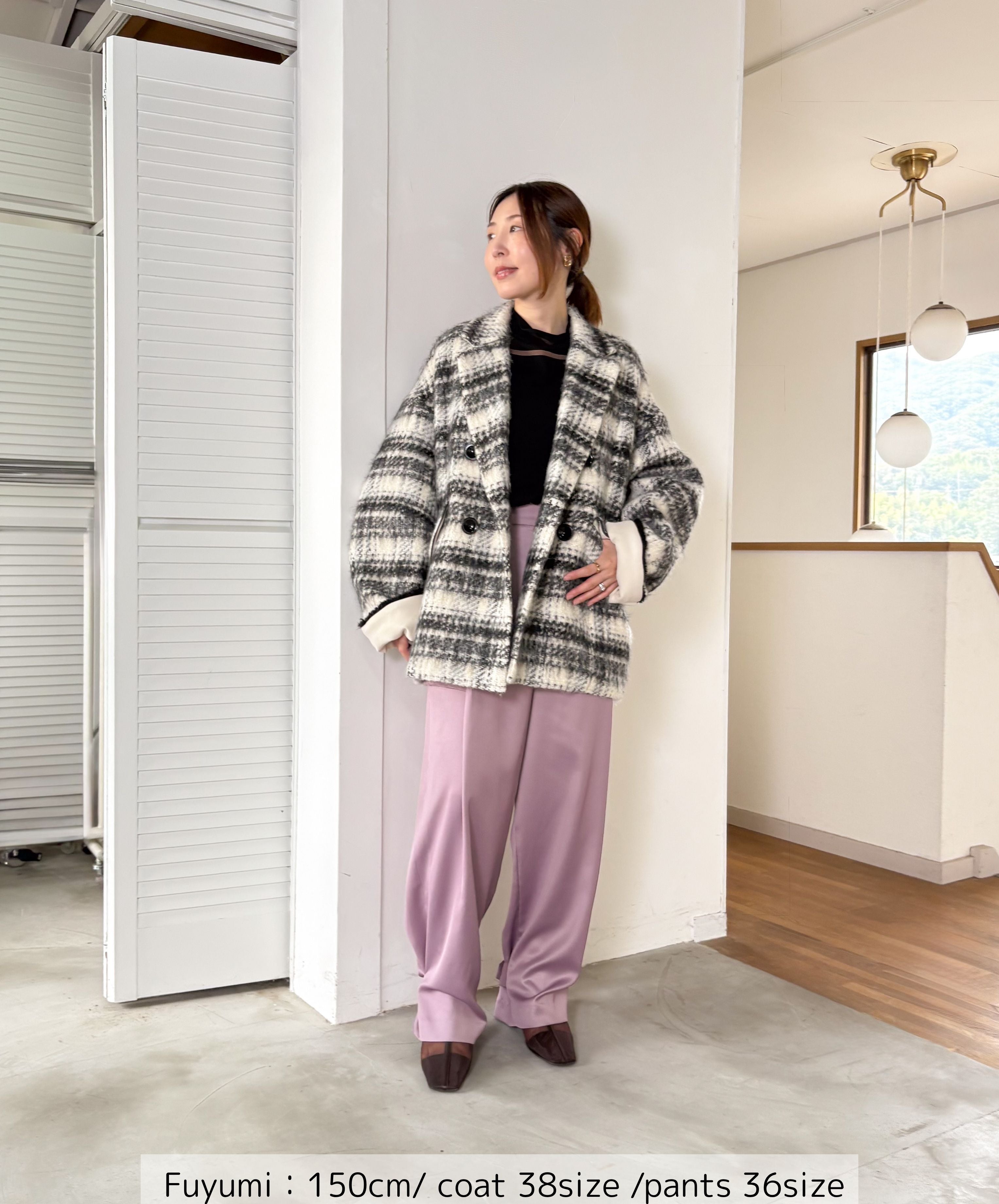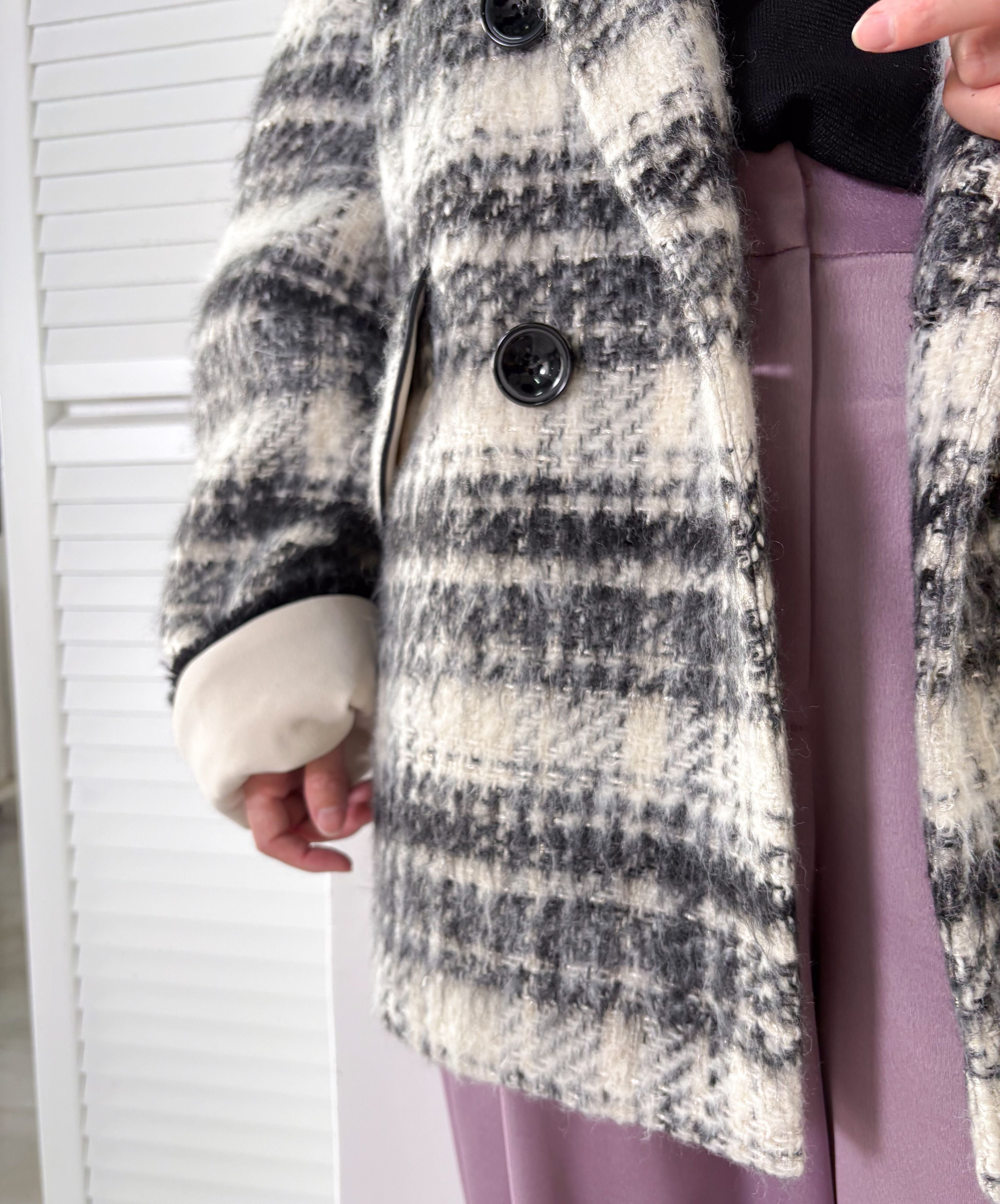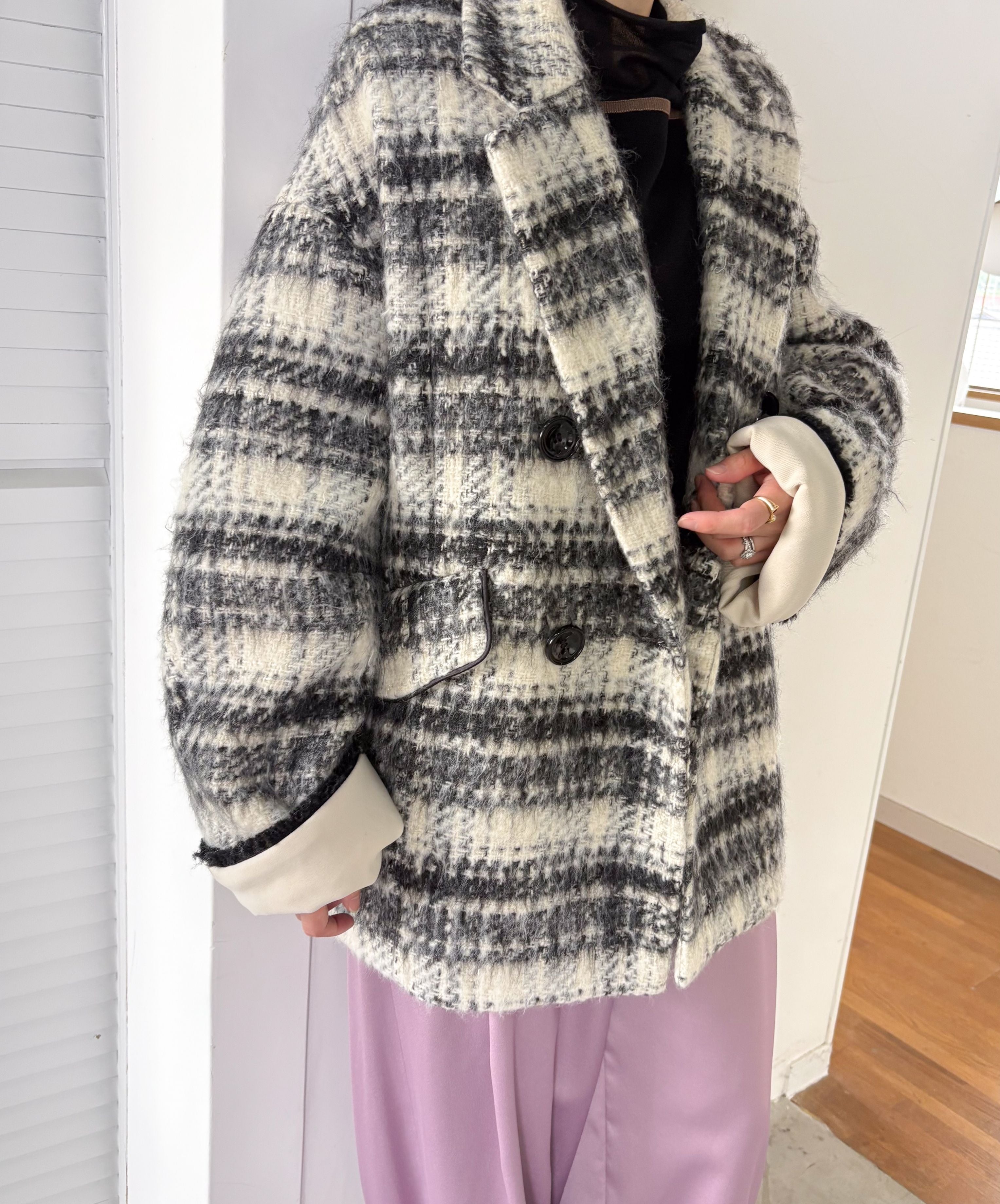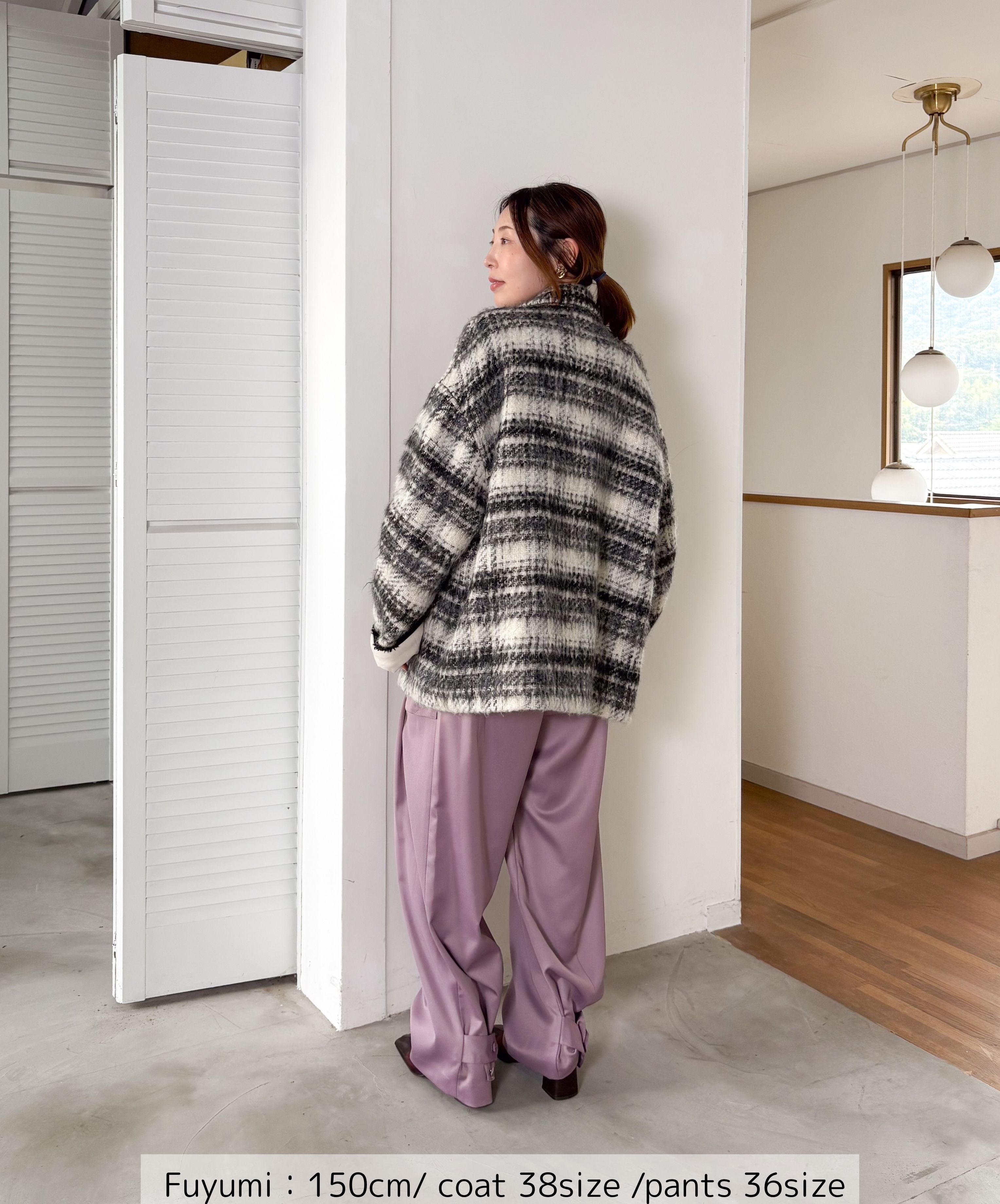 ふんわりとした毛足があたたかみと柔らかさを演出。コーディネートにボリュームと華やかさを加えます。(ツイードより厚みがありコートのような着心地)