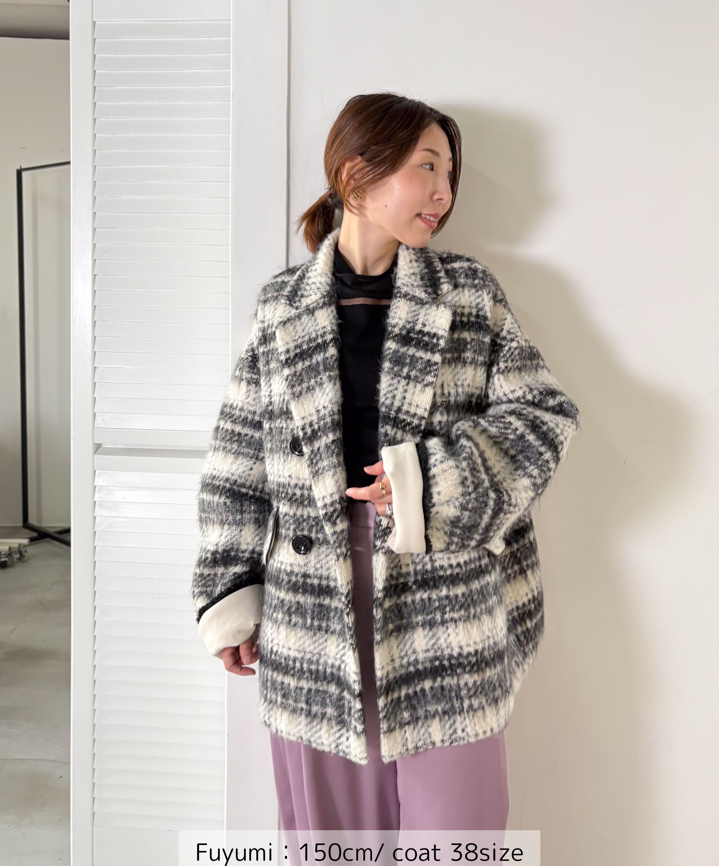 大人の日常に洗練された遊び心を添えるスタイリッシュなダブルジャケットコート。ゆったりとしたオーバーサイズシルエットで厚手のインナーを着てももたつかず、旬の着こなしを叶えます。クラシカルなダブルブレストの衿元がきちんと感を演出しつつ、程よい抜け感で大人のこなれムードをかもします。手元の折り返しからのぞく異素材は細番手のコーデュロイを使用し、ぬくもりある異素材のコントラストがさりげない洗練されたアクセントとなり大人の遊び心をくすぐります。素材は表情豊かなチェックシャギーとシックなムード漂うツイードの2型をご用意。どちらの素材も上質ながら軽やかな着心地でサッと羽織るだけで様になるアイテムです。ヒップが隠れる丈感はパンツスタイルはもちろん、スカートやワンピースとの相性も◎カジュアルな装いを格上げしたり、きれいめなスタイルに抜け感をもたらしたりと幅広いコーディネートに対応します。