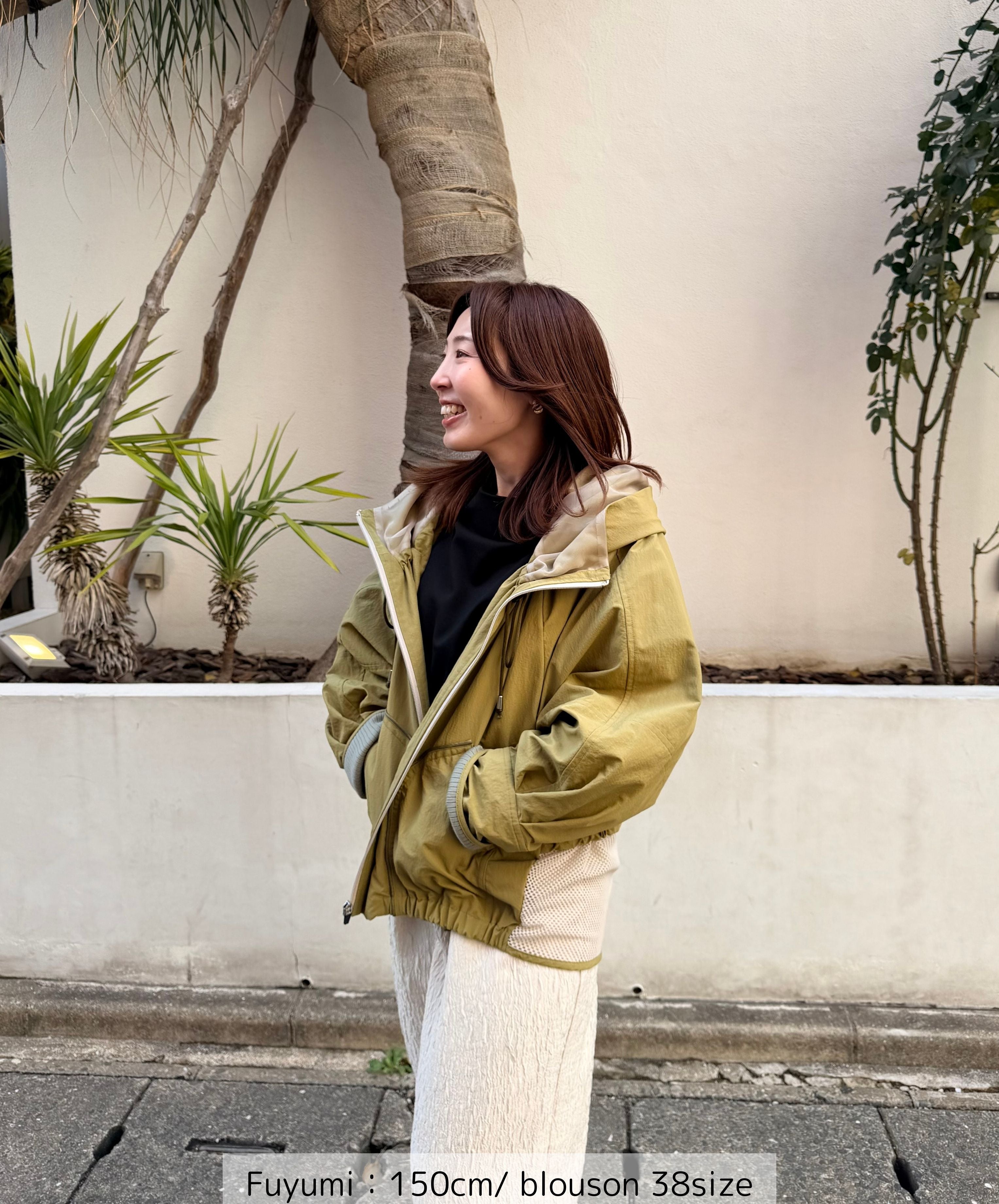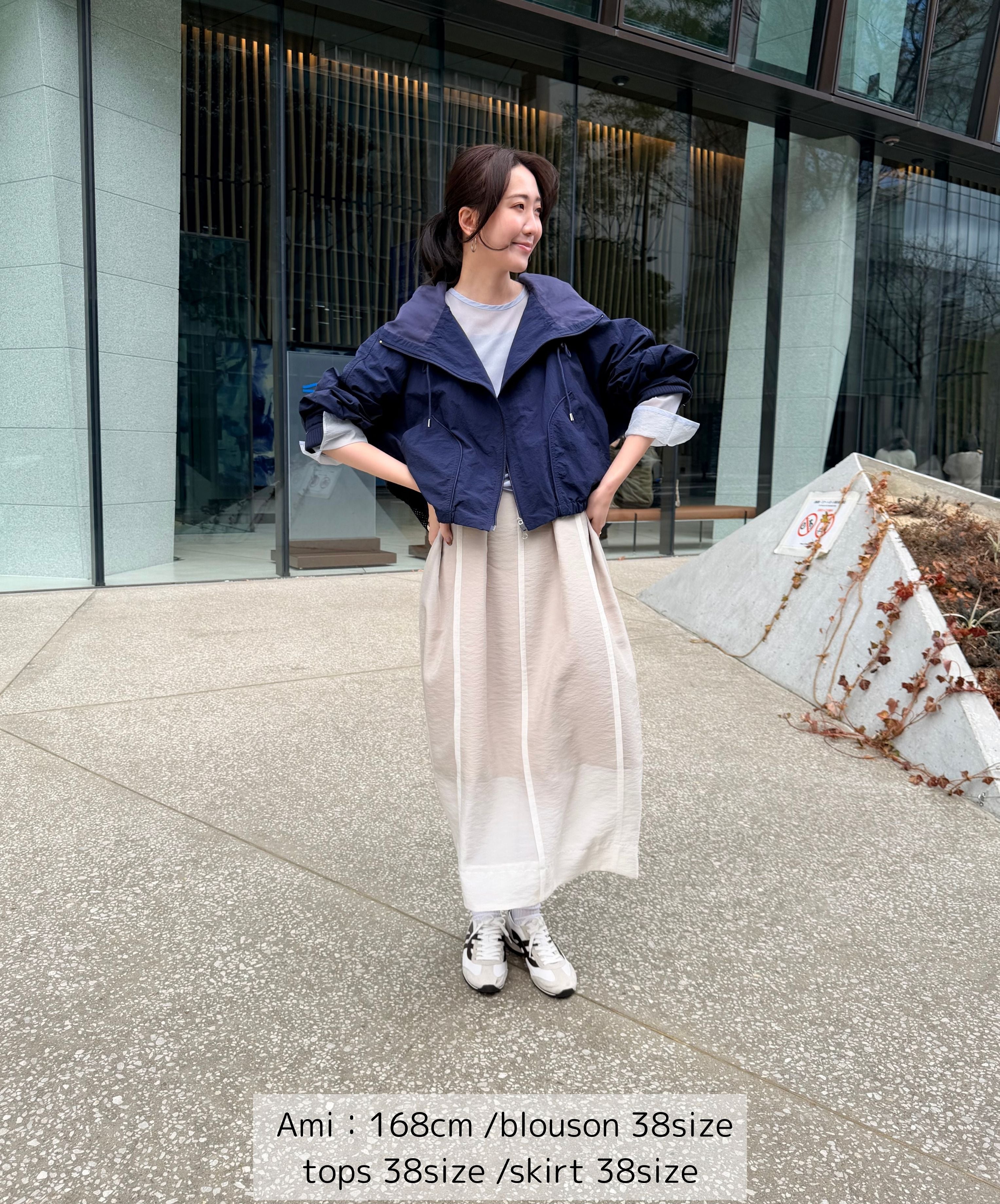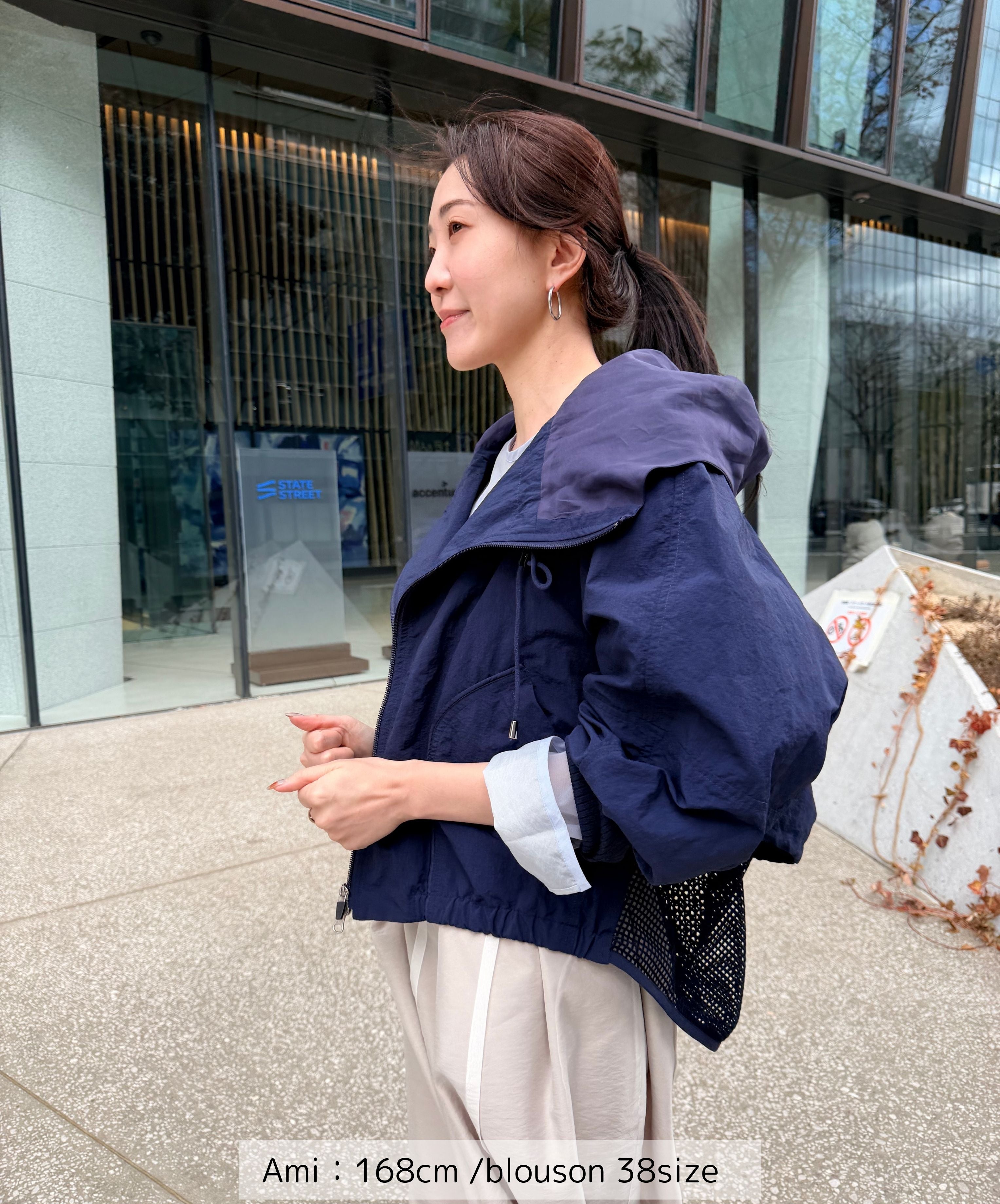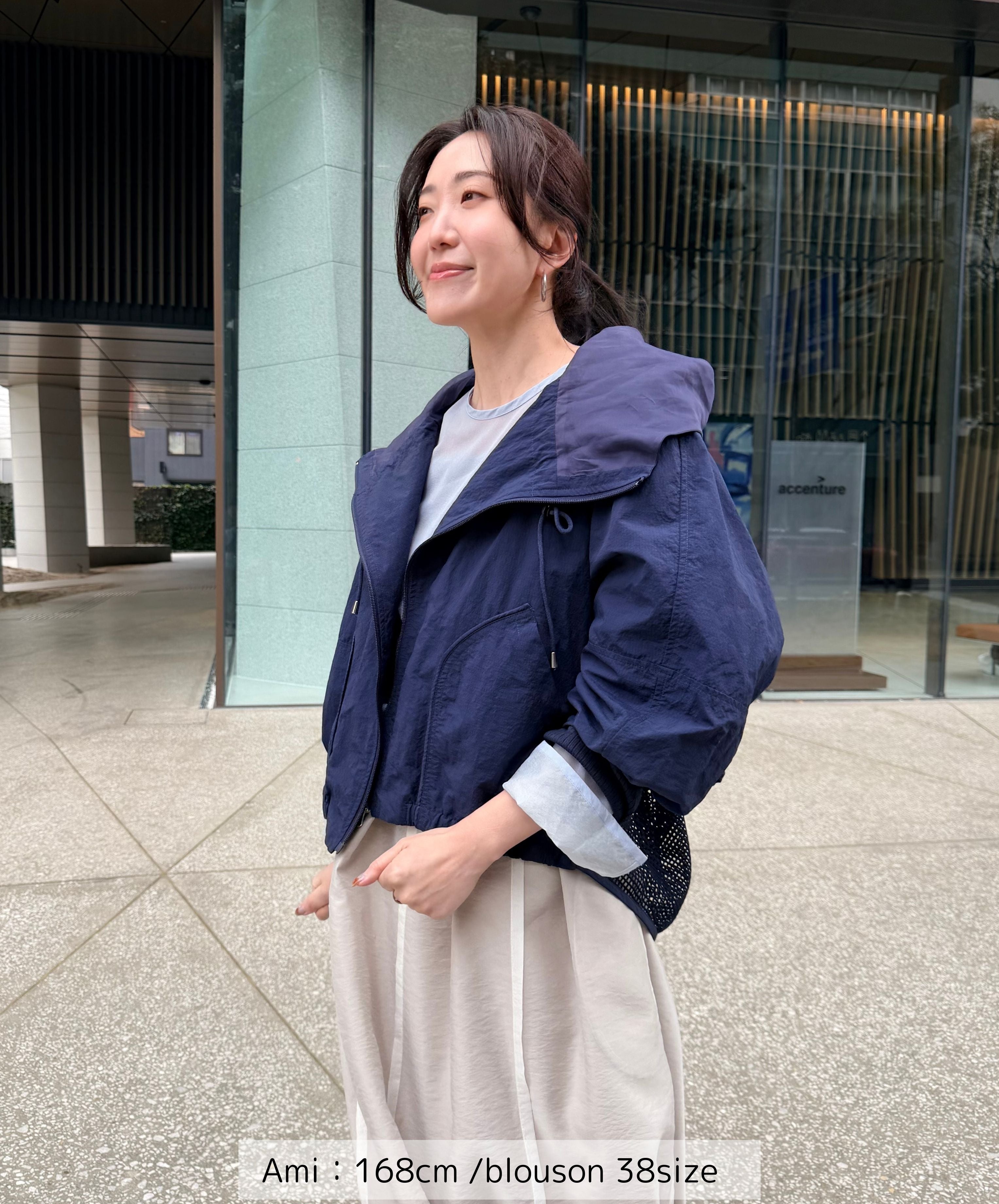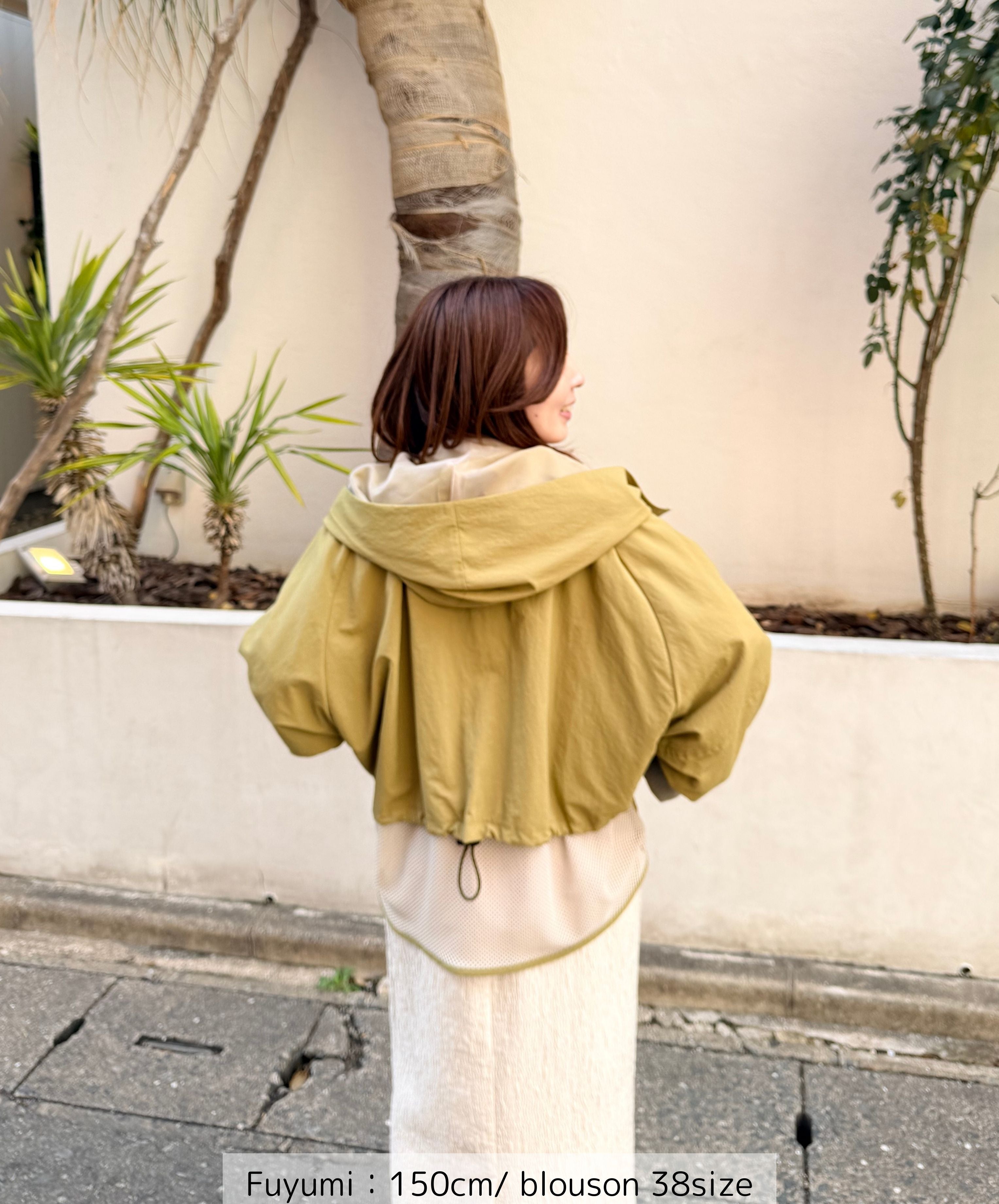 着心地も見た目にも軽い印象のフード型ブルゾン。こだわりのフードには透けが美しいオーガンジーをドッキングし、顔まわりに春らしい透明感をプラスし、繊細で柔らかな印象に見せてくれます。表地には光沢のないナイロンを使用し、スポーティになりすぎないデザインに。撥水加工が施され汚れがつきにくいのもアクティブに着回せるポイントです。首元のギャザーや丸みのある袖も相まってフェミニンなムードで、ドルマンスリーブ型でアームホールが大きいため、厚手のインナーなど、かさばりやごわつきも気にせず着用いただけます。